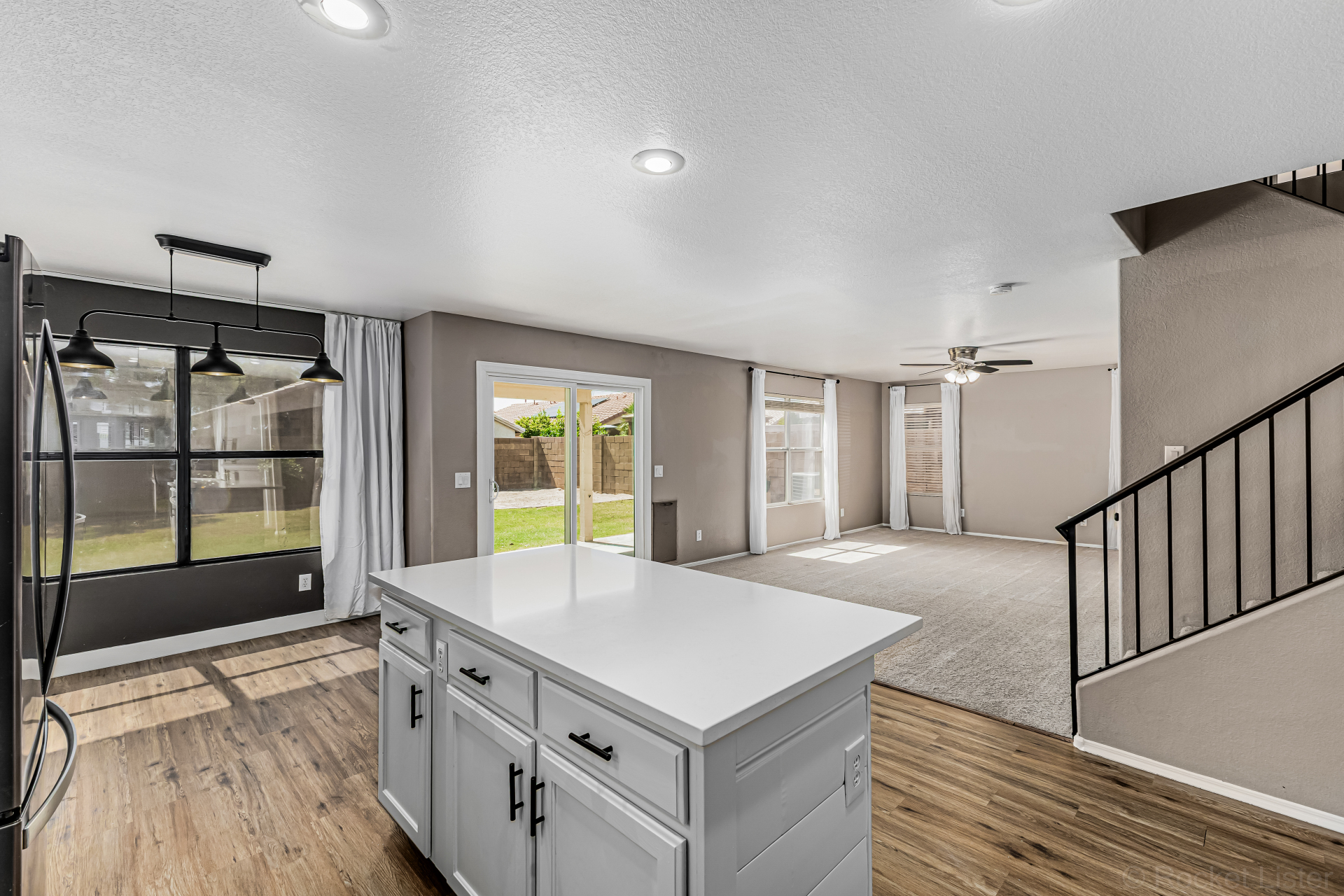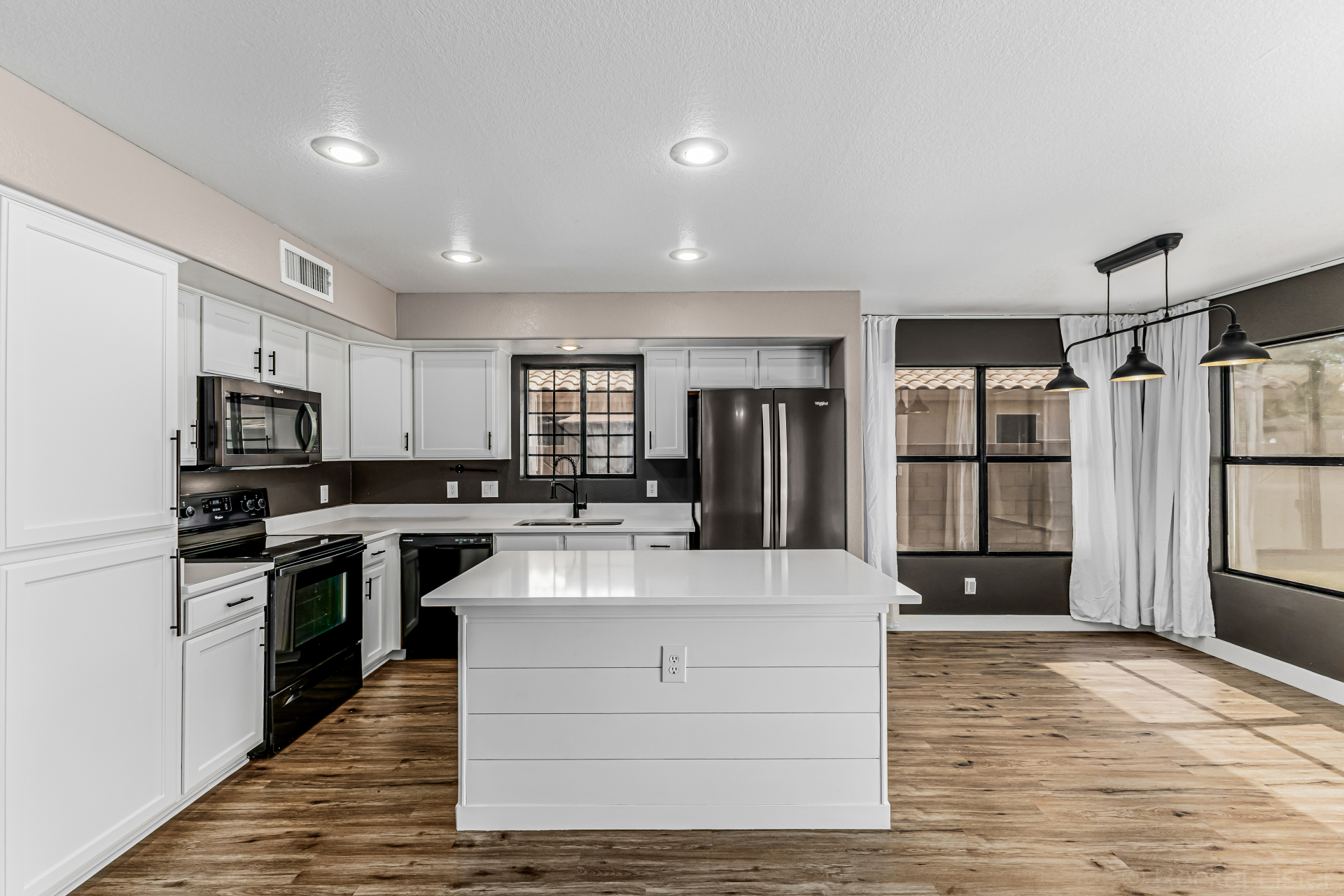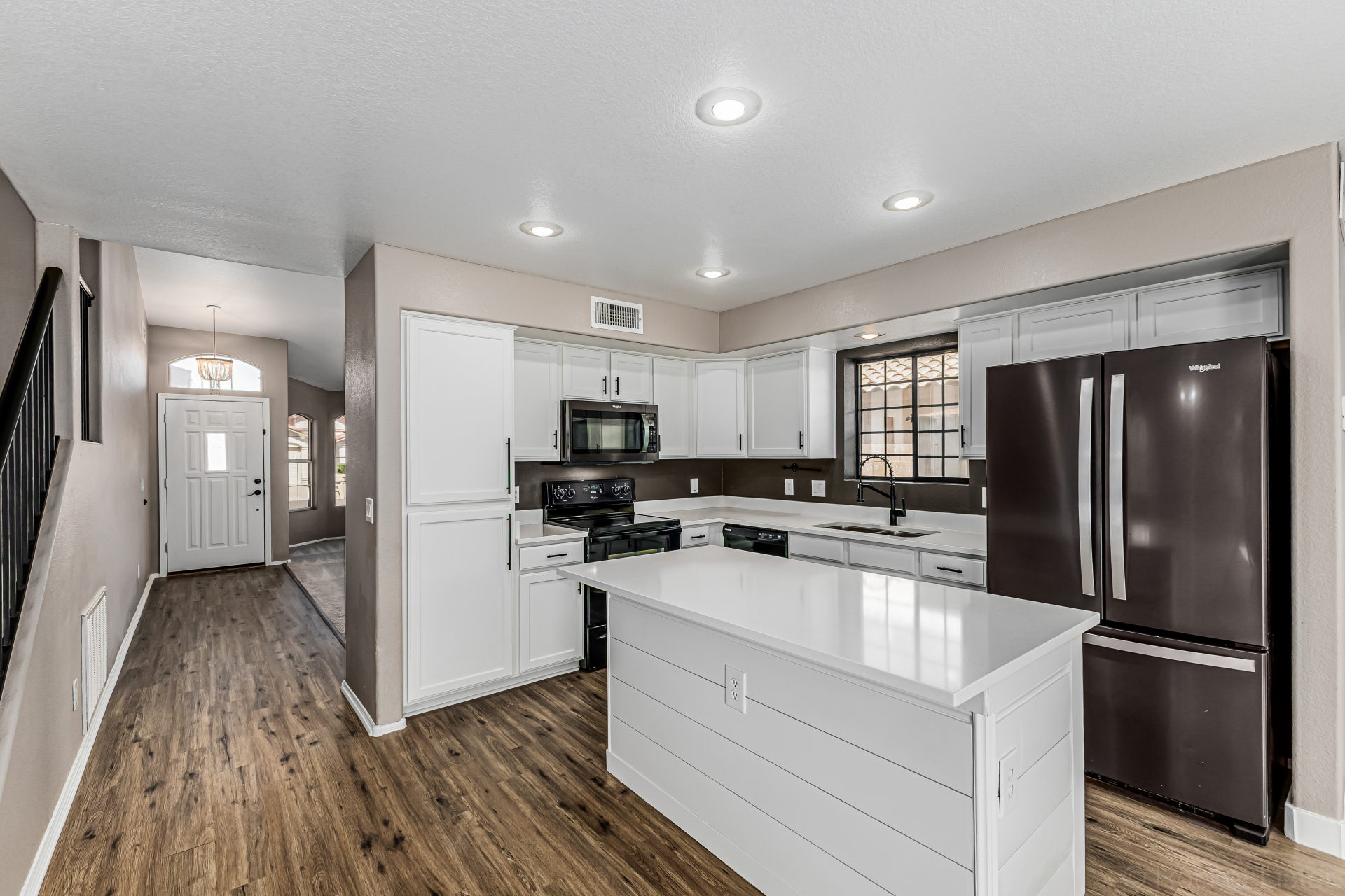 white cabinets, quartz counters, a center island with a breakfast bar, and a cozy breakfast nook. Head upstairs to find a large main bedroom, offering a private