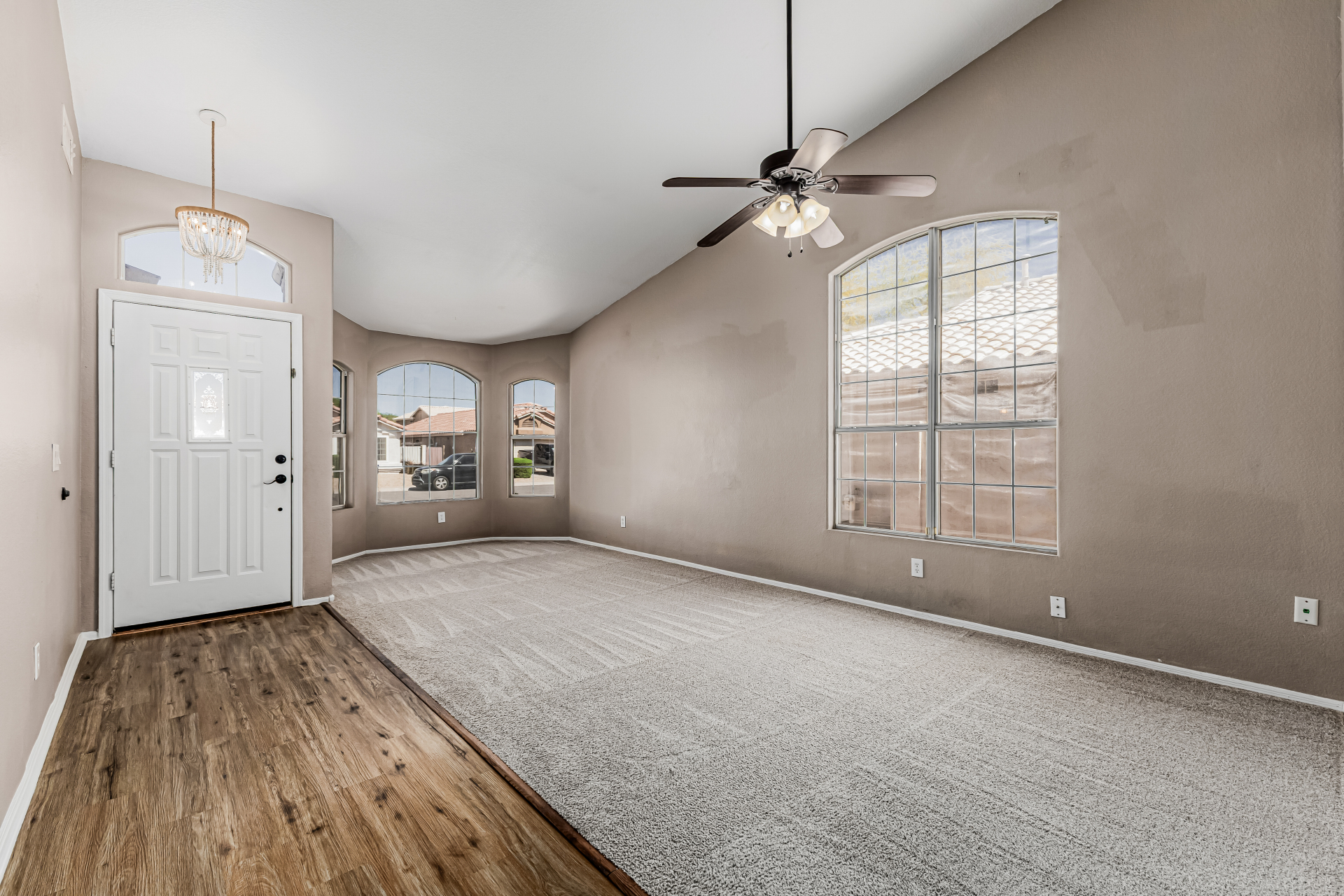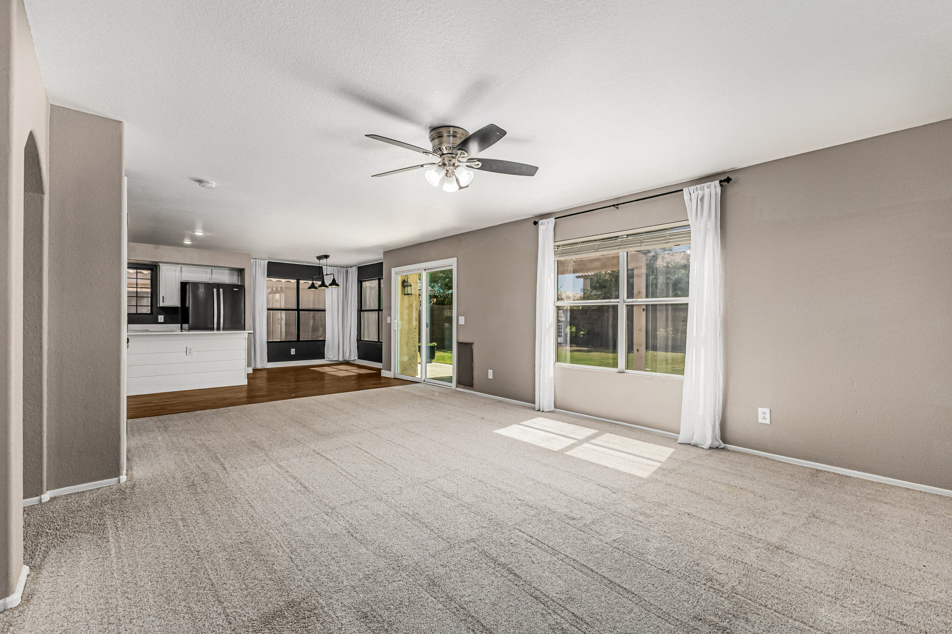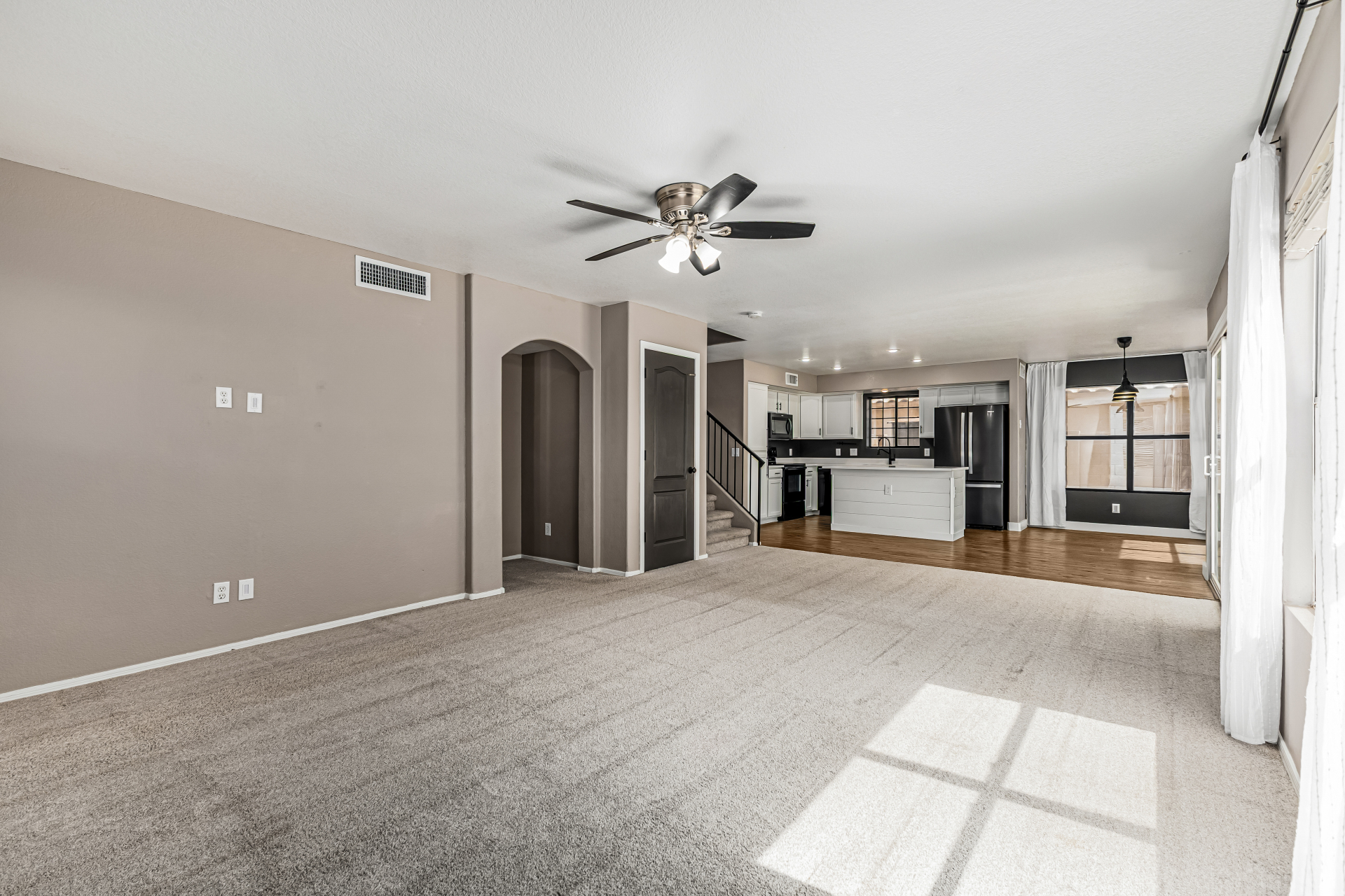look & carpet flooring, along with vaulted ceilings that enhance the airy feel. Seamlessly connected living & dining areas and the desirable great room are perfect