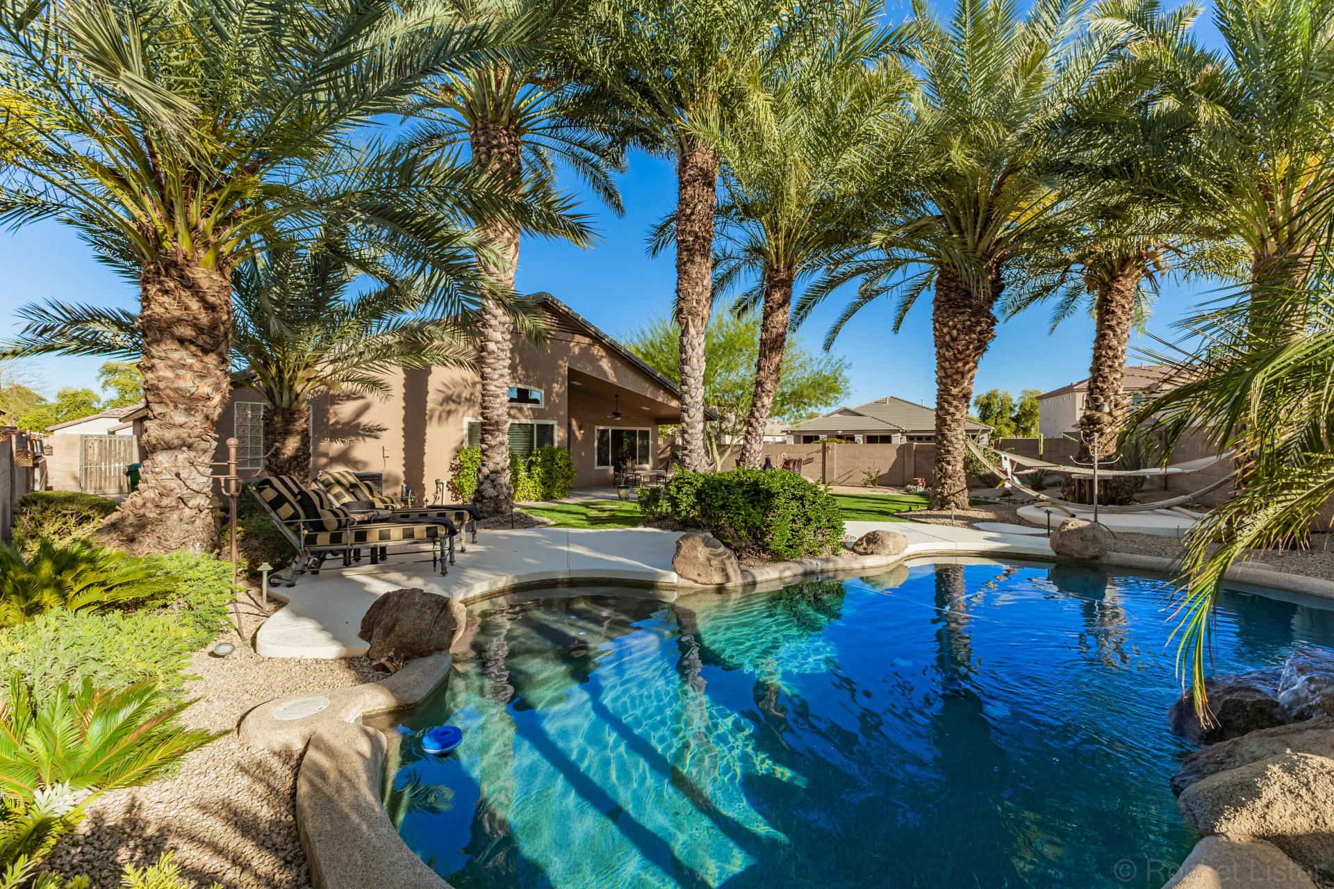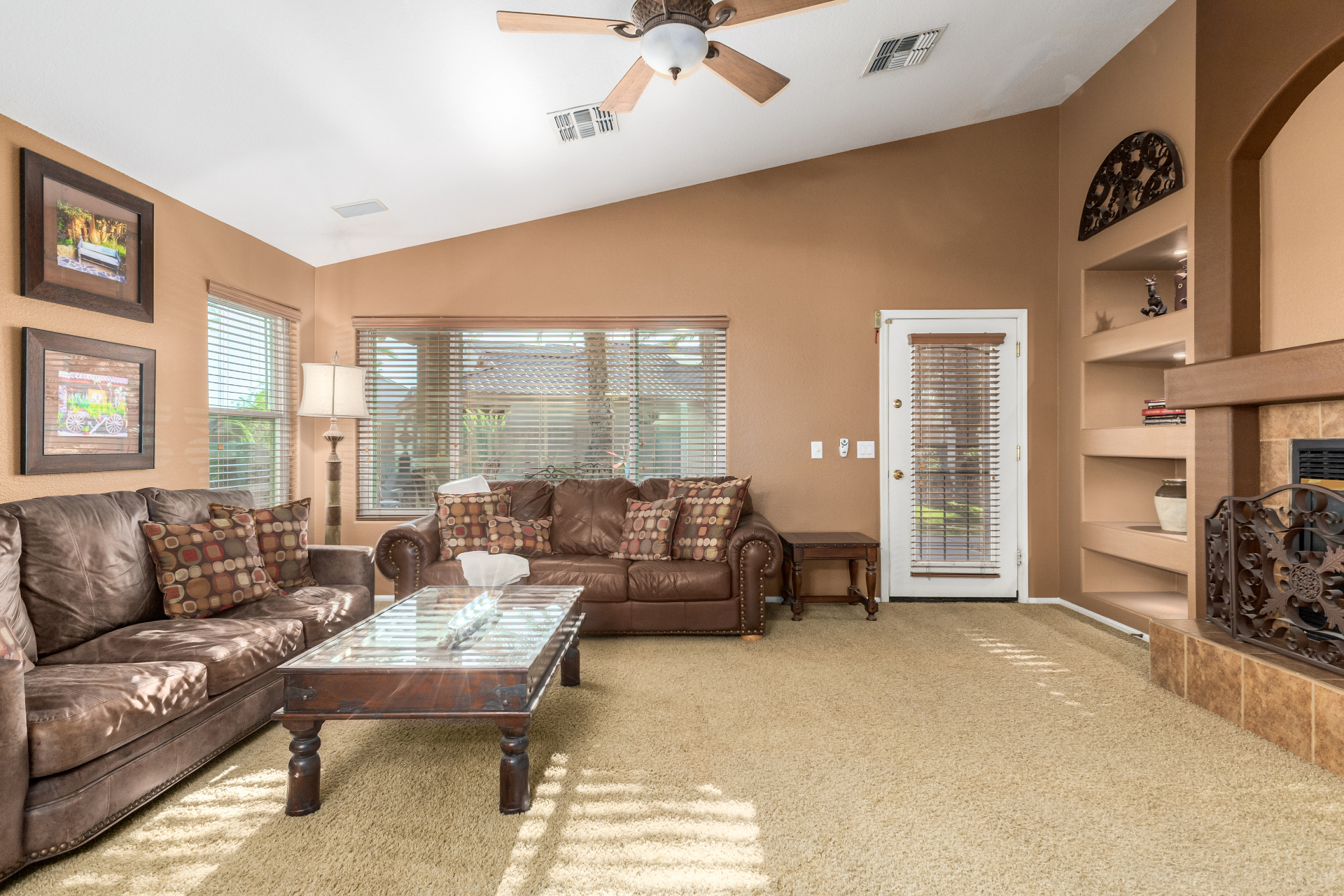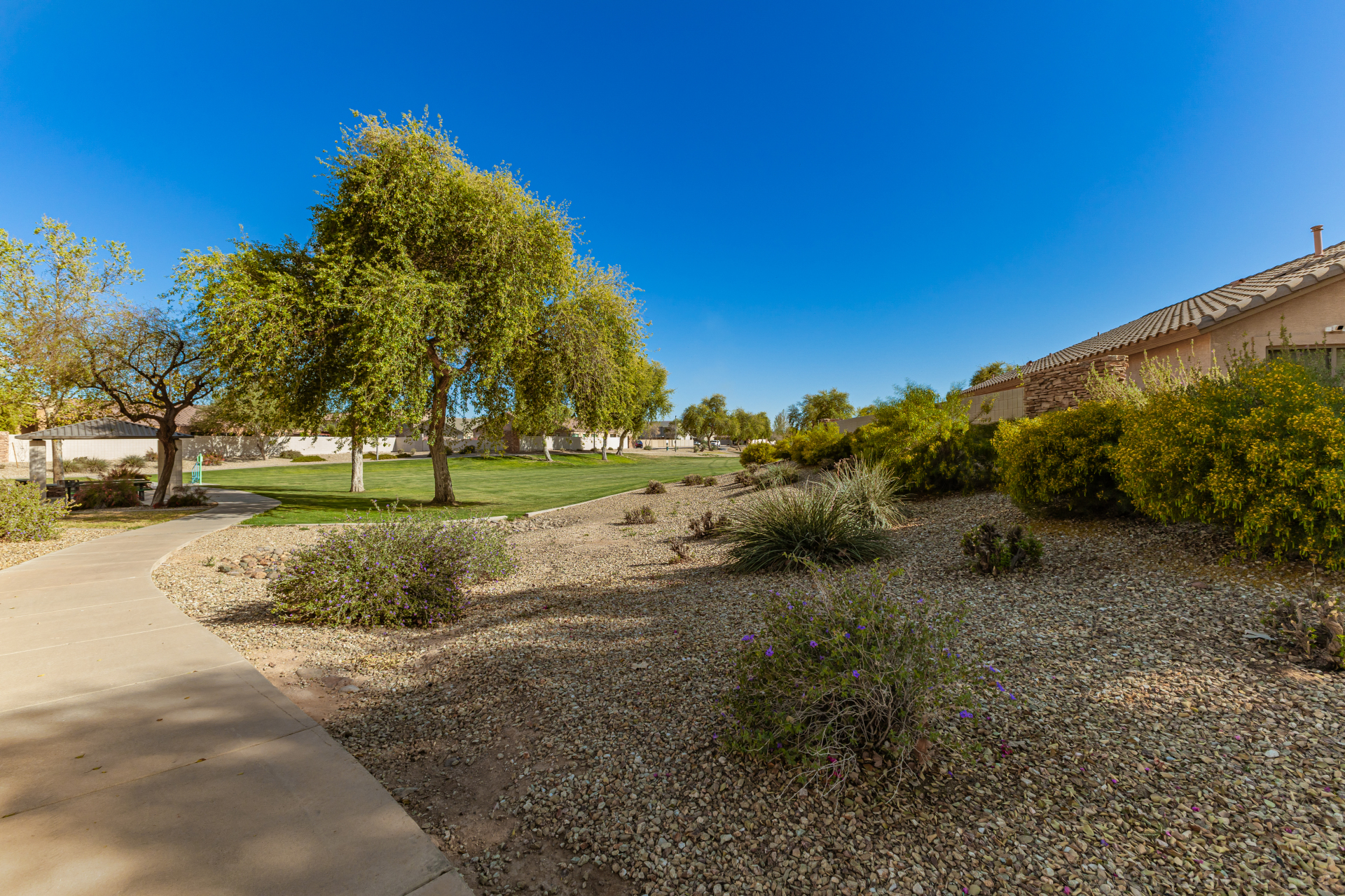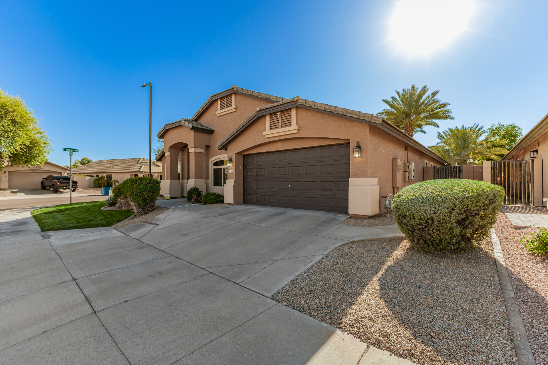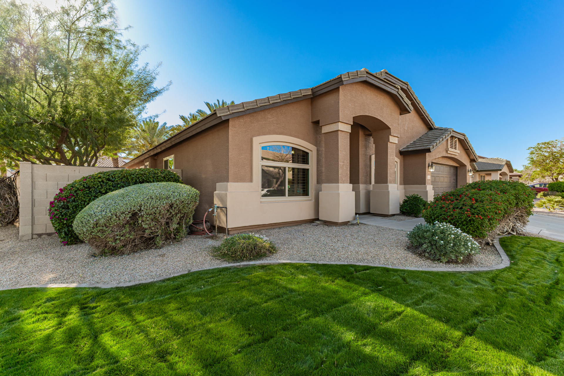 WELCOME HOME! THIS BEAUTIFUL, 3BDRM, PLUS DEN/OFFICE VIBRANT HOME FEATURES BRAND-NEW, LOW-E WINDOWS W/TRANSFERABLE WARRANTY, SOLAR SYSTEM OWNED, PLANTATION WOOD BLINDS IN FORMAL ROOMS & DEN/OFFICE, WOOD BLINDS T/O THE REST OF HOME. VAULTED CEILINGS & FRESHLY PAINTED INTERIOR T/O. COZY FIREPLACE IN FAMILY ROOM W/ BUILT-IN LIGHTED NICHES & SURROUND SOUND T/O THE HOME AND EXTENDED BACK PATIO. PRIMARY RETREAT HAS A PRIVATE EXIT THAT LEADS TO THE BACKYARD OASIS, WHICH BOOSTS THE BEAUTIFUL AROMA OF THE JASMINE PLANTS. THIS BACKYARD IS DESIGNED FOR ENTERTAINING AND ENJOYING OUR BEAUTIFUL AZ SUNSETS. THIS AMAZING HOME IS SITUATED ON A LARGE, WELL-MAINTAINED CORNER LOT. GARAGE IS PRE-PLUMBED FOR SINK. ALL APPLIANCES CONVEY INCLUDING REFRIGERATOR IN LAUNDRY RM. MUST SEE TO APPRECIATE.