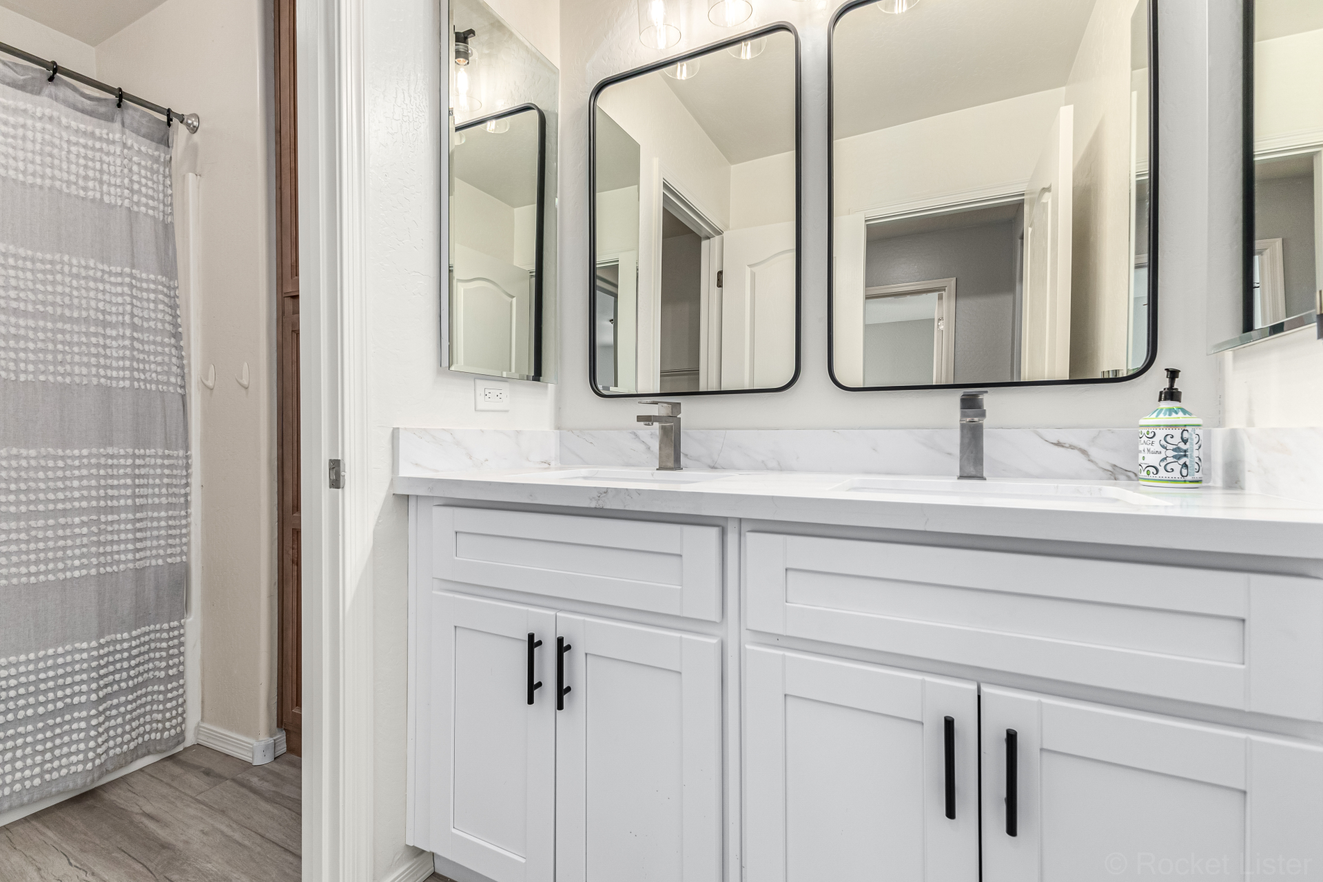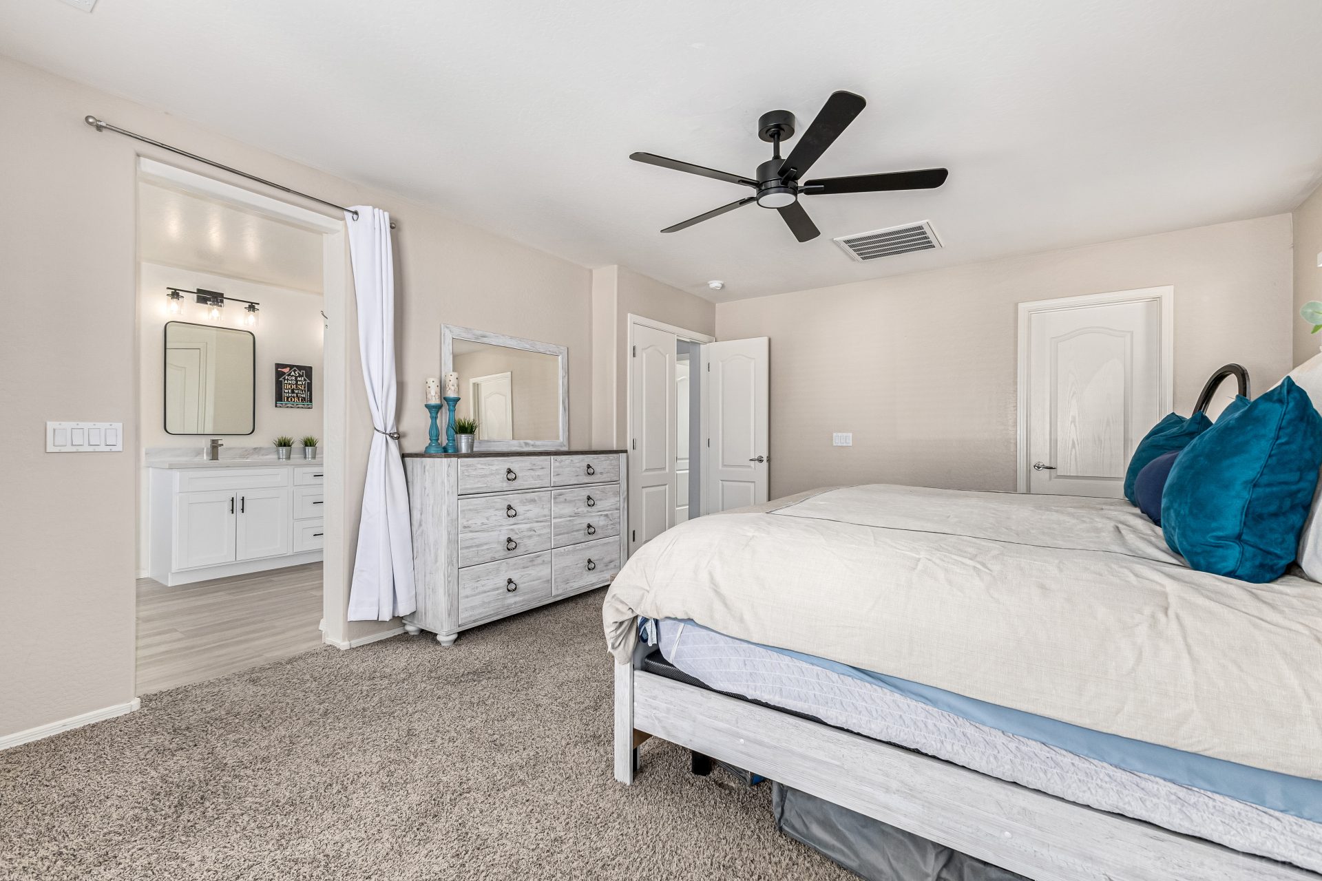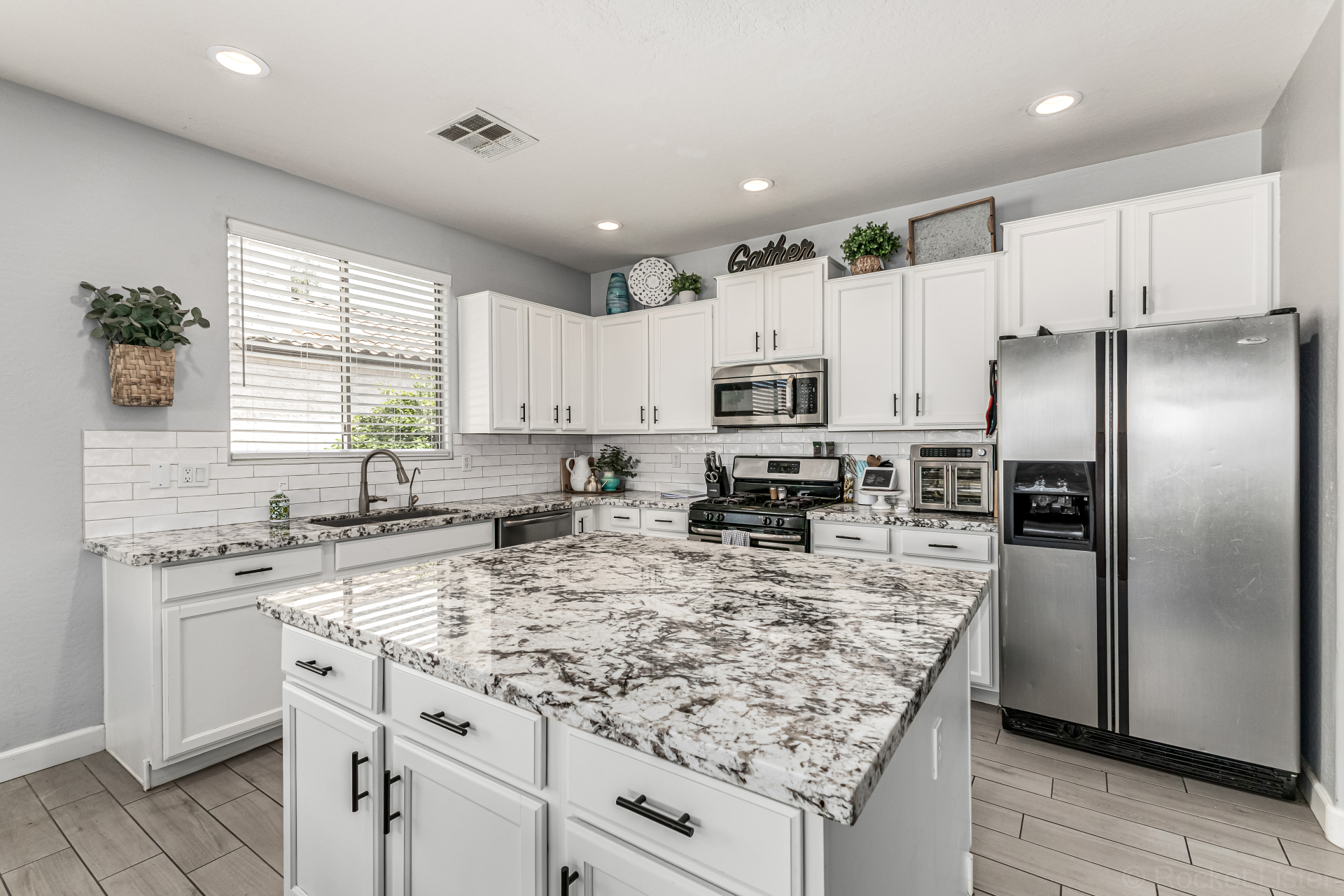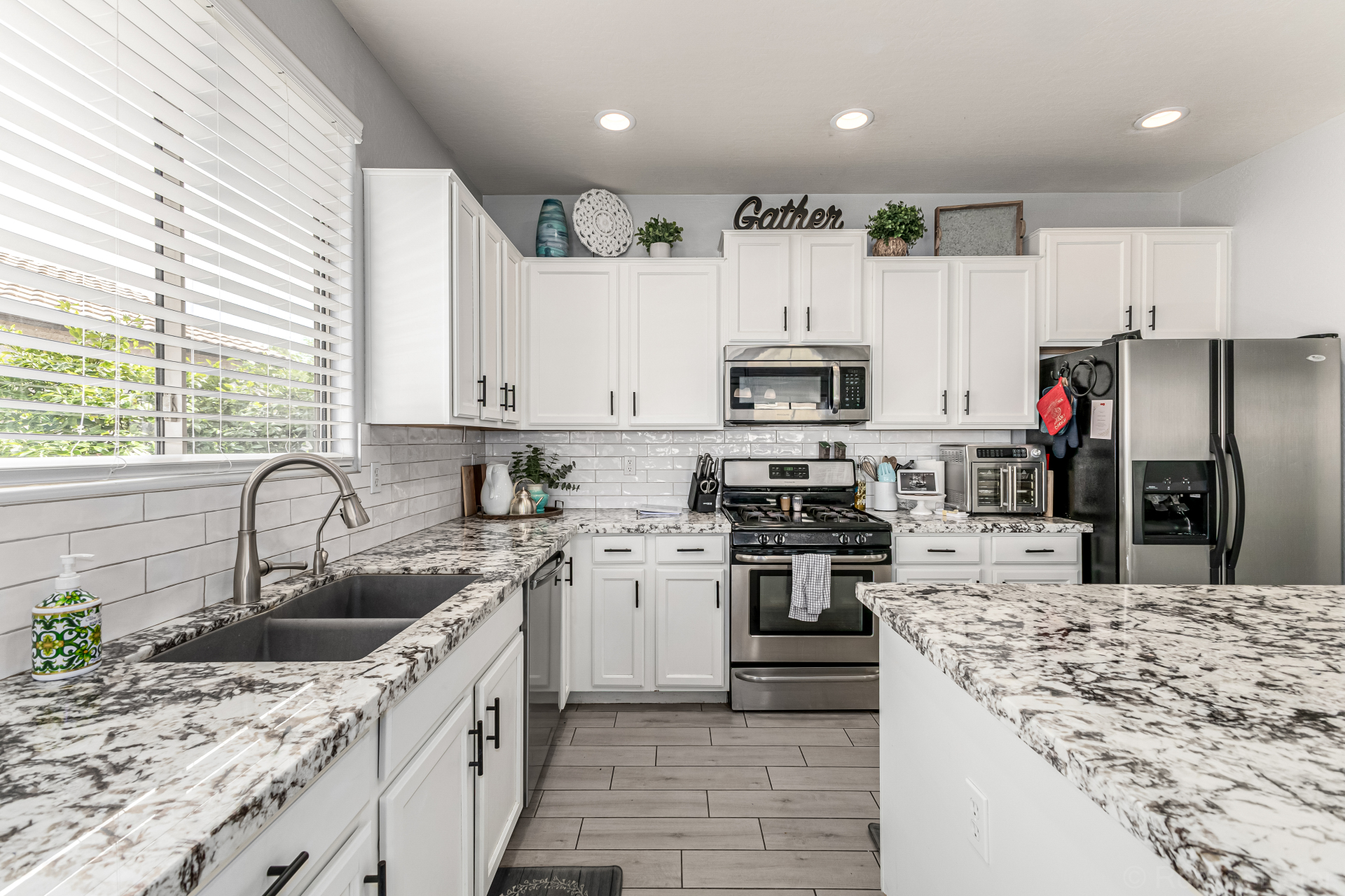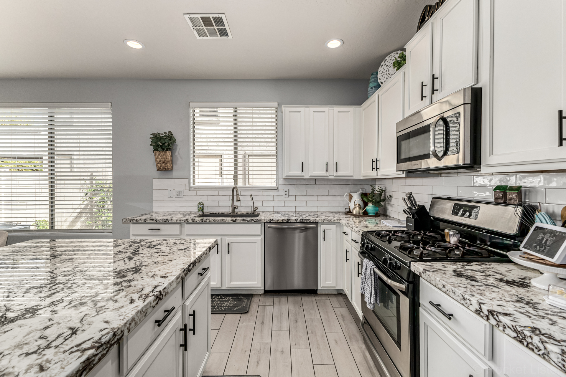 Secondary bathroom has also been fully renovated with new cabinetry, double sinks, quartz counters & beautiful white cabinets, delivering both comfort & modern appeal*Additional interior highlights include fresh paint, stylish plank-tile flooring, updated window coverings & new ceiling fans.