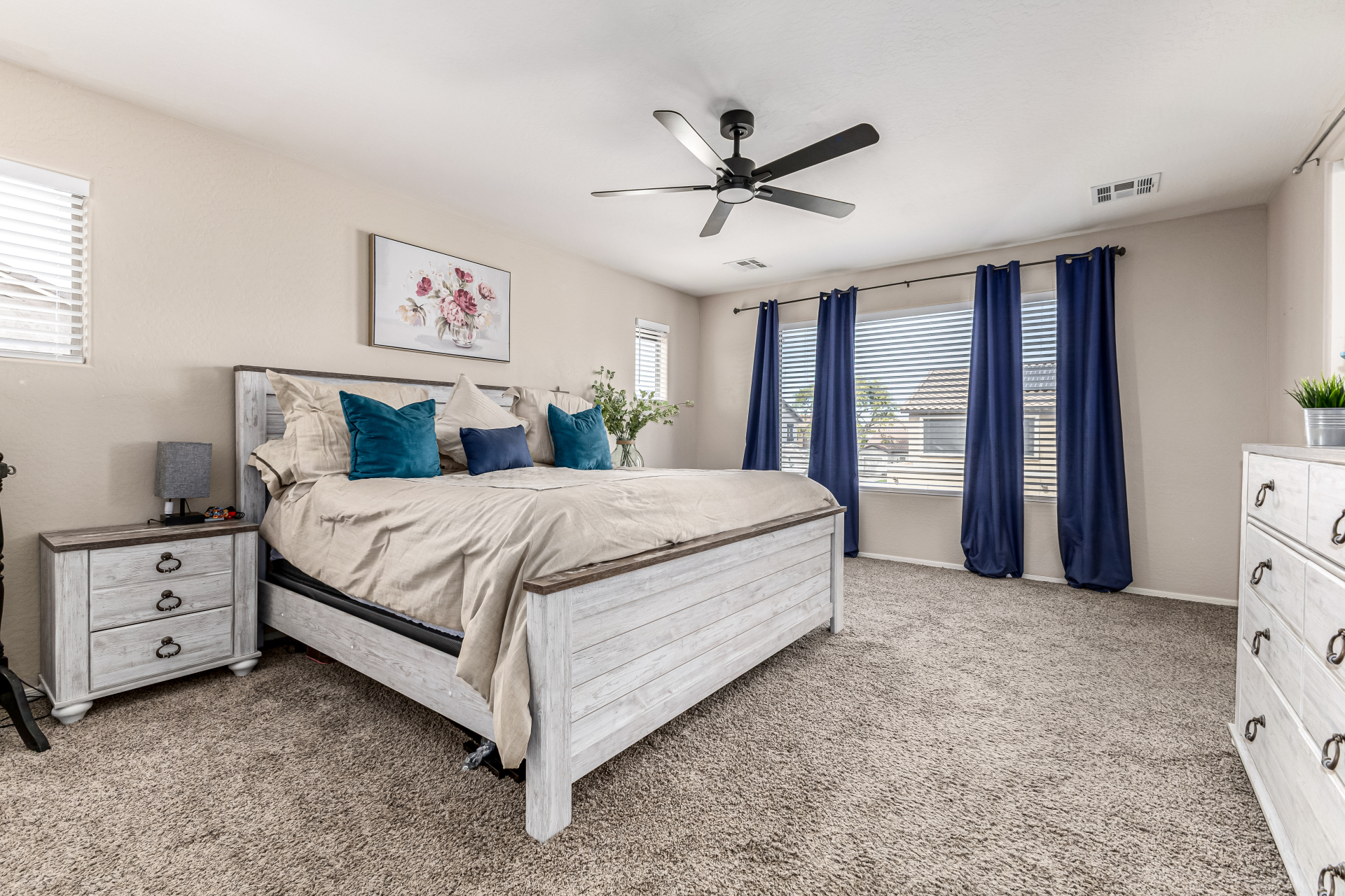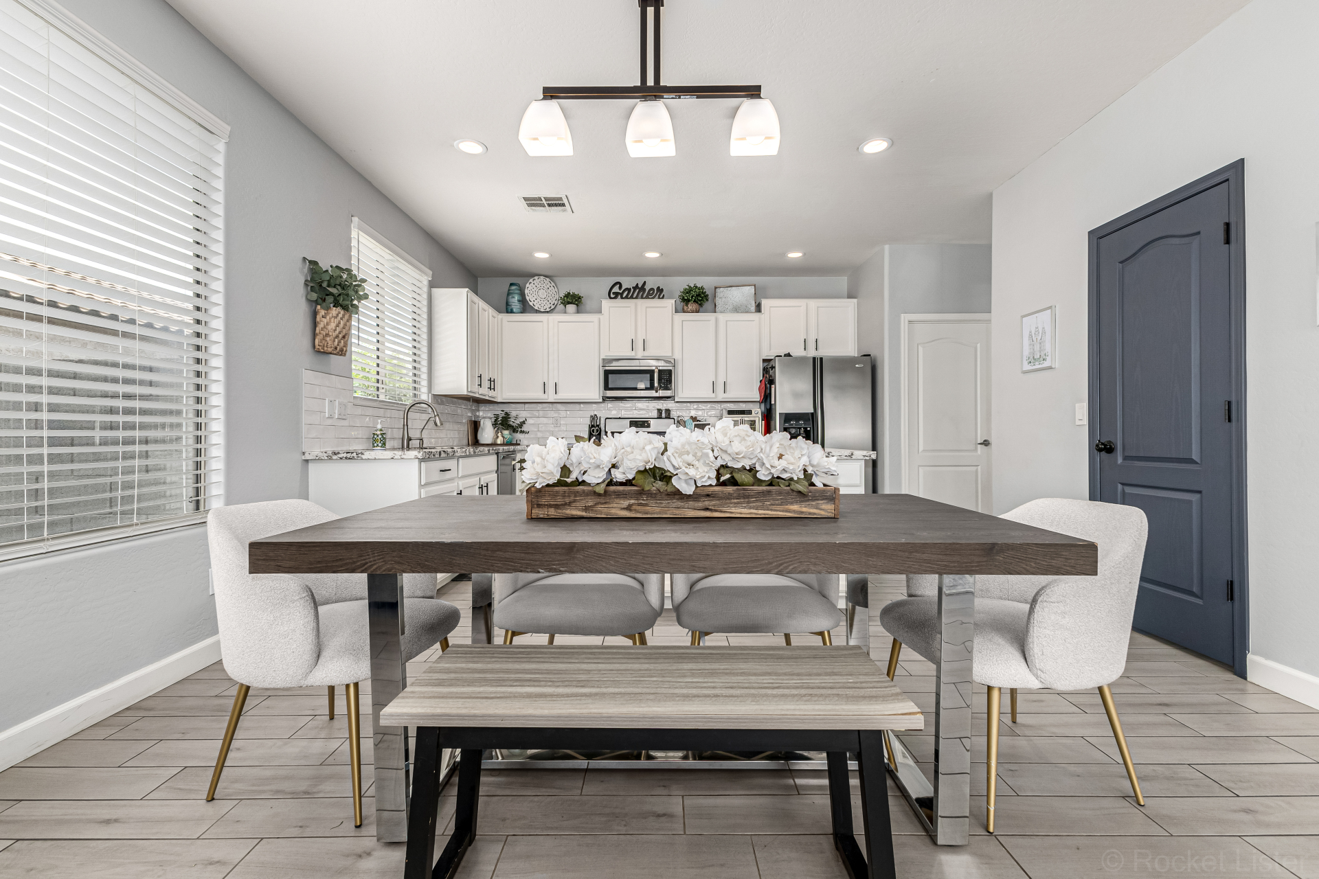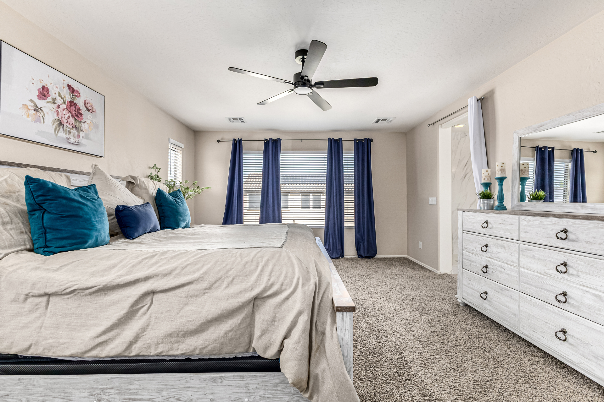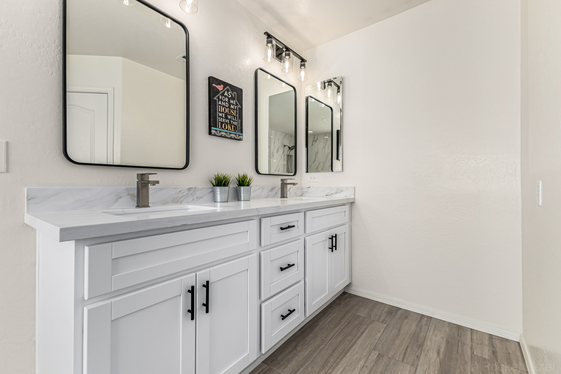 Secondary bathroom has also been fully renovated with new cabinetry, double sinks, quartz counters & beautiful white cabinets, delivering both comfort & modern appeal*Additional interior highlights include fresh paint, stylish plank-tile flooring, updated window coverings & new ceiling fans.