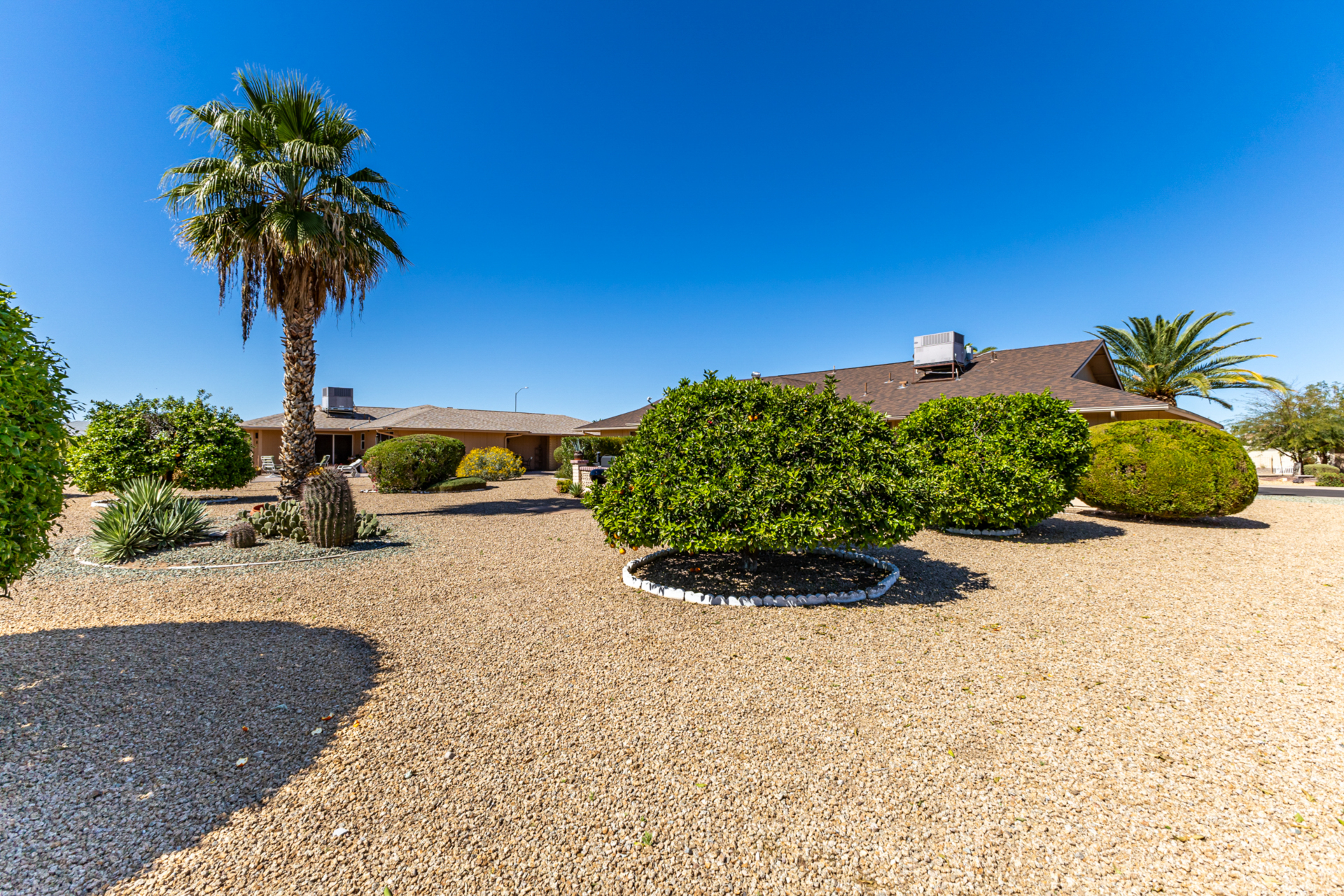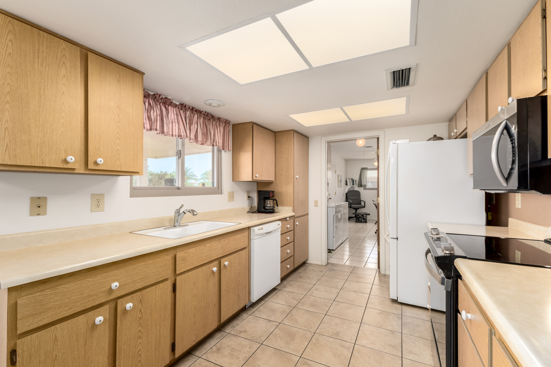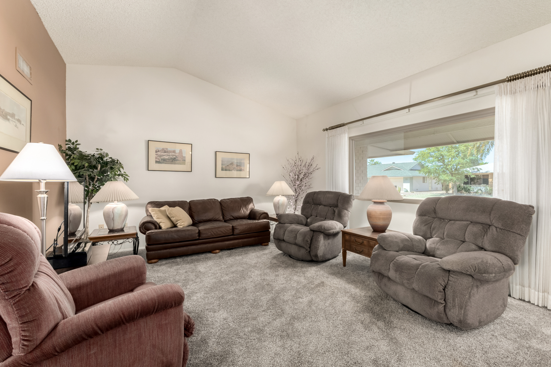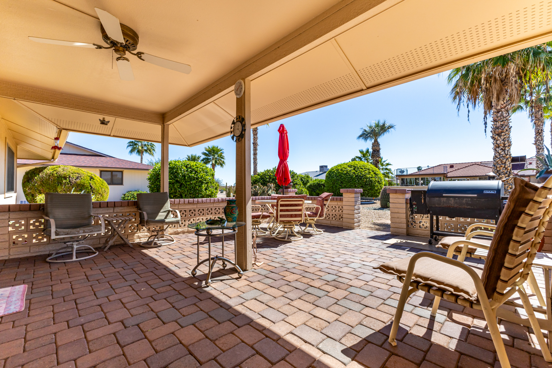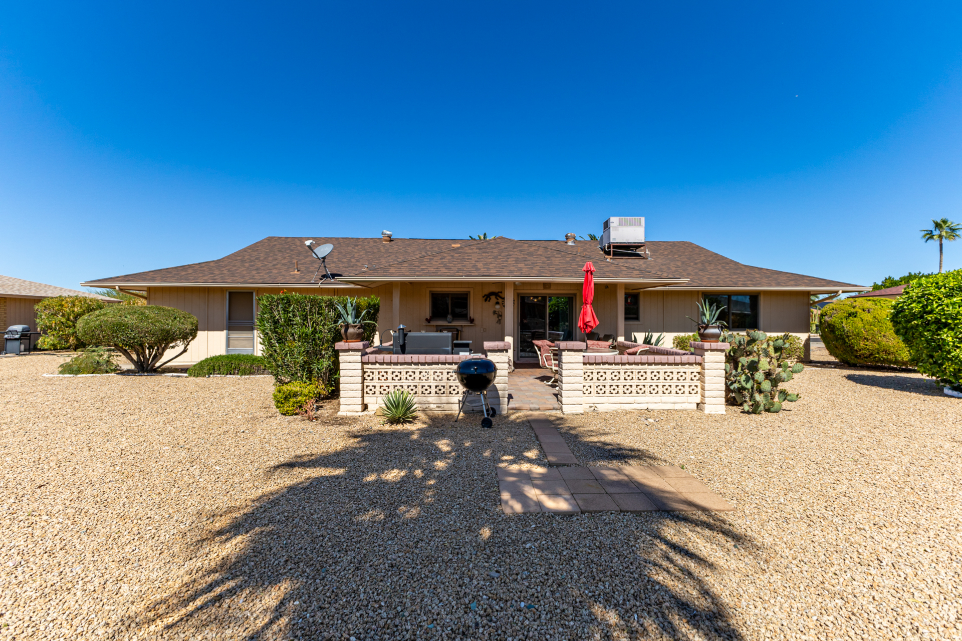 Beautiful 2-bedroom, 2-bathroom, 1,310 sq ft Kaibab model located on a large lot with desirable north-south exposure in Sun City West with No HOA and low taxes. The property features beautiful desert landscaping with four fruit trees, creating a peaceful outdoor setting. Step inside to an open floor plan with vaulted ceilings, neutral paint, newer carpet, and tile in all the right places. Newer windows and sliders throughout, along with a newer roof, provide peace of mind. The light-filled kitchen offers updated appliances and plenty of space, while the primary bathroom features dual vanities, a walk-in shower, and updated fixtures and toilet. A large utility room with indoor laundry and wash sink provides excellent storage and flexibility, with room for a small office, craft, or hobby area. Enjoy those Arizona evenings in your large private backyard complete with pavers, perfect for relaxing or entertaining. This home is sold furnished and move-in ready, ideal for full-time living, seasonal retreats, or rentals.