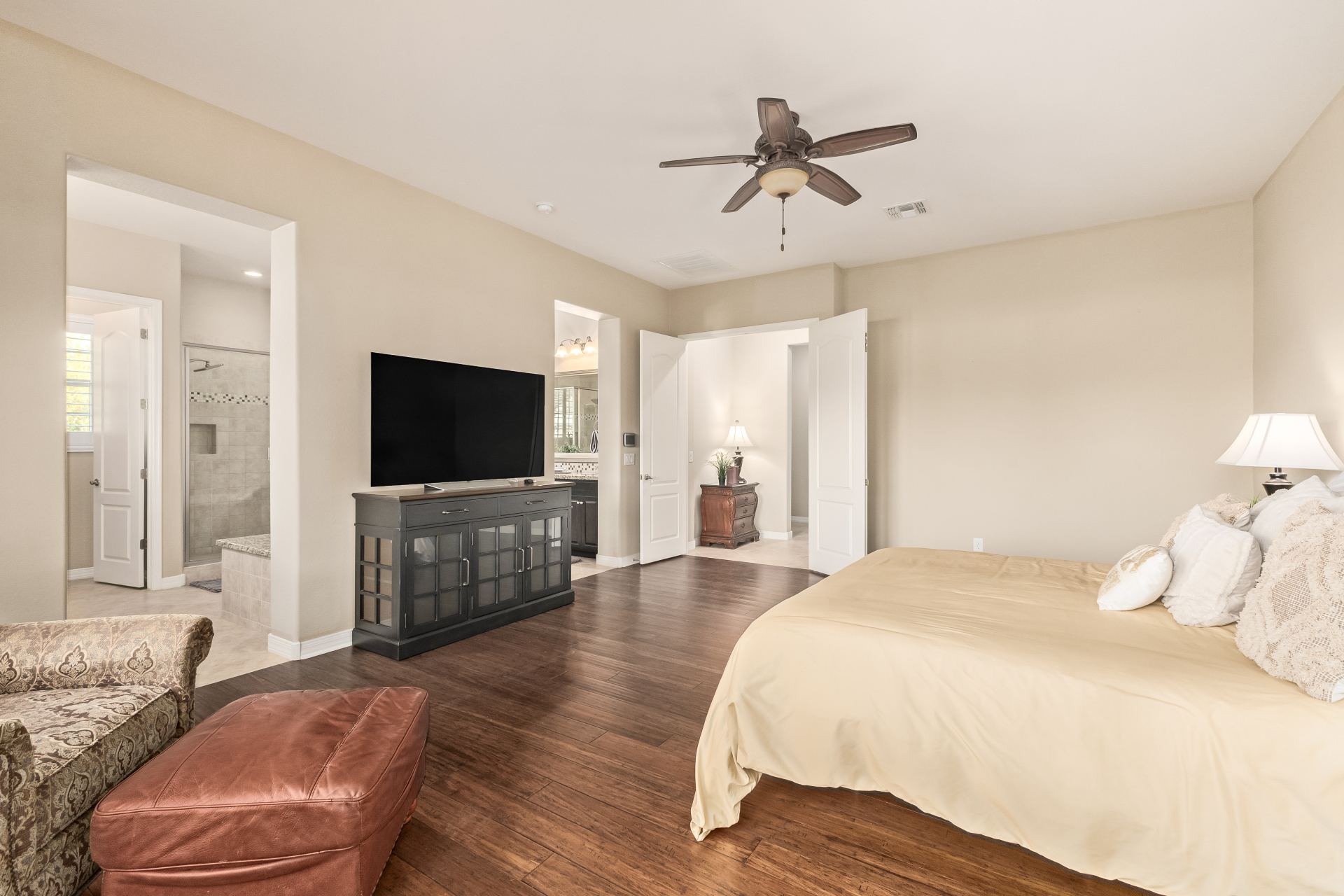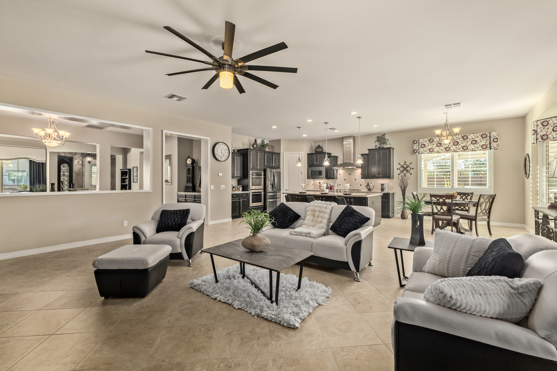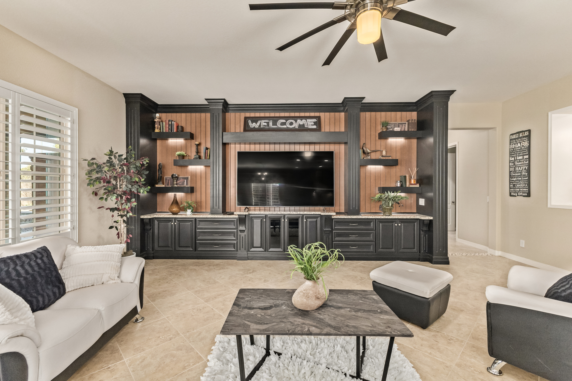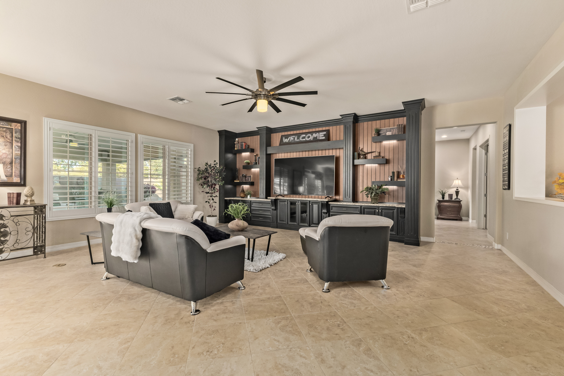 Your dream home is finally within reach! This gorgeous 5-bedroom residence welcomes you with a 3-car garage, an RV gate, a low-maintenance yard with artificial turf, and a courtyard that sets an inviting atmosphere. Fall in love with the serene living room featuring high ceilings, a soothing palette, and durable tile flooring. Spend intimate moments with loved ones in the spacious great room, complete with classic plantation shutters, a media center, and sliding door access to the backyard for seamless indoor-outdoor flow. The impeccable chef's kitchen comes with granite counters, custom cabinetry, chic pendant/recessed lighting, a tile backsplash, high-end stainless steel appliances, a walk-in pantry, and an island with a breakfast bar for casual dining.
