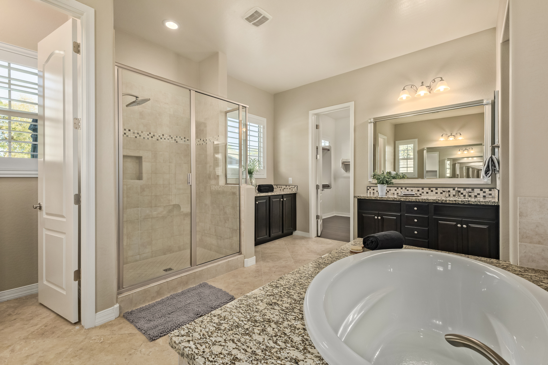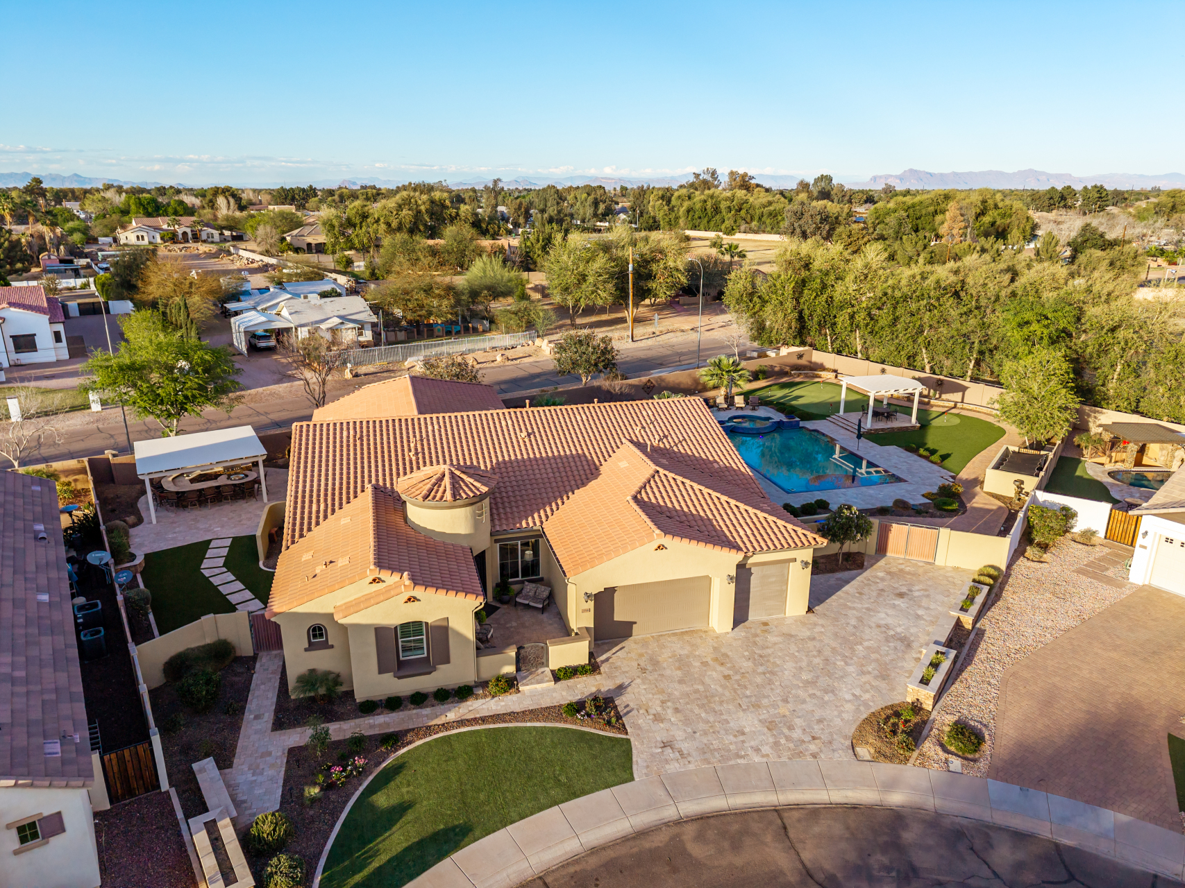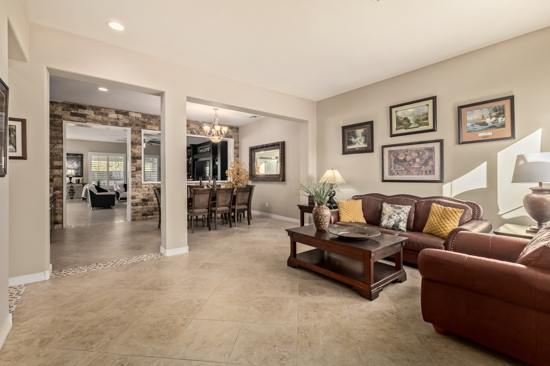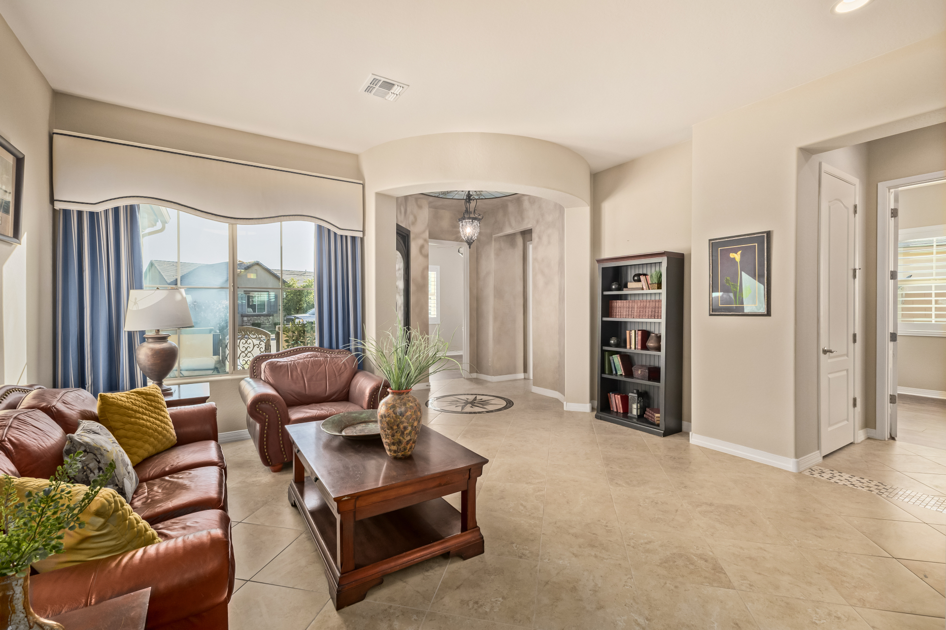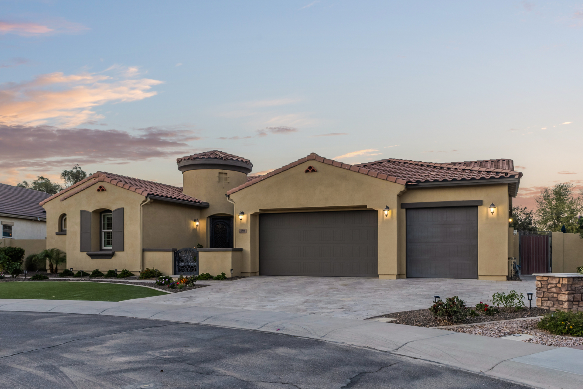 Your dream home is finally within reach! This gorgeous 5-bedroom residence welcomes you with a 3-car garage, an RV gate, a low-maintenance yard with artificial turf, and a courtyard that sets an inviting atmosphere. Fall in love with the serene living room featuring high ceilings, a soothing palette, and durable tile flooring. Spend intimate moments with loved ones in the spacious great room, complete with classic plantation shutters, a media center, and sliding door access to the backyard for seamless indoor-outdoor flow. The impeccable chef's kitchen comes with granite counters, custom cabinetry, chic pendant/recessed lighting, a tile backsplash, high-end stainless steel appliances, a walk-in pantry, and an island with a breakfast bar for casual dining.