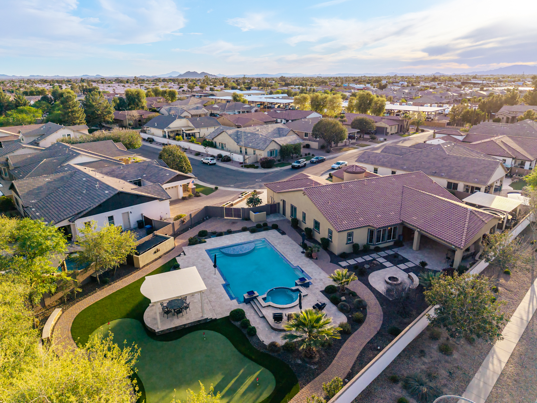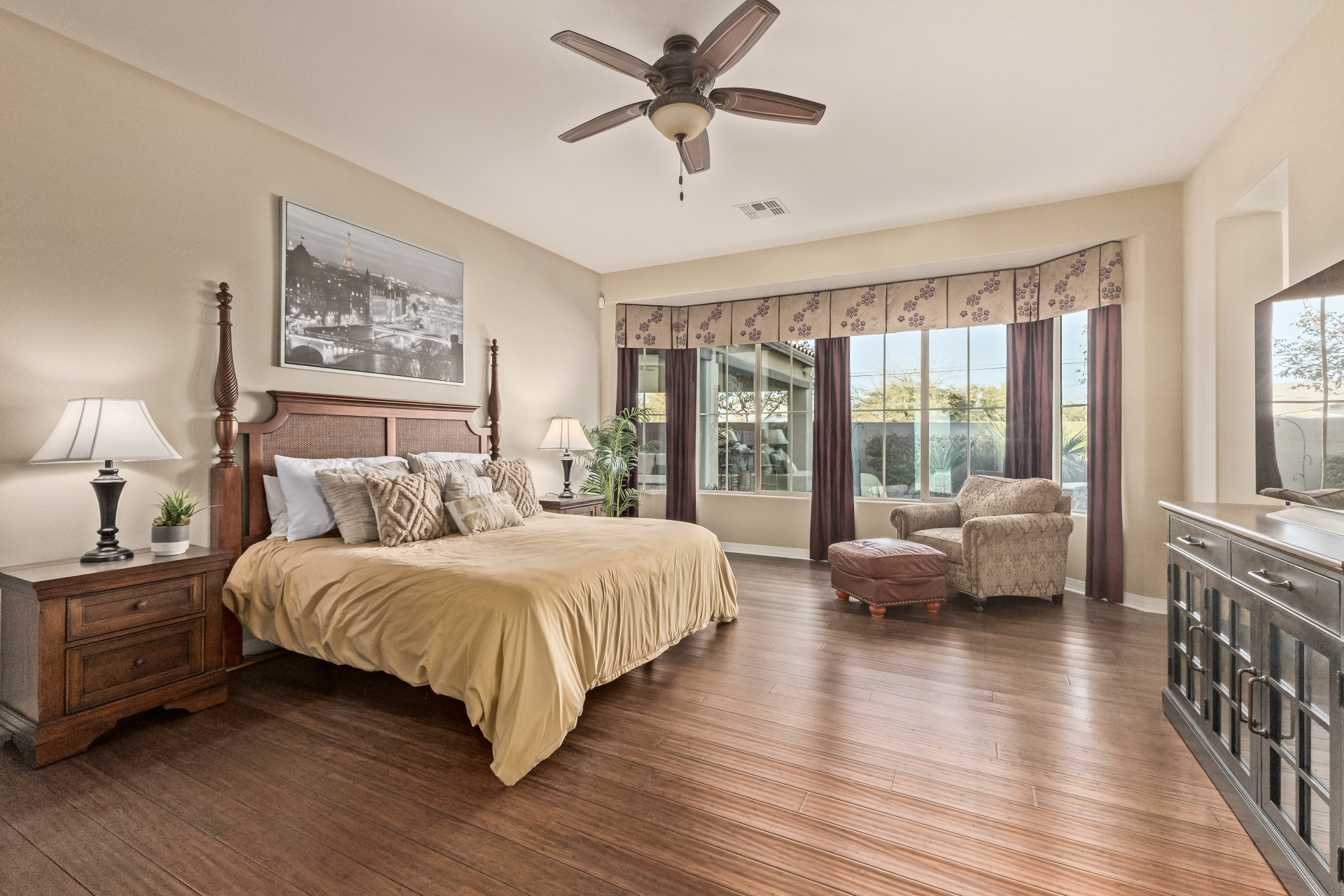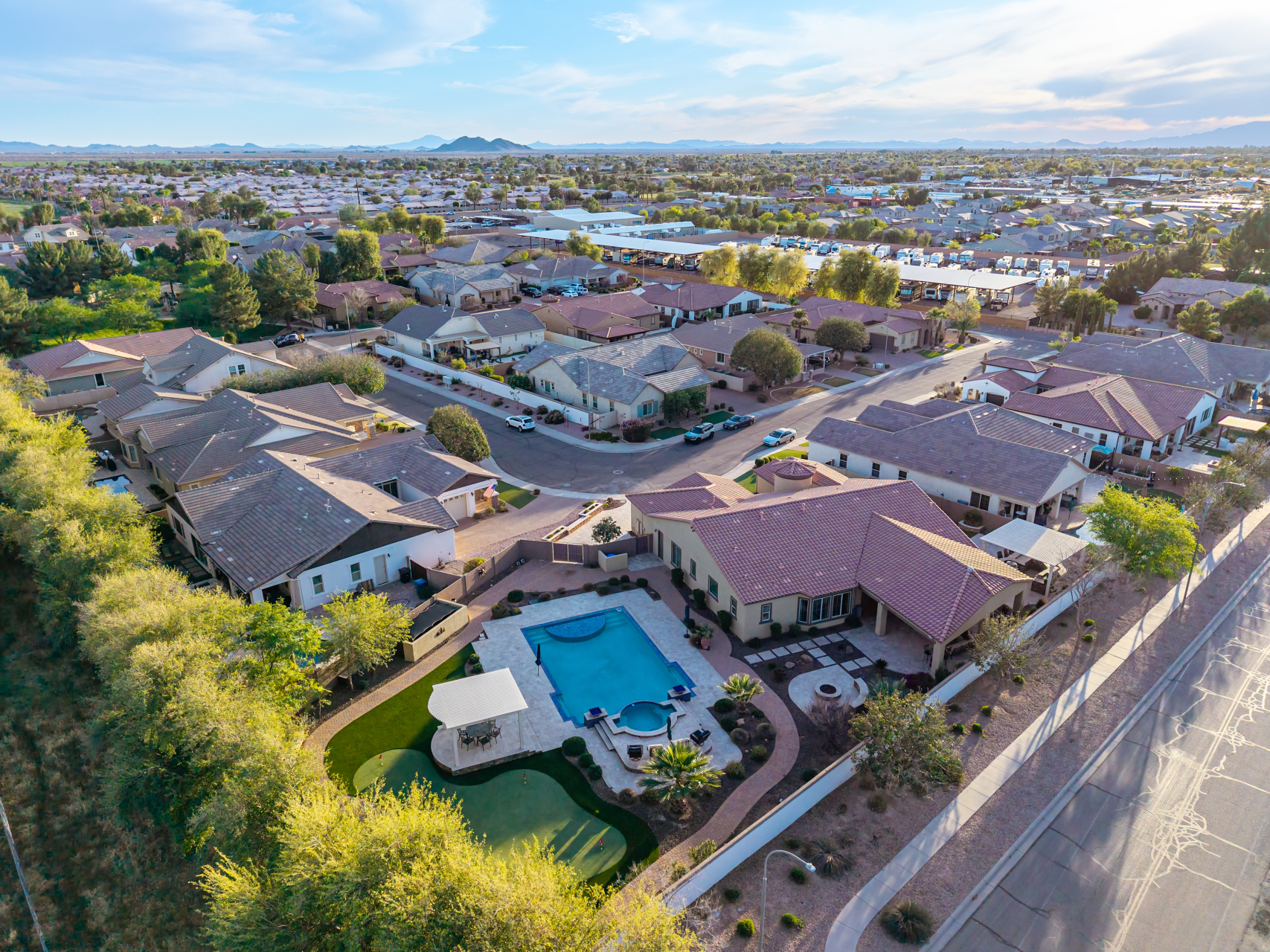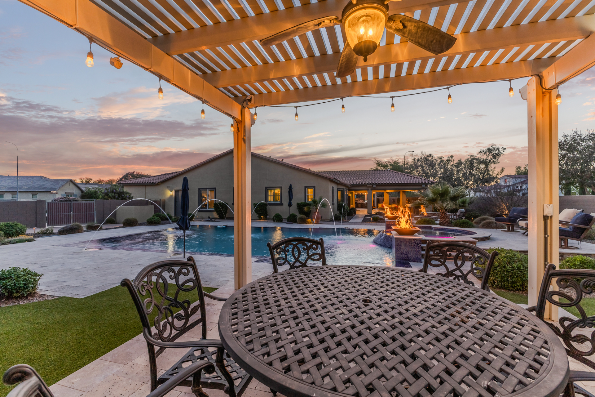 Your dream home is finally within reach! This gorgeous 5-bedroom residence welcomes you with a 3-car garage, an RV gate, a low-maintenance yard with artificial turf, and a courtyard that sets an inviting atmosphere. Fall in love with the serene living room featuring high ceilings, a soothing palette, and durable tile flooring. Spend intimate moments with loved ones in the spacious great room, complete with classic plantation shutters, a media center, and sliding door access to the backyard for seamless indoor-outdoor flow. The impeccable chef's kitchen comes with granite counters, custom cabinetry, chic pendant/recessed lighting, a tile backsplash, high-end stainless steel appliances, a walk-in pantry, and an island with a breakfast bar for casual dining.