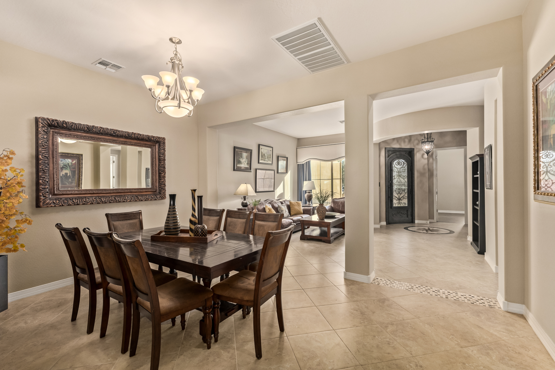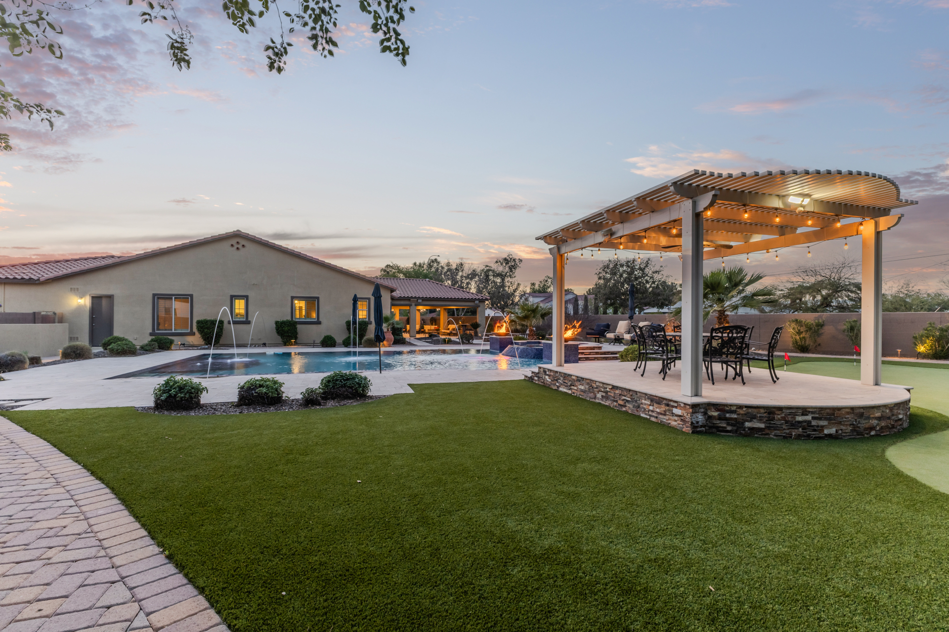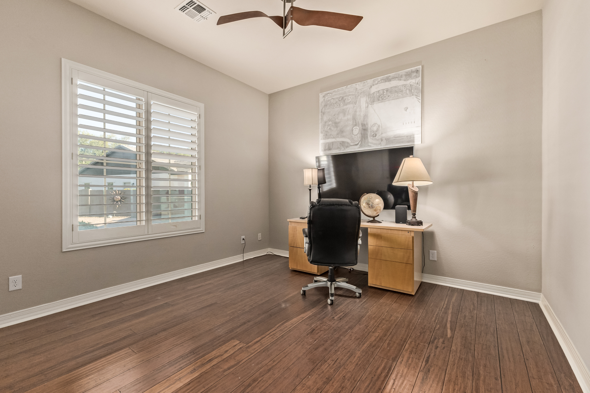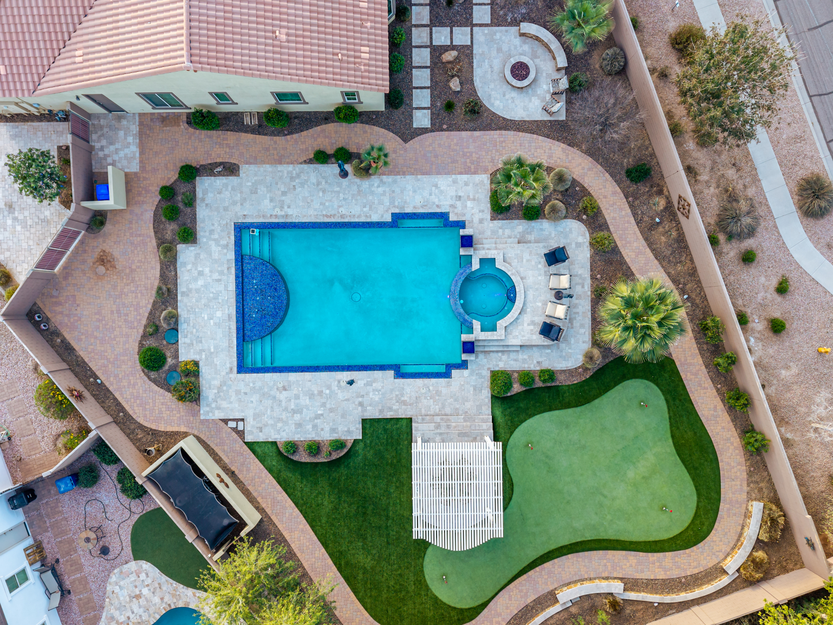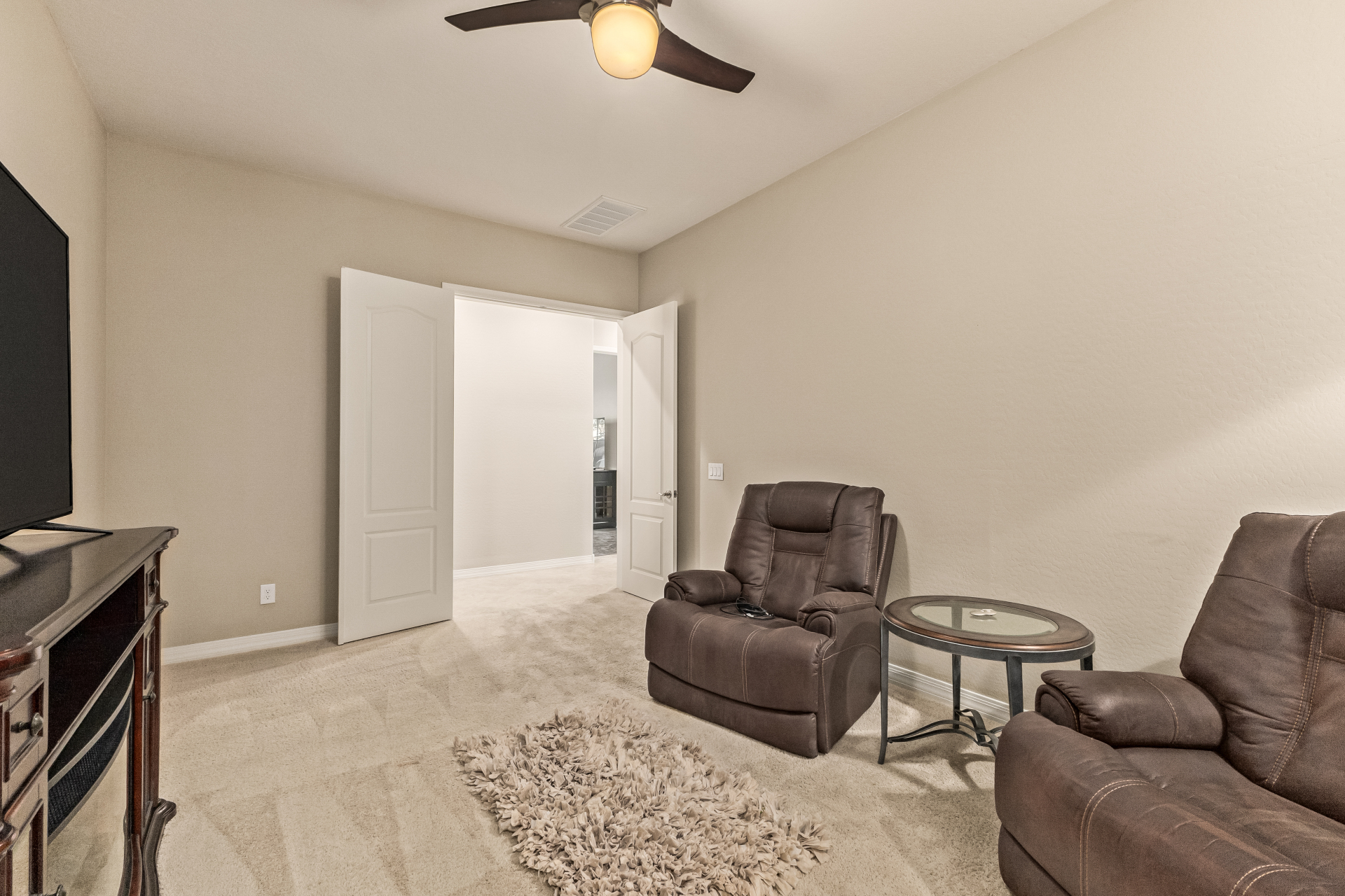 Your dream home is finally within reach! This gorgeous 5-bedroom residence welcomes you with a 3-car garage, an RV gate, a low-maintenance yard with artificial turf, and a courtyard that sets an inviting atmosphere. Fall in love with the serene living room featuring high ceilings, a soothing palette, and durable tile flooring. Spend intimate moments with loved ones in the spacious great room, complete with classic plantation shutters, a media center, and sliding door access to the backyard for seamless indoor-outdoor flow. The impeccable chef's kitchen comes with granite counters, custom cabinetry, chic pendant/recessed lighting, a tile backsplash, high-end stainless steel appliances, a walk-in pantry, and an island with a breakfast bar for casual dining.