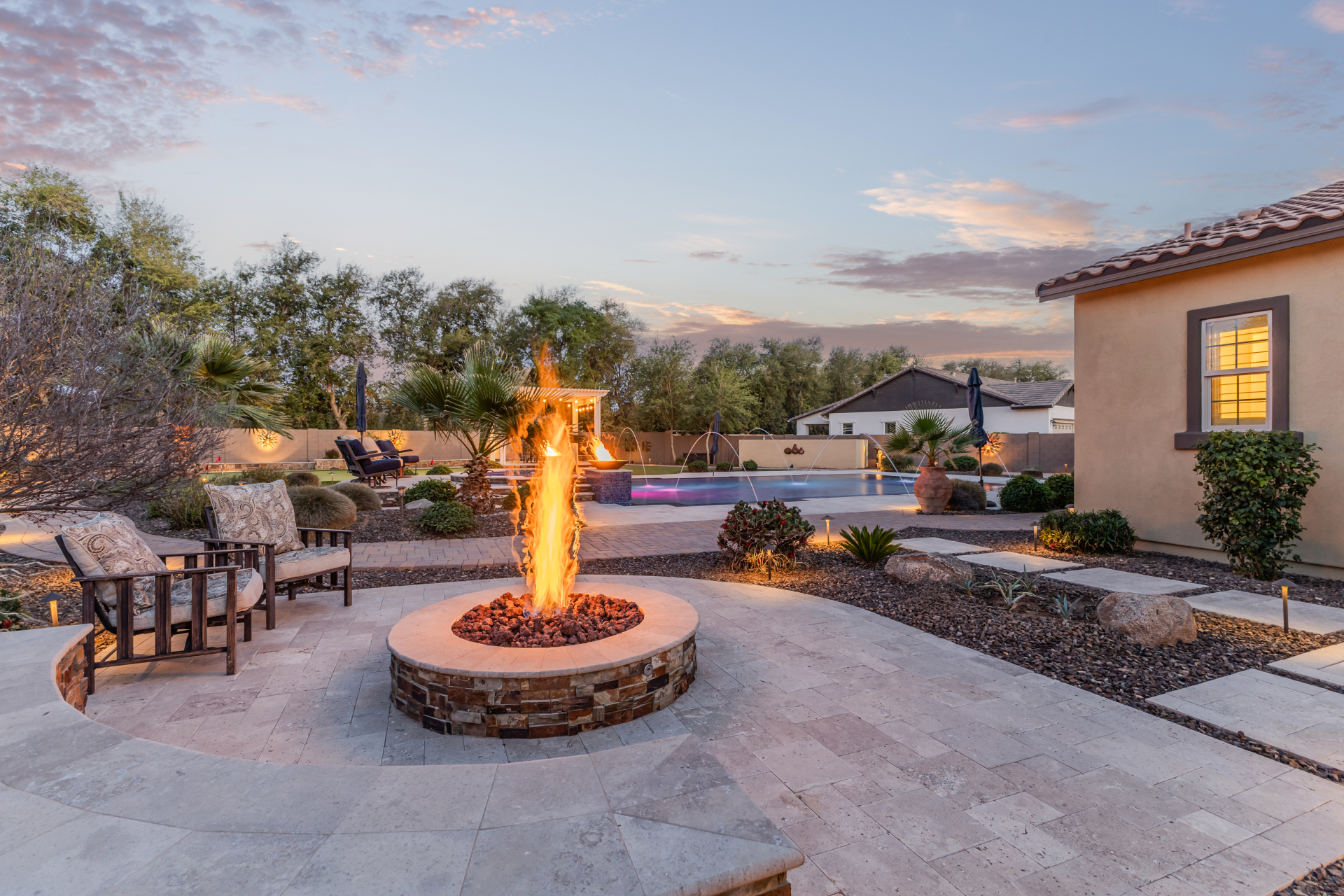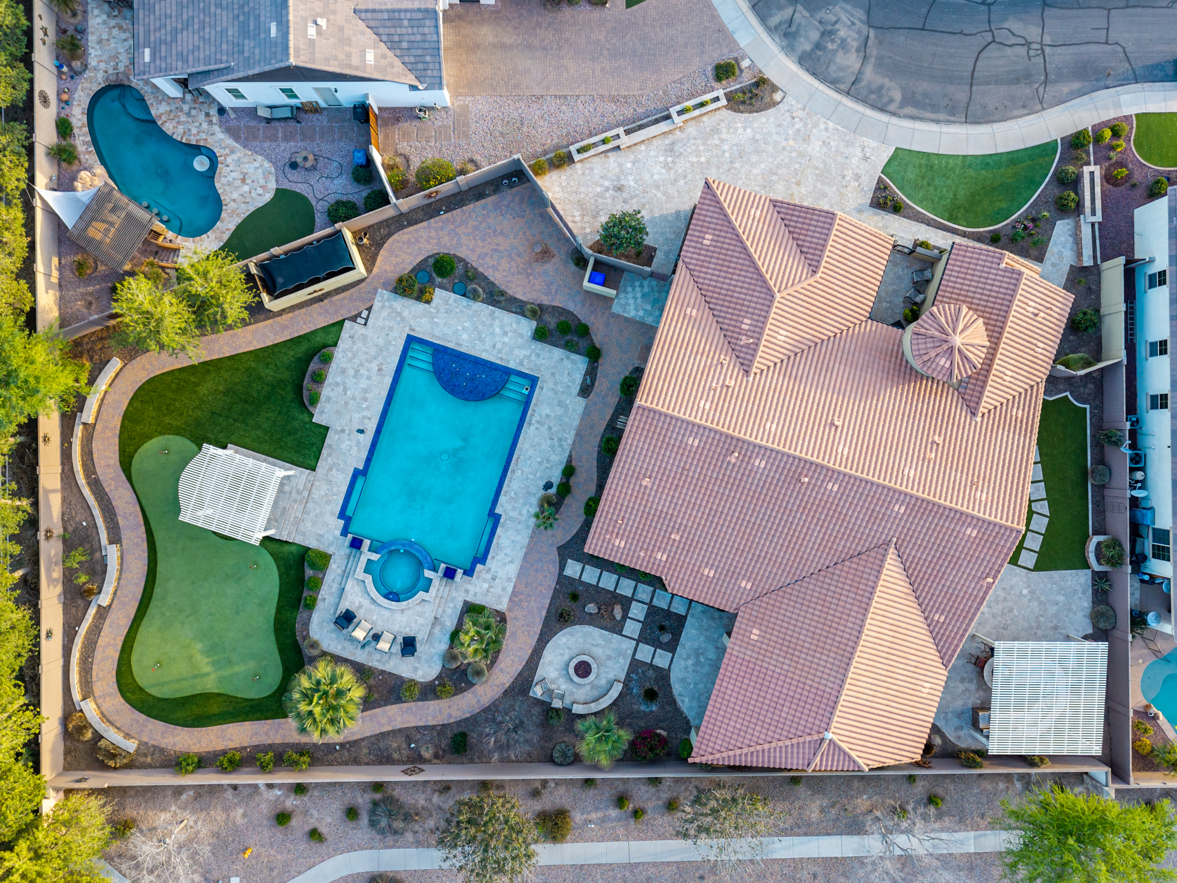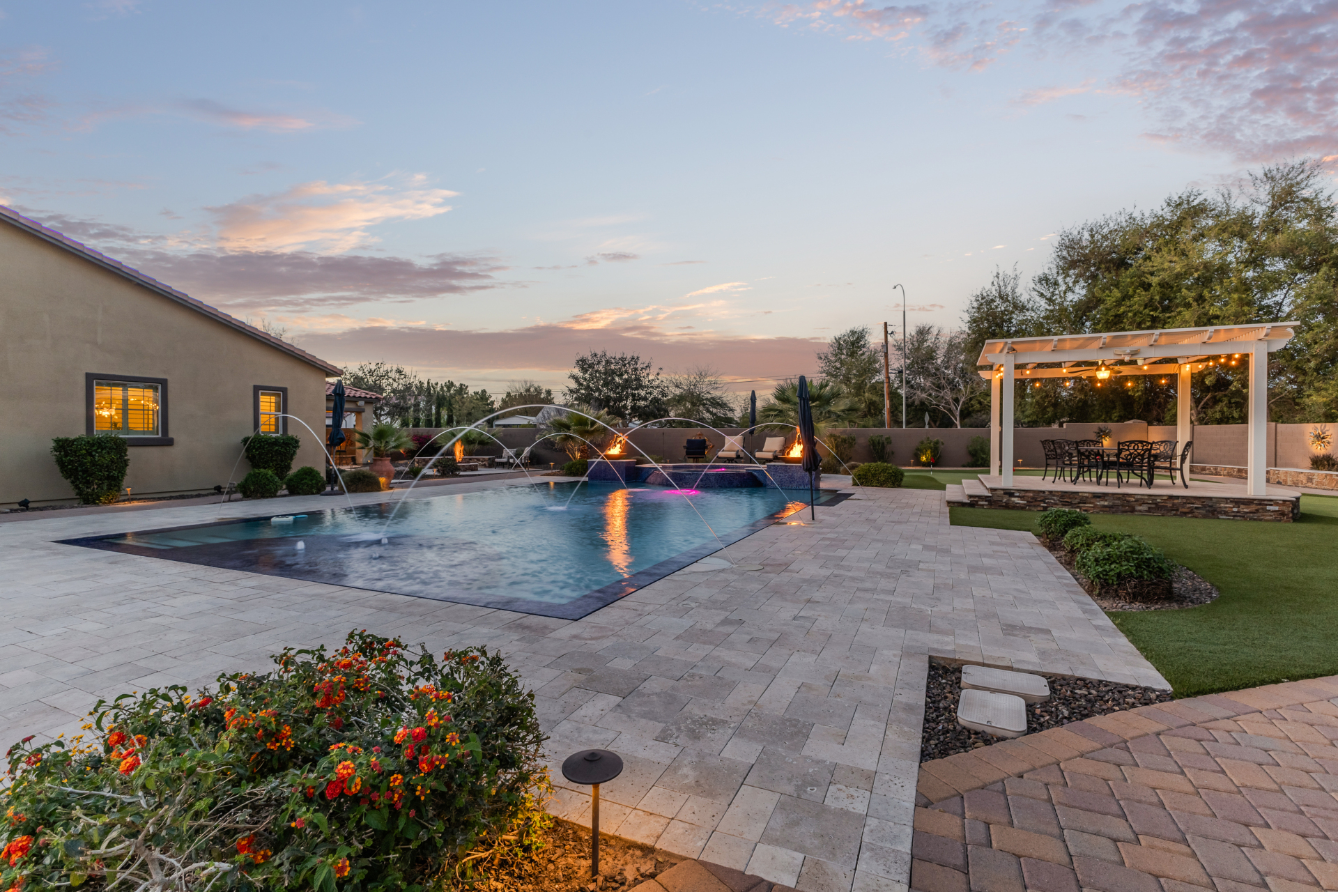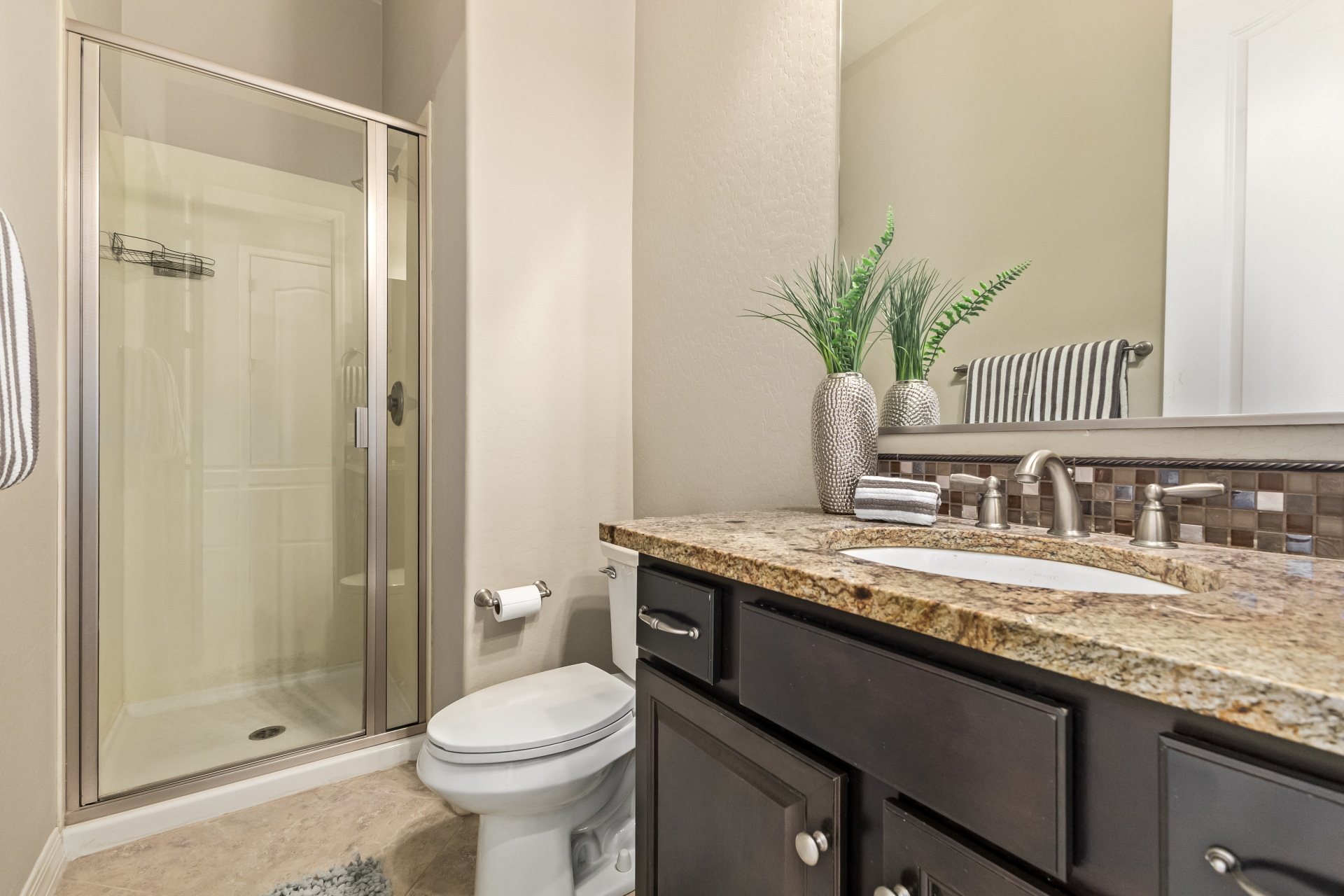 Your dream home is finally within reach! This gorgeous 5-bedroom residence welcomes you with a 3-car garage, an RV gate, a low-maintenance yard with artificial turf, and a courtyard that sets an inviting atmosphere. Fall in love with the serene living room featuring high ceilings, a soothing palette, and durable tile flooring. Spend intimate moments with loved ones in the spacious great room, complete with classic plantation shutters, a media center, and sliding door access to the backyard for seamless indoor-outdoor flow. The impeccable chef's kitchen comes with granite counters, custom cabinetry, chic pendant/recessed lighting, a tile backsplash, high-end stainless steel appliances, a walk-in pantry, and an island with a breakfast bar for casual dining.