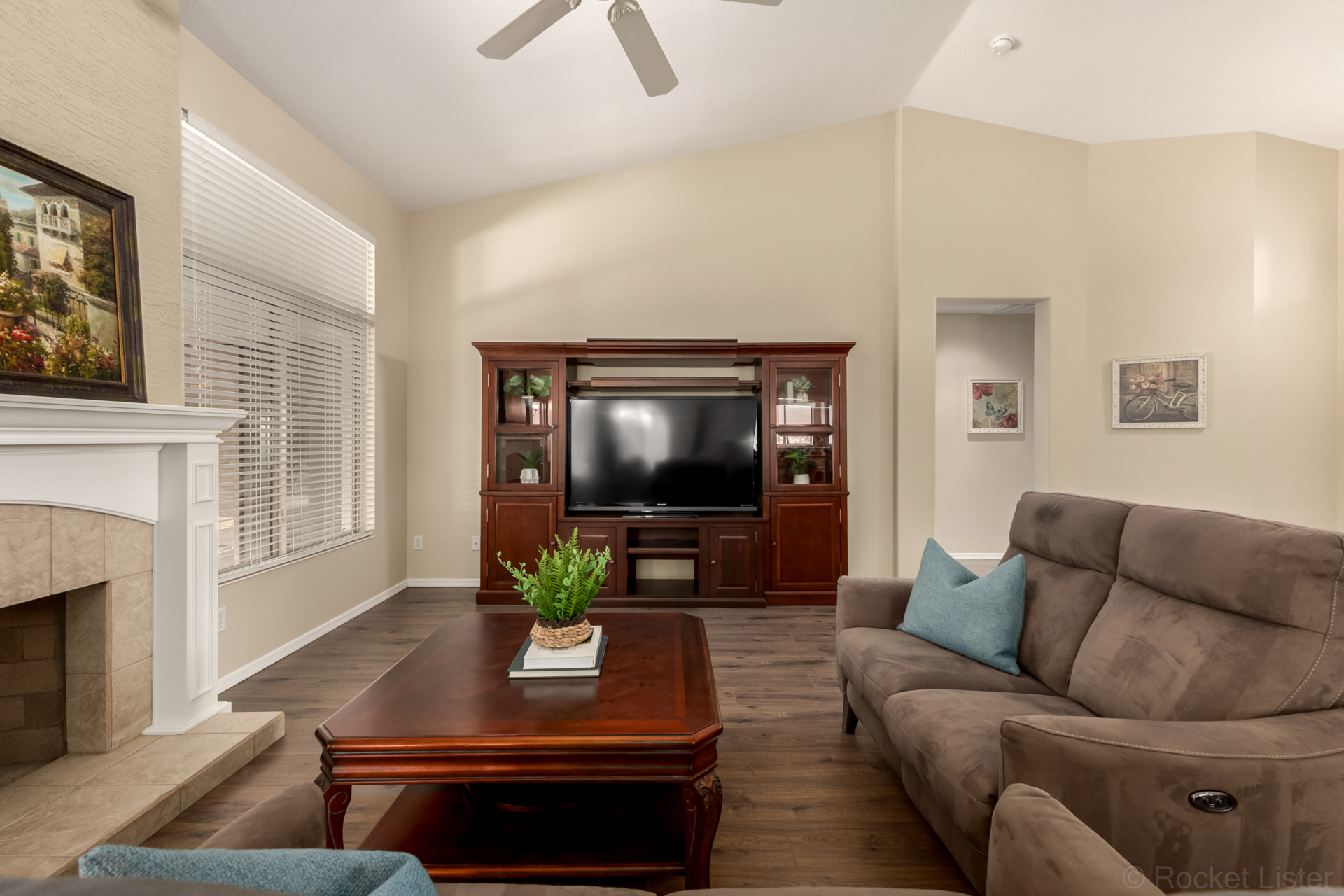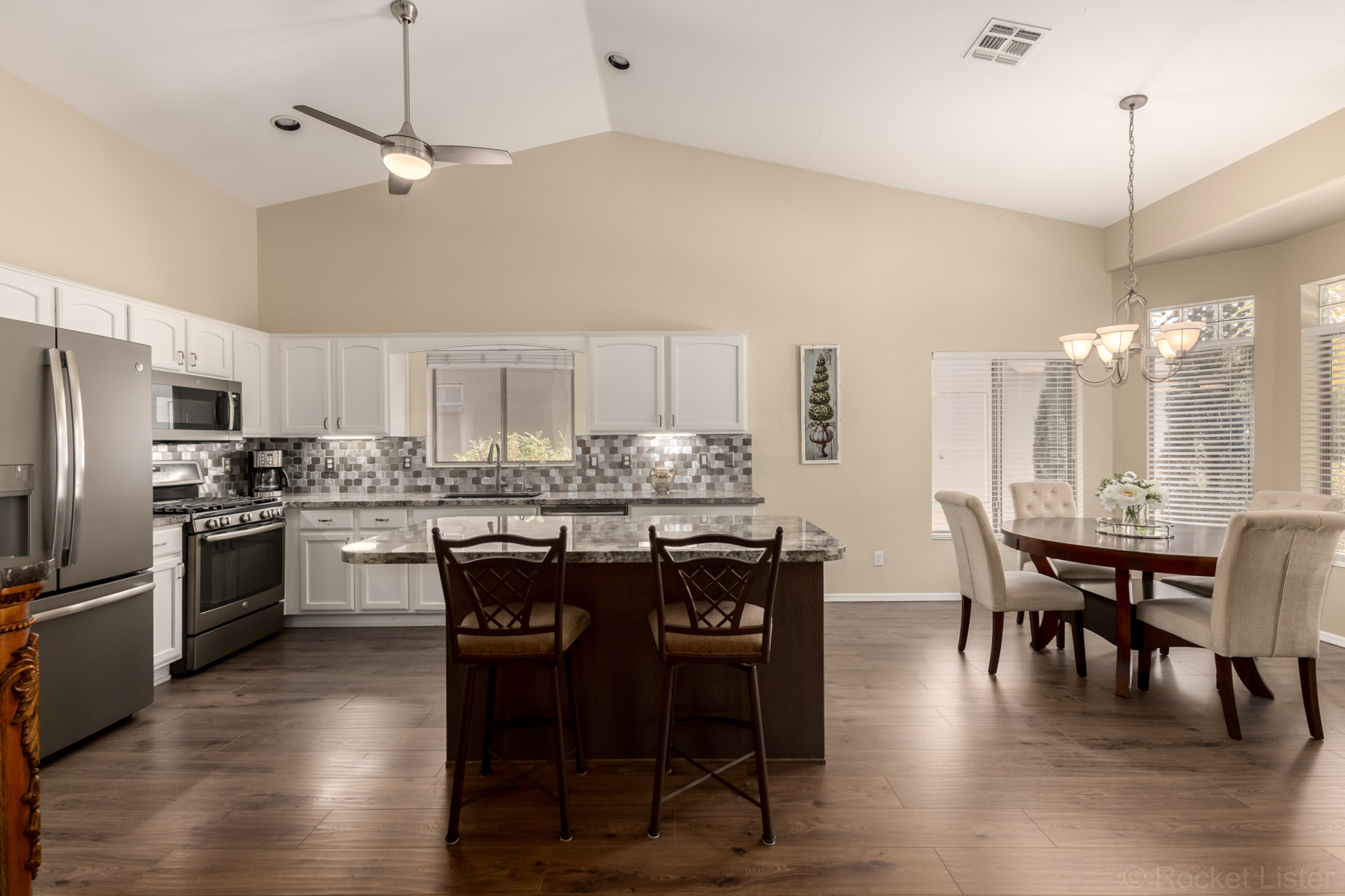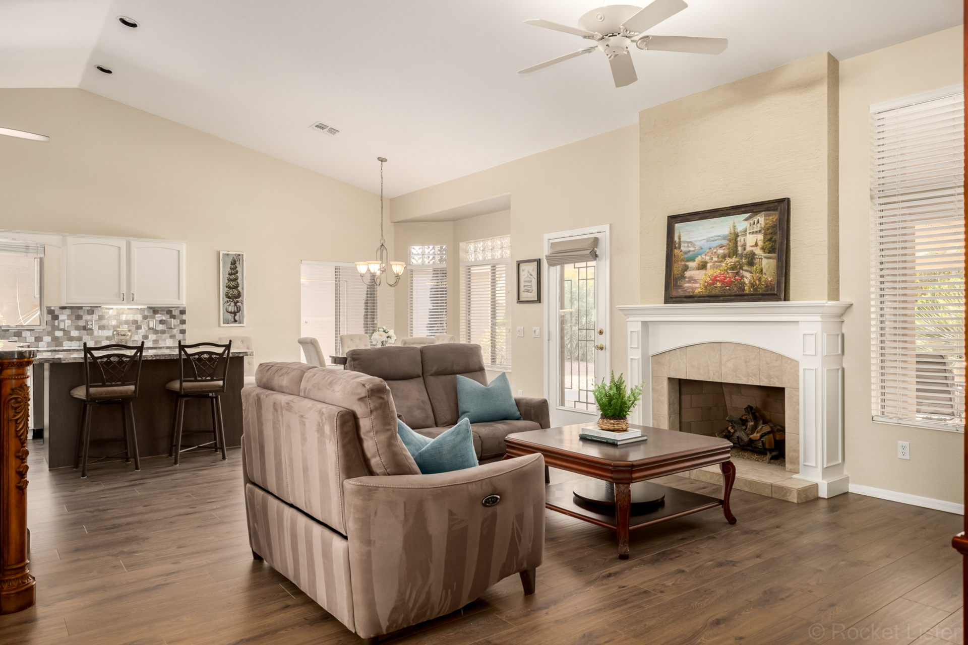 Turn-key! This popular Augusta floorplan is tucked away in a quiet section of the Tuscany Falls side of the award-winning golf course resort community of PebbleCreek. Designed for comfortable, open-concept living, the home features vaulted ceilings throughout the great room, kitchen, den, and both bedrooms, creating a light and spacious feel. Luxury vinyl plank flooring adds a fresh, modern touch while offering durability and easy maintenance. The inviting great room is anchored by a cozy gas fireplace, adding warmth and ambiance to the main living space. The kitchen is beautifully appointed with GE stainless steel appliances, granite countertops, a stylish tile backsplash, and a newly updated center island with abundant storage. The dining area easily accommodates a full-size table... making it ideal for both everyday living and entertaining. This well-designed layout offers two generously sized bedrooms and two full bathrooms, both featuring granite counters for a cohesive, upscale look.