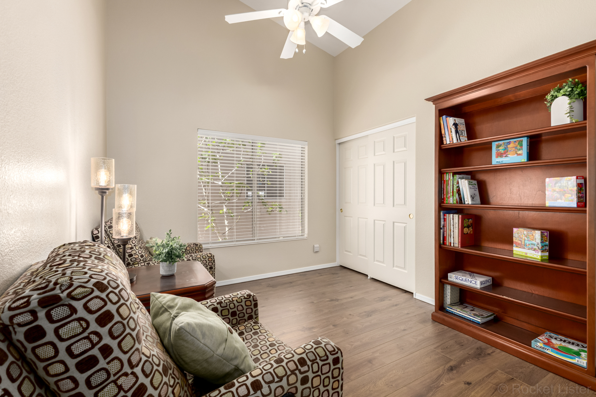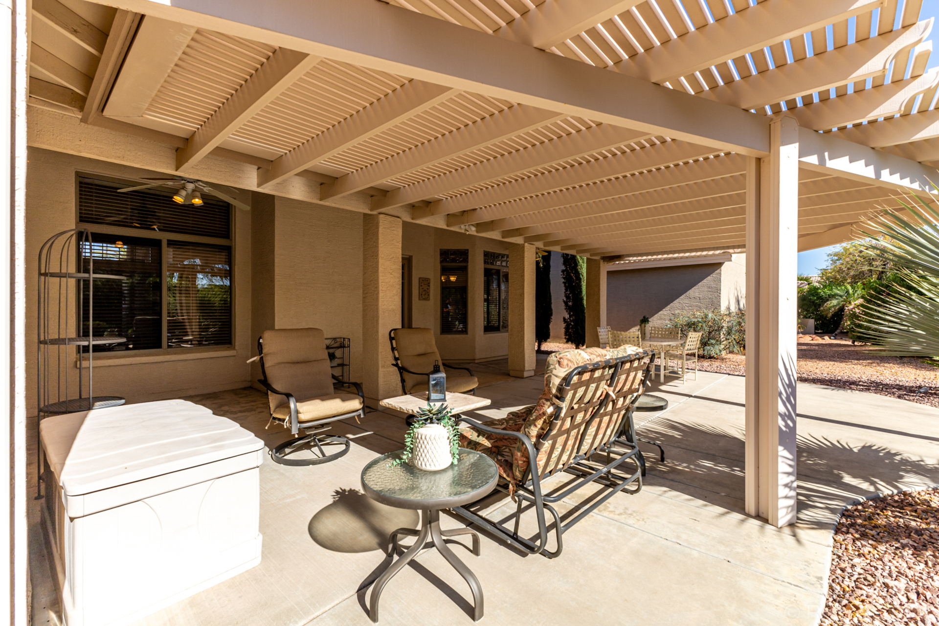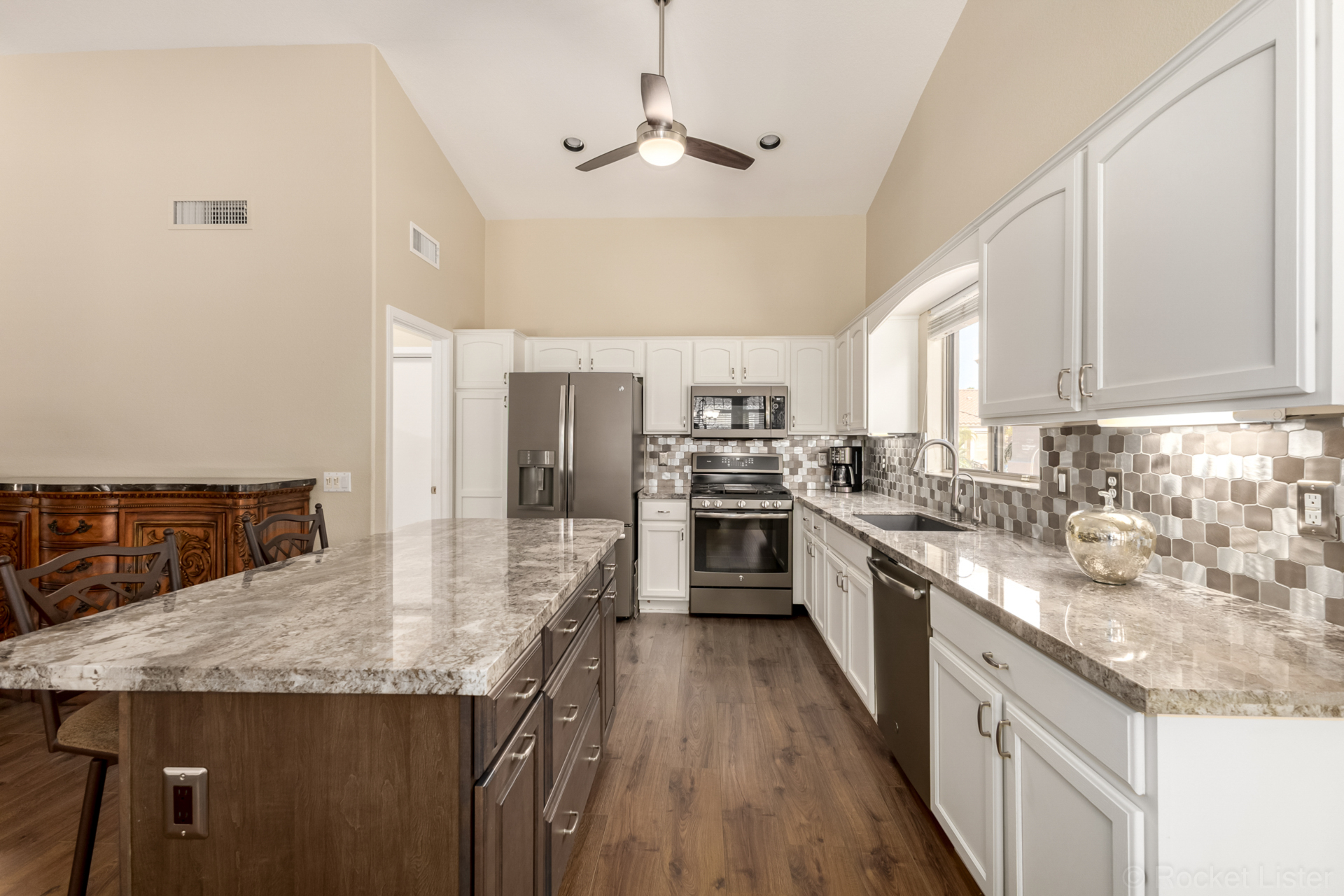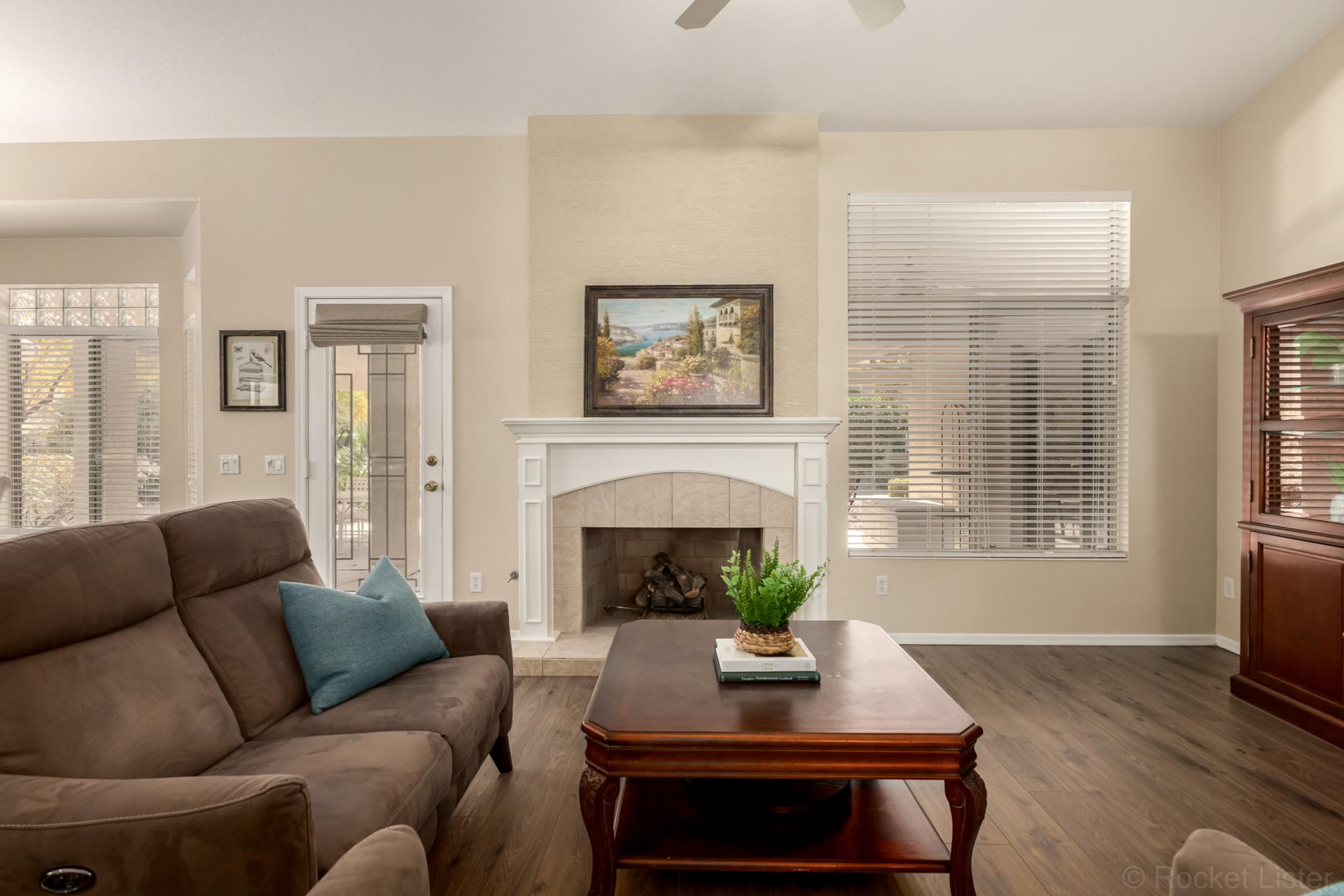 Turn-key! This popular Augusta floorplan is tucked away in a quiet section of the Tuscany Falls side of the award-winning golf course resort community of PebbleCreek. Designed for comfortable, open-concept living, the home features vaulted ceilings throughout the great room, kitchen, den, and both bedrooms, creating a light and spacious feel. Luxury vinyl plank flooring adds a fresh, modern touch while offering durability and easy maintenance. The inviting great room is anchored by a cozy gas fireplace, adding warmth and ambiance to the main living space. The kitchen is beautifully appointed with GE stainless steel appliances, granite countertops, a stylish tile backsplash, and a newly updated center island with abundant storage. The dining area easily accommodates a full-size table... making it ideal for both everyday living and entertaining. This well-designed layout offers two generously sized bedrooms and two full bathrooms, both featuring granite counters for a cohesive, upscale look.