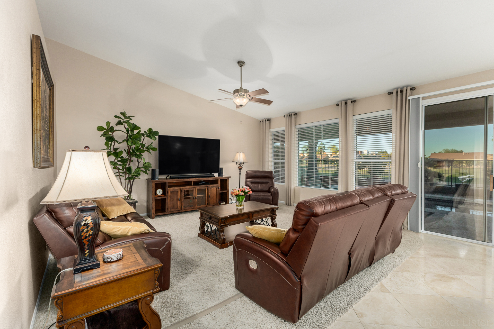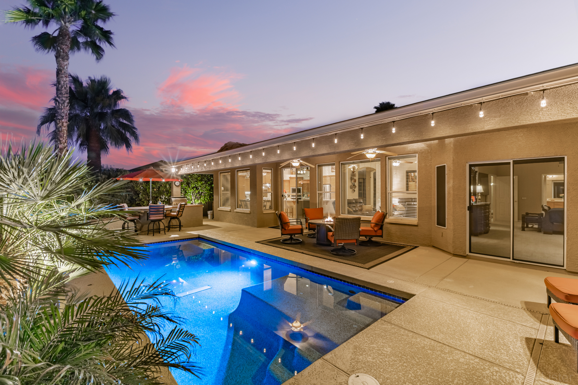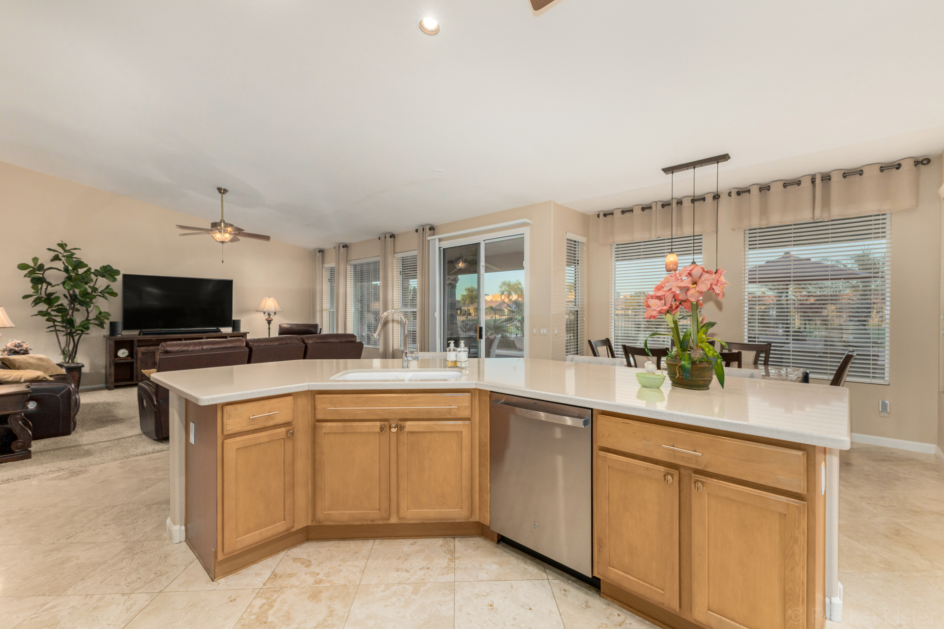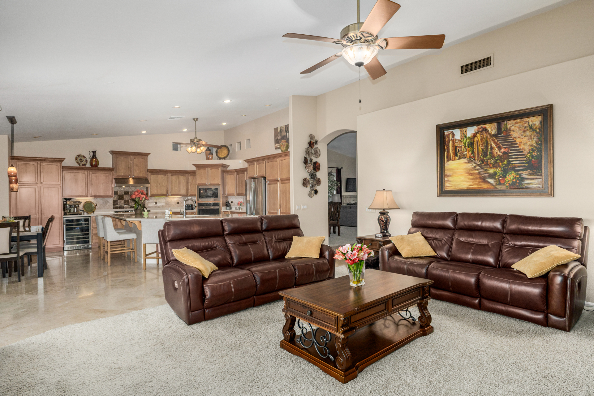 Highly upgraded and exceptionally spacious Marbella model tucked away in a quiet location on the Tuscany Falls side of the award-winning active adult golf resort community of PebbleCreek is now on the market! Showcasing panoramic golf course views and a heated saltwater pool, this home offers the perfect blend of luxury and comfort. The thoughtfully designed floorplan features 2 generous bedrooms, 2 full baths, a powder room, and a versatile den with pocket doors for added privacy. Beautiful travertine flooring on the diagonal and plush carpet in all the right places enhance the home, along with professional window treatments and designer lighting and ceiling fans throughout. Vaulted ceilings elevate the open-concept kitchen and family room, where a full wall of windows and glass doors frame unobstructed views of the golf course and backyard oasis.