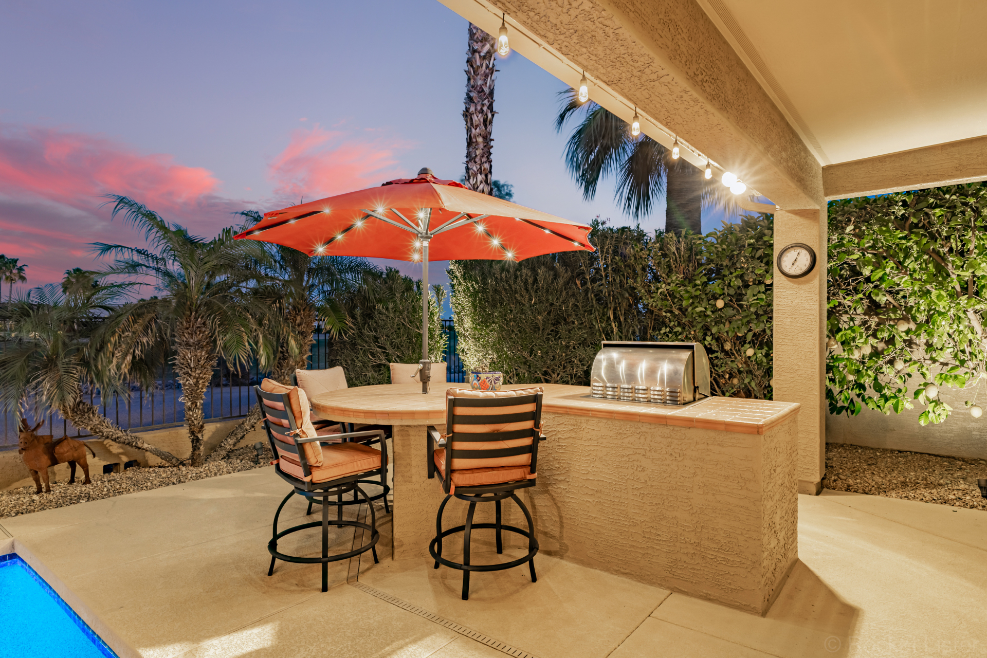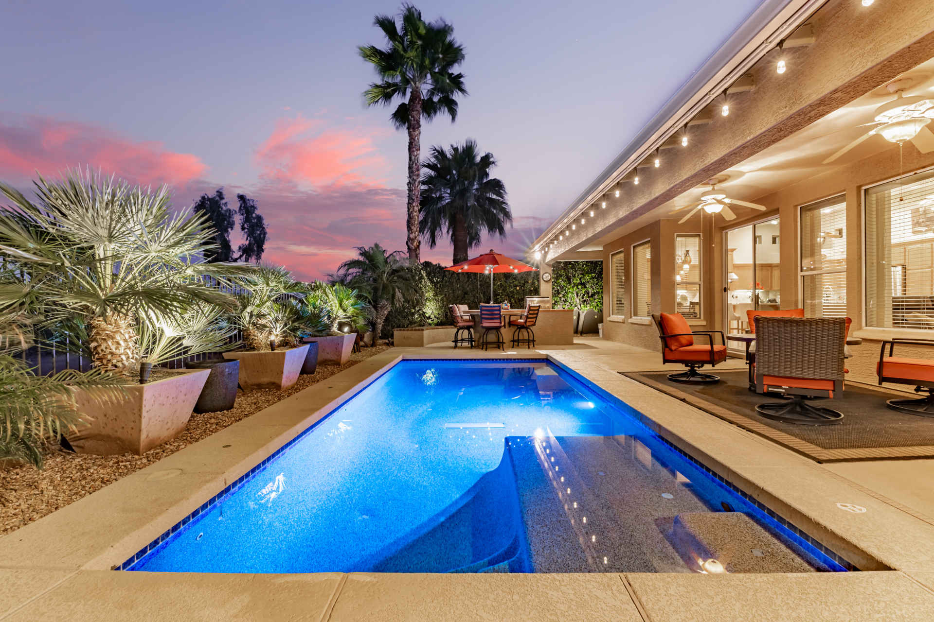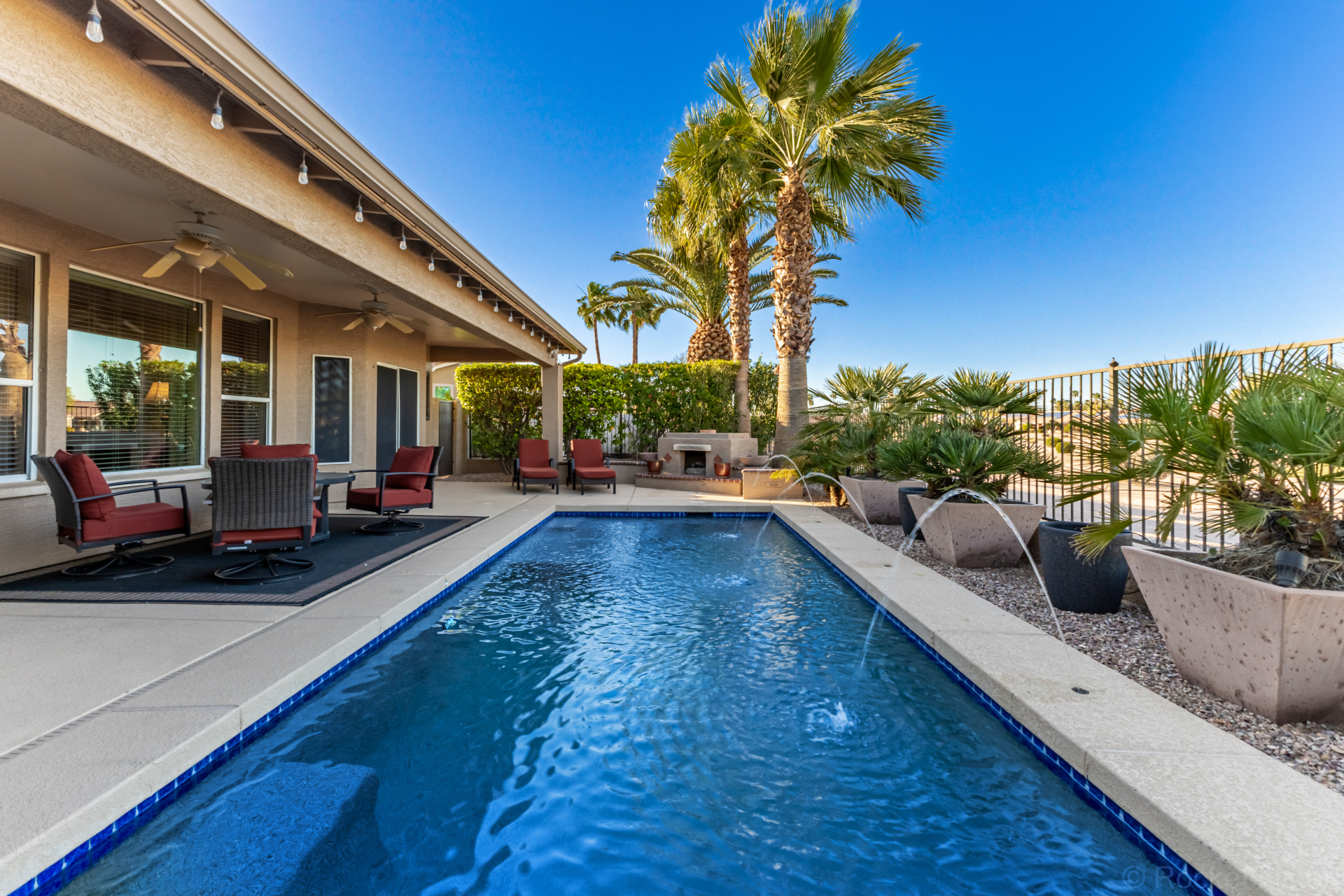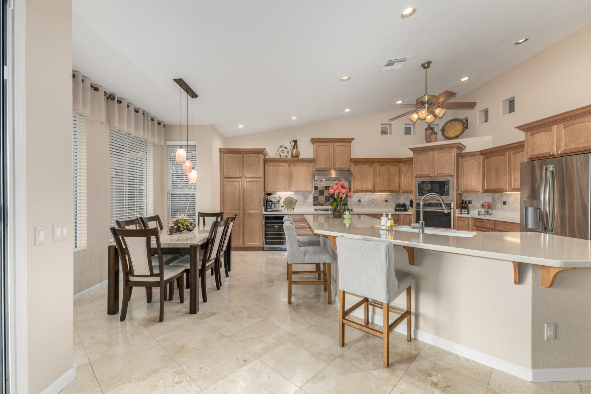 Highly upgraded and exceptionally spacious Marbella model tucked away in a quiet location on the Tuscany Falls side of the award-winning active adult golf resort community of PebbleCreek is now on the market! Showcasing panoramic golf course views and a heated saltwater pool, this home offers the perfect blend of luxury and comfort. The thoughtfully designed floorplan features 2 generous bedrooms, 2 full baths, a powder room, and a versatile den with pocket doors for added privacy. Beautiful travertine flooring on the diagonal and plush carpet in all the right places enhance the home, along with professional window treatments and designer lighting and ceiling fans throughout. Vaulted ceilings elevate the open-concept kitchen and family room, where a full wall of windows and glass doors frame unobstructed views of the golf course and backyard oasis.