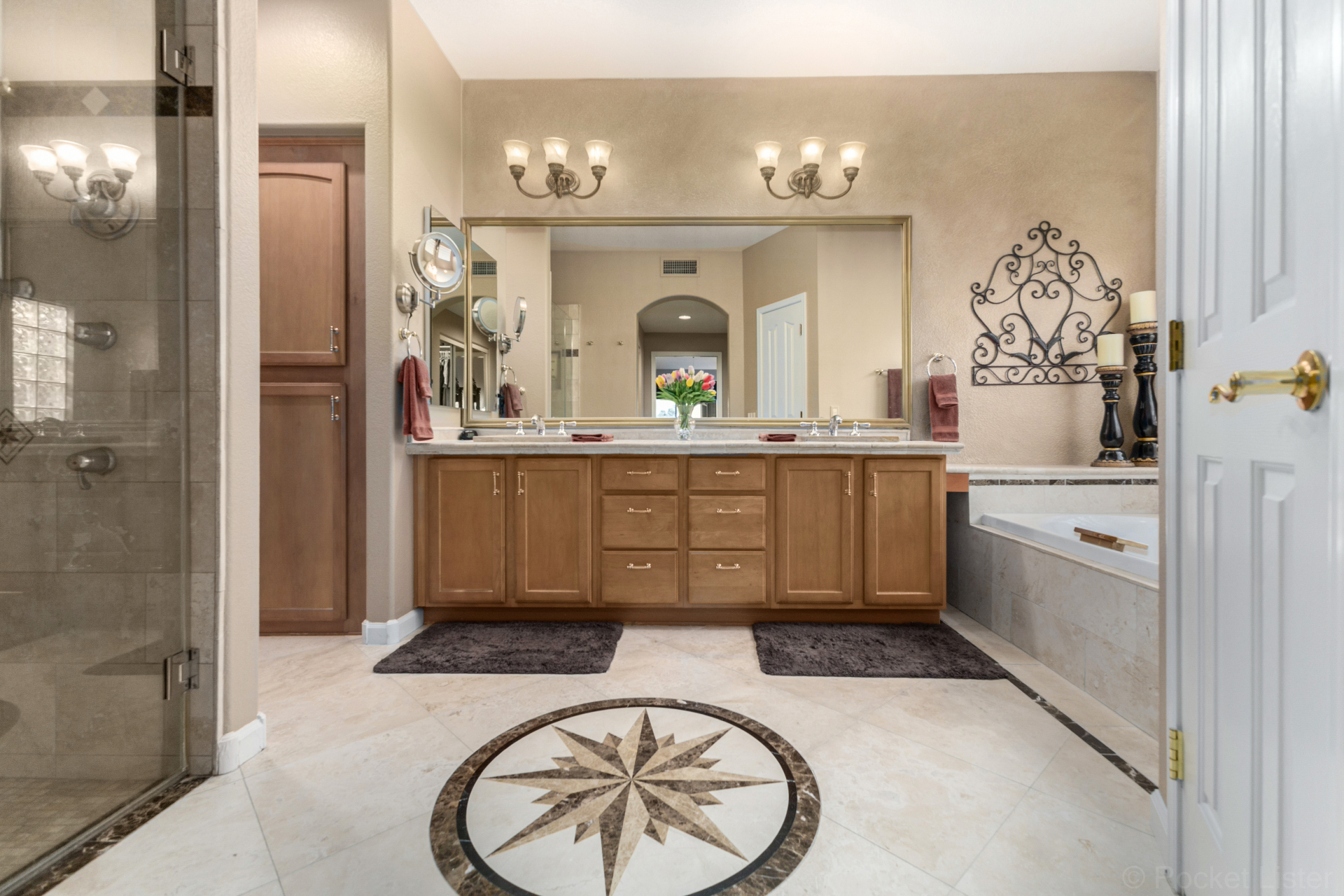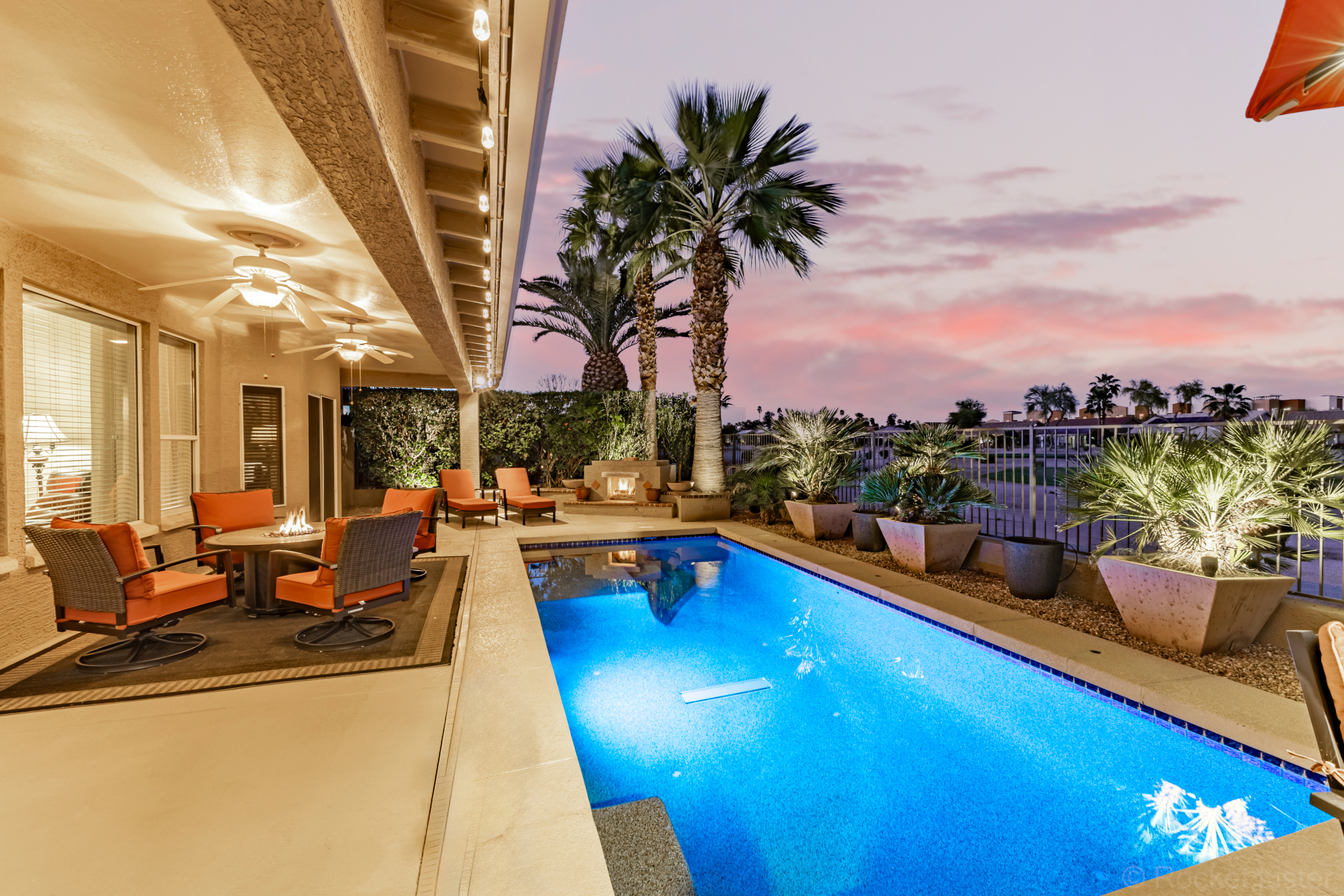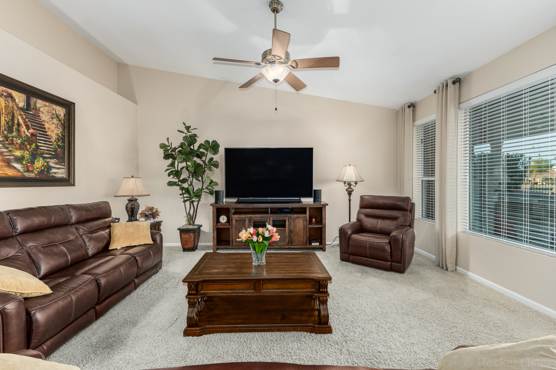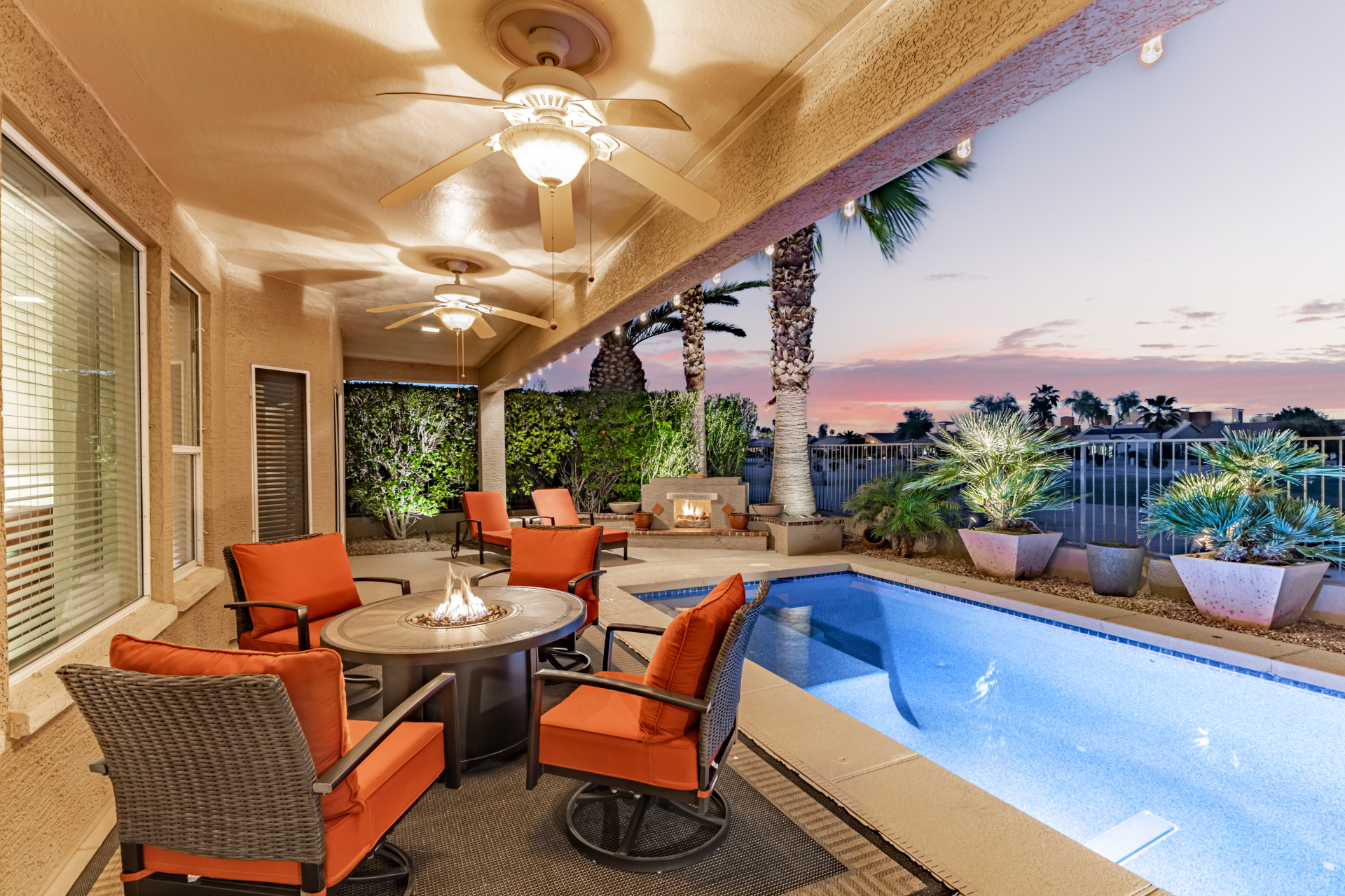 Highly upgraded and exceptionally spacious Marbella model tucked away in a quiet location on the Tuscany Falls side of the award-winning active adult golf resort community of PebbleCreek is now on the market! Showcasing panoramic golf course views and a heated saltwater pool, this home offers the perfect blend of luxury and comfort. The thoughtfully designed floorplan features 2 generous bedrooms, 2 full baths, a powder room, and a versatile den with pocket doors for added privacy. Beautiful travertine flooring on the diagonal and plush carpet in all the right places enhance the home, along with professional window treatments and designer lighting and ceiling fans throughout. Vaulted ceilings elevate the open-concept kitchen and family room, where a full wall of windows and glass doors frame unobstructed views of the golf course and backyard oasis.