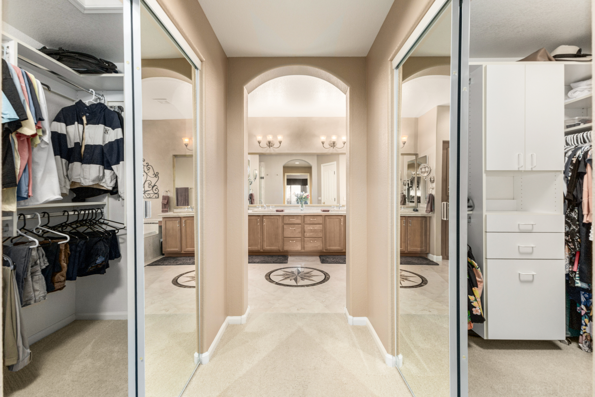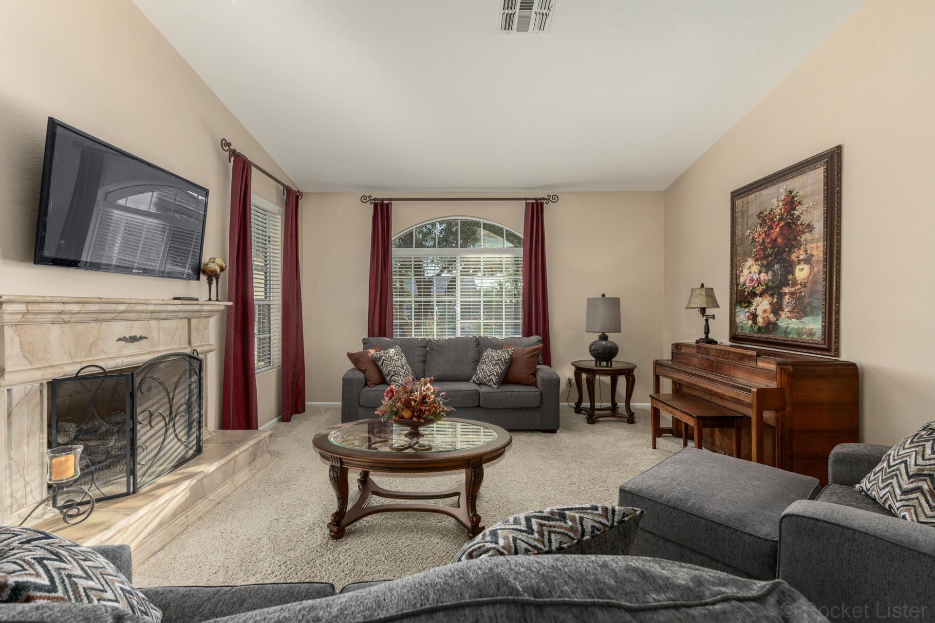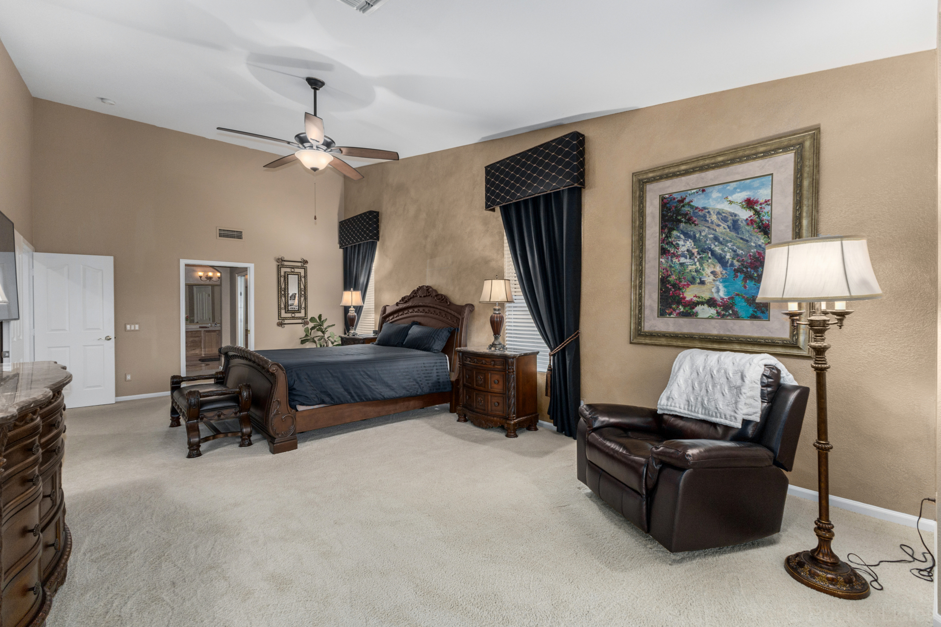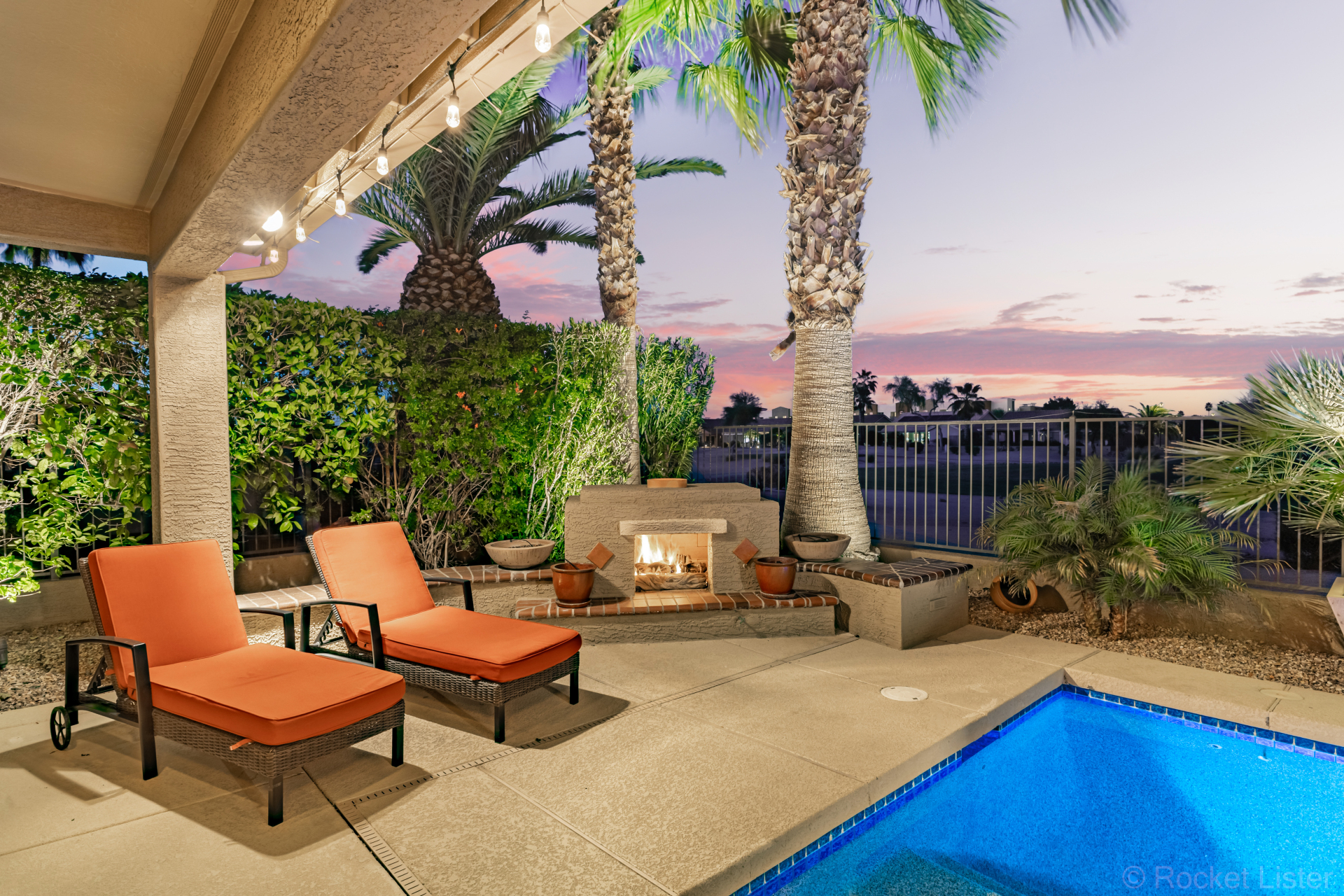 Highly upgraded and exceptionally spacious Marbella model tucked away in a quiet location on the Tuscany Falls side of the award-winning active adult golf resort community of PebbleCreek is now on the market! Showcasing panoramic golf course views and a heated saltwater pool, this home offers the perfect blend of luxury and comfort. The thoughtfully designed floorplan features 2 generous bedrooms, 2 full baths, a powder room, and a versatile den with pocket doors for added privacy. Beautiful travertine flooring on the diagonal and plush carpet in all the right places enhance the home, along with professional window treatments and designer lighting and ceiling fans throughout. Vaulted ceilings elevate the open-concept kitchen and family room, where a full wall of windows and glass doors frame unobstructed views of the golf course and backyard oasis.