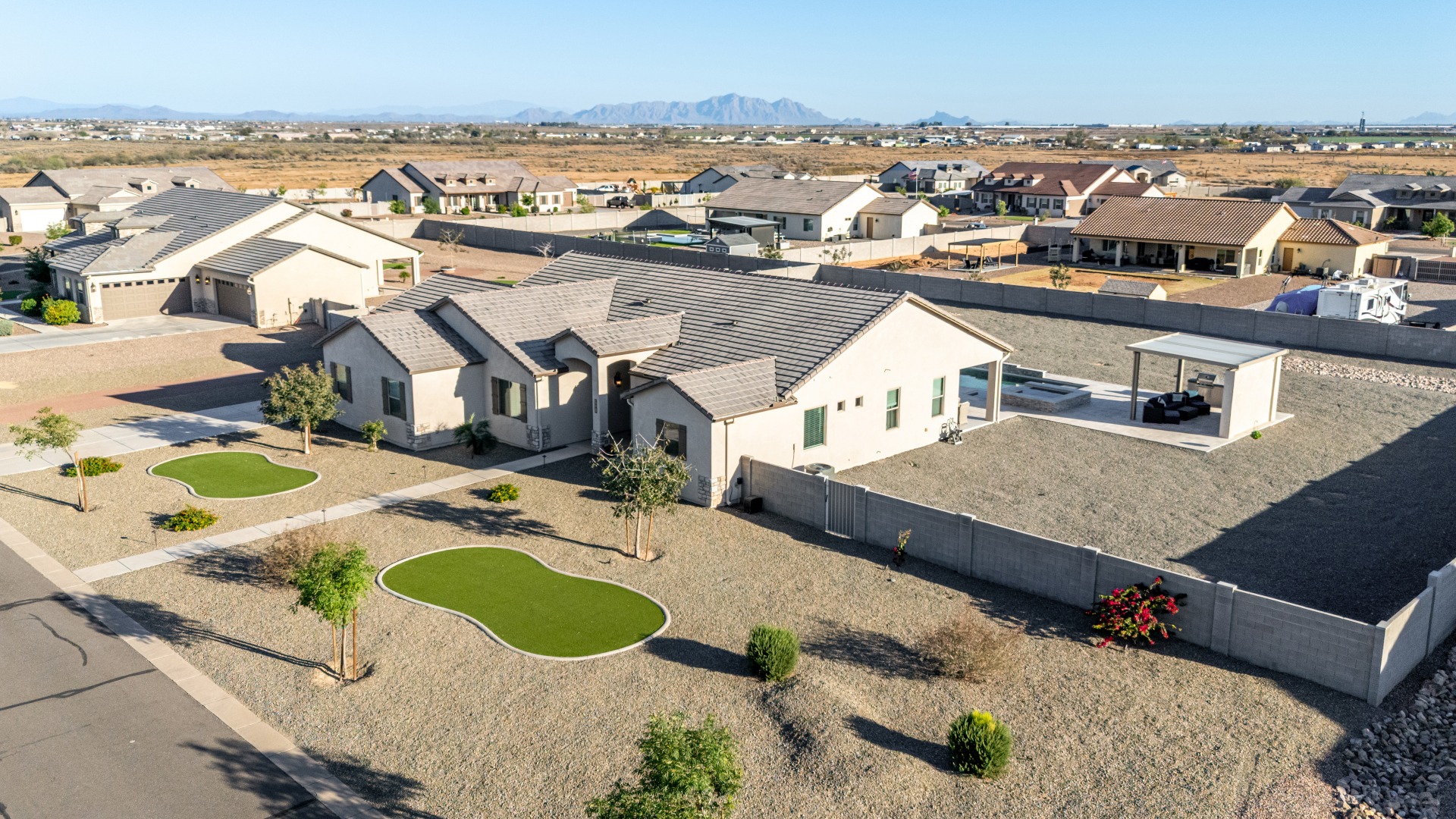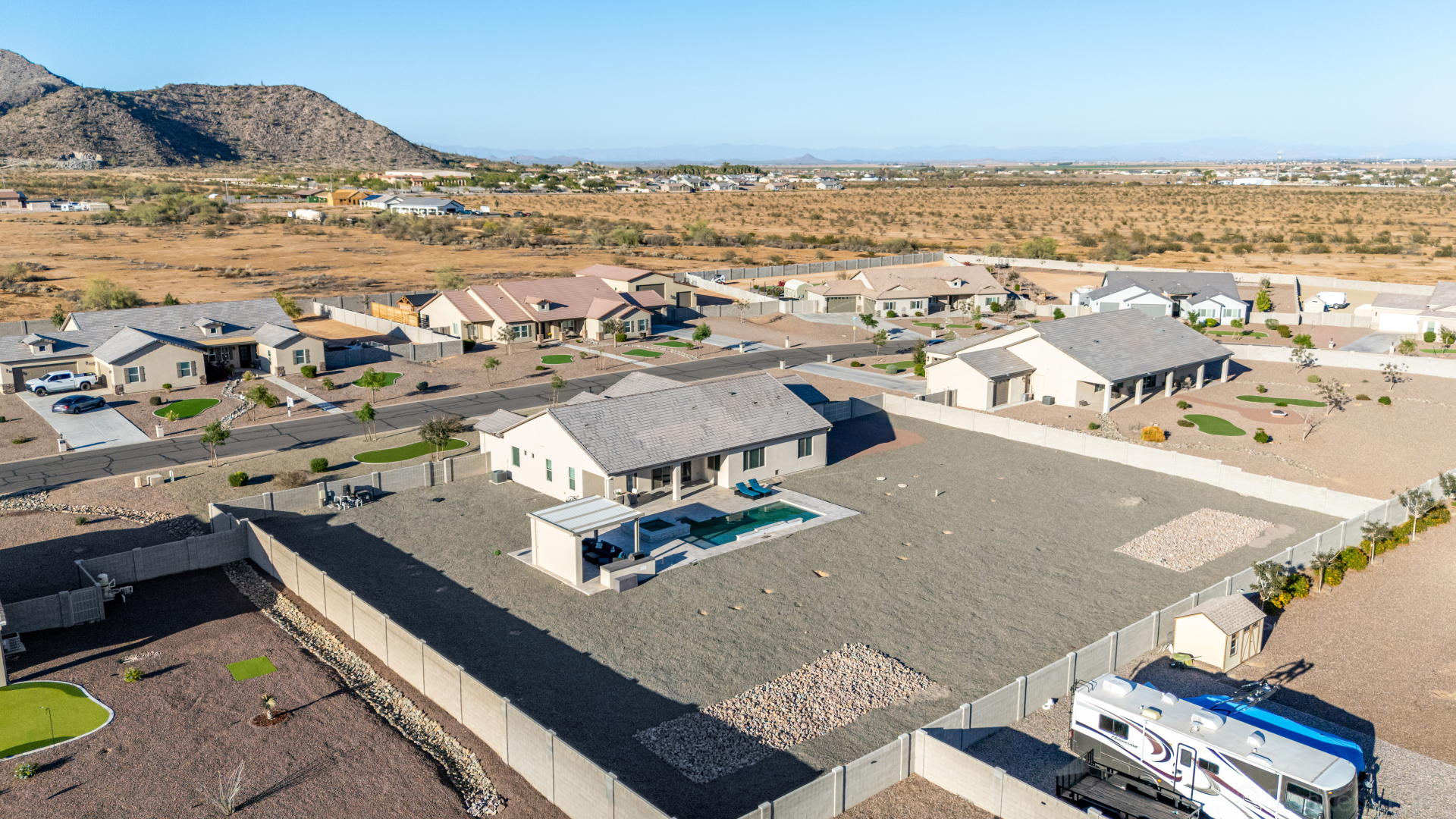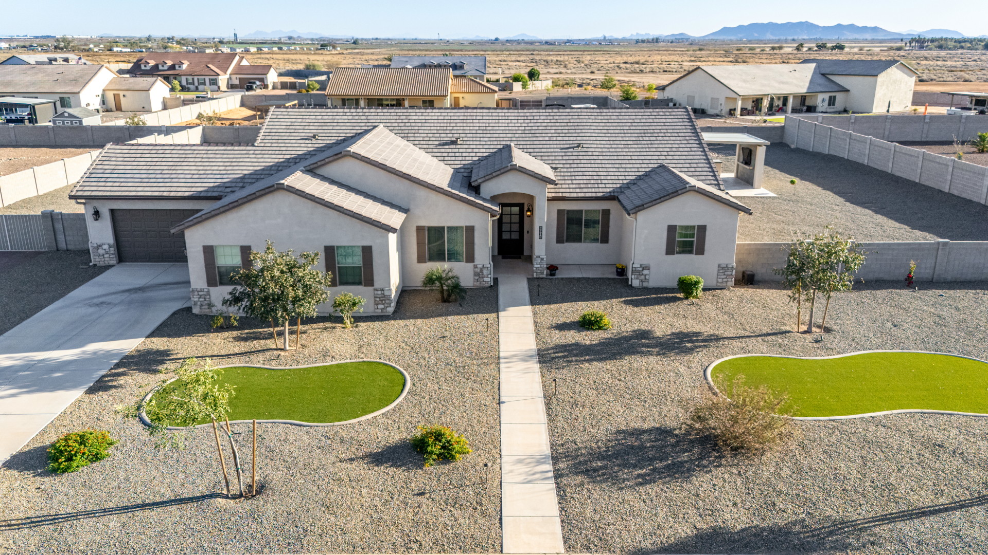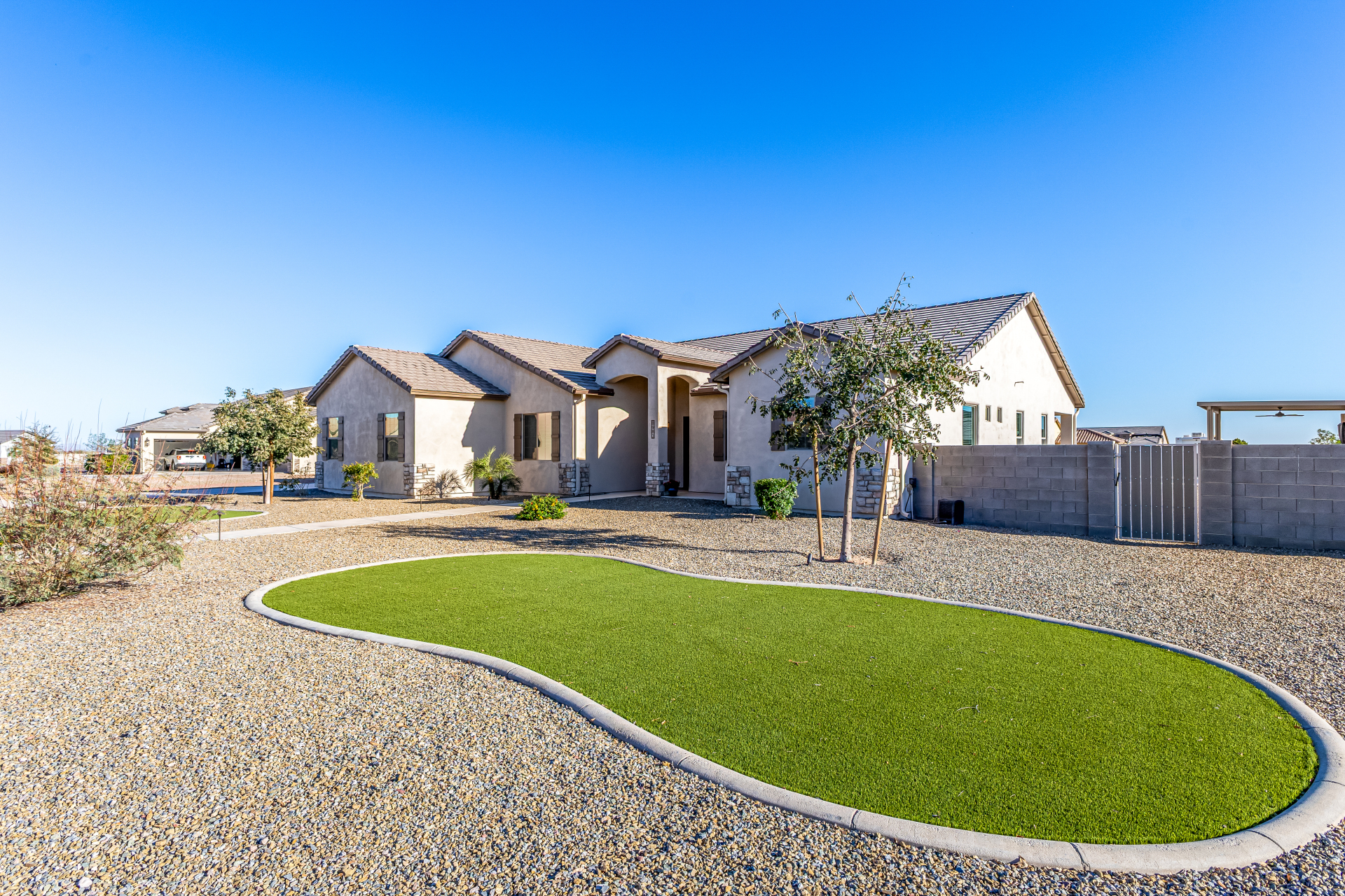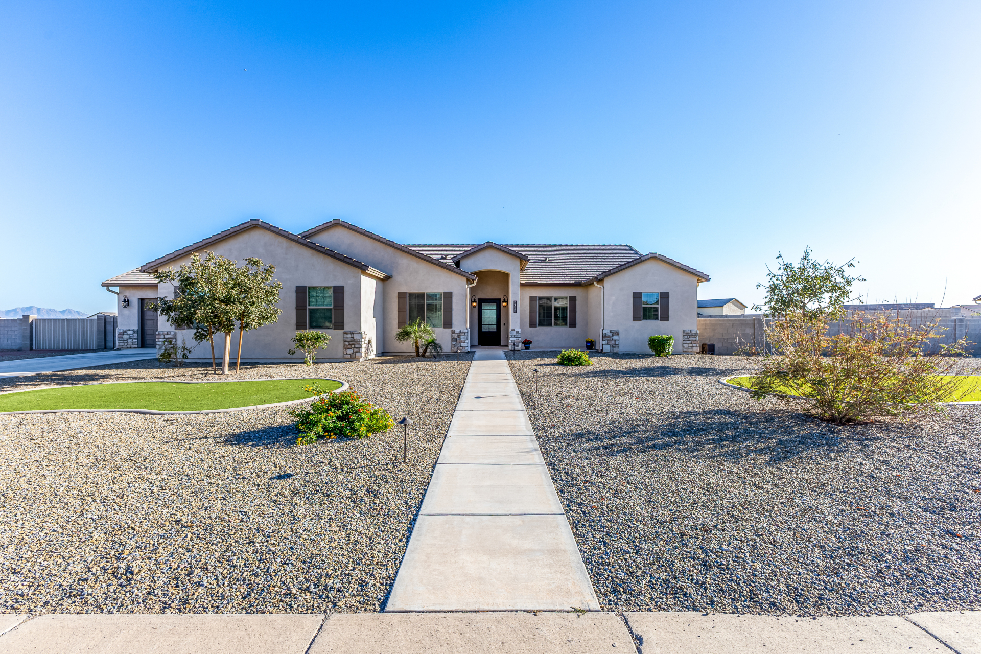 Look no further! This fantastic 4 bed, 3 bath property in Arroyo Verde is the one you've been looking for! Great curb appeal, 4 garage spaces, an RV gate, and a huge front yard w/artificial turf are just the beginning. Come inside to discover a spacious dining & living areas w/vaulted ceilings, wood-look tile flooring, modern light fixtures, and a neutral palette. The luxurious kitchen is comprised of ample cabinetry w/crown moulding, a walk-in pantry, granite counters, tile backsplash, stainless steel appliances, and an island w/a breakfast bar. You'll love the primary bedroom, boasting direct outdoor access, a walk-in closet, and a lavish bath w/dual sinks. Lastly, the expansive backyard includes a covered patio, a lovely gazebo w/a built-in BBQ, and a refreshing pool/spa combo! Act NOW!