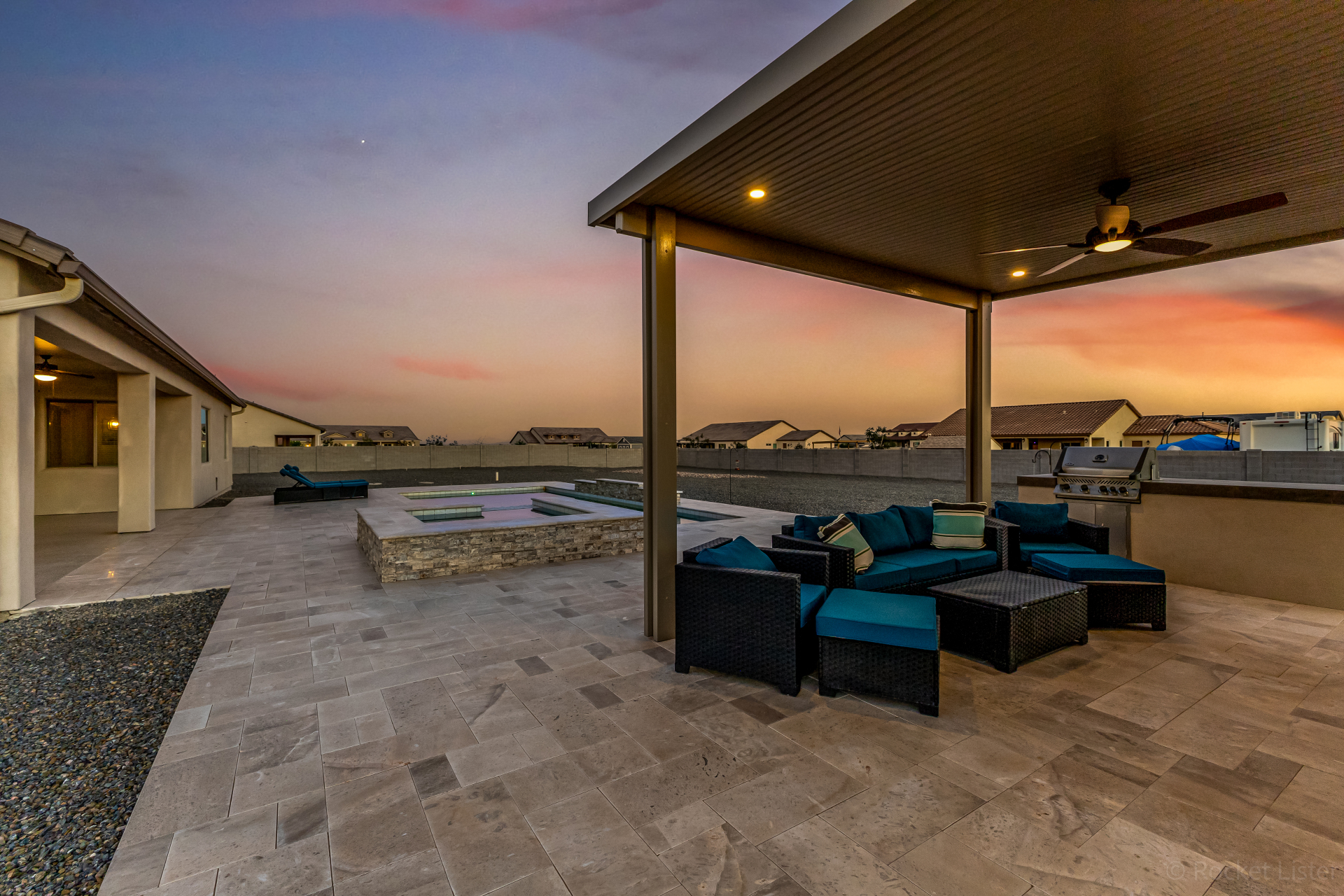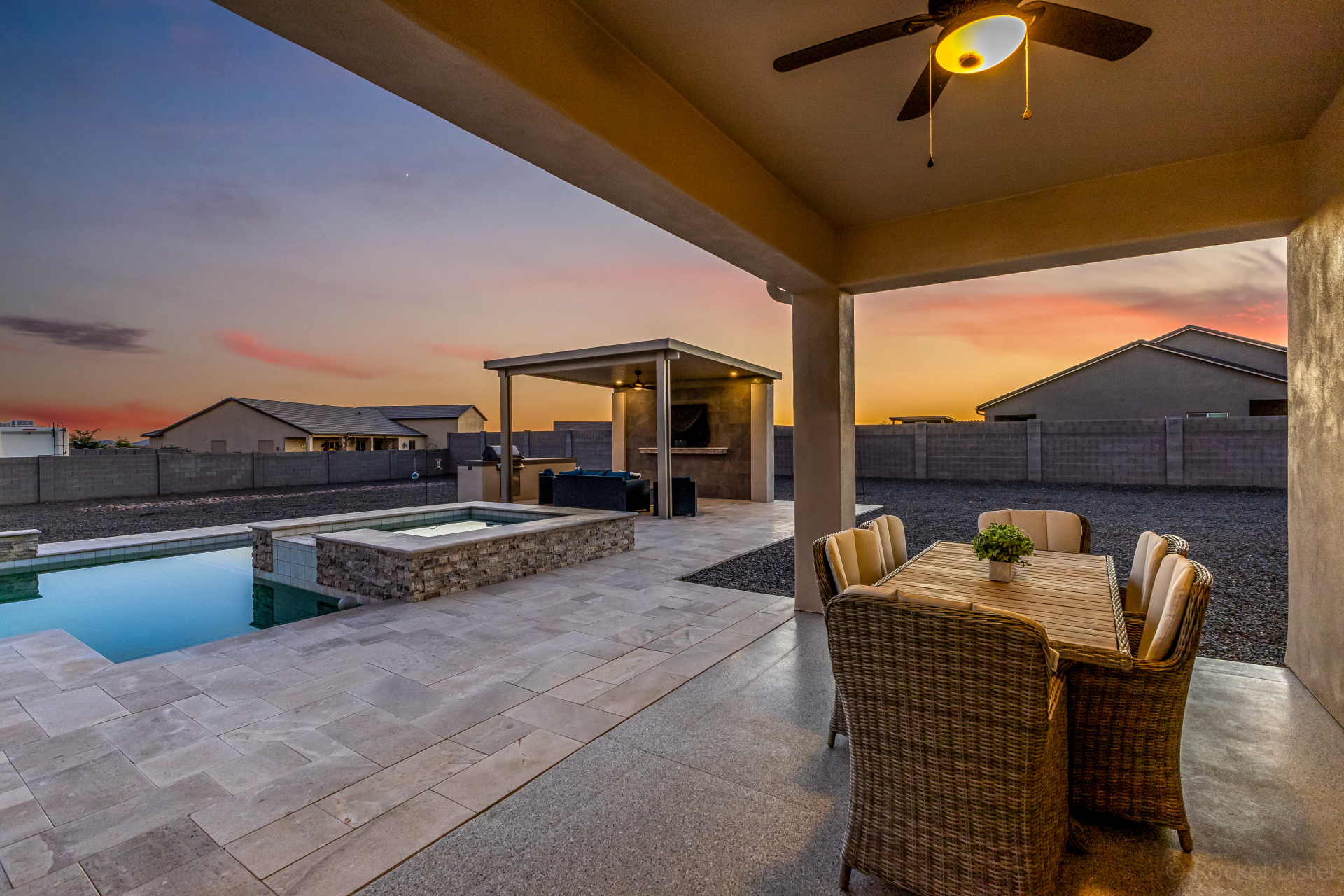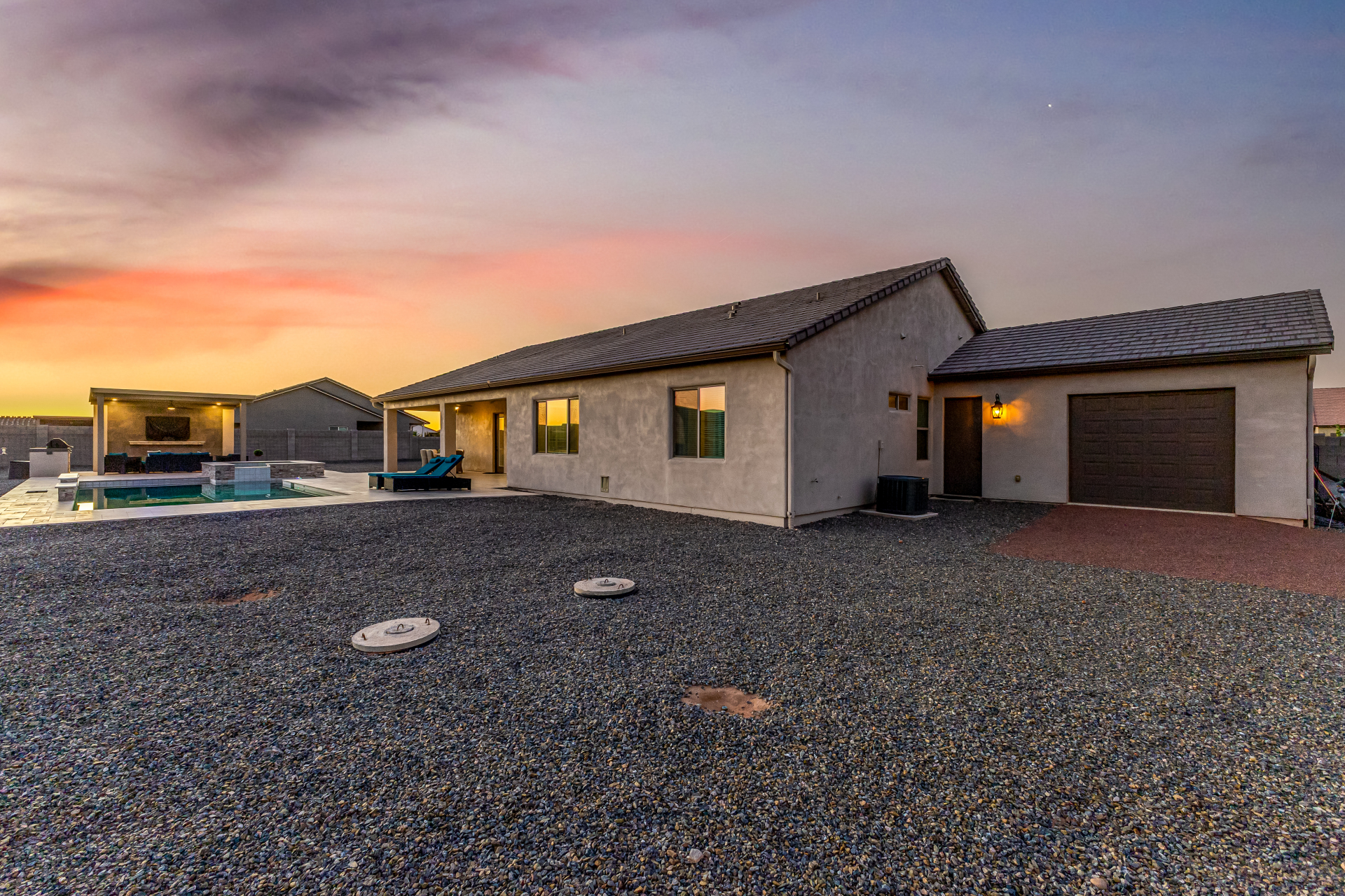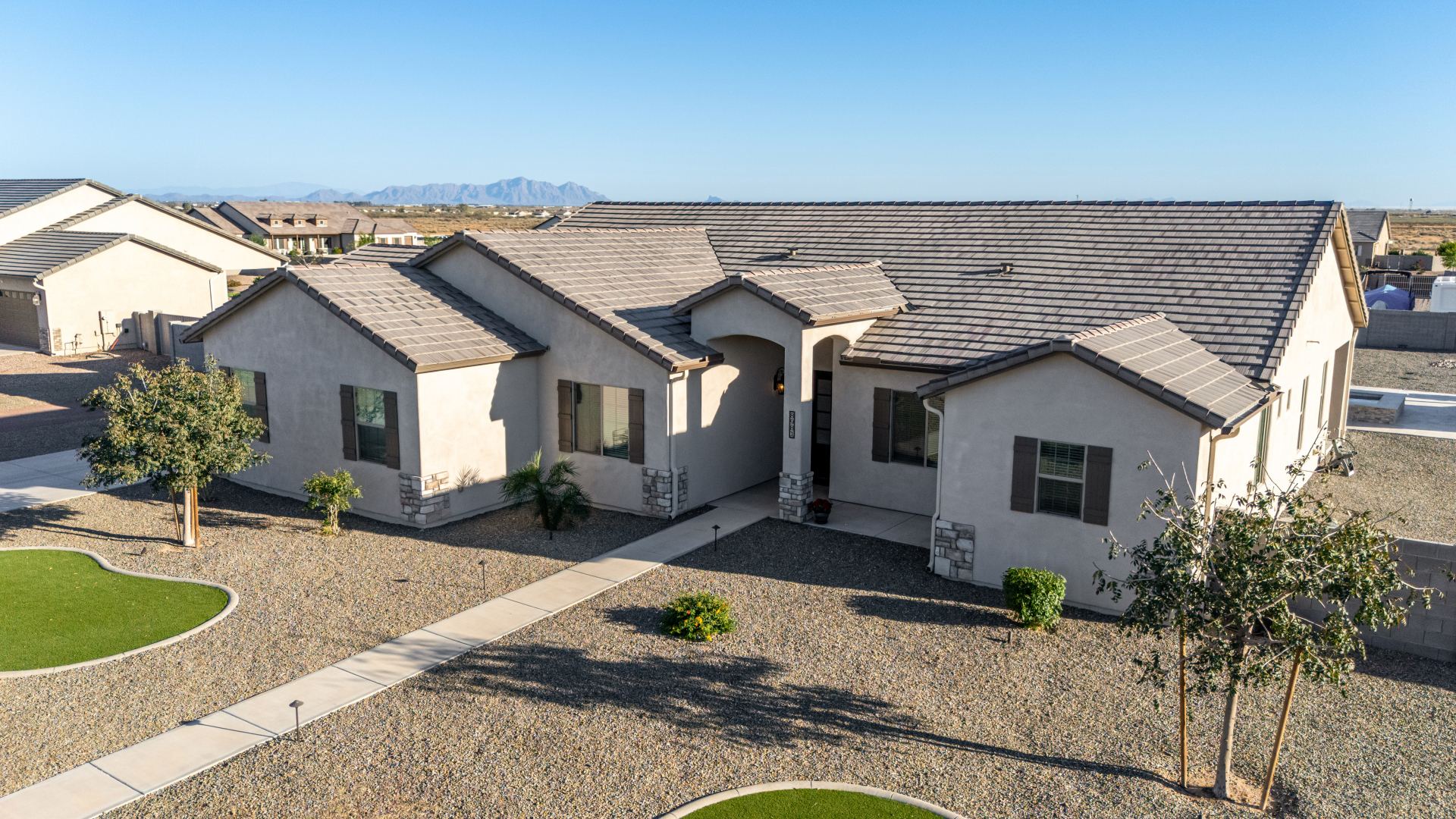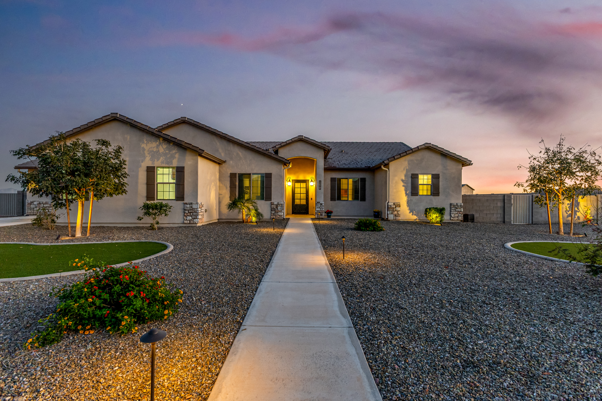 Look no further! This fantastic 4 bed, 3 bath property in Arroyo Verde is the one you've been looking for! Great curb appeal, 4 garage spaces, an RV gate, and a huge front yard w/artificial turf are just the beginning. Come inside to discover a spacious dining & living areas w/vaulted ceilings, wood-look tile flooring, modern light fixtures, and a neutral palette. The luxurious kitchen is comprised of ample cabinetry w/crown moulding, a walk-in pantry, granite counters, tile backsplash, stainless steel appliances, and an island w/a breakfast bar. You'll love the primary bedroom, boasting direct outdoor access, a walk-in closet, and a lavish bath w/dual sinks. Lastly, the expansive backyard includes a covered patio, a lovely gazebo w/a built-in BBQ, and a refreshing pool/spa combo! Act NOW!