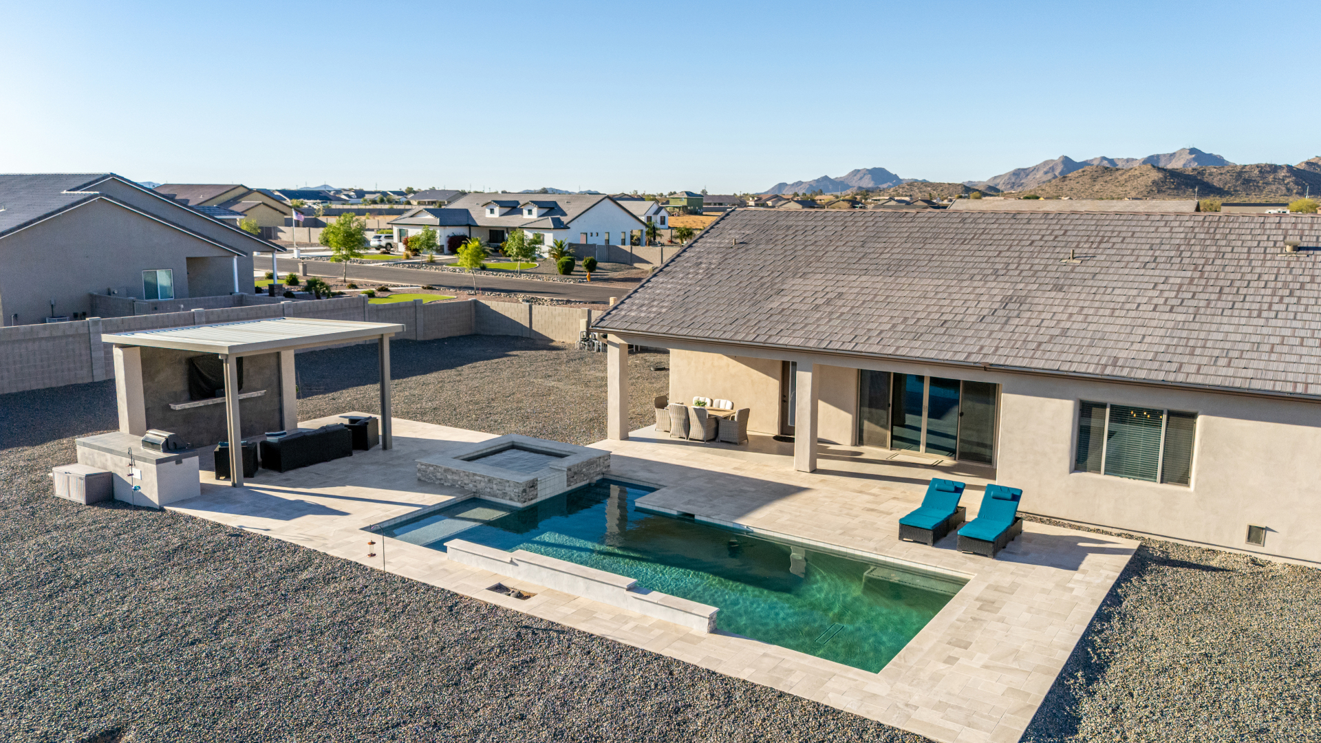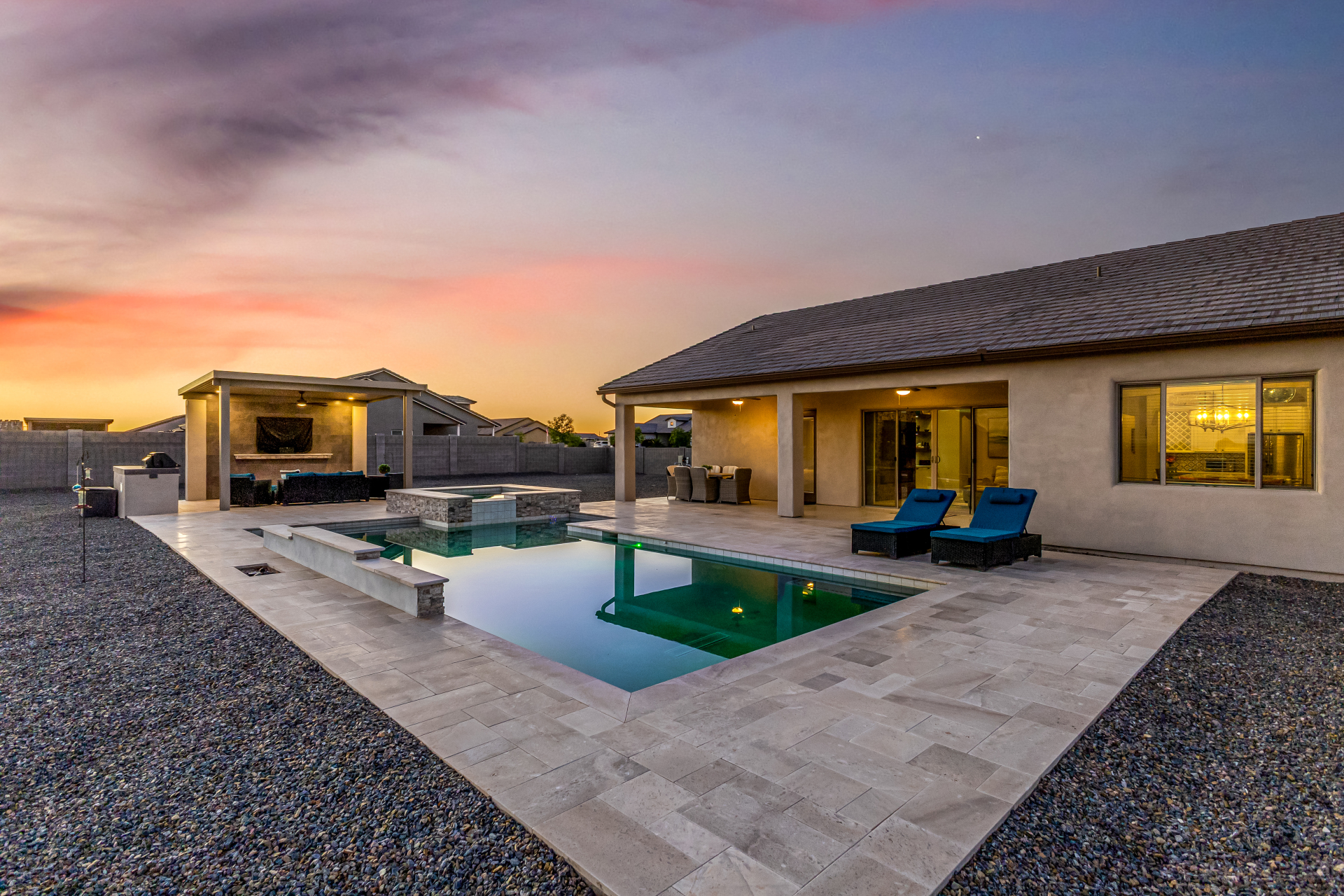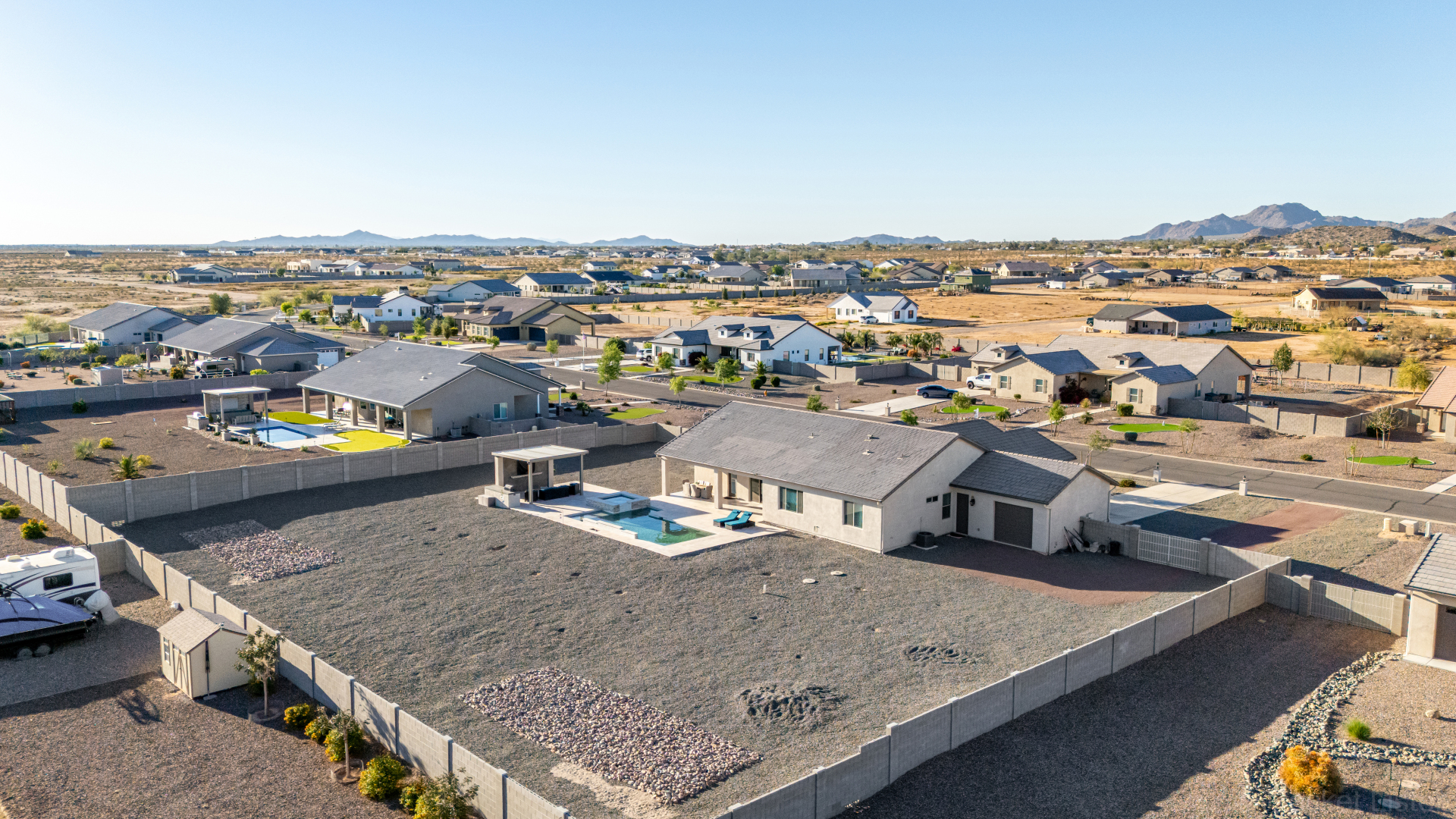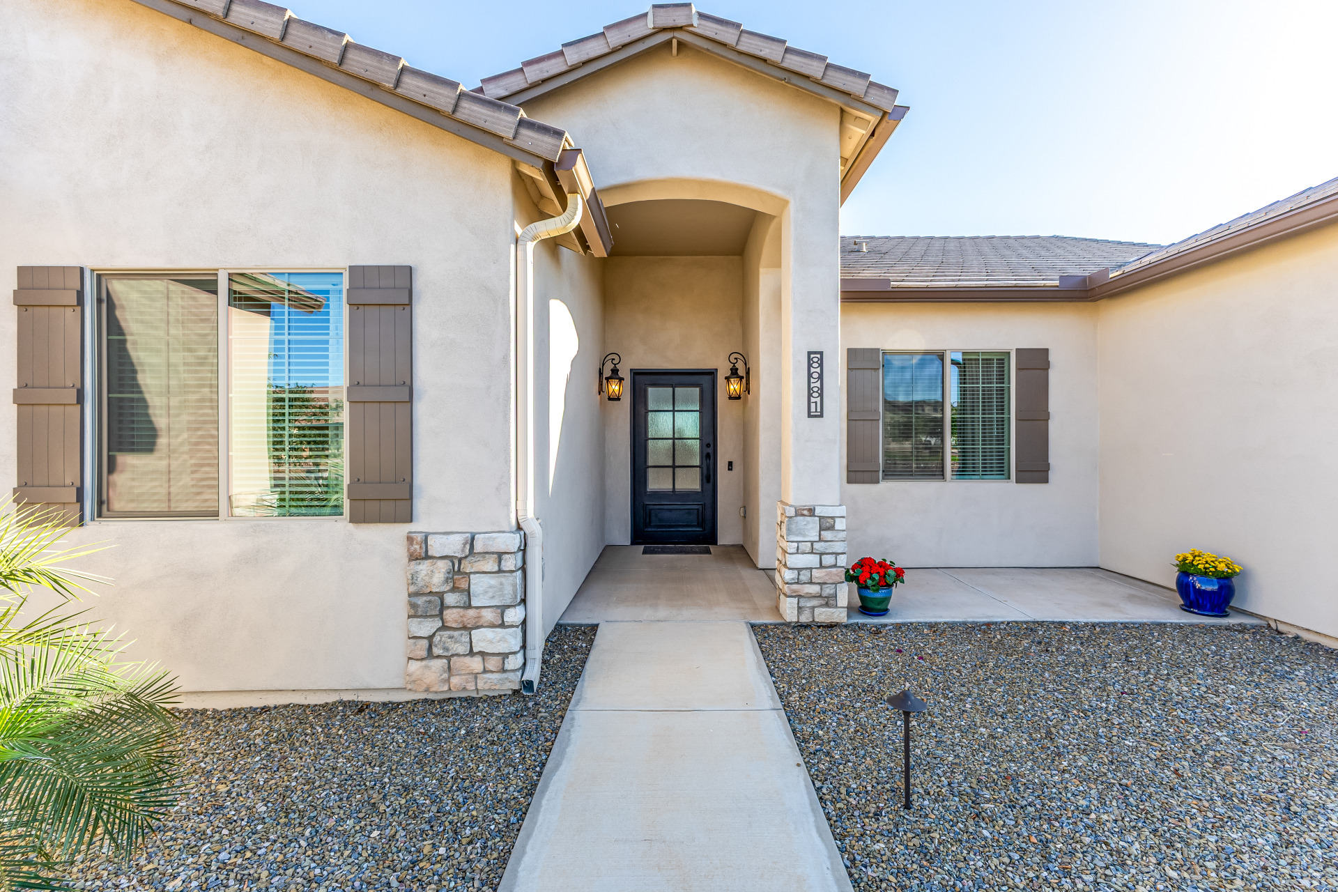 Look no further! This fantastic 4 bed, 3 bath property in Arroyo Verde is the one you've been looking for! Great curb appeal, 4 garage spaces, an RV gate, and a huge front yard w/artificial turf are just the beginning. Come inside to discover a spacious dining & living areas w/vaulted ceilings, wood-look tile flooring, modern light fixtures, and a neutral palette. The luxurious kitchen is comprised of ample cabinetry w/crown moulding, a walk-in pantry, granite counters, tile backsplash, stainless steel appliances, and an island w/a breakfast bar. You'll love the primary bedroom, boasting direct outdoor access, a walk-in closet, and a lavish bath w/dual sinks. Lastly, the expansive backyard includes a covered patio, a lovely gazebo w/a built-in BBQ, and a refreshing pool/spa combo! Act NOW!
