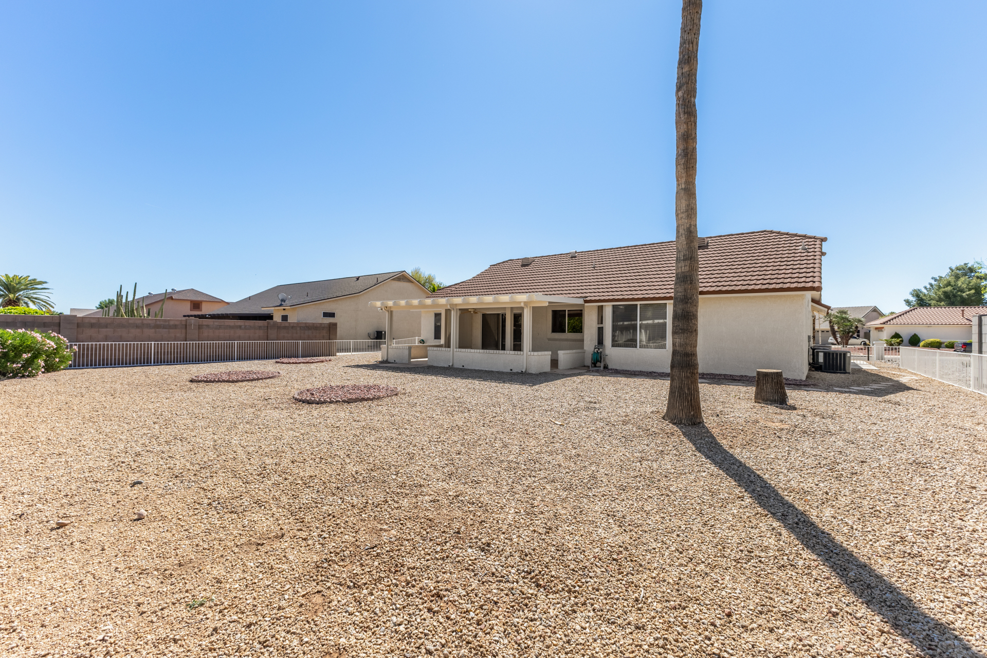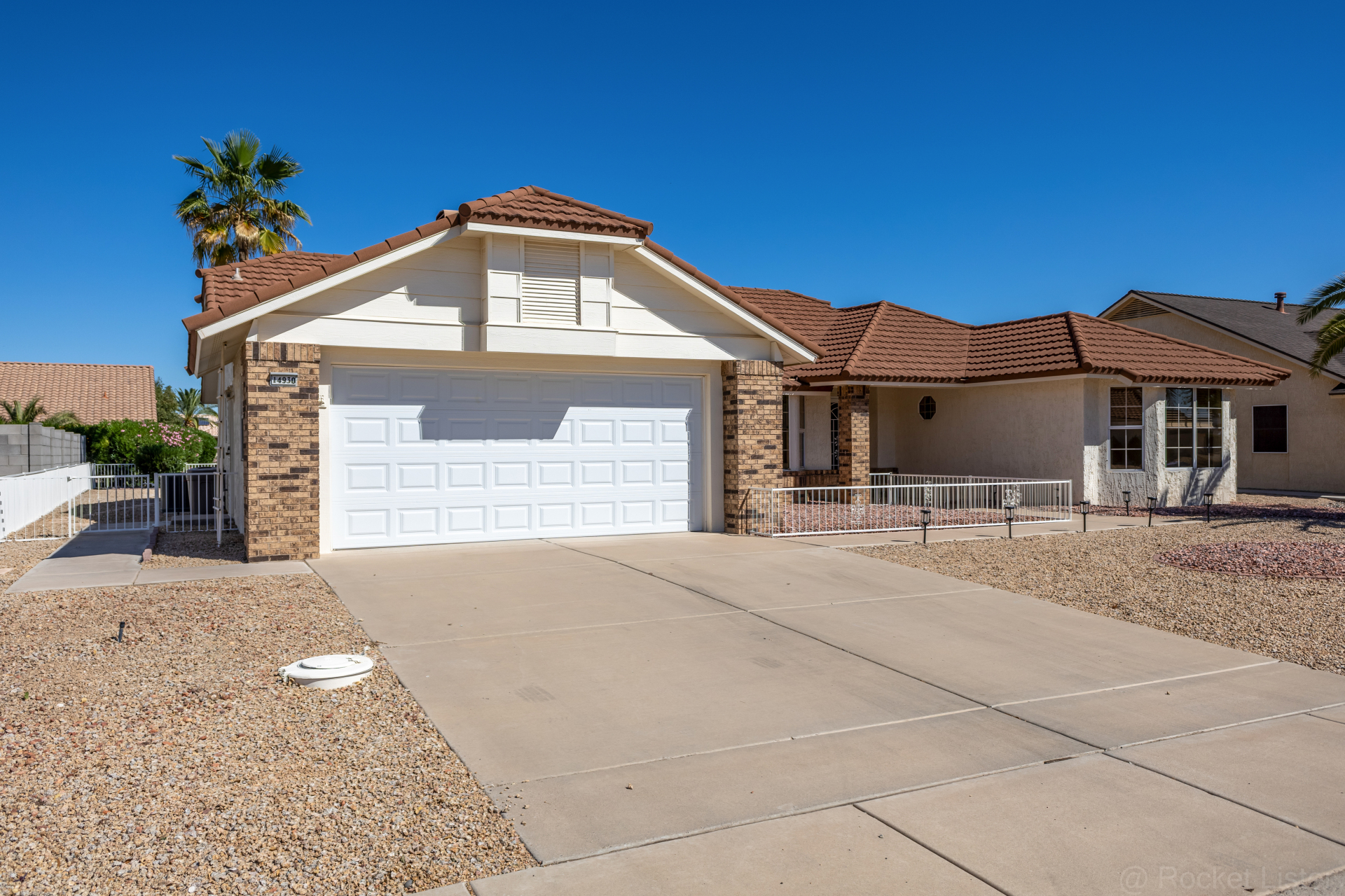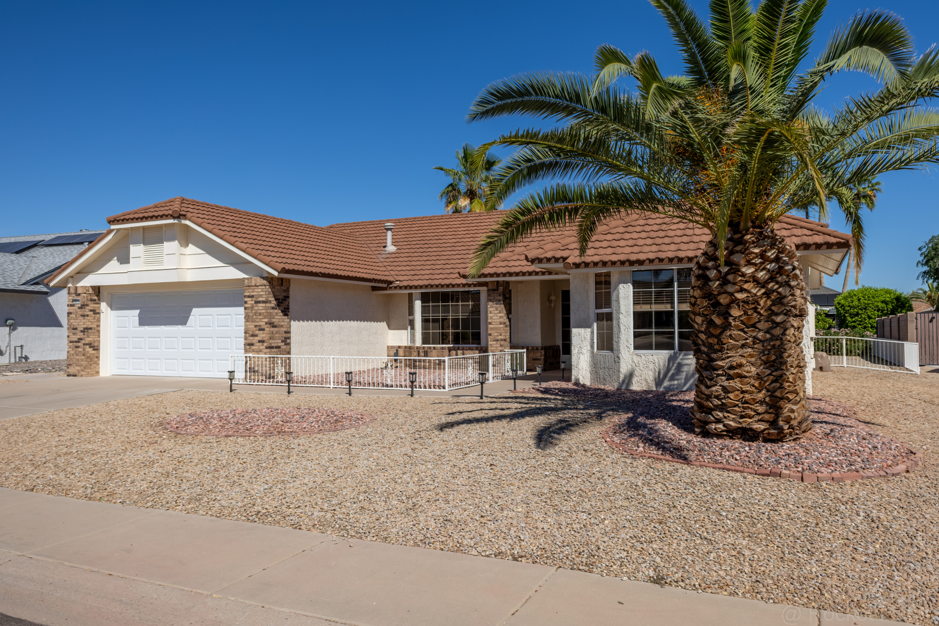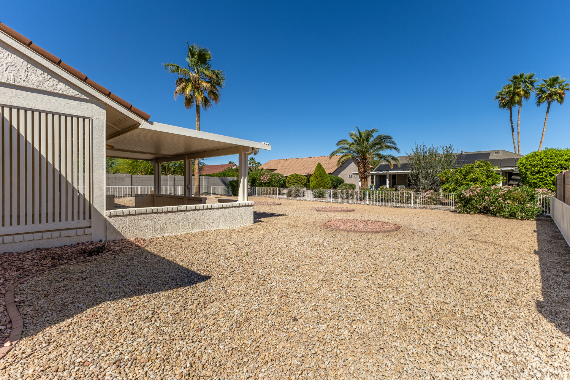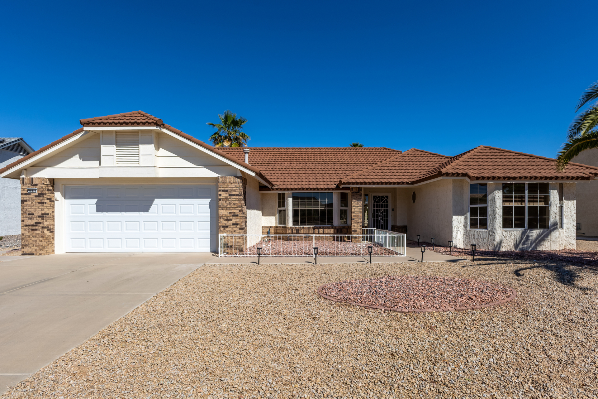 Discover all the charm of this adorable single-story home in the sought-after Sun City West! Inside, you'll find inviting living spaces filled with natural light, displaying soft carpeting, tile in high-traffic areas, vaulted ceilings that make it feel even more spacious, and neutral paint. Whip up feasts and quick bites in the well-appointed kitchen, complete with ample cabinetry, granite countertops, and built-in appliances. Relax in the main retreat, offering a bathroom with dual sinks and a practical walk-in closet. The 2-car garage boasts attached cabinets for added storage and hosts the laundry area for convenience. The backyard includes a covered patio with flagstone flooring, perfect for entertaining, and ample seating space with a serene landscape. Truly a must-see!