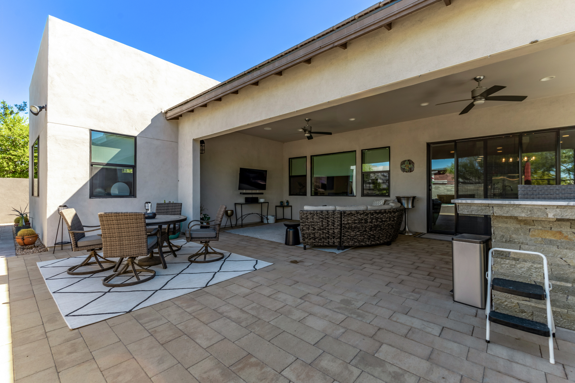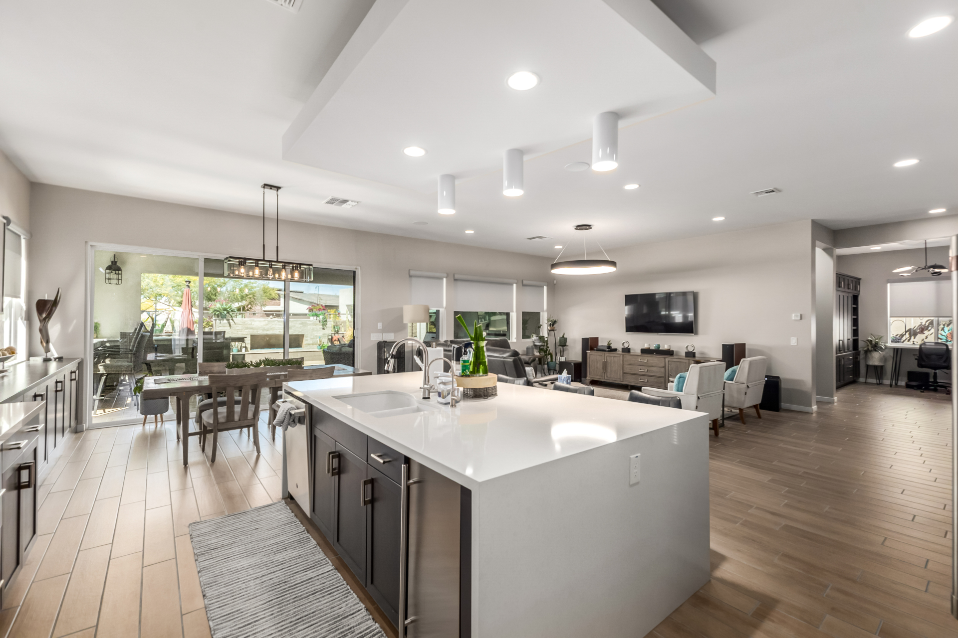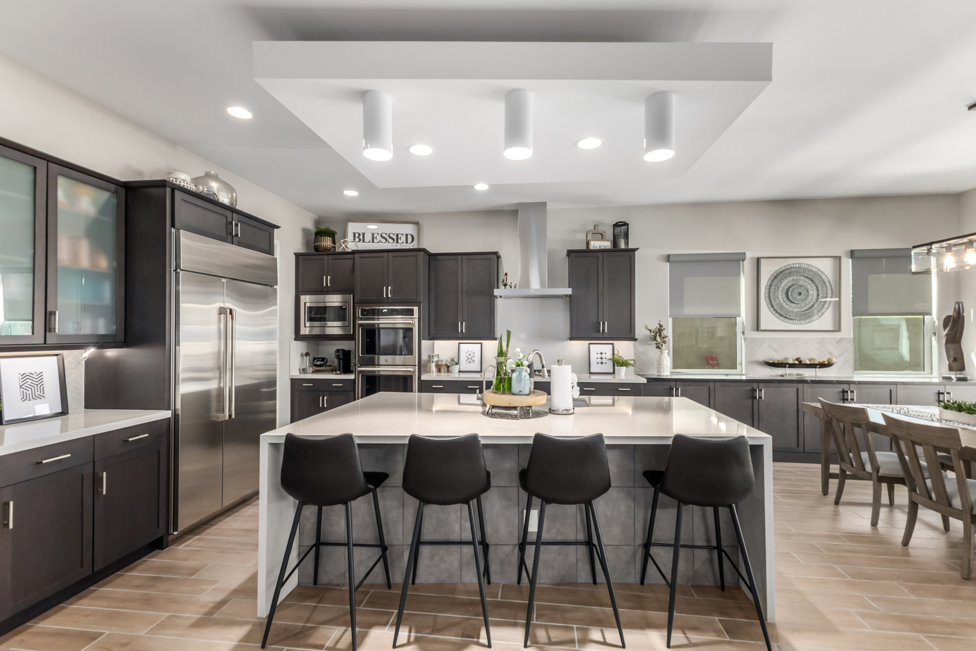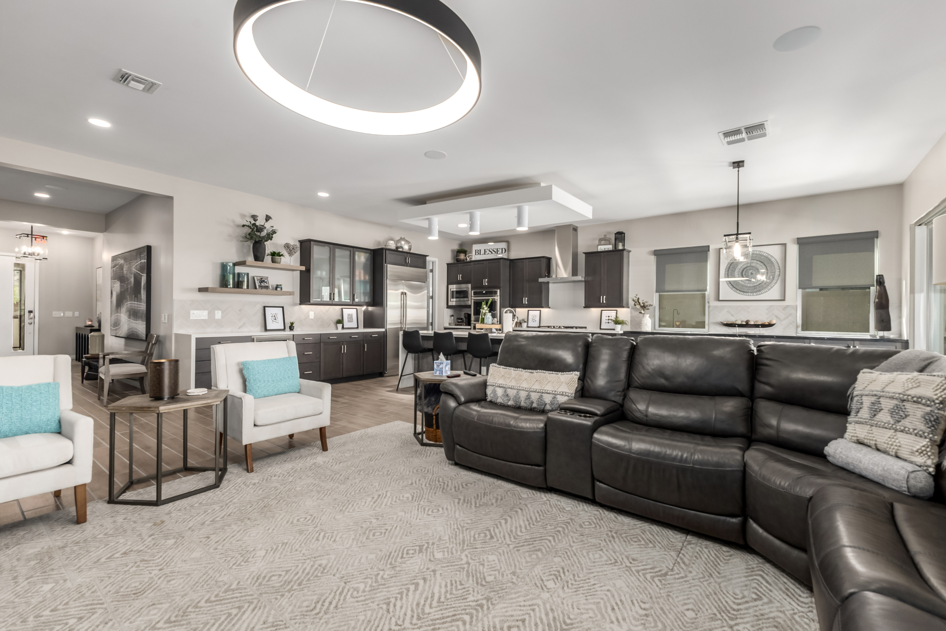 This spacious single-story former model home, designed by Bobby Berk, offers over $165K in upgrades with upscale finishes throughout. The gourmet kitchen features GE Café gas appliances, a 5-burner cooktop, double ovens, built-in ice machine, upgraded pantry, stainless side-by-side refrigerator, and quartz countertops. Enjoy indoor-outdoor living with a 12' multi-slider and wood-look tile throughout. Highlights include dark wood cabinetry, custom office with built-ins, generation suite with kitchenette, window treatments, whole-house sound system, water softener, garage cabinets with epoxy floors, and a landscaped backyard with mist system, fireplace, and built-in BBQ. Near South Mountain, Downtown, and Sky Harbor--don't miss your chance to make this sunning home yours!