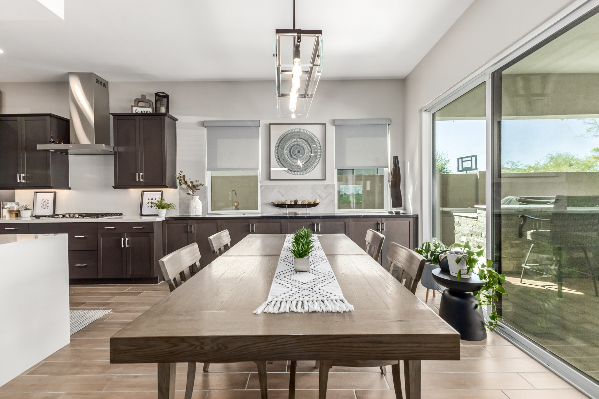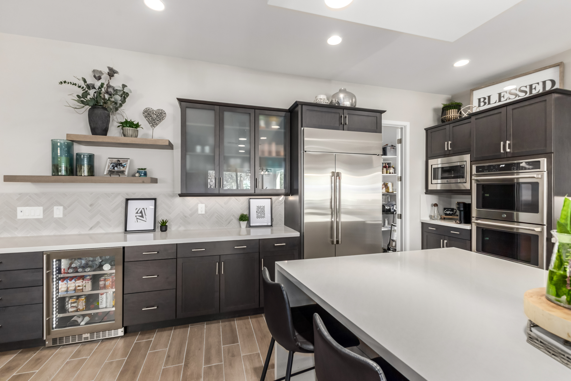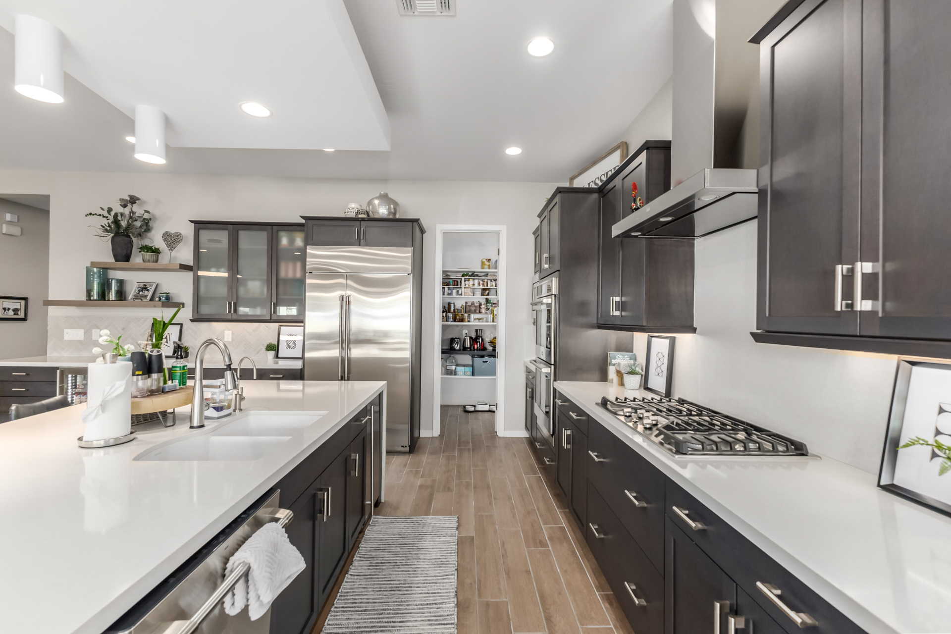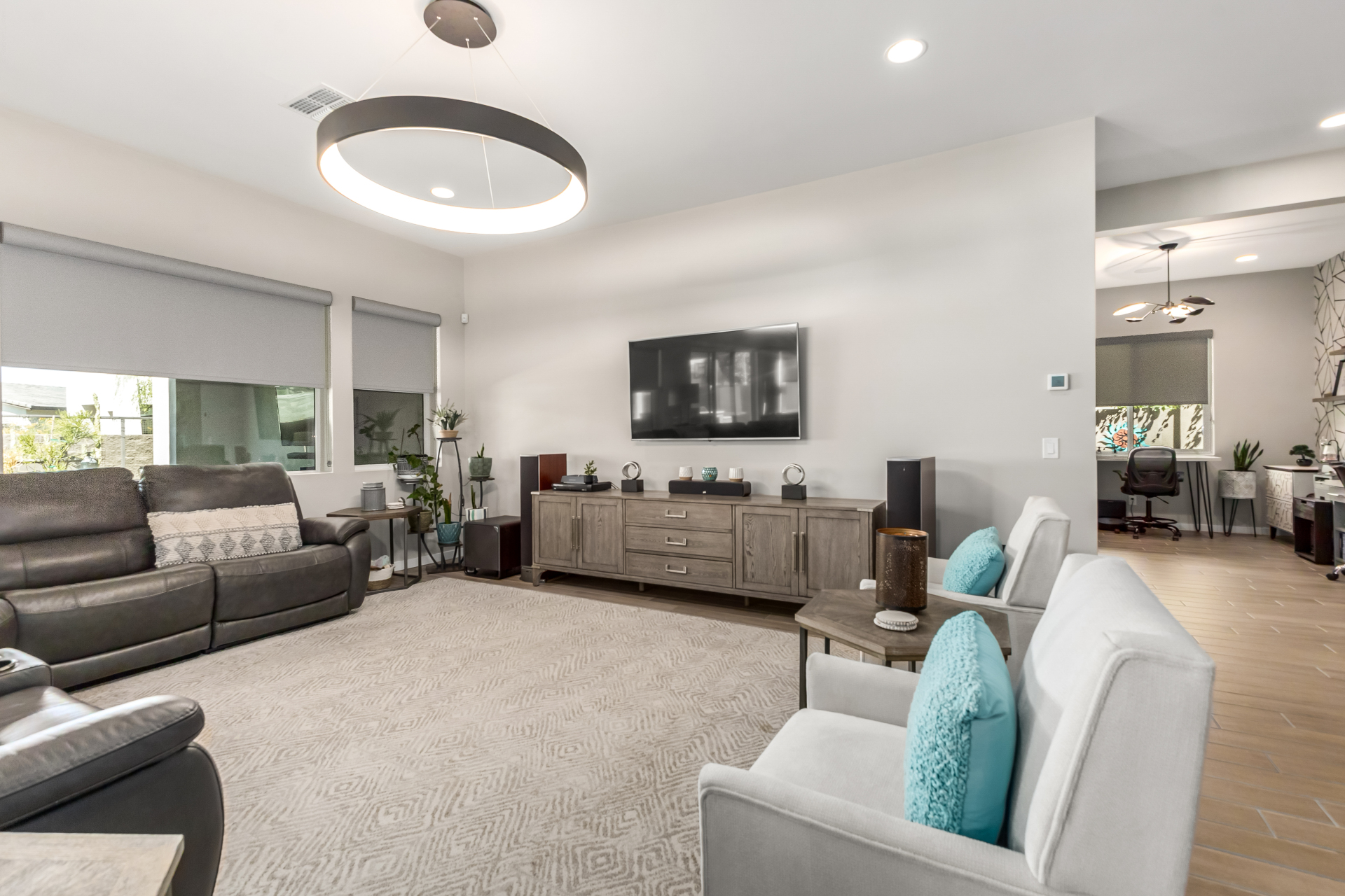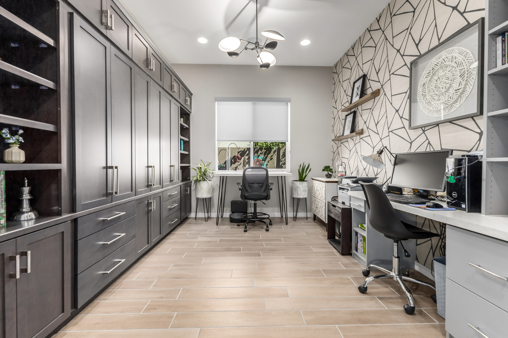 This spacious single-story former model home, designed by Bobby Berk, offers over $165K in upgrades with upscale finishes throughout. The gourmet kitchen features GE Café gas appliances, a 5-burner cooktop, double ovens, built-in ice machine, upgraded pantry, stainless side-by-side refrigerator, and quartz countertops. Enjoy indoor-outdoor living with a 12' multi-slider and wood-look tile throughout. Highlights include dark wood cabinetry, custom office with built-ins, generation suite with kitchenette, window treatments, whole-house sound system, water softener, garage cabinets with epoxy floors, and a landscaped backyard with mist system, fireplace, and built-in BBQ. Near South Mountain, Downtown, and Sky Harbor--don't miss your chance to make this sunning home yours!