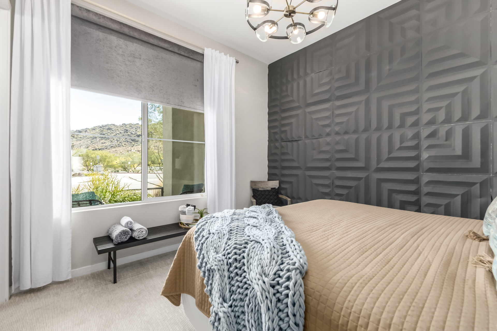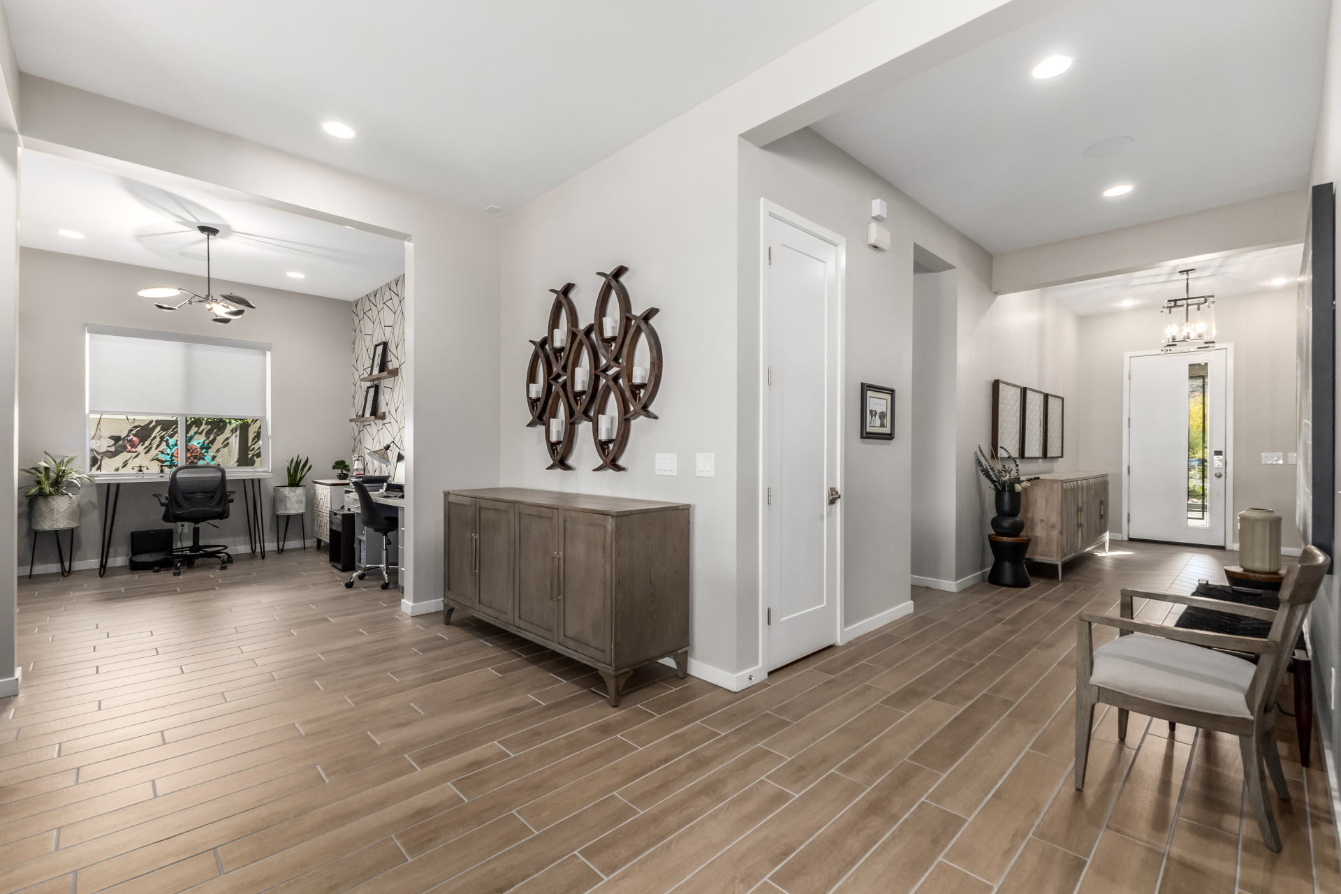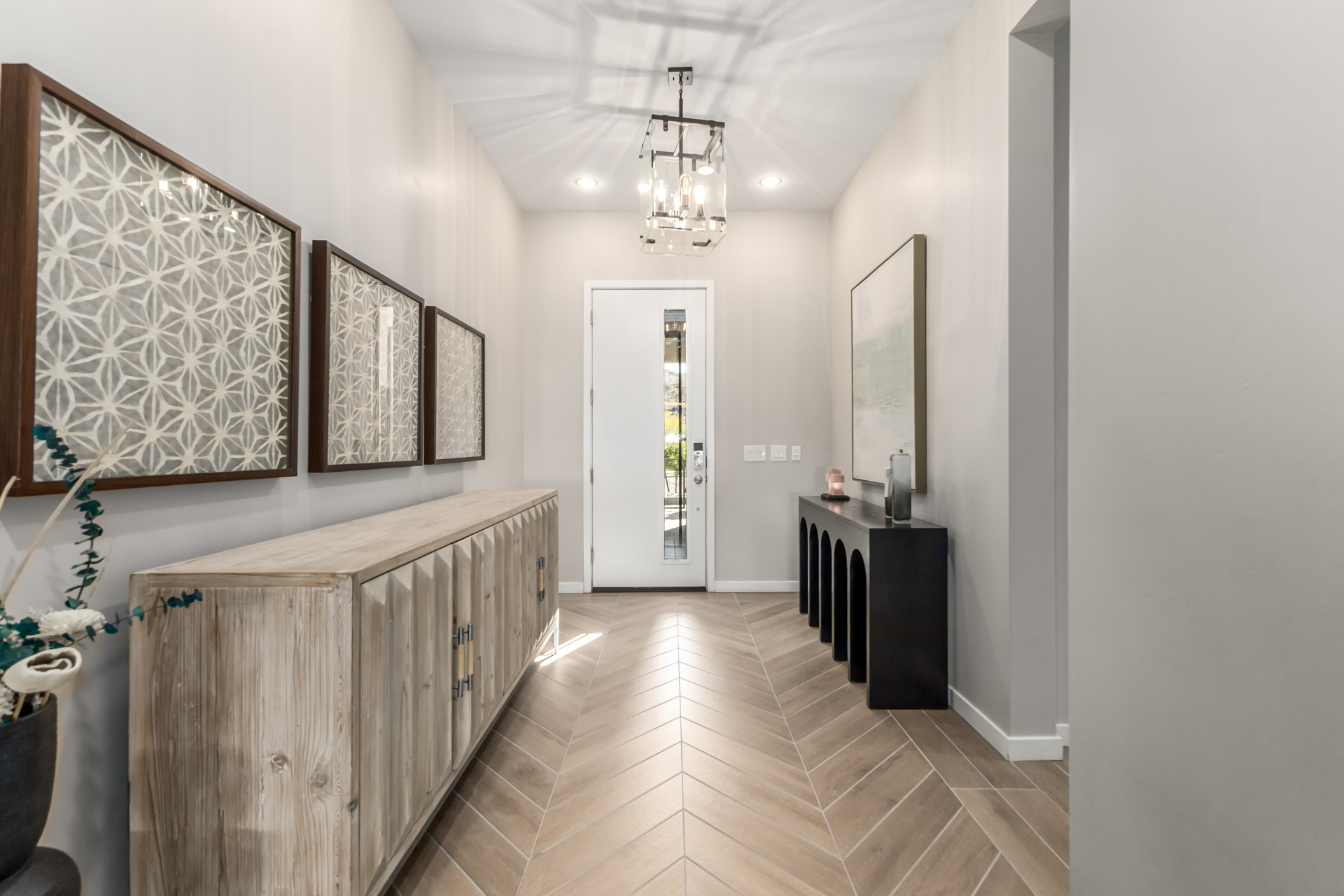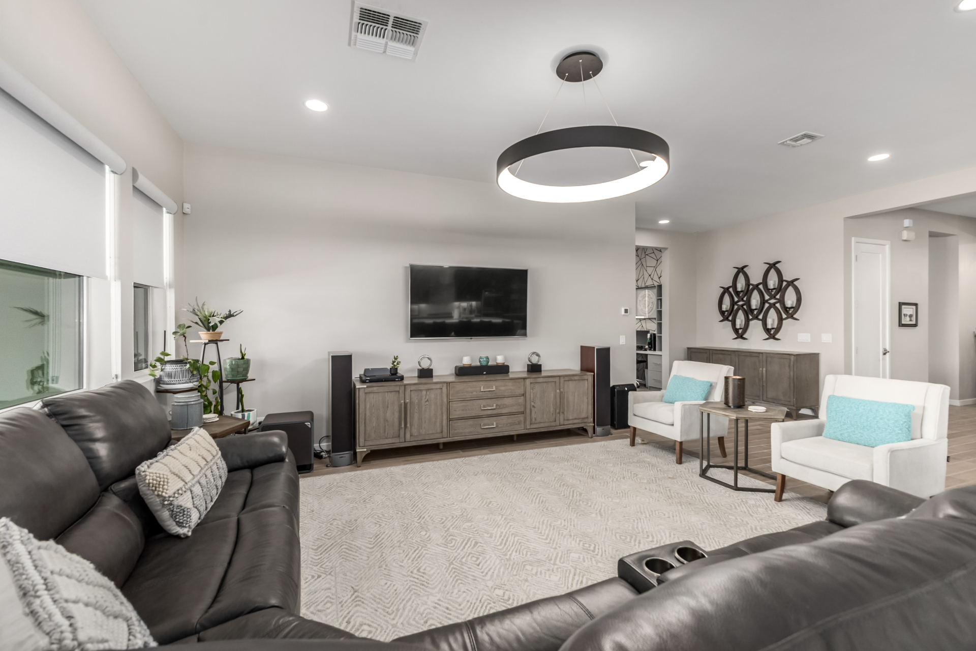 This spacious single-story former model home, designed by Bobby Berk, offers over $165K in upgrades with upscale finishes throughout. The gourmet kitchen features GE Café gas appliances, a 5-burner cooktop, double ovens, built-in ice machine, upgraded pantry, stainless side-by-side refrigerator, and quartz countertops. Enjoy indoor-outdoor living with a 12' multi-slider and wood-look tile throughout. Highlights include dark wood cabinetry, custom office with built-ins, generation suite with kitchenette, window treatments, whole-house sound system, water softener, garage cabinets with epoxy floors, and a landscaped backyard with mist system, fireplace, and built-in BBQ. Near South Mountain, Downtown, and Sky Harbor--don't miss your chance to make this sunning home yours!