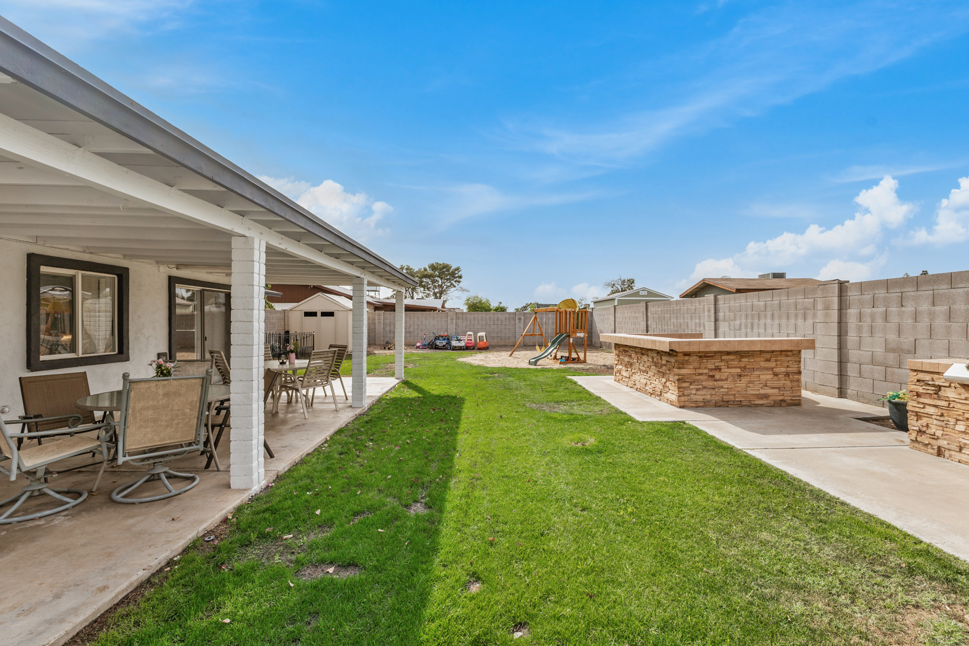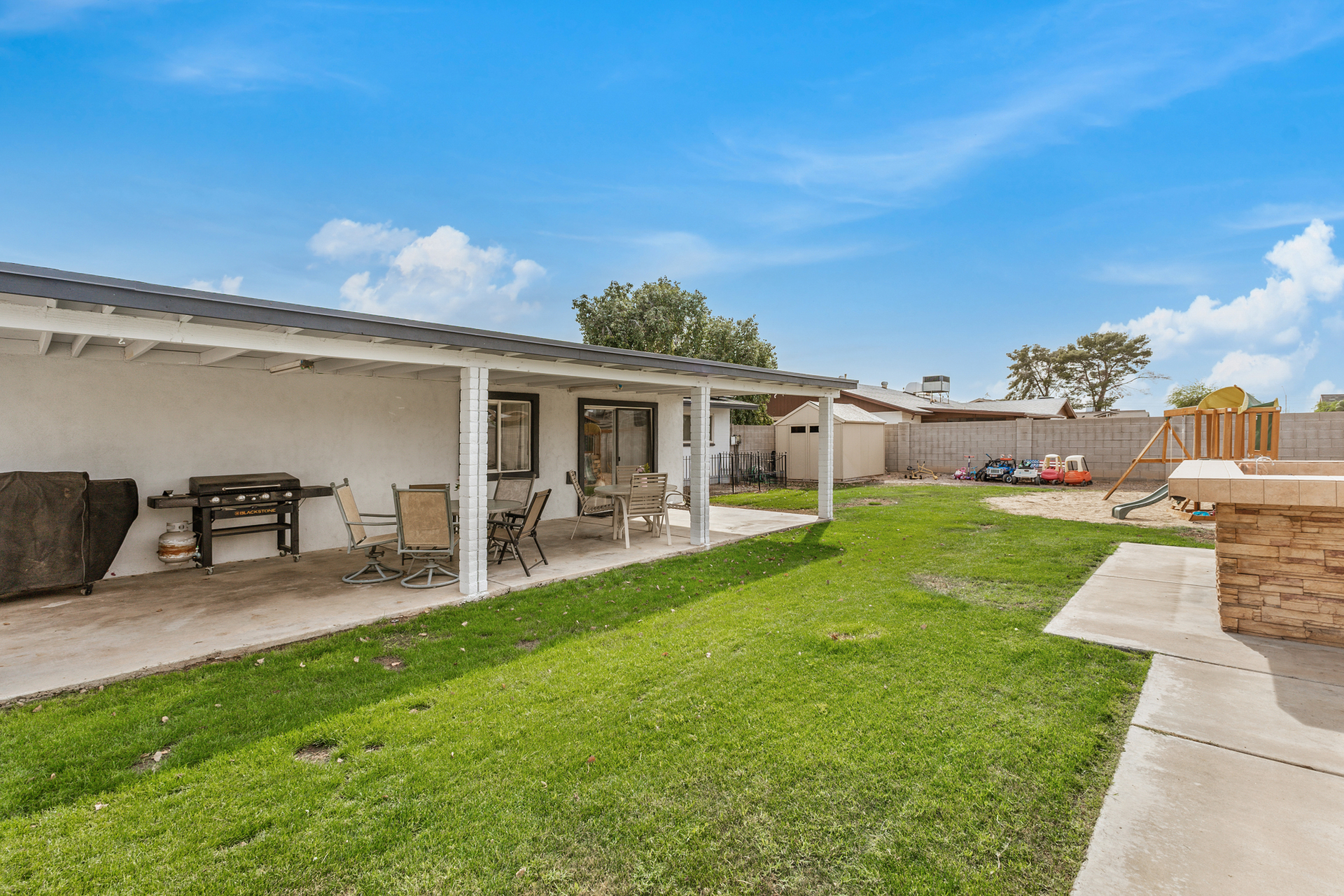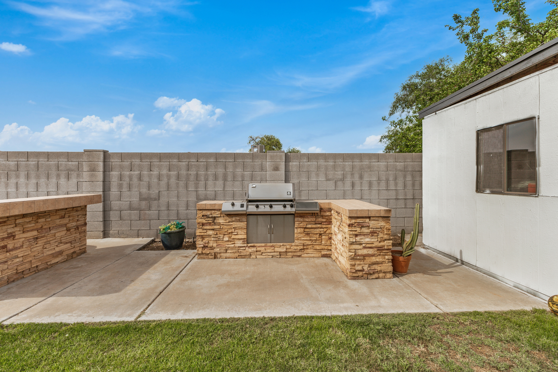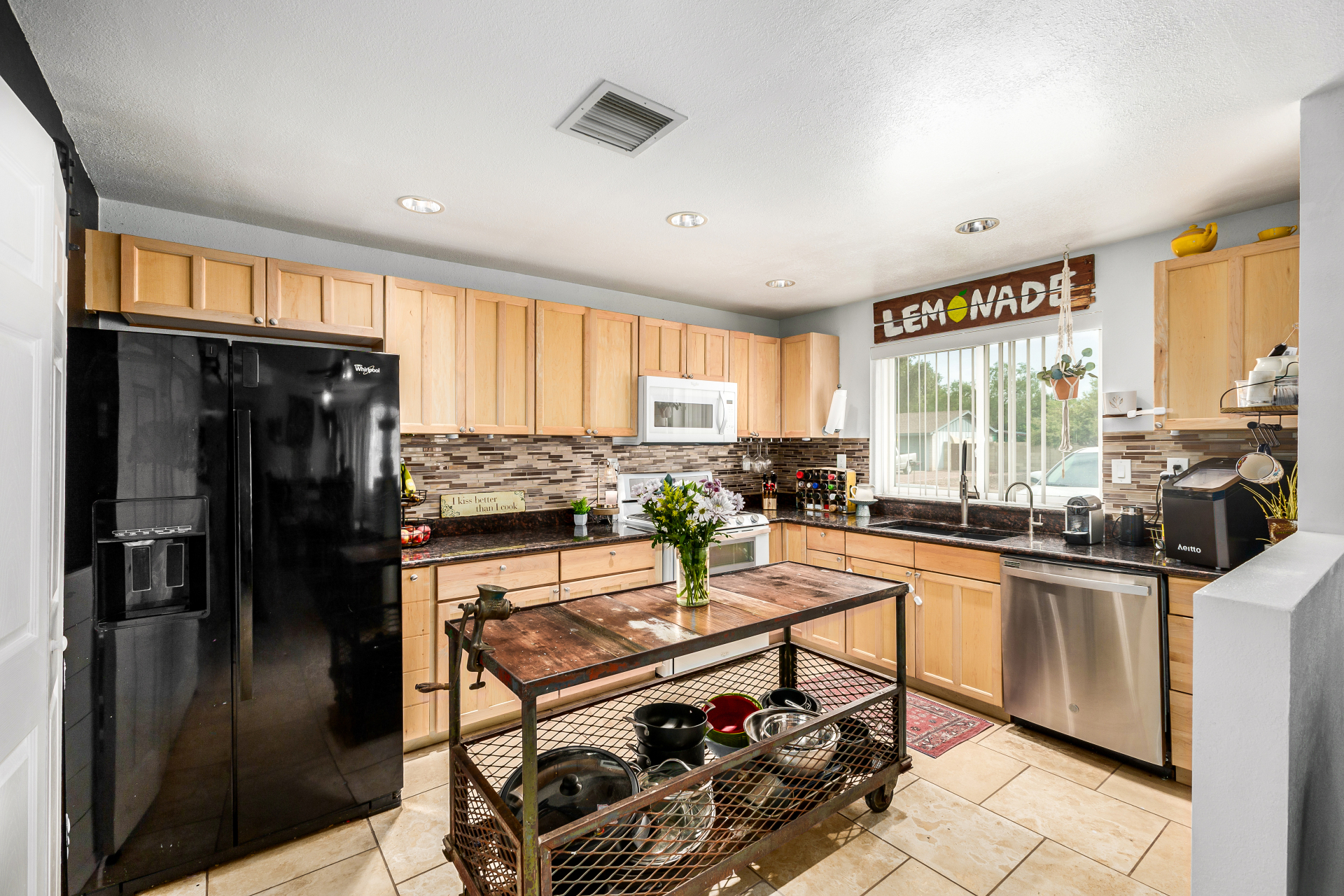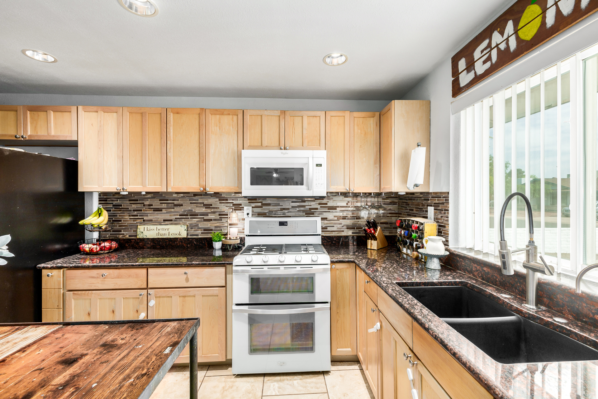 This gorgeous single-story home is ready to bring you joy! Fall in love with the bright and inviting living areas, featuring tile floors, abundant natural light, shiplap accents to add charm, and neutral colors throughout. Prepare feasts and quick meals in the impeccable kitchen, equipped with recessed lighting, oak cabinetry, tile backsplash, granite countertops, and built-in appliances. The main suite promises a good night's sleep and features a practical walk-in closet for effortless organization, as well as a full bathroom for added privacy. Out back, you'll have a covered patio perfect for entertaining and relaxation, a grass area ideal for games, a shed, and a built-in BBQ, perfect for gatherings with family and friends. No HOA restrictions! Welcome home!