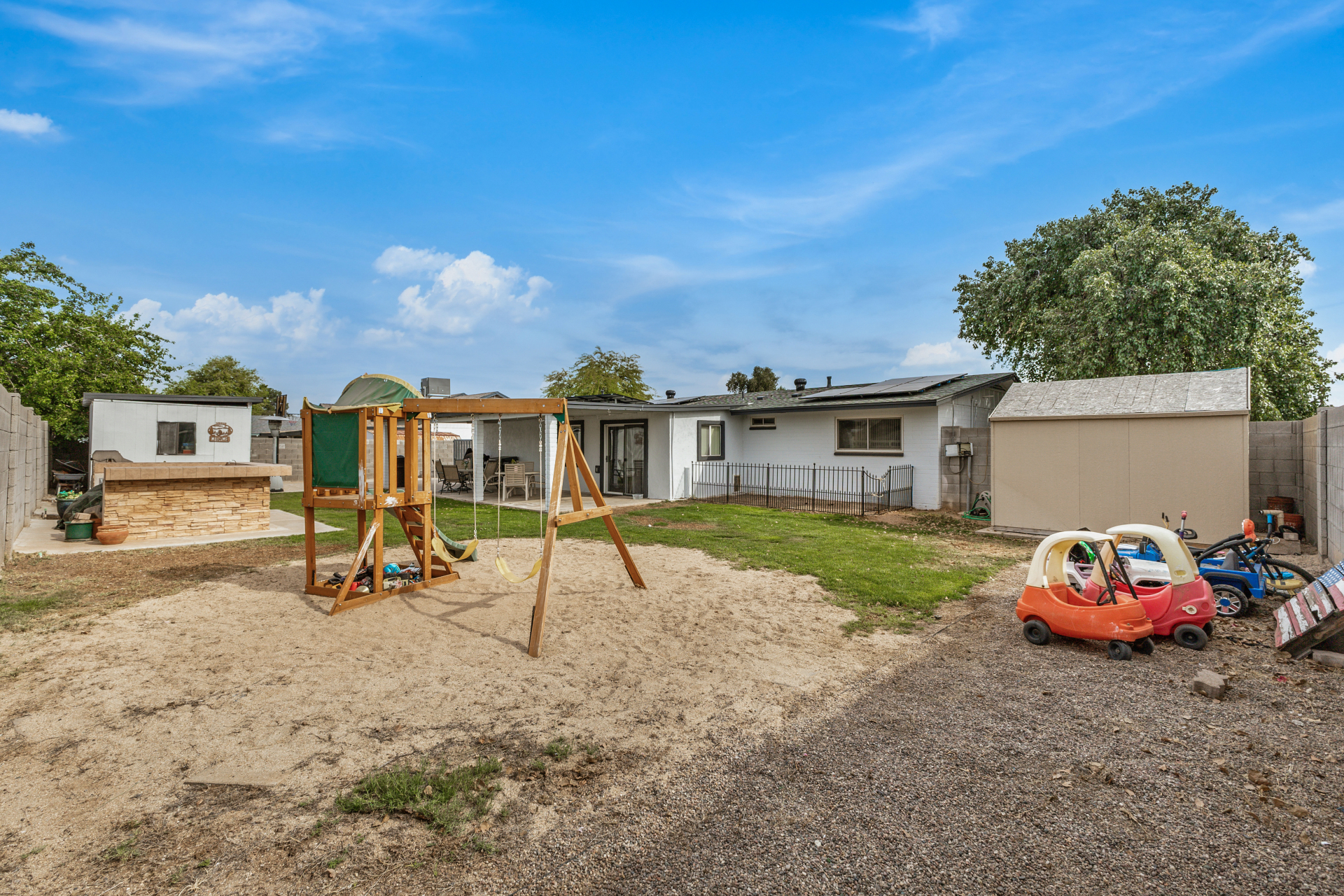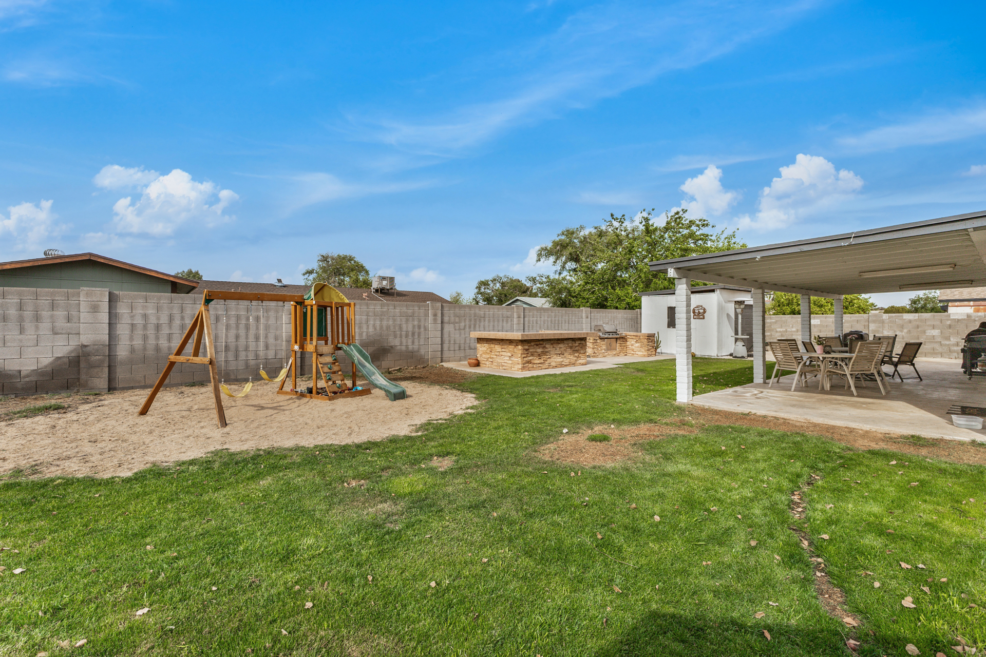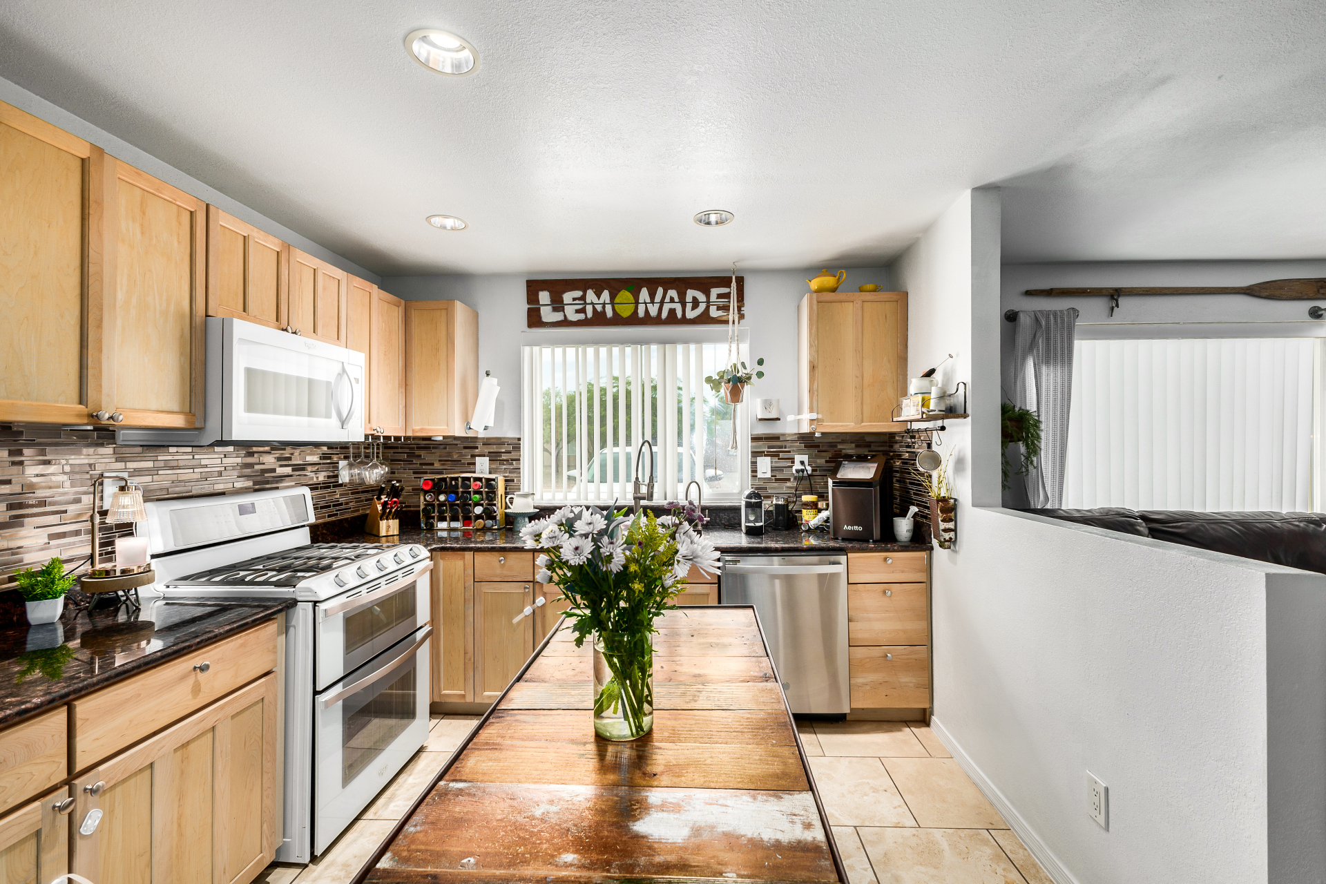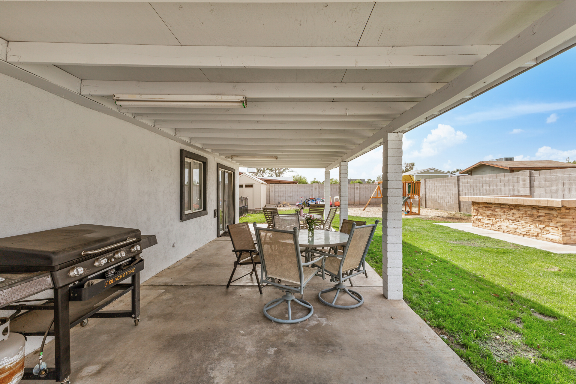 This gorgeous single-story home is ready to bring you joy! Fall in love with the bright and inviting living areas, featuring tile floors, abundant natural light, shiplap accents to add charm, and neutral colors throughout. Prepare feasts and quick meals in the impeccable kitchen, equipped with recessed lighting, oak cabinetry, tile backsplash, granite countertops, and built-in appliances. The main suite promises a good night's sleep and features a practical walk-in closet for effortless organization, as well as a full bathroom for added privacy. Out back, you'll have a covered patio perfect for entertaining and relaxation, a grass area ideal for games, a shed, and a built-in BBQ, perfect for gatherings with family and friends. No HOA restrictions! Welcome home!