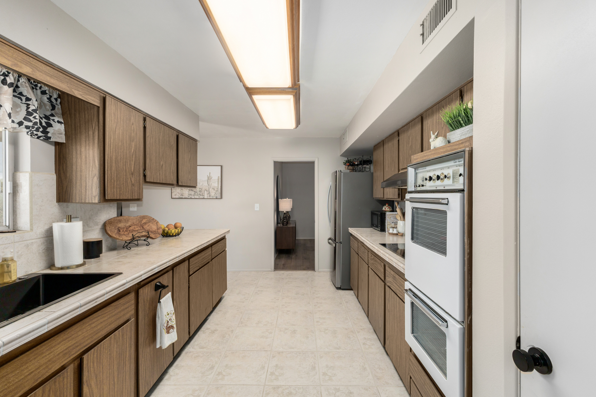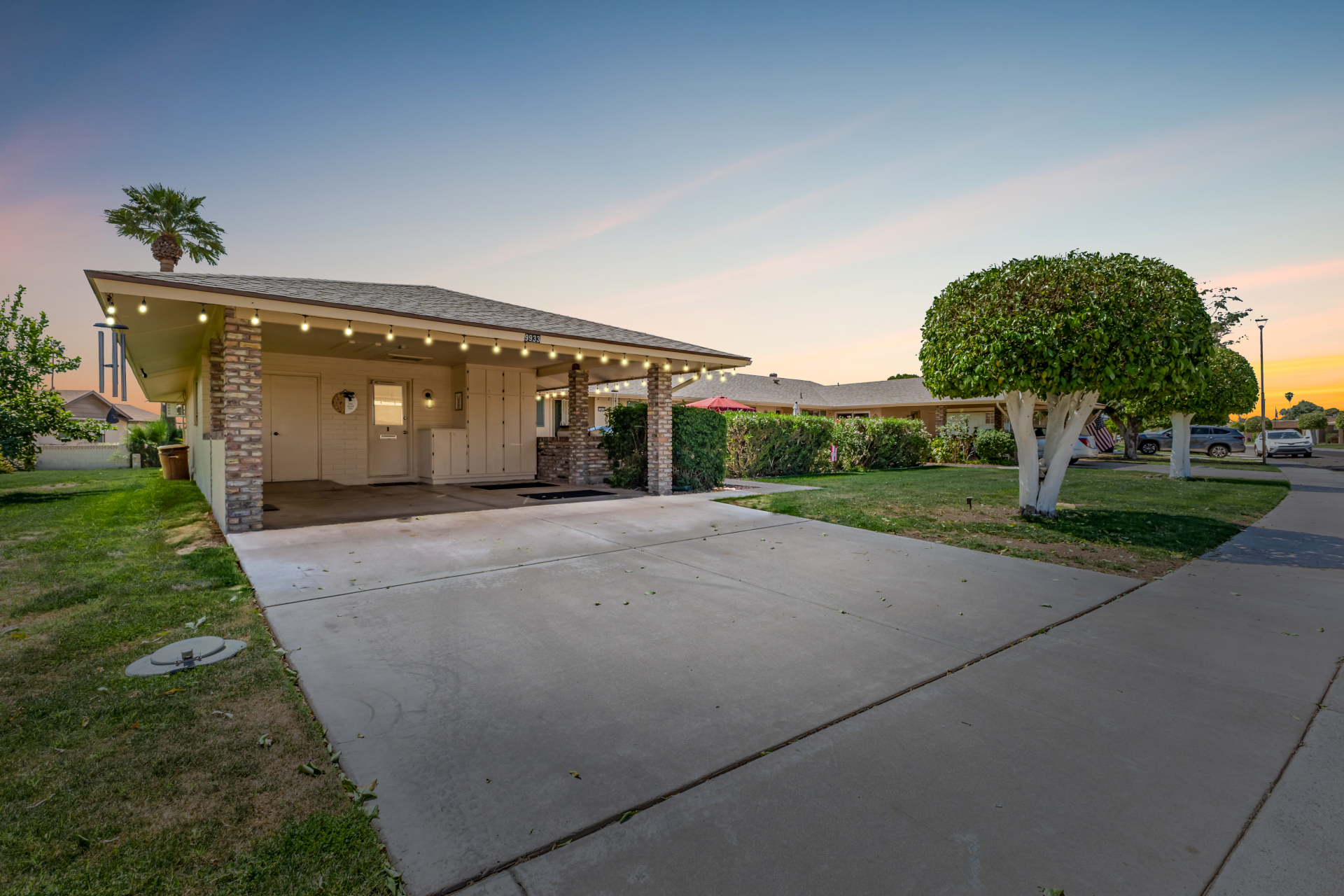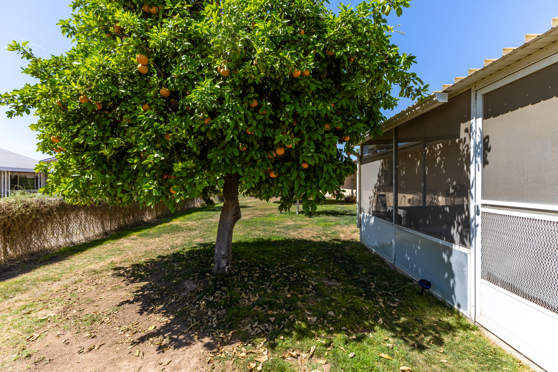 What a lovely 2-bedroom townhome perfectly located in the adult Community of Sun City! This North/South-facing gem offers carport parking, manicured landscape, and a gated courtyard with a built-in BBQ. Come inside to find a seamlessly flowing living & dining room, ideal for entertaining. The kitchen provides fluorescent lighting, matching appliances, tile counters & backsplash, plenty of cabinets, and a breakfast bar. Sizable primary bedroom includes a sitting room, a walk-in closet, and a private bathroom, bringing comfort to your everyday routine. Host weekend gatherings in the relaxing backyard, complete with a screened-in patio and fragrant citrus tree, excellent for enjoying freshly squeezed juice. Don't let this amazing abode slip by! Hurry!