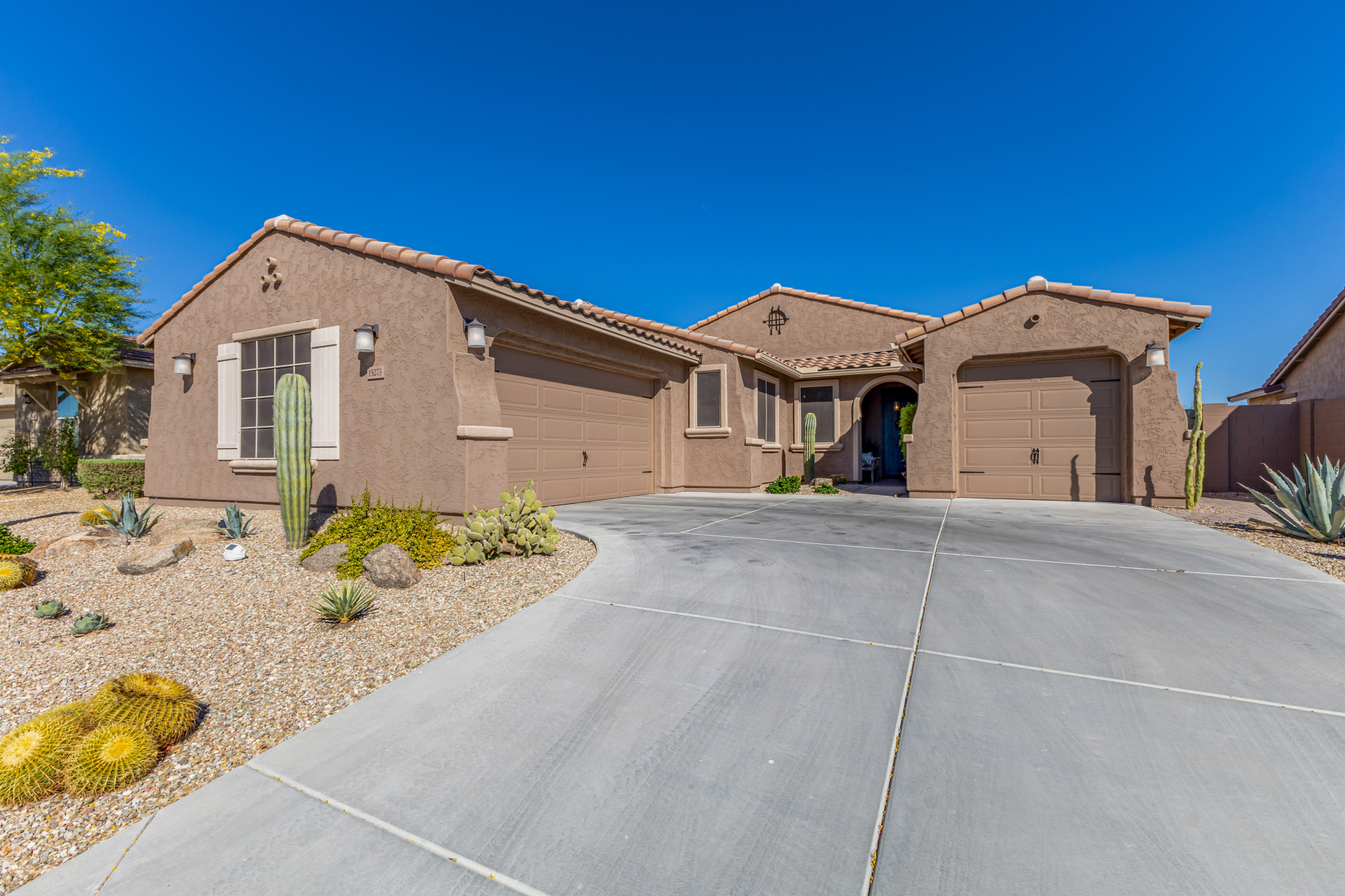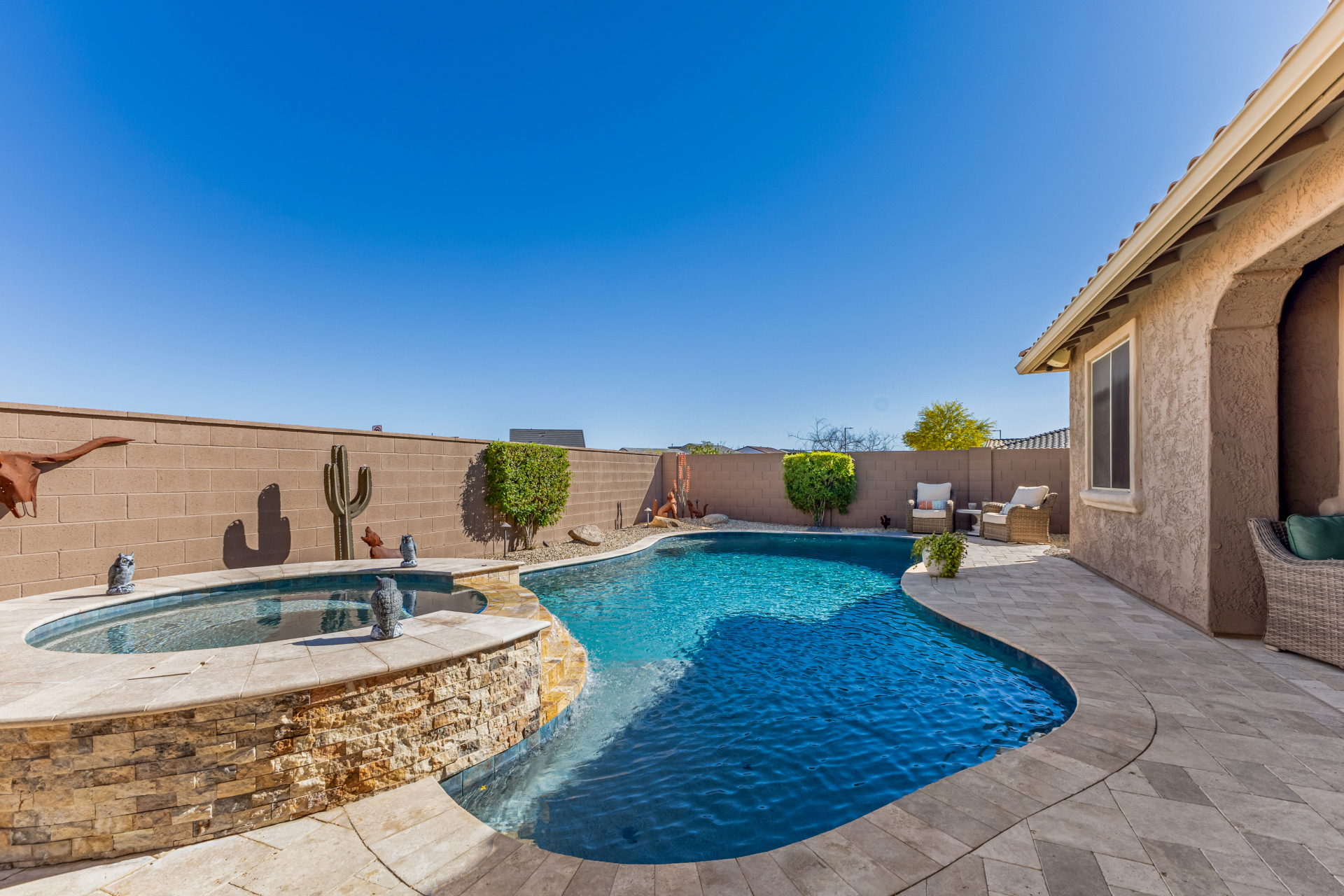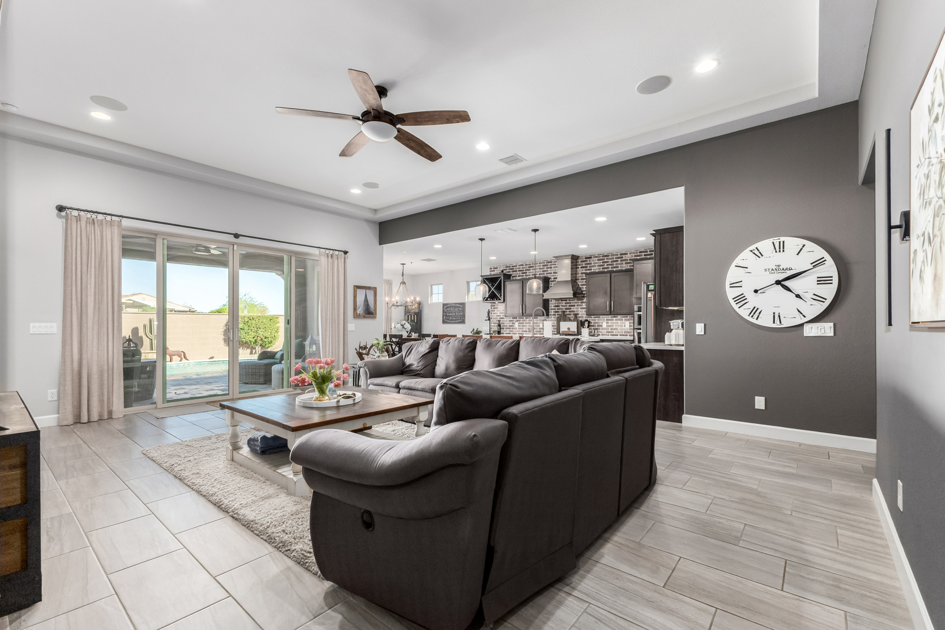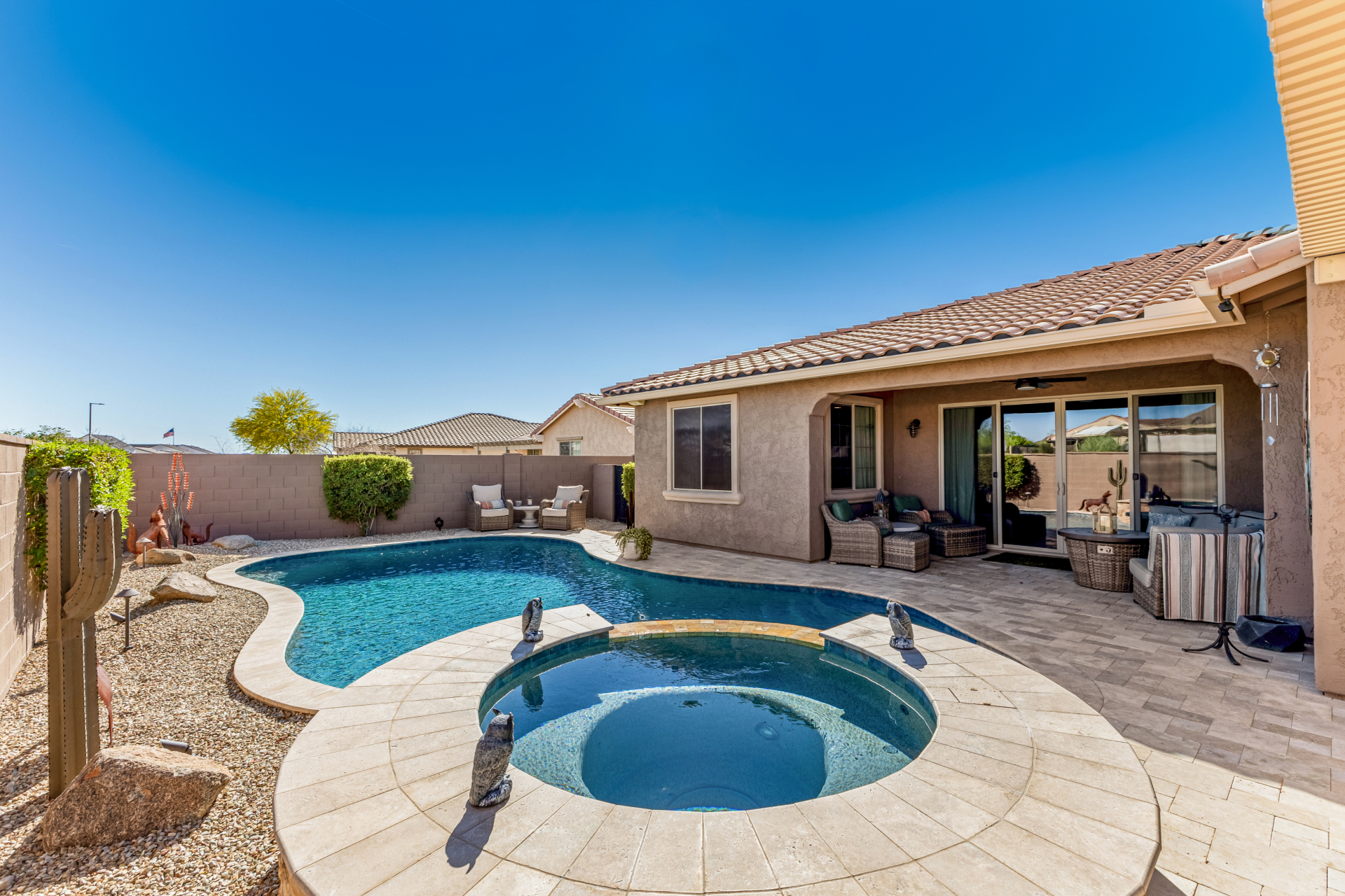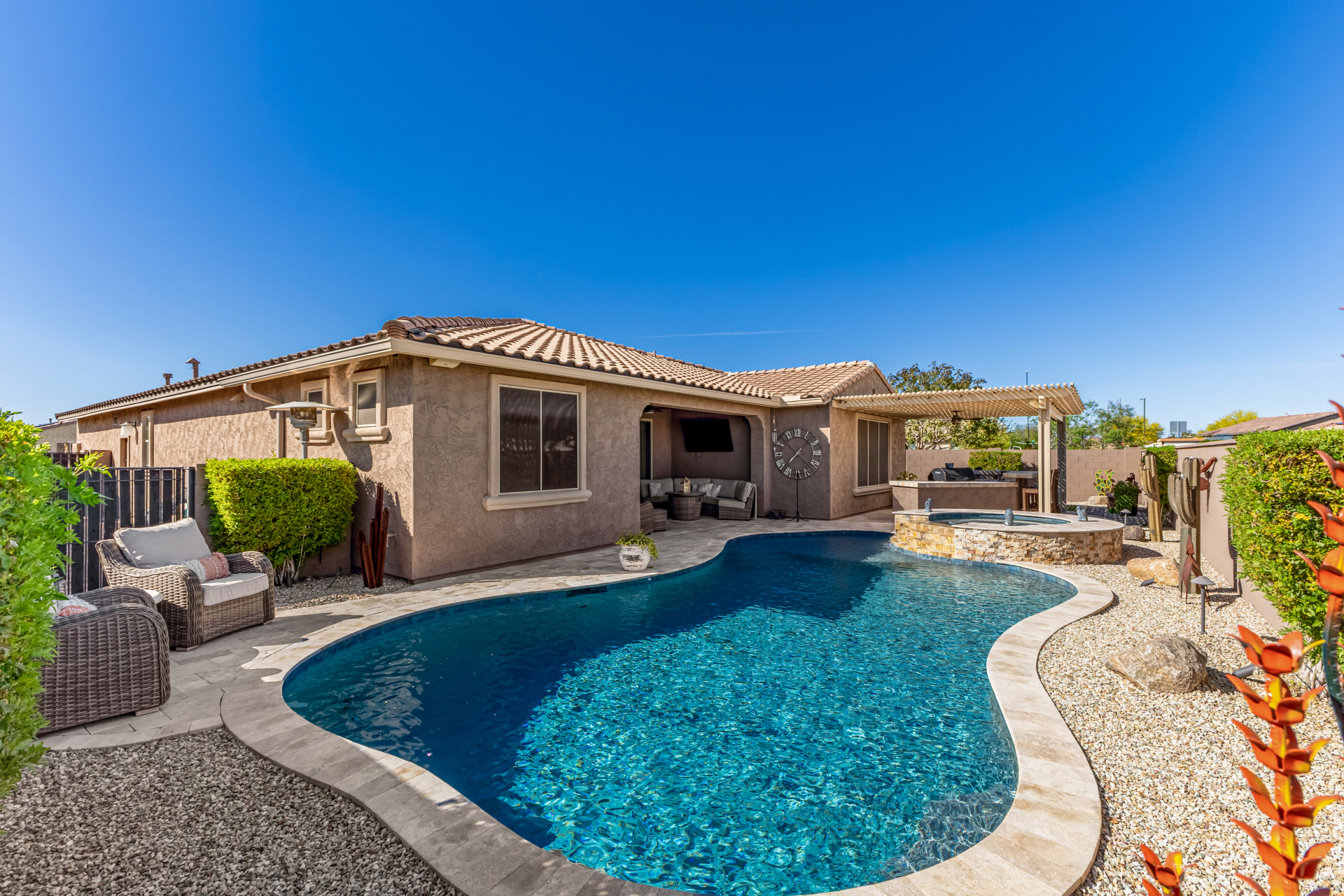 Discover this stunning Modern Farmhouse in Estrella Mountain Ranch, offering 5 spacious bedrooms, 3 beautifully designed baths, and an inviting open layout filled with natural light. The gourmet kitchen, elegant finishes, and flexible living spaces create the perfect blend of style and comfort. Step outside to your private oasis featuring a sparkling pool & Spa + outdoor kitchen, ideal for relaxing or entertaining. Located in a premier master-planned community with trails, lakes, and resort-style amenities, this home delivers exceptional living in a breathtaking desert setting.