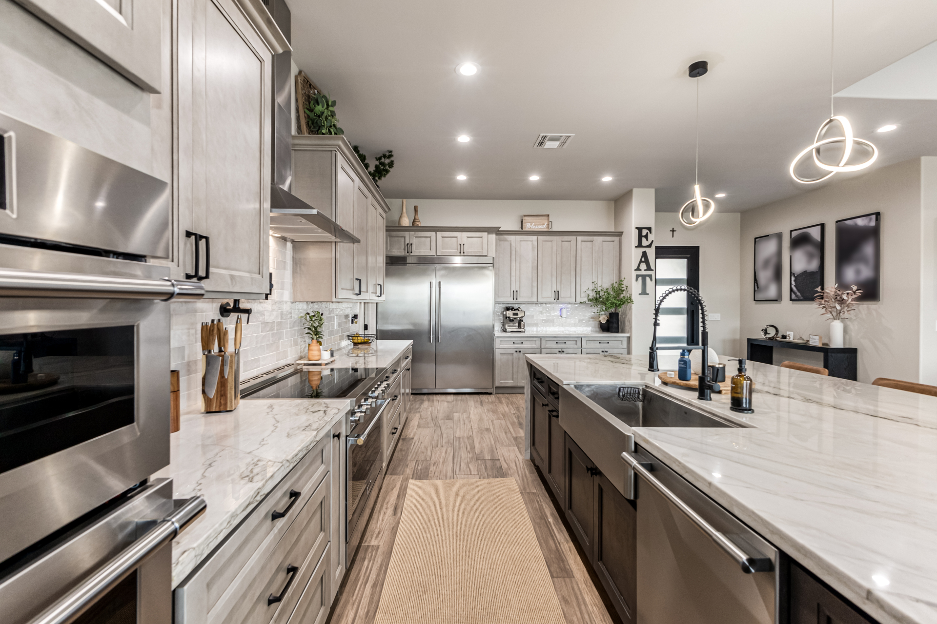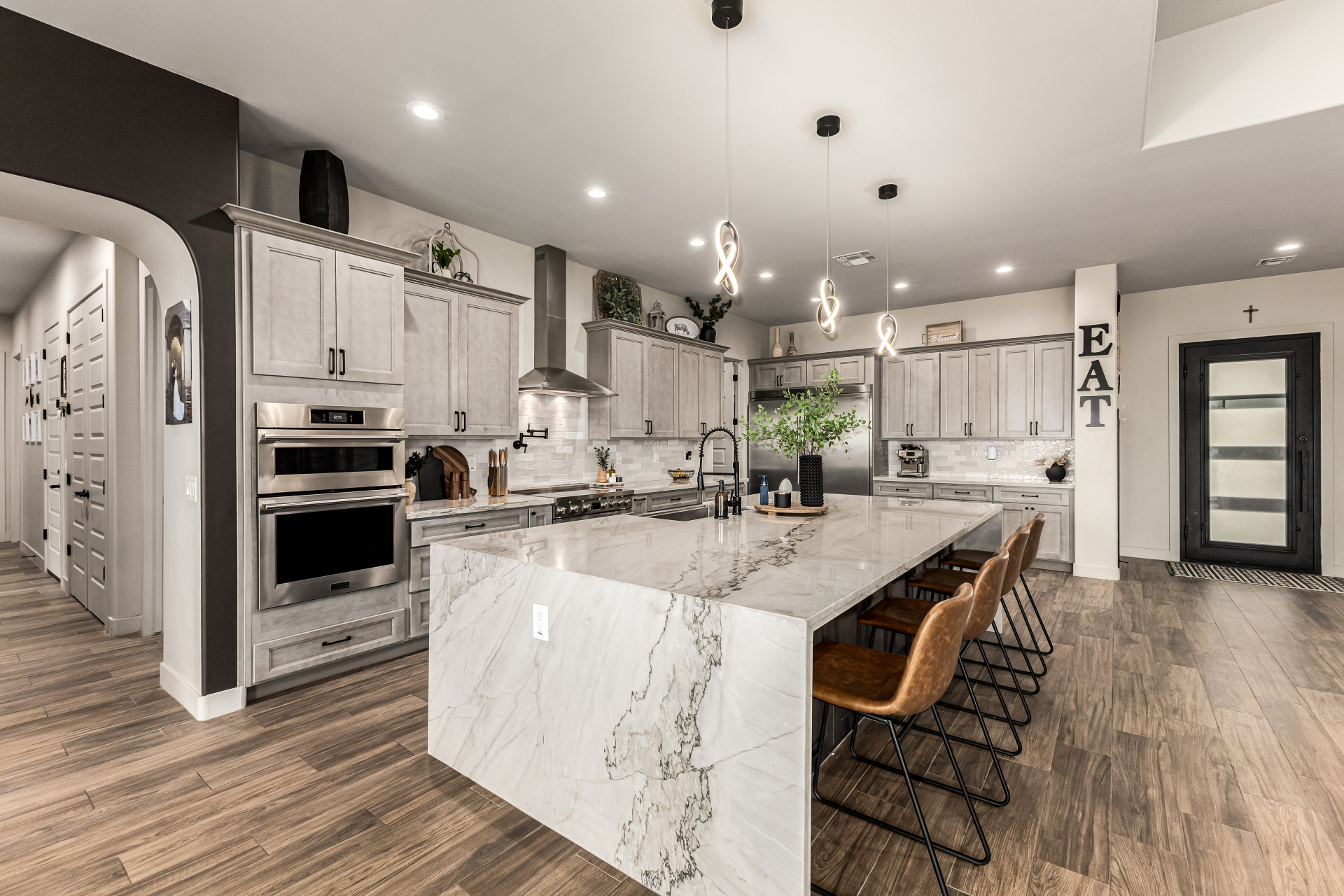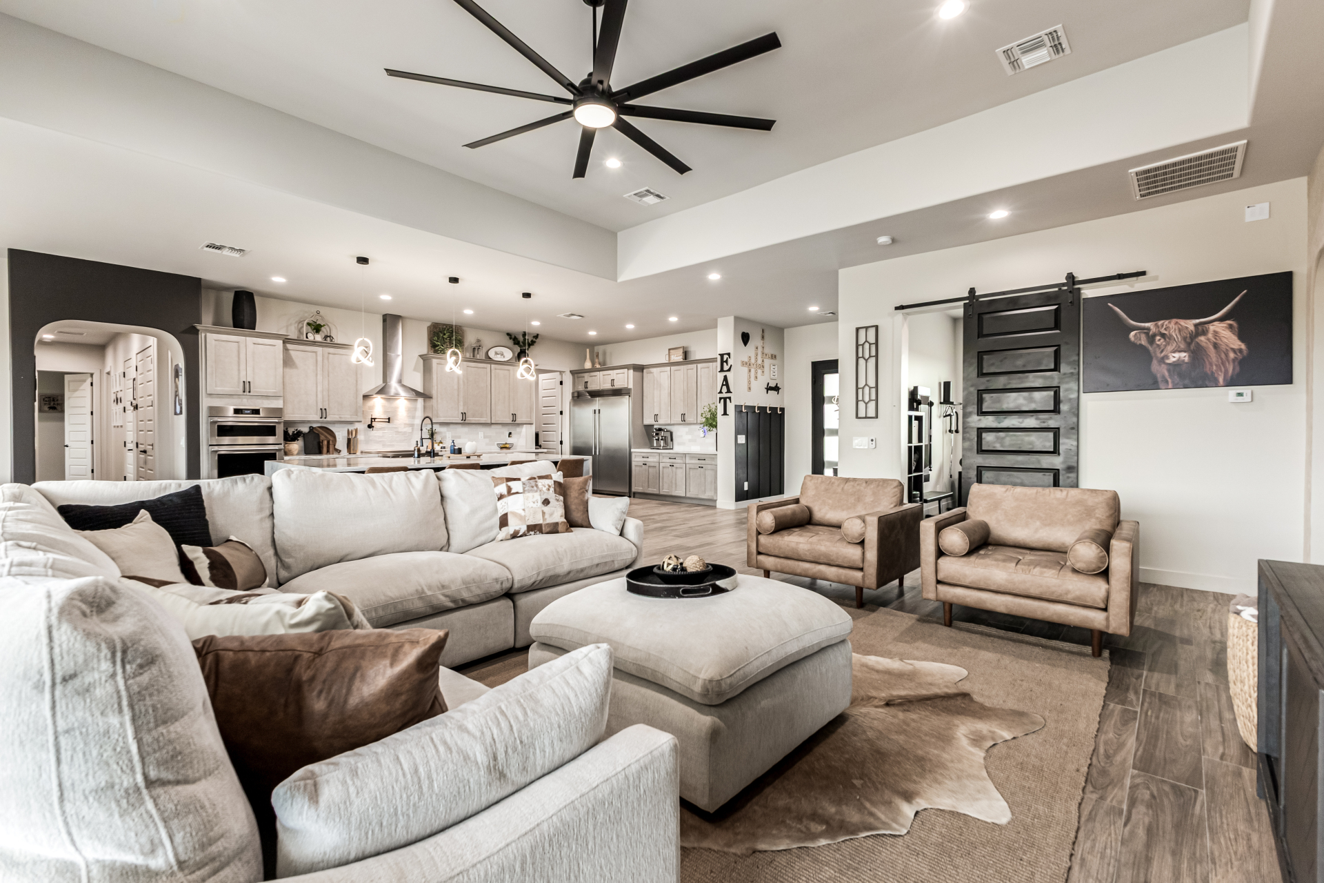 Welcome to this fabulous 2023 built home featuring 4 bedrooms nestled on a 1 AC lot with horse privileges! All the space you need for your animals, future additions, storage, cars, and more! The interior seamlessly blends style, comfort, and functionality, featuring wood-look floors, contemporary light fixtures, tons of natural light, and neutral colors that promote a modern feel throughout. The gourmet kitchen is a chef's dream, 2 tone cabinetry adorned with crown molding, tile backsplash, beautiful quartz countertops, SS Frigidaire Professional Series appliances, a walk-in pantry, and an island with a breakfast bar, perfect for entertaining. The main bedroom is a true retreat, offering a spa-like bathroom with double vanities, a separate shower & tub, a spacious walk-in closet