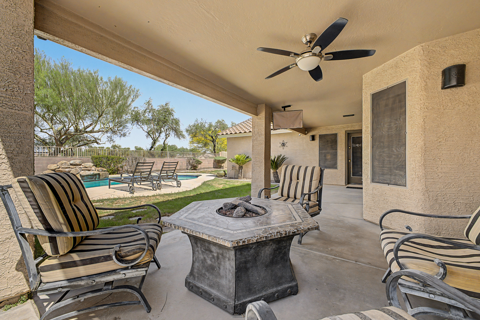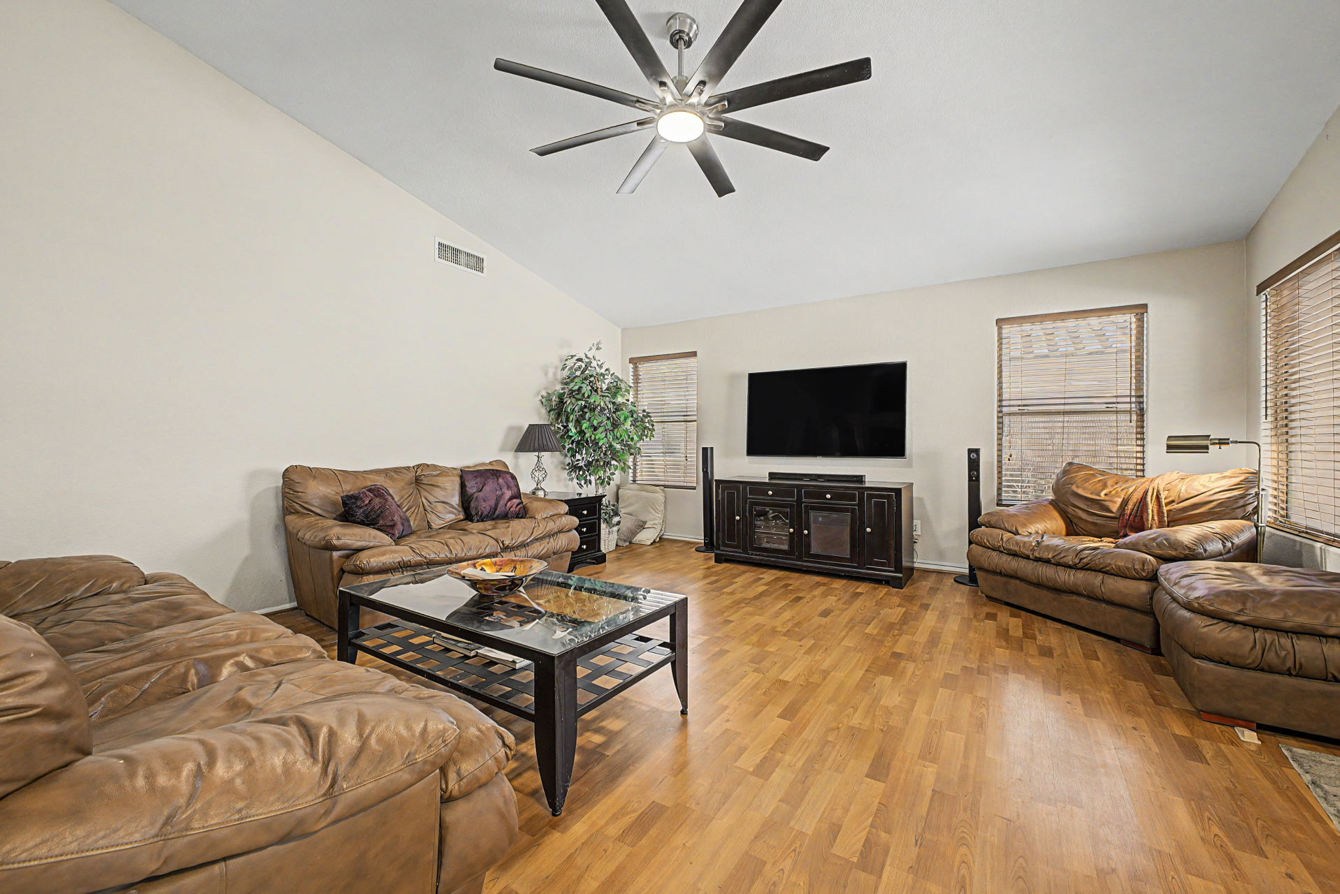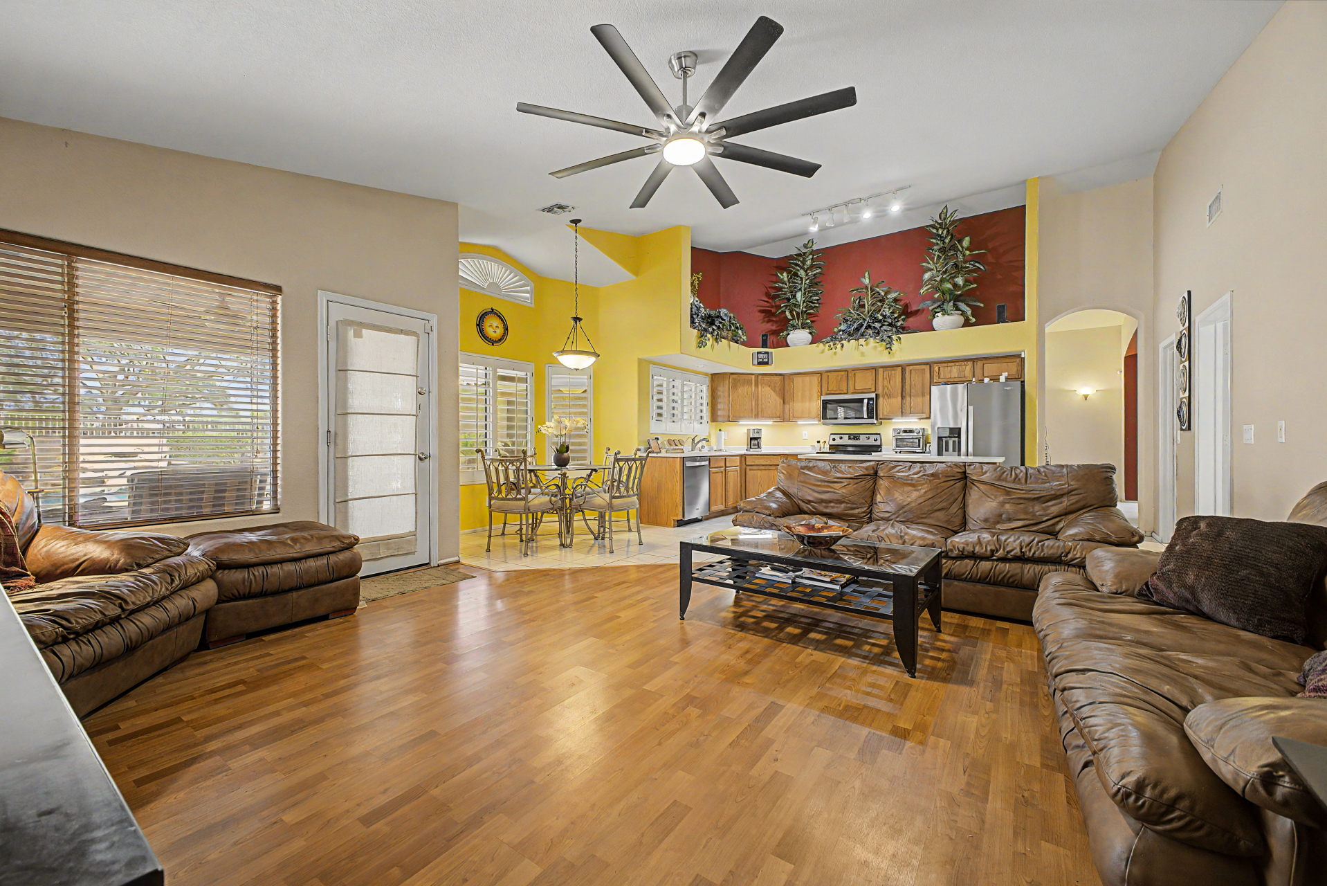 Welcome to this beautifully maintained, one-owner home offering 2,162 square feet of thoughtfully designed living space. The floorplan features two living areas, a formal dining space, 3 bedrooms, and a versatile den that can serve as a home office, media room, or guest space. The backyard includes a heated swimming pool and covered patio, creating an ideal setting for relaxing or entertaining year-round. With no home behind, the property offers added privacy and open views. The 3-car garage includes 220V power and provides ample space for vehicles, storage, or recreational equipment. Located near paved walking and biking trails, this home is also just minutes from the Goodyear Recreation Campus, which includes a park, aquatic center, and fitness facilities. Convenient access to I-10 and Loop 303 places shopping, dining, and Canyon Trails Towne Center nearby. A perfect blend of comfort, functionality, and lifestyle--this home is ready to impress.