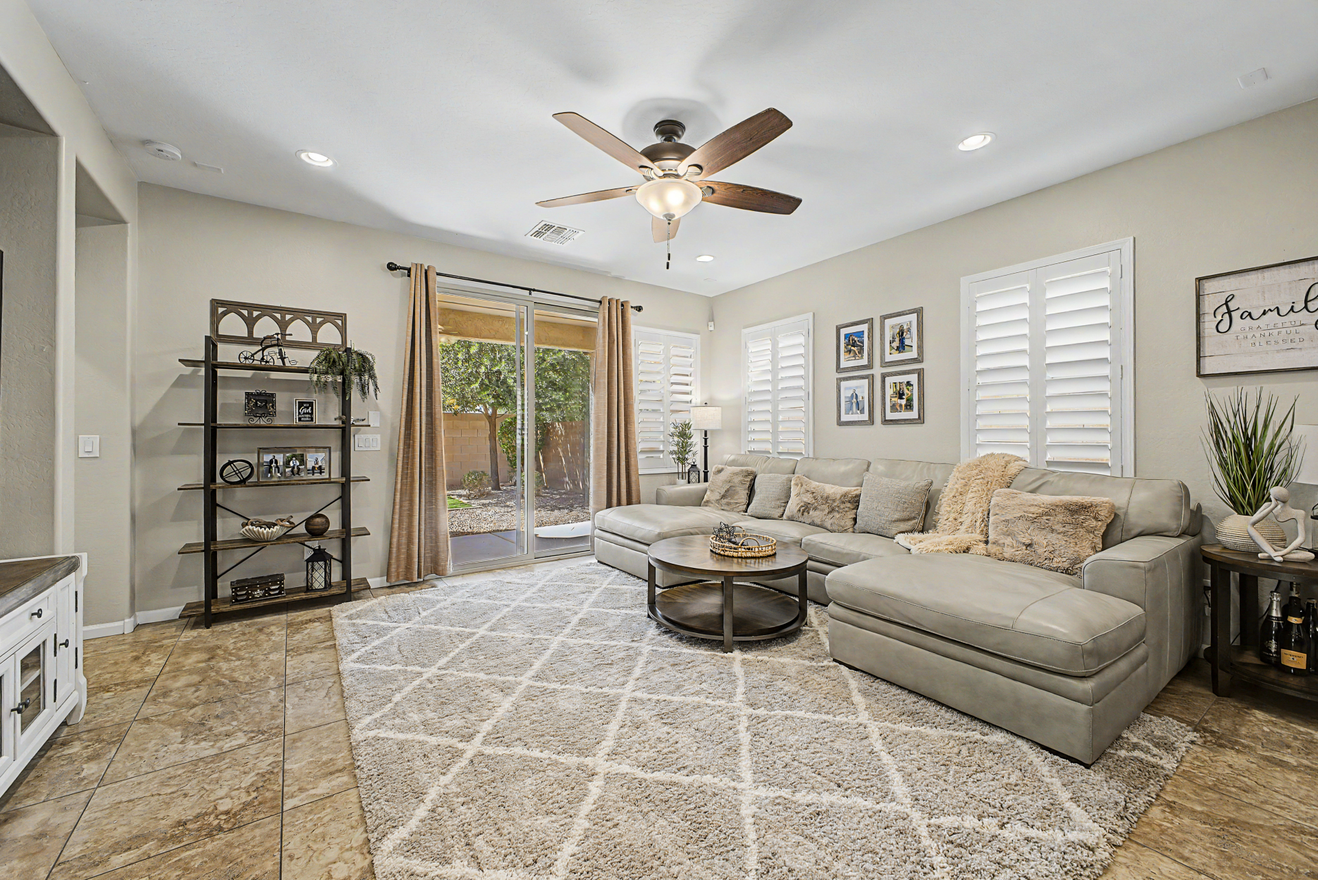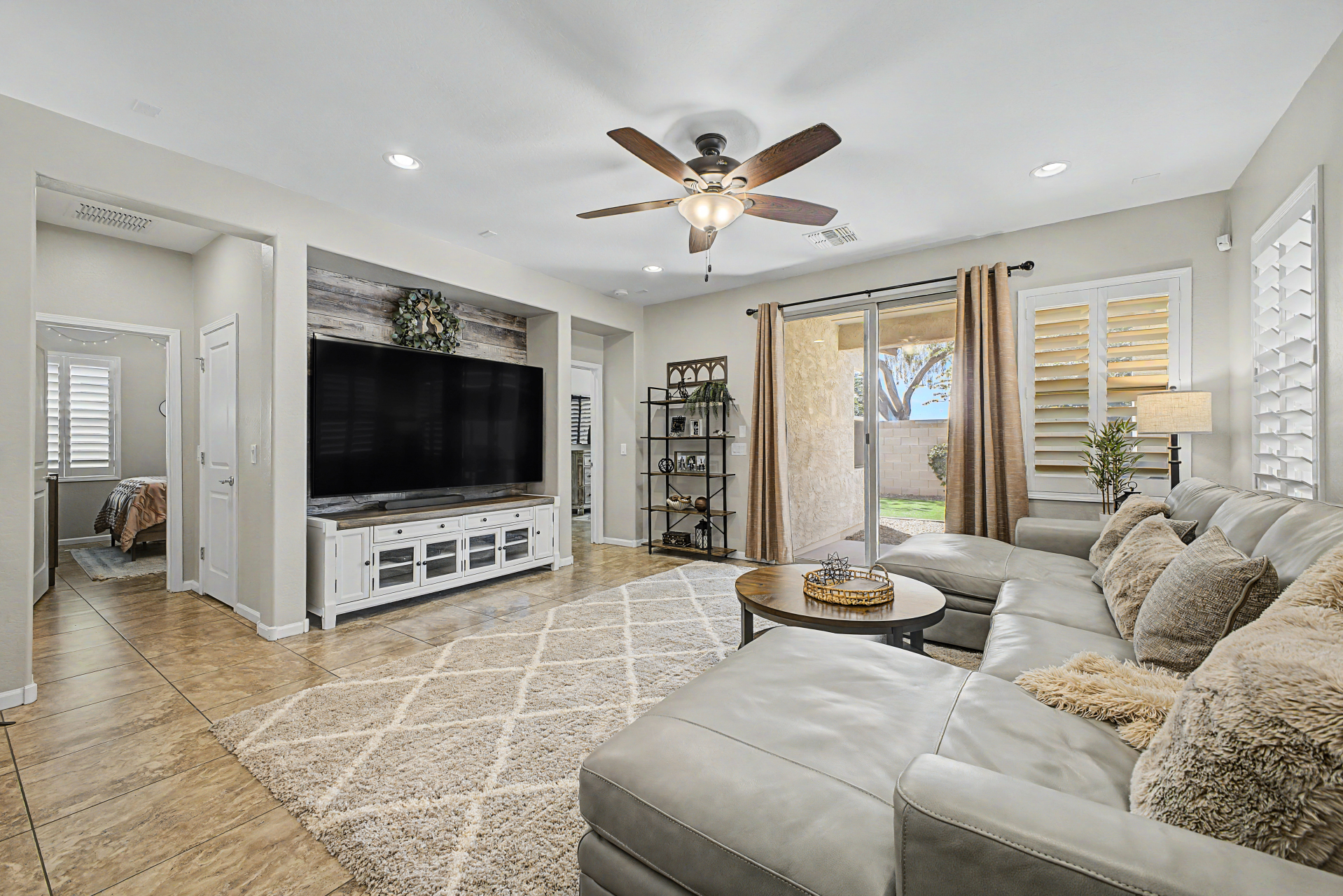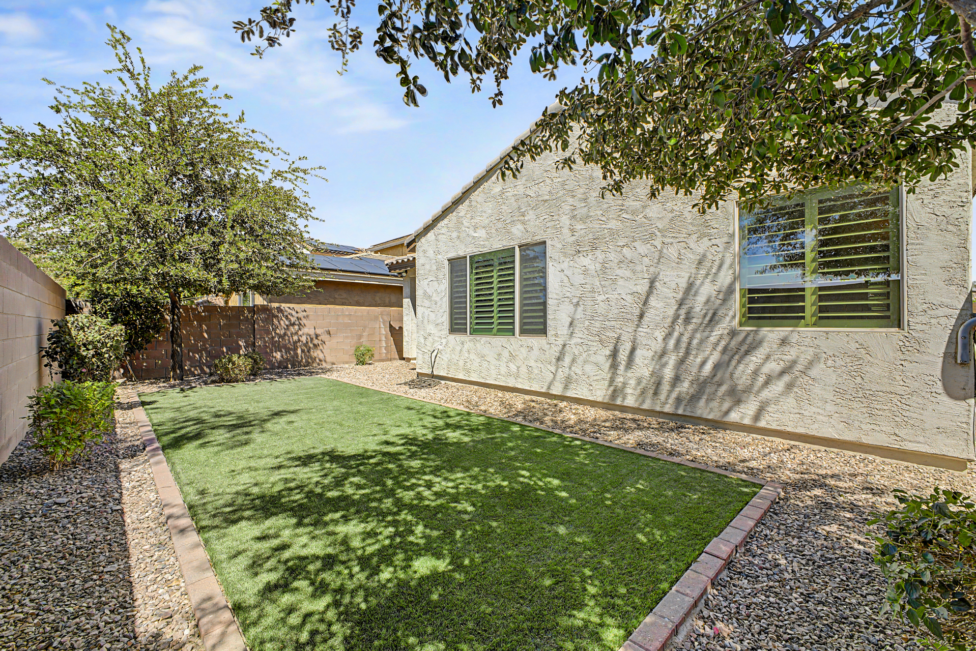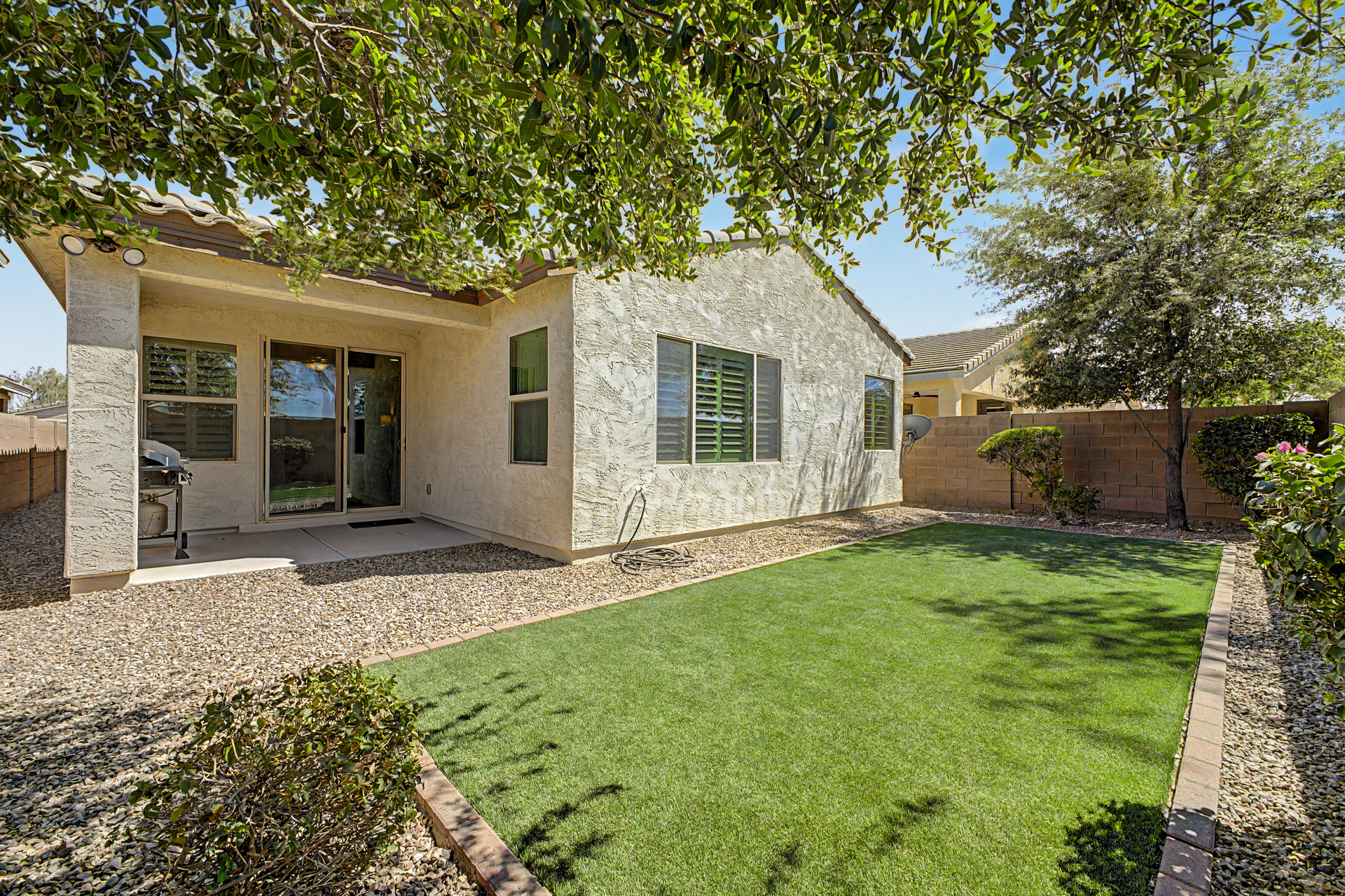 Welcome to this beautiful rare 5 bedroom, 3 bathroom single level home in Coldwater Ranch. Offering an open great room floorplan, tile flooring throughout, classy plantation shutters throughout, warm paint colors, granite counter tops, pre-wired for surround sound, an open kitchen to the great room with a new dishwasher, stainless steel appliances and sit up breakfast bar for those casual meals. The only house on the street with a paver driveway and turf front yard. The community features spacious grassy areas, a soccer field, a baseball field, and several small parks--perfect for recreation or relaxation. The house backs to an open desert area for complete privacy and to be amazed by awesome sunsets or stargazing while sitting on your back patio sipping a cold beverage.