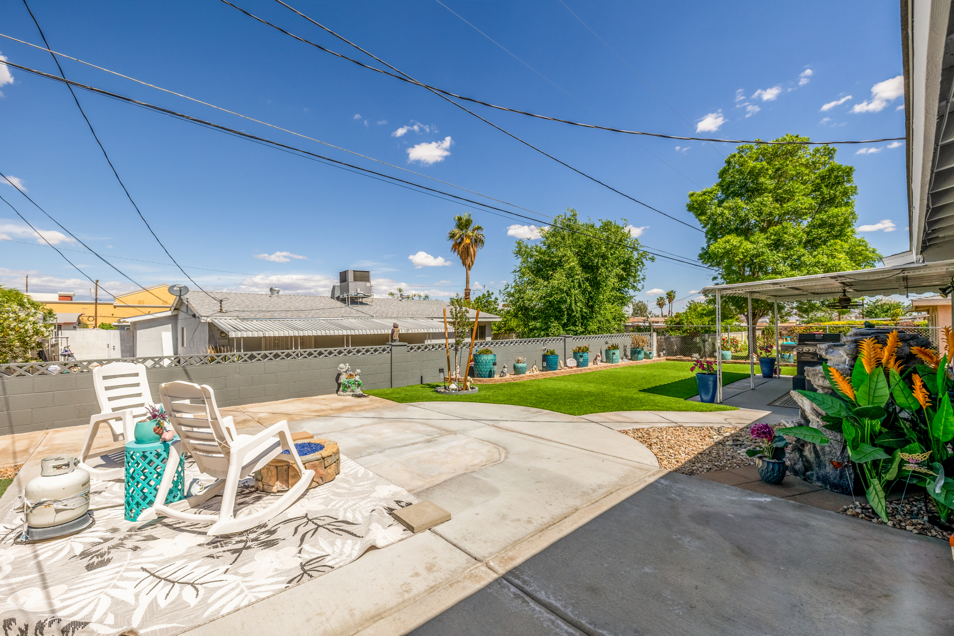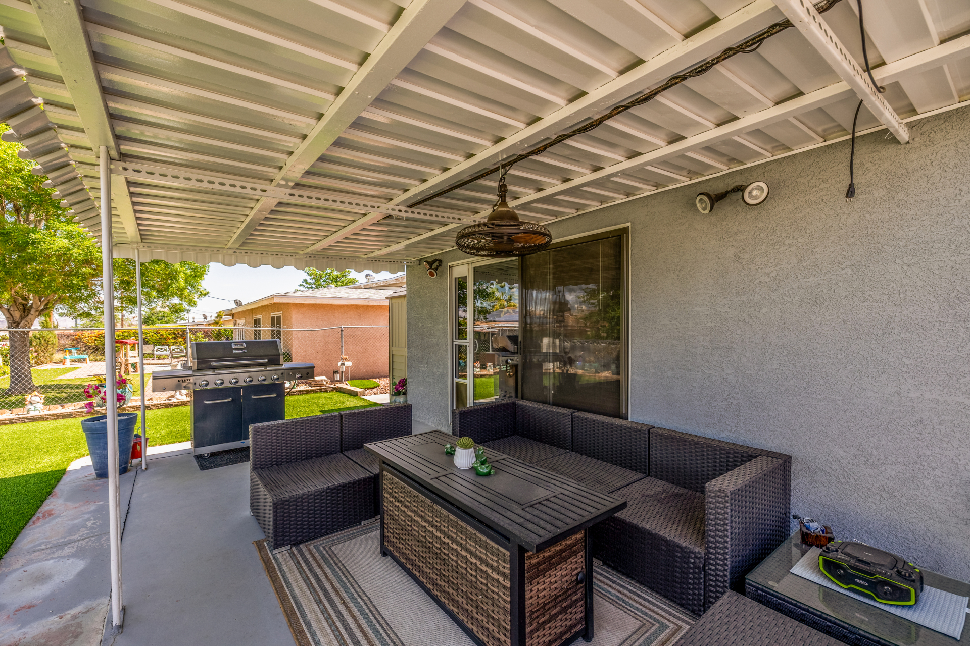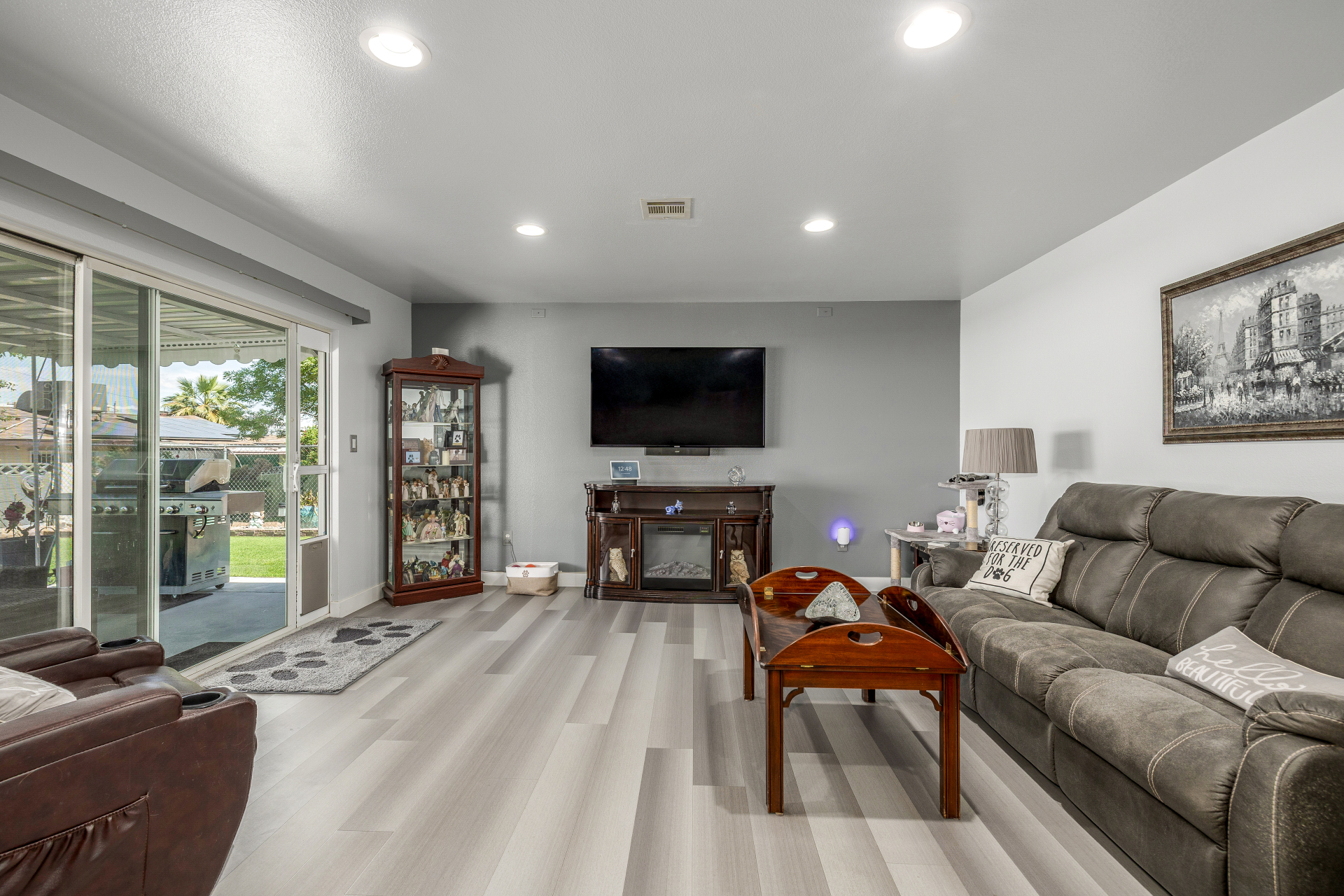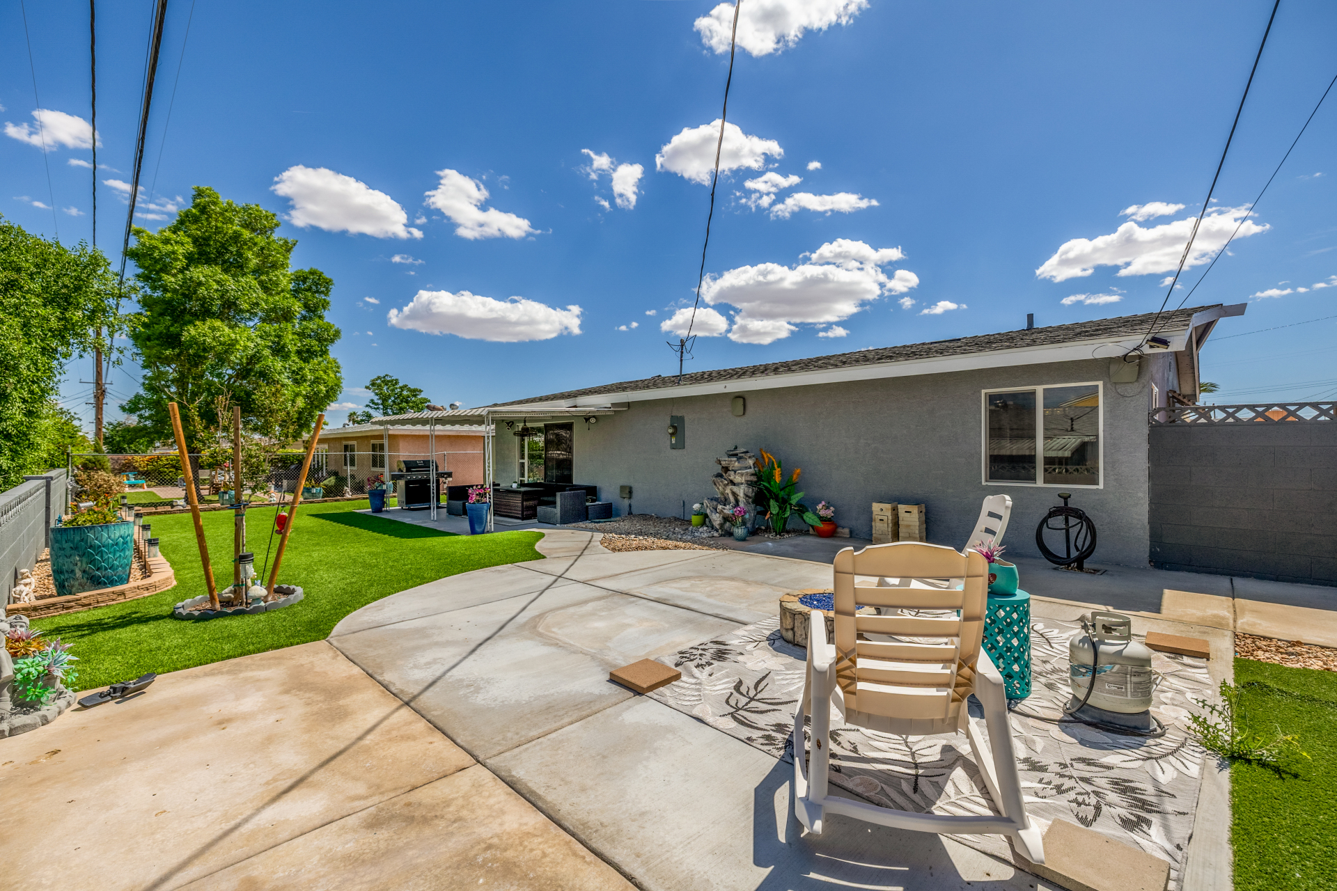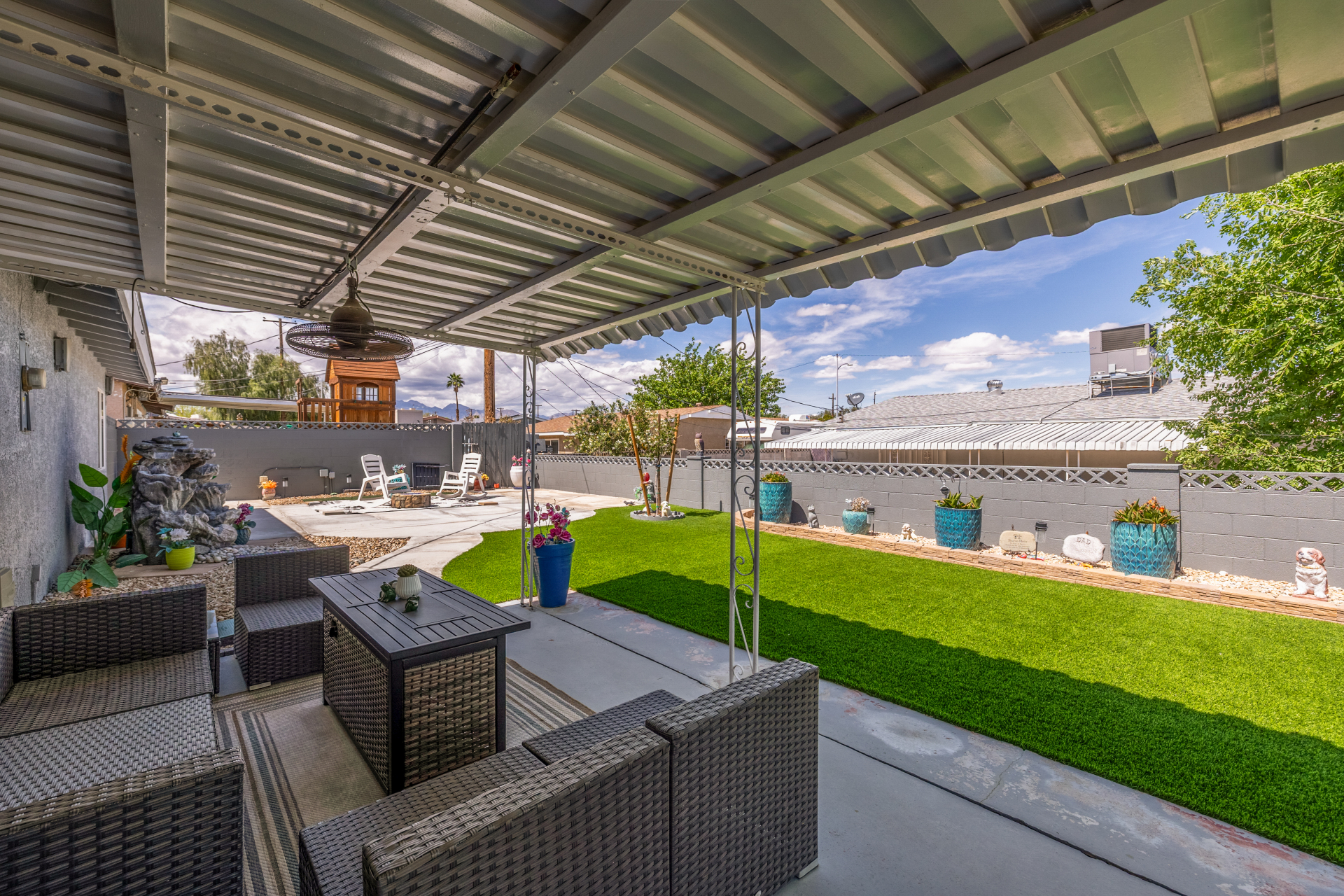 Discover the charm of this inviting 4-bed, 2-bath home in Las Vegas! Starting with a front porch, low-care landscape, carport parking, and an extended driveway. The welcoming interior showcases a neutral palette, abundant natural light, recessed lighting, and premium waterproof, scratch-resistant flooring. You'll love the seamlessly flowing living and dining room with sliding doors to the back, perfect for entertaining! The impressive kitchen boasts stainless steel appliances, quartz counters & backsplash, ample wood cabinetry, and a breakfast area. The primary bedroom has two closets with mirror sliding doors and a private bathroom with a walk-in tub. If you want to relax or enjoy BBQ, the backyard awaits! Featuring a covered patio, artificial turf, two storage sheds, and an ideal spot for cozying up around a fire pit. Location-wise, it's a gem! Conveniently close to schools, shopping, dining options, parks, highways, and much more. Don't miss this excellent opportunity!