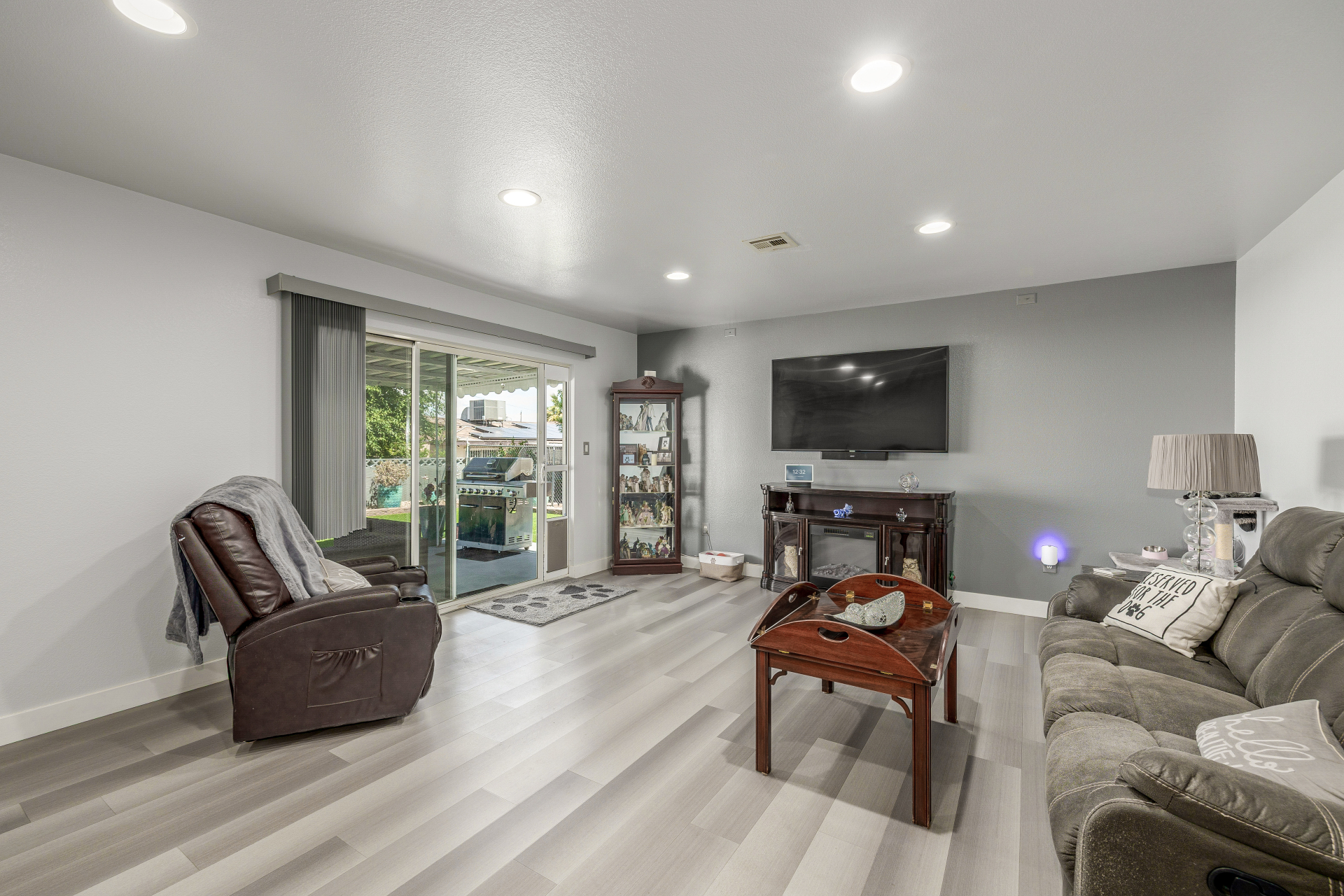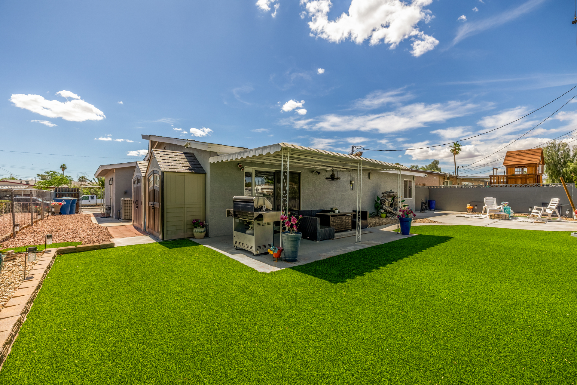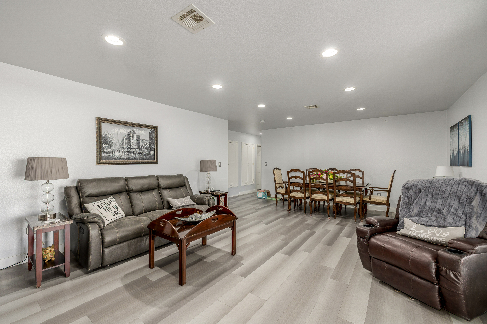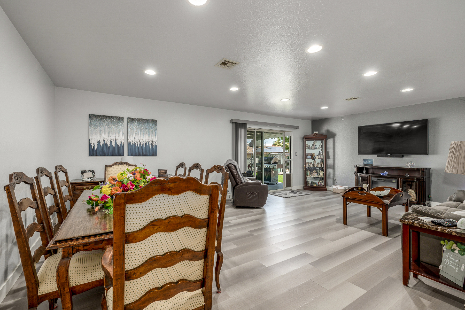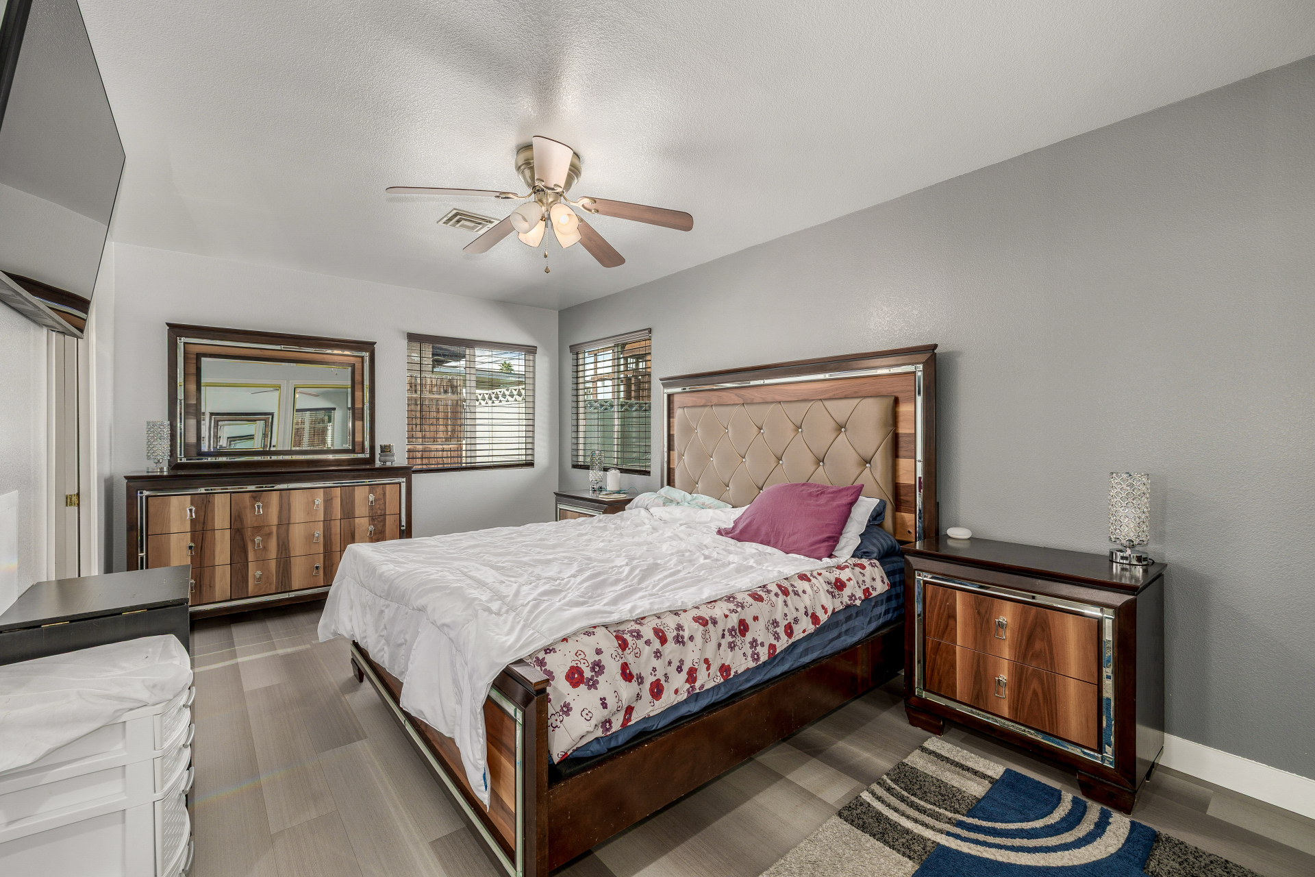 Discover the charm of this inviting 4-bed, 2-bath home in Las Vegas! Starting with a front porch, low-care landscape, carport parking, and an extended driveway. The welcoming interior showcases a neutral palette, abundant natural light, recessed lighting, and premium waterproof, scratch-resistant flooring. You'll love the seamlessly flowing living and dining room with sliding doors to the back, perfect for entertaining! The impressive kitchen boasts stainless steel appliances, quartz counters & backsplash, ample wood cabinetry, and a breakfast area. The primary bedroom has two closets with mirror sliding doors and a private bathroom with a walk-in tub. If you want to relax or enjoy BBQ, the backyard awaits! Featuring a covered patio, artificial turf, two storage sheds, and an ideal spot for cozying up around a fire pit. Location-wise, it's a gem! Conveniently close to schools, shopping, dining options, parks, highways, and much more. Don't miss this excellent opportunity!