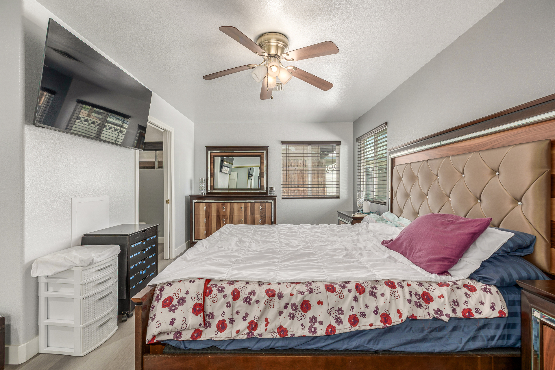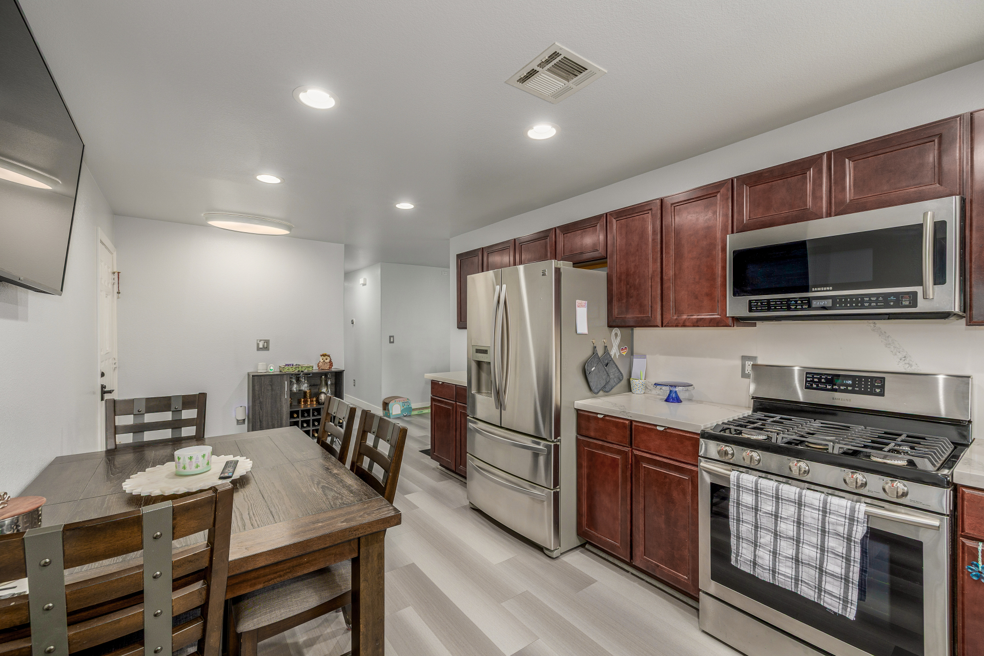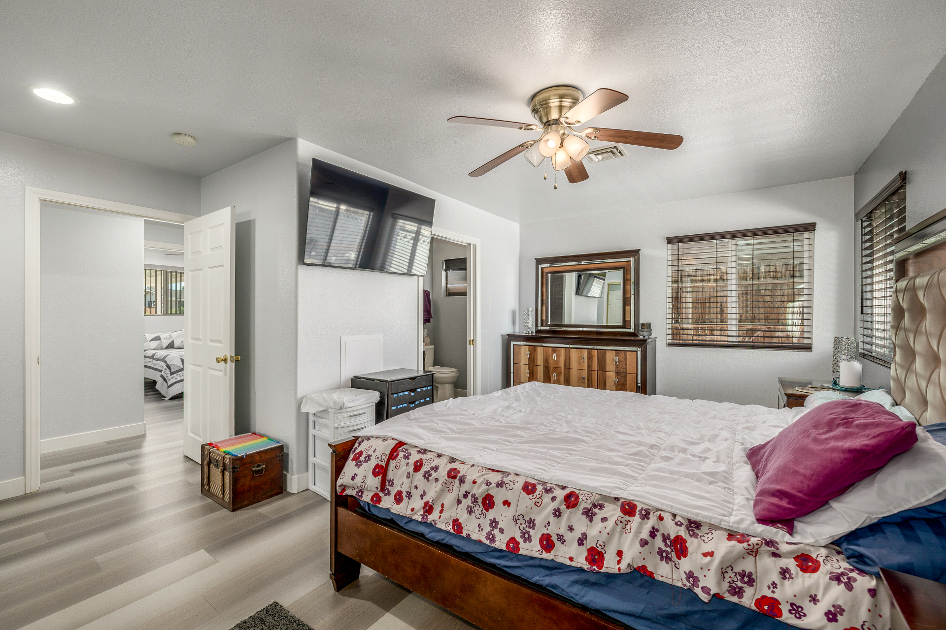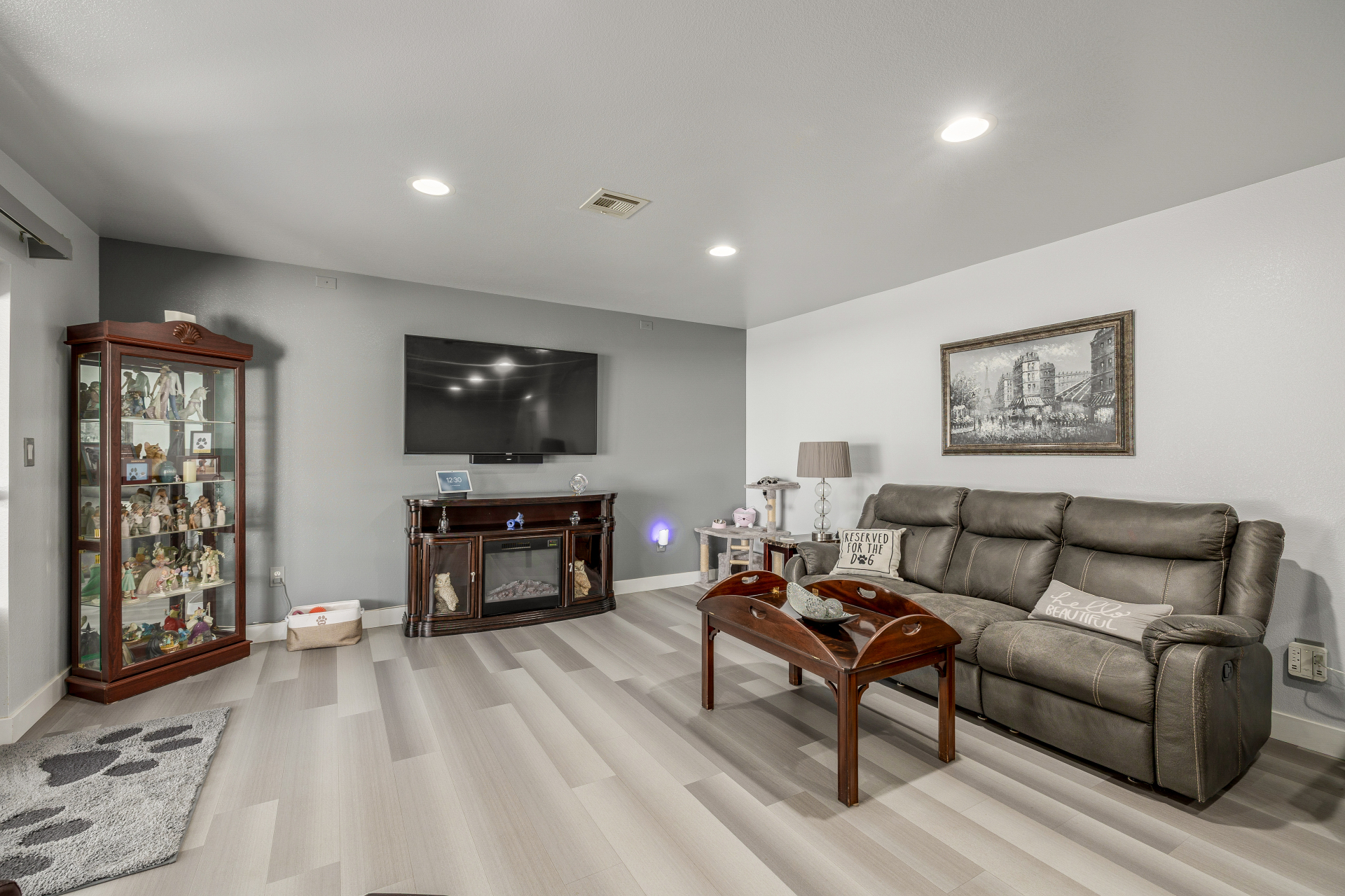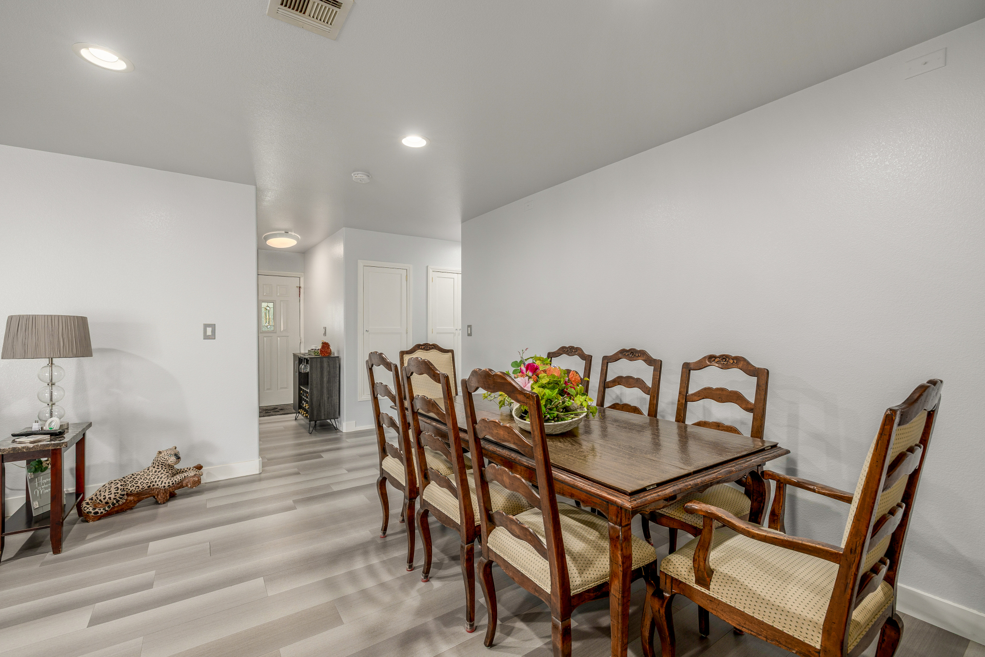Discover the charm of this inviting 4-bed, 2-bath home in Las Vegas! Starting with a front porch, low-care landscape, carport parking, and an extended driveway. The welcoming interior showcases a neutral palette, abundant natural light, recessed lighting, and premium waterproof, scratch-resistant flooring. You'll love the seamlessly flowing living and dining room with sliding doors to the back, perfect for entertaining! The impressive kitchen boasts stainless steel appliances, quartz counters & backsplash, ample wood cabinetry, and a breakfast area. The primary bedroom has two closets with mirror sliding doors and a private bathroom with a walk-in tub. If you want to relax or enjoy BBQ, the backyard awaits! Featuring a covered patio, artificial turf, two storage sheds, and an ideal spot for cozying up around a fire pit. Location-wise, it's a gem! Conveniently close to schools, shopping, dining options, parks, highways, and much more. Don't miss this excellent opportunity!