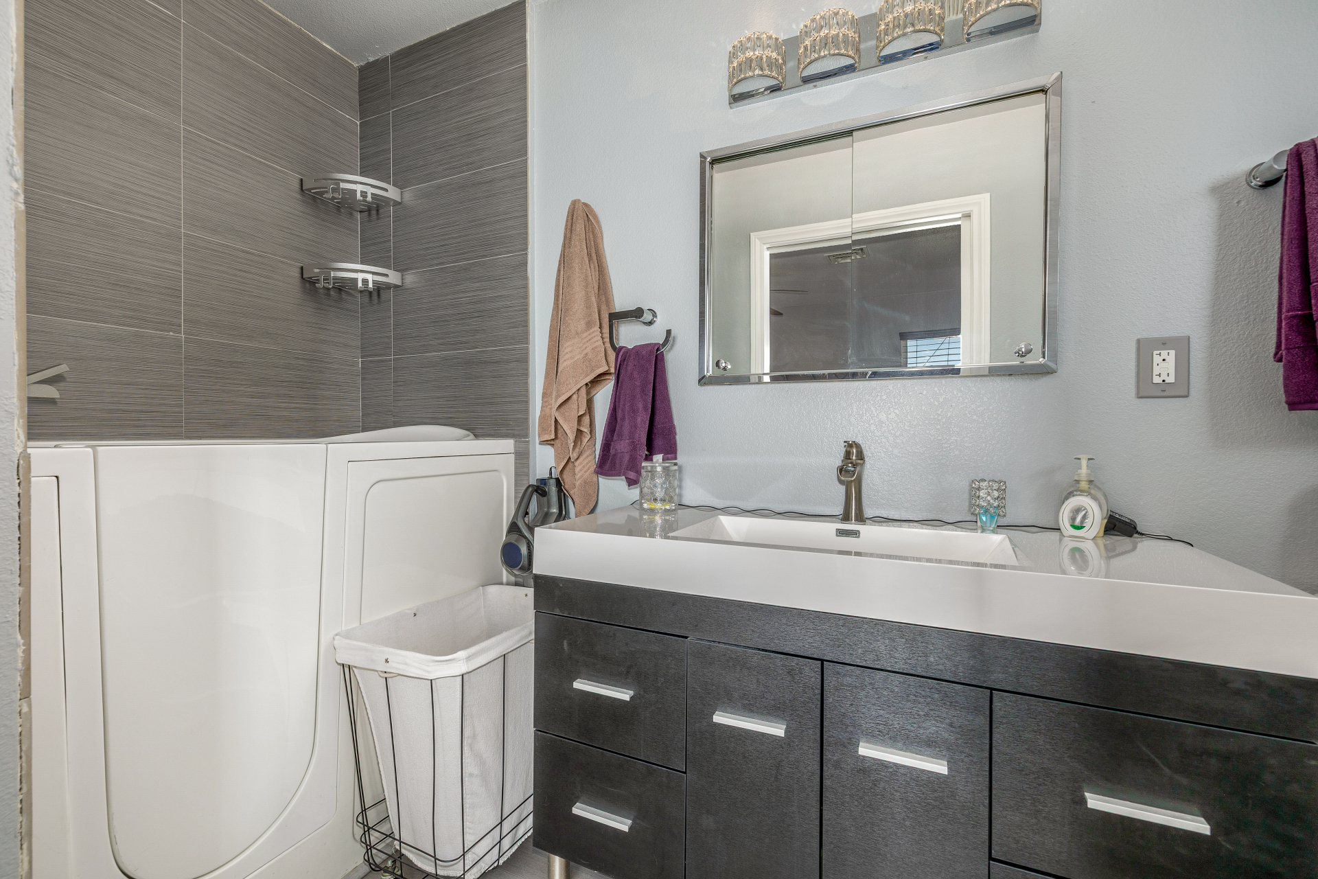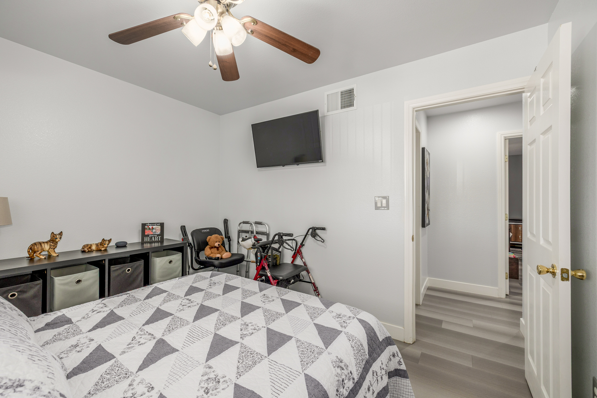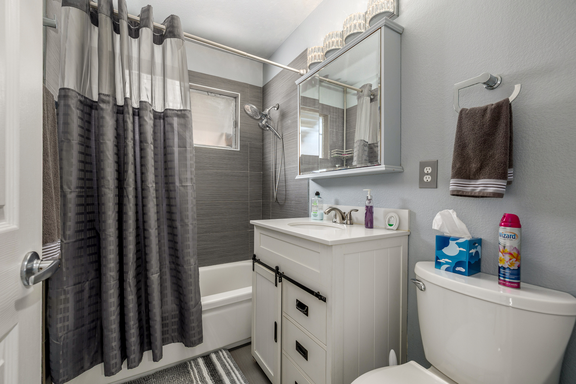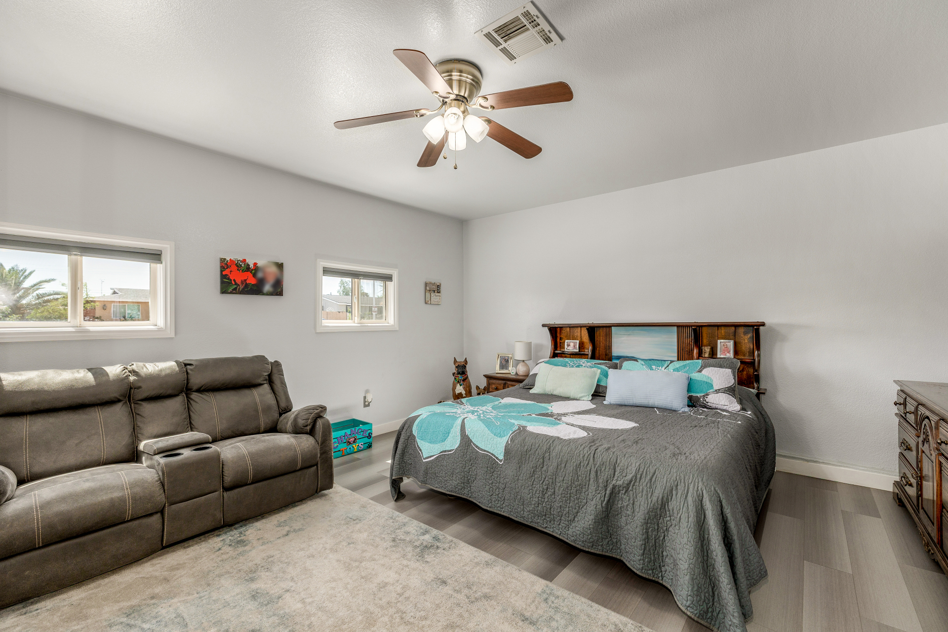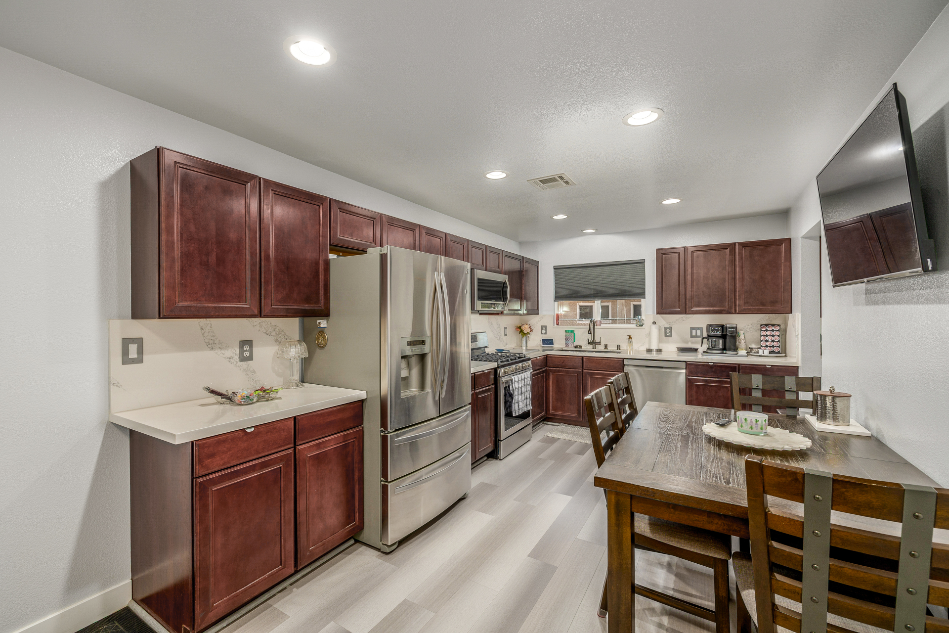 Discover the charm of this inviting 4-bed, 2-bath home in Las Vegas! Starting with a front porch, low-care landscape, carport parking, and an extended driveway. The welcoming interior showcases a neutral palette, abundant natural light, recessed lighting, and premium waterproof, scratch-resistant flooring. You'll love the seamlessly flowing living and dining room with sliding doors to the back, perfect for entertaining! The impressive kitchen boasts stainless steel appliances, quartz counters & backsplash, ample wood cabinetry, and a breakfast area. The primary bedroom has two closets with mirror sliding doors and a private bathroom with a walk-in tub. If you want to relax or enjoy BBQ, the backyard awaits! Featuring a covered patio, artificial turf, two storage sheds, and an ideal spot for cozying up around a fire pit. Location-wise, it's a gem! Conveniently close to schools, shopping, dining options, parks, highways, and much more. Don't miss this excellent opportunity!