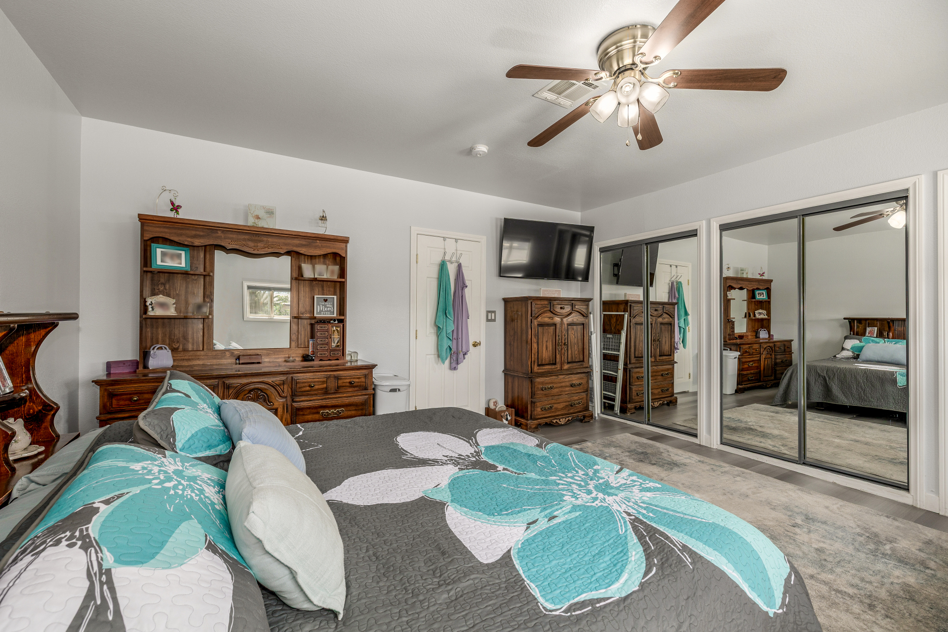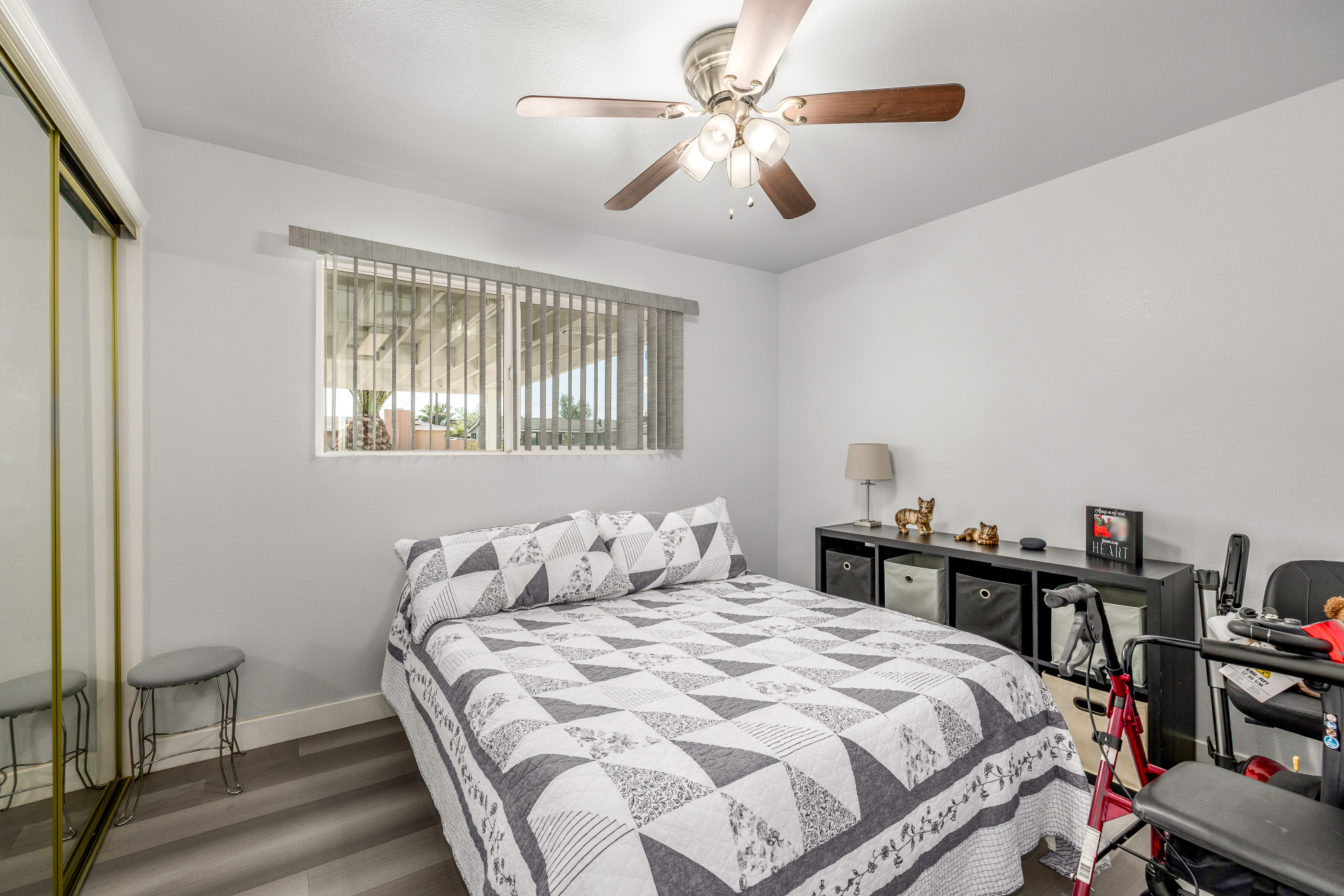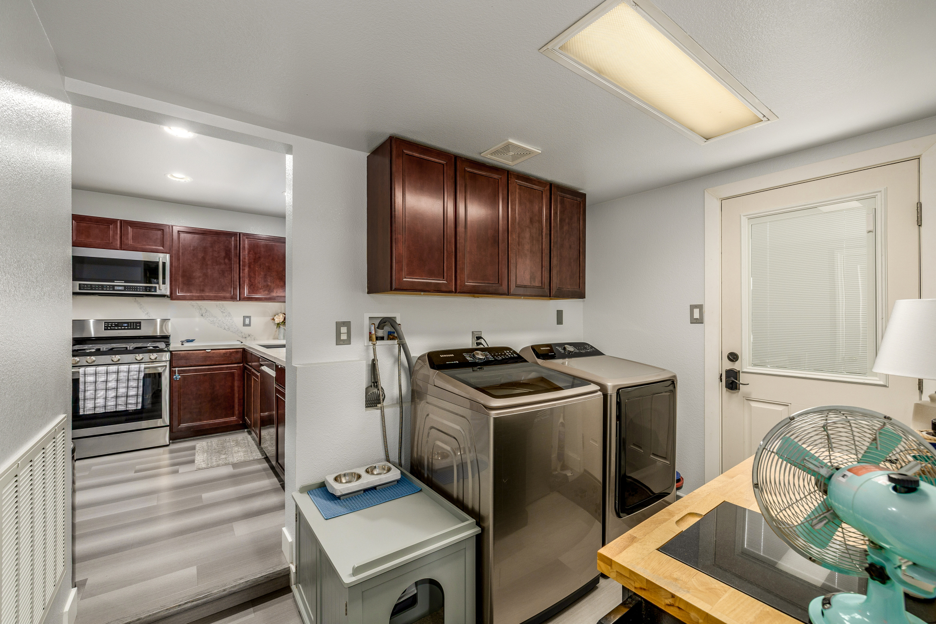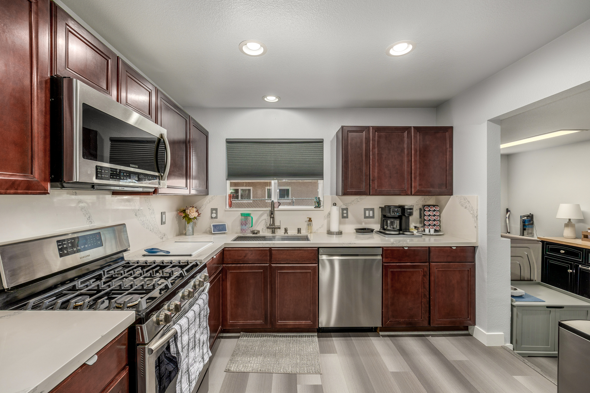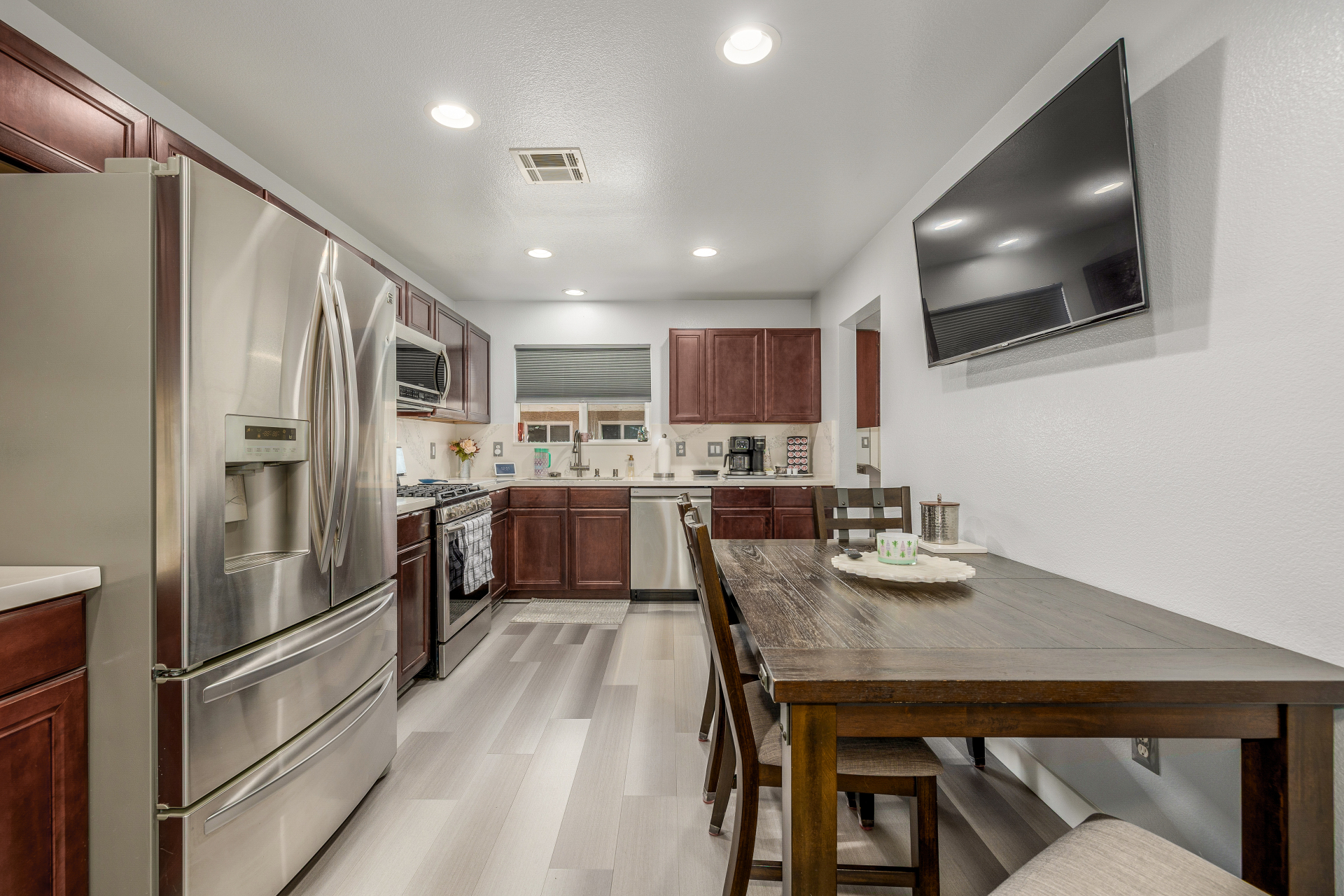 Discover the charm of this inviting 4-bed, 2-bath home in Las Vegas! Starting with a front porch, low-care landscape, carport parking, and an extended driveway. The welcoming interior showcases a neutral palette, abundant natural light, recessed lighting, and premium waterproof, scratch-resistant flooring. You'll love the seamlessly flowing living and dining room with sliding doors to the back, perfect for entertaining! The impressive kitchen boasts stainless steel appliances, quartz counters & backsplash, ample wood cabinetry, and a breakfast area. The primary bedroom has two closets with mirror sliding doors and a private bathroom with a walk-in tub. If you want to relax or enjoy BBQ, the backyard awaits! Featuring a covered patio, artificial turf, two storage sheds, and an ideal spot for cozying up around a fire pit. Location-wise, it's a gem! Conveniently close to schools, shopping, dining options, parks, highways, and much more. Don't miss this excellent opportunity!