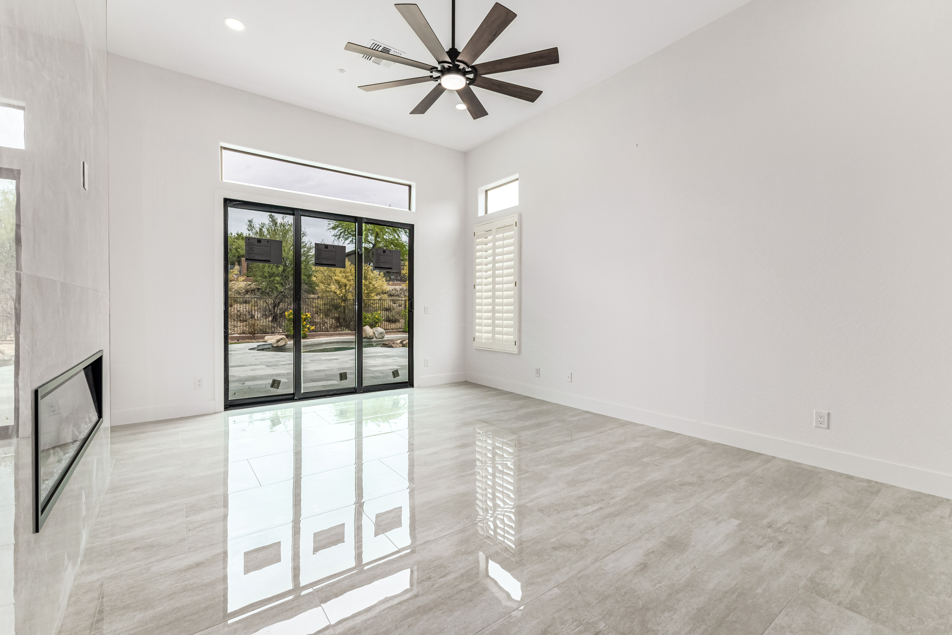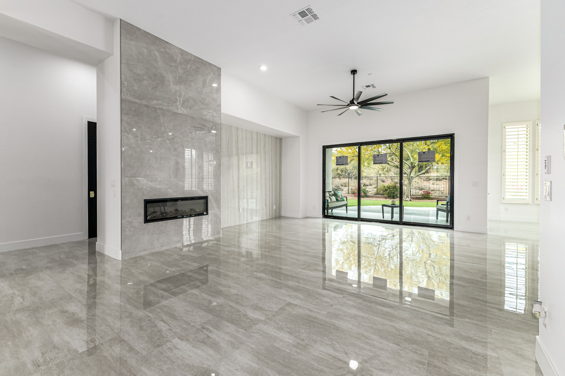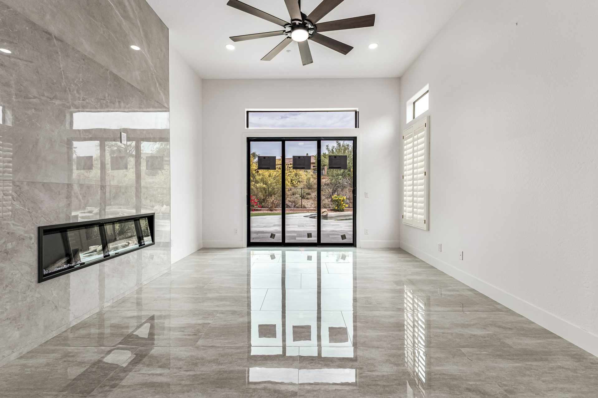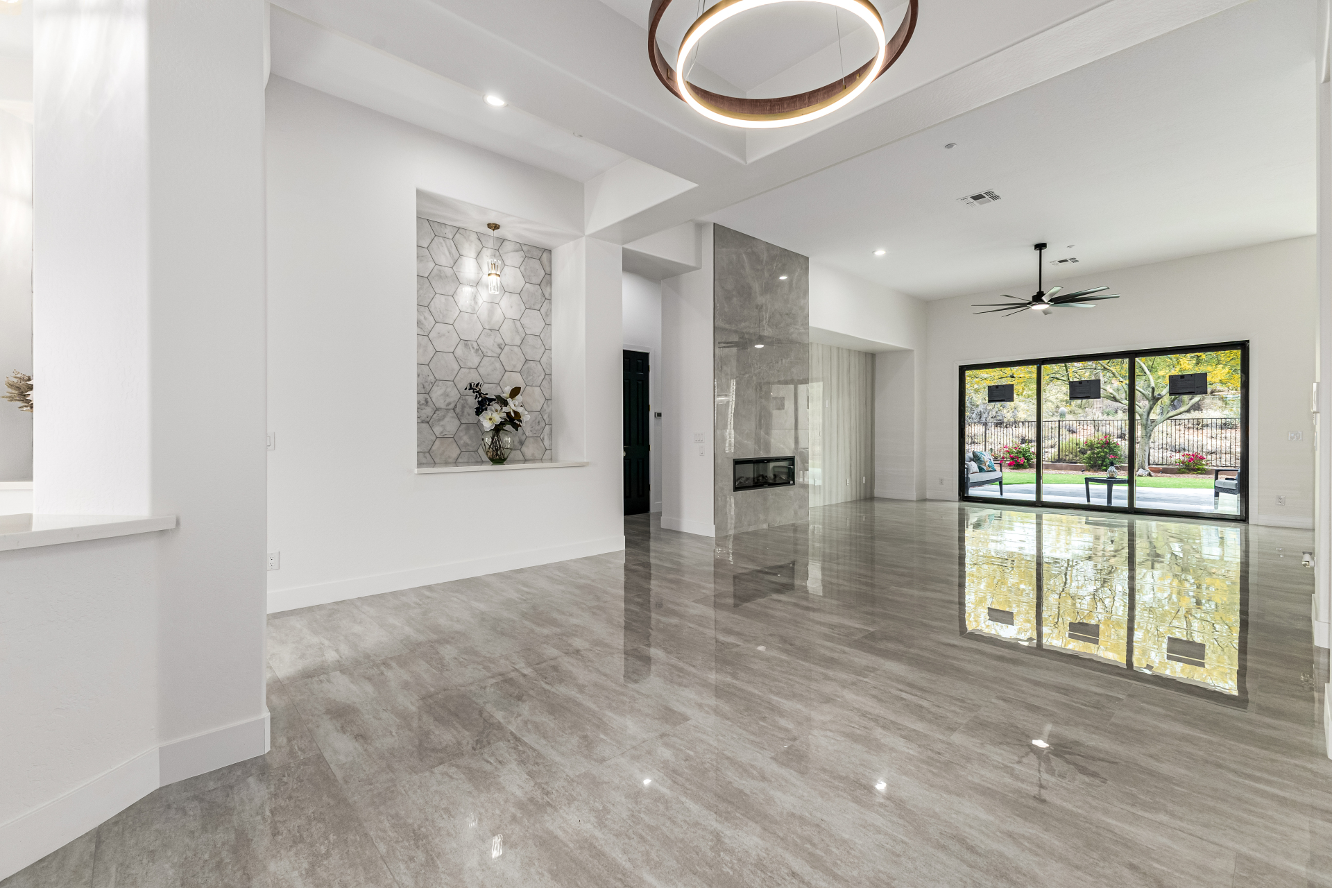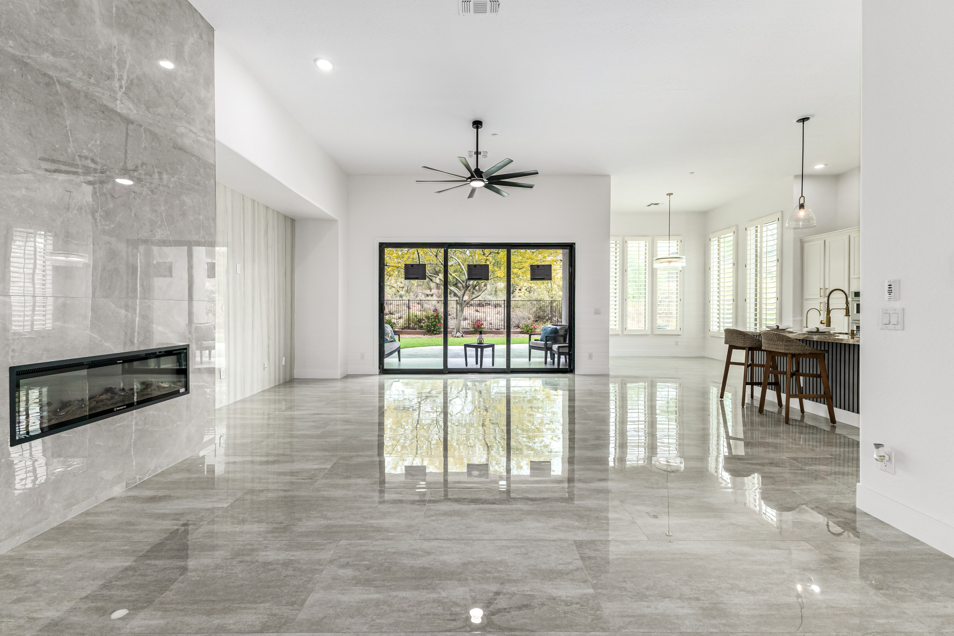 Completely renovated with exceptional, high-end upgrades, this stunning home offers a sleek contemporary design with an open, split floor-plan ideal for modern living. Porcelain tile flooring flows throughout, complemented by a striking stone porcelain accent wall and two elegant electric fireplaces. The chef's kitchen features granite countertops, while the spa-inspired bathrooms showcase marble vanities with a clean, modern aesthetic. A well-appointed laundry room includes a sink and stacked washer and dryer. The garage is upgraded with an epoxy floor and powerful LED lighting. Step outside to a refreshing natural view and natural stone tile backyard refreshing pool—perfect for enjoying hot summer days in style.