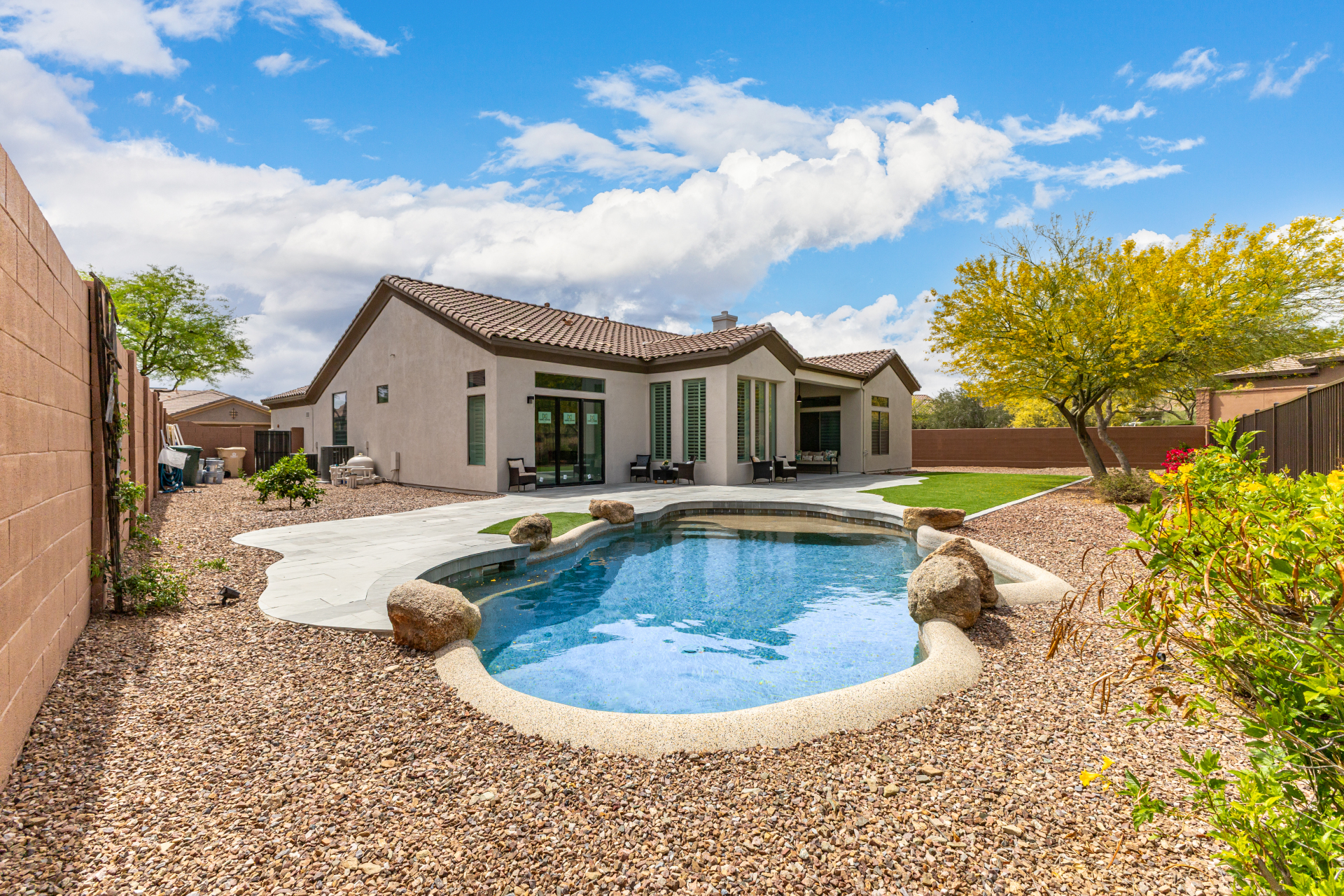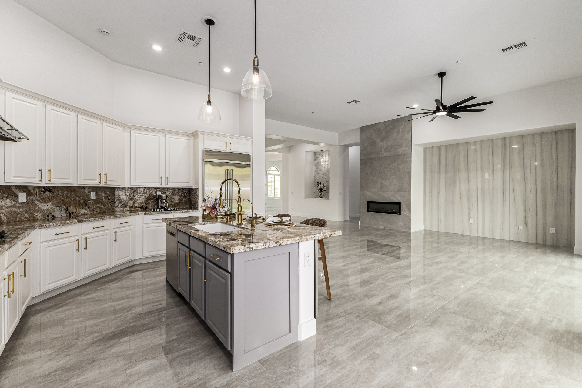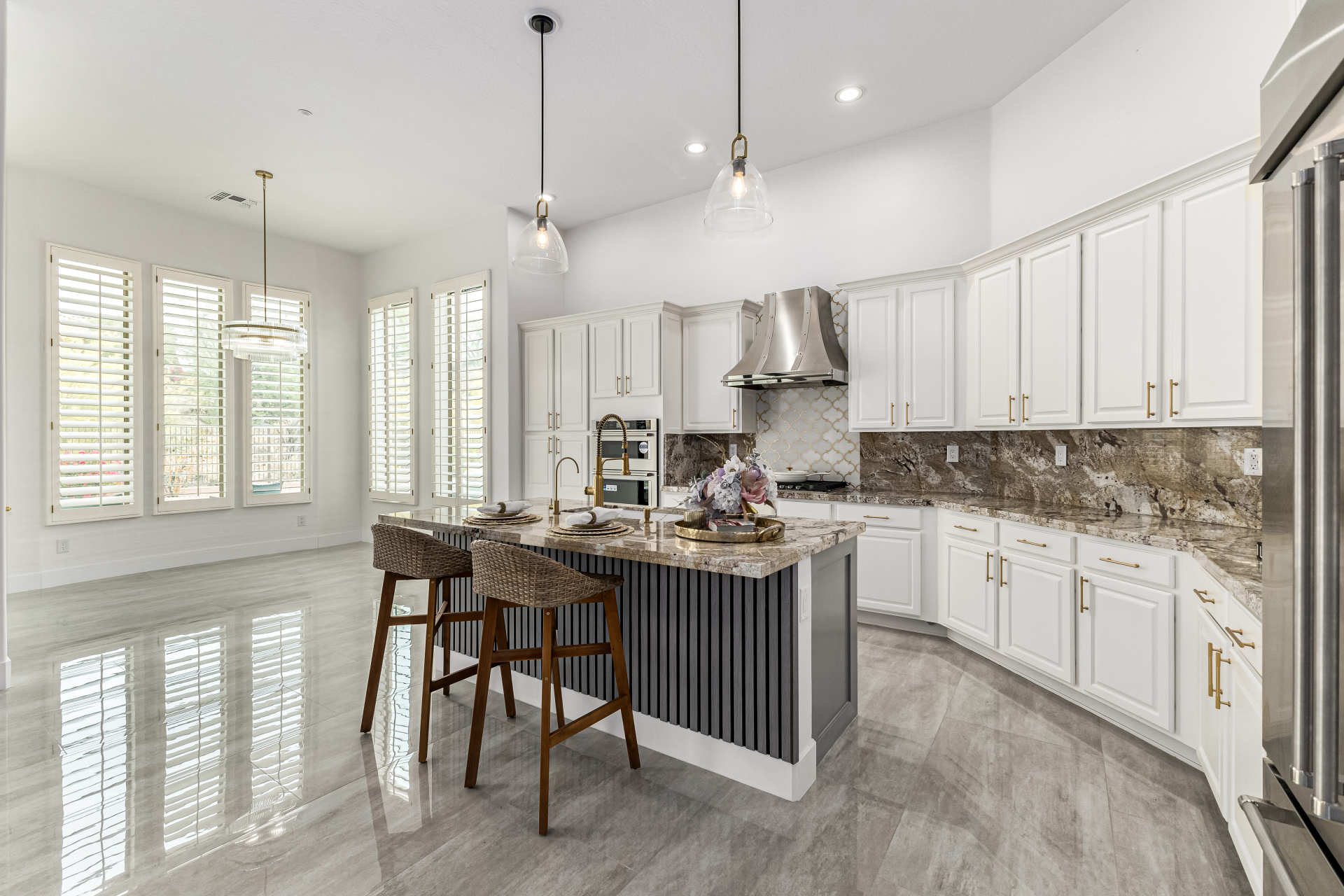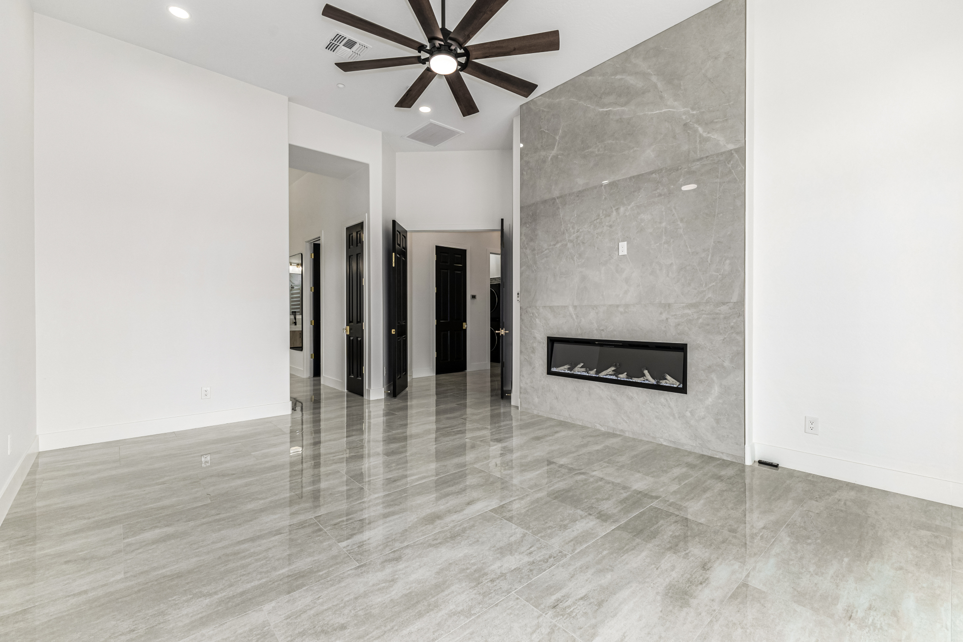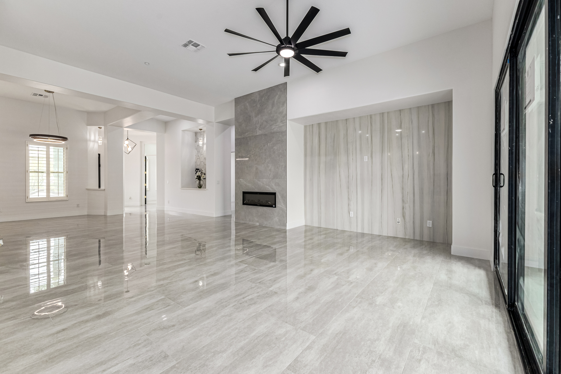 Completely renovated with exceptional, high-end upgrades, this stunning home offers a sleek contemporary design with an open, split floor-plan ideal for modern living. Porcelain tile flooring flows throughout, complemented by a striking stone porcelain accent wall and two elegant electric fireplaces. The chef's kitchen features granite countertops, while the spa-inspired bathrooms showcase marble vanities with a clean, modern aesthetic. A well-appointed laundry room includes a sink and stacked washer and dryer. The garage is upgraded with an epoxy floor and powerful LED lighting. Step outside to a refreshing natural view and natural stone tile backyard refreshing pool—perfect for enjoying hot summer days in style.