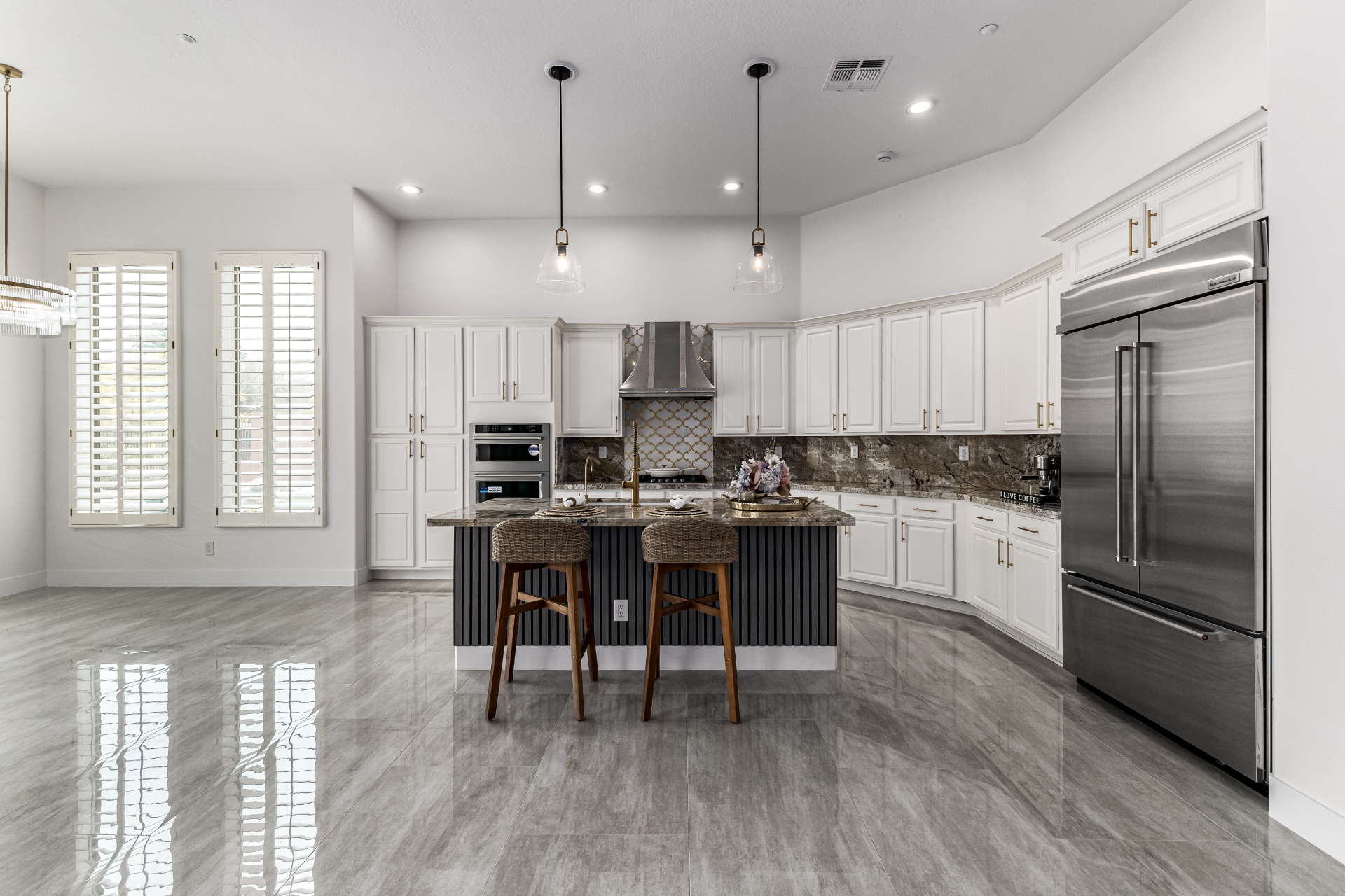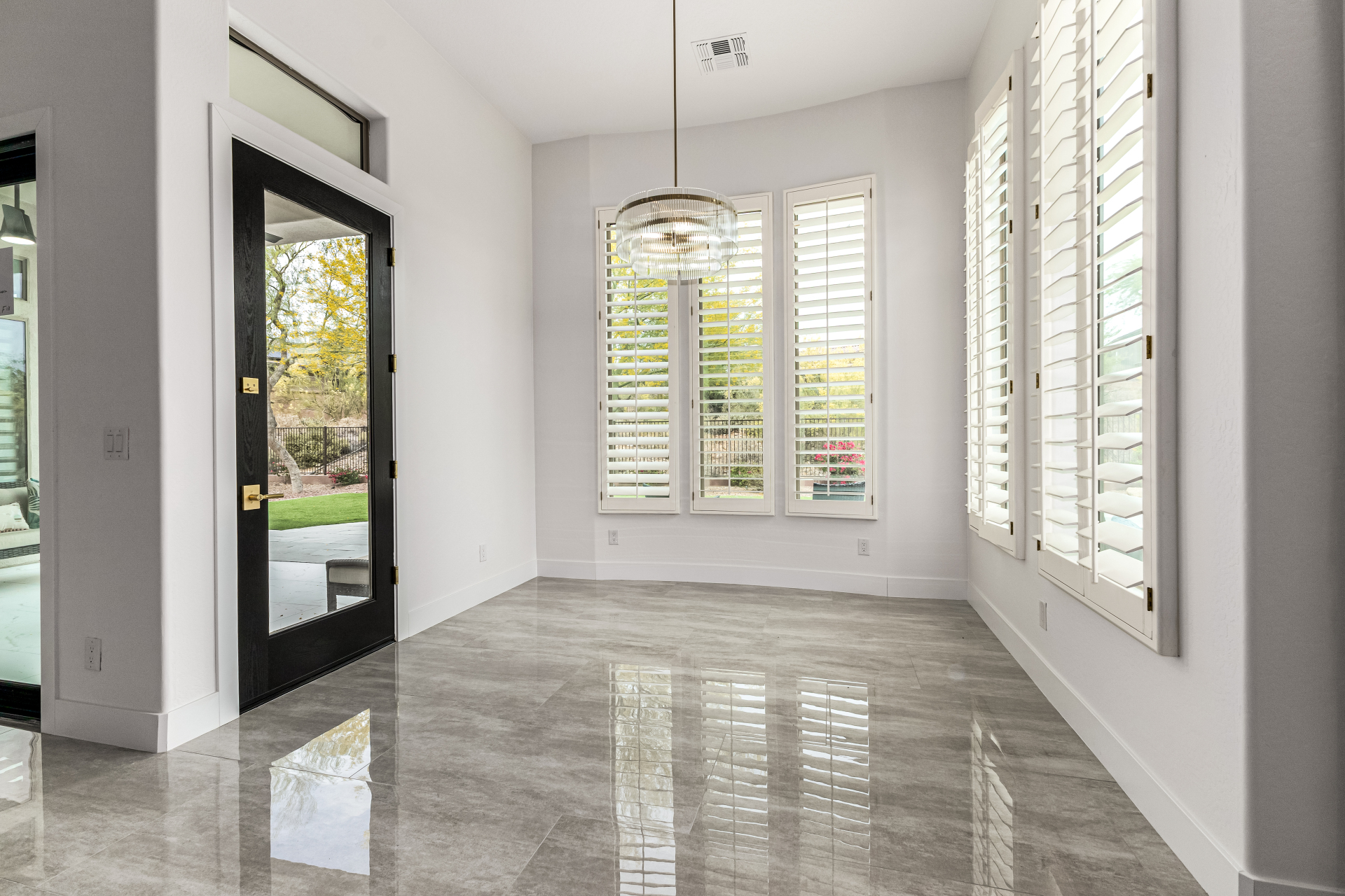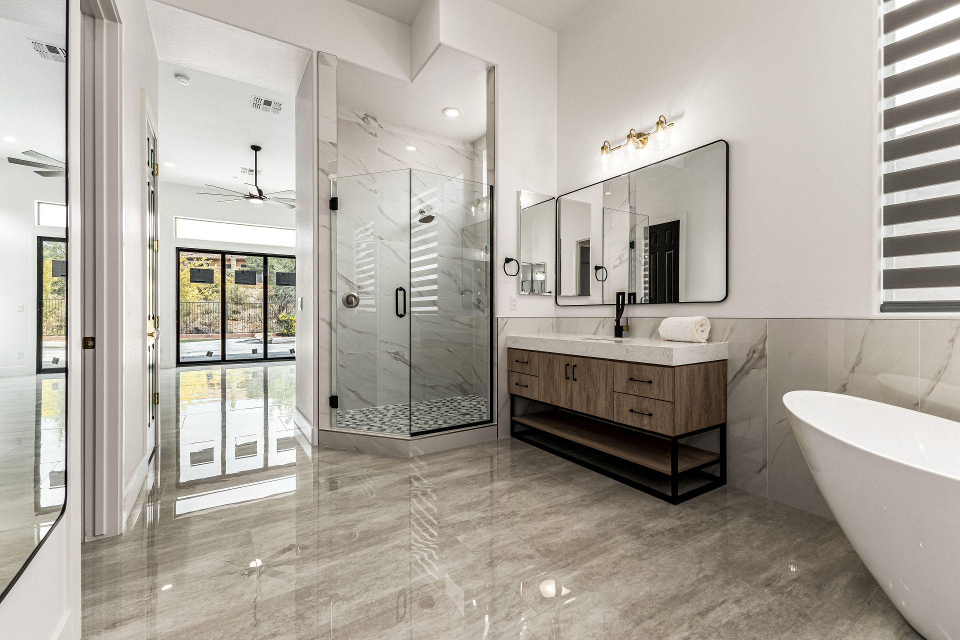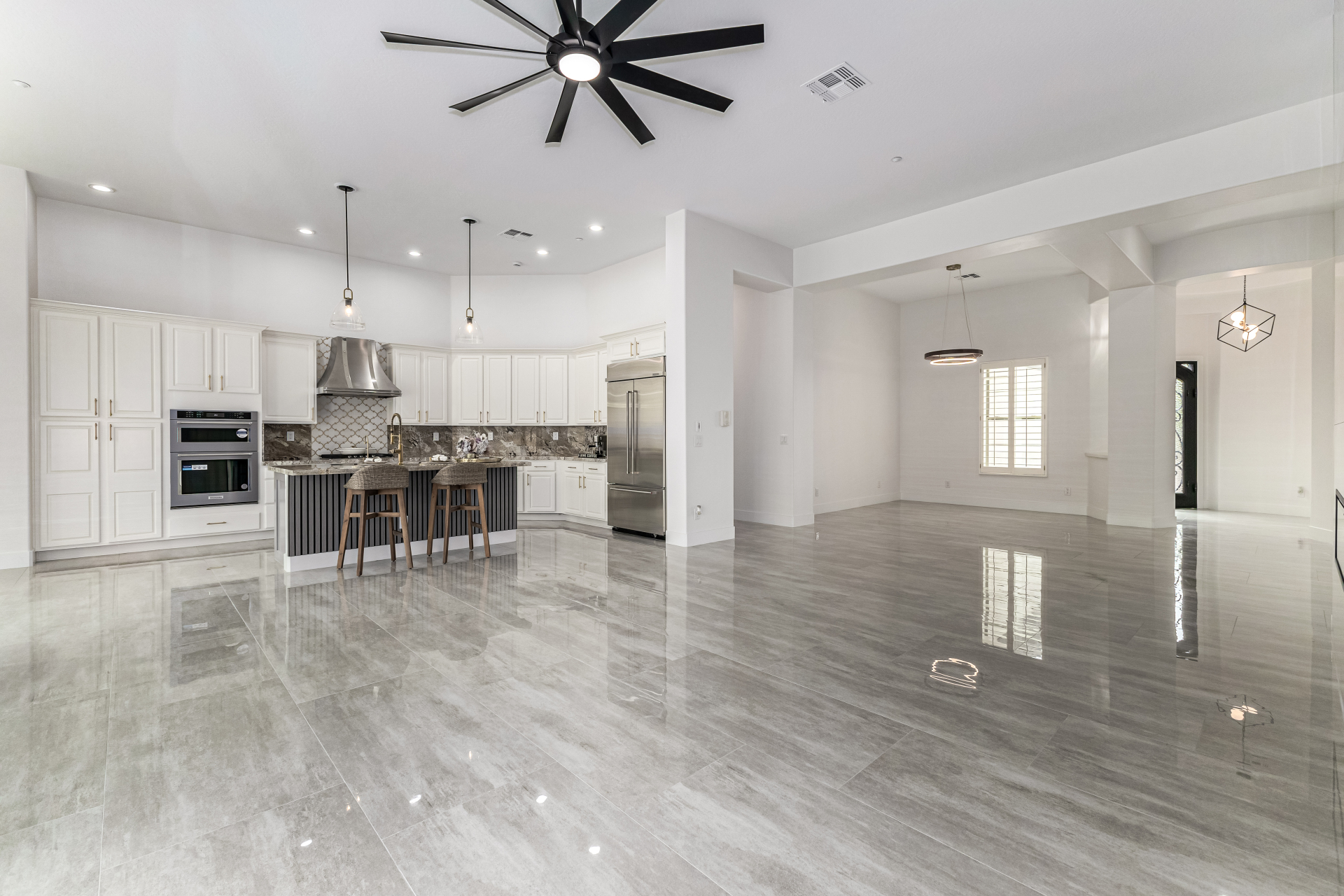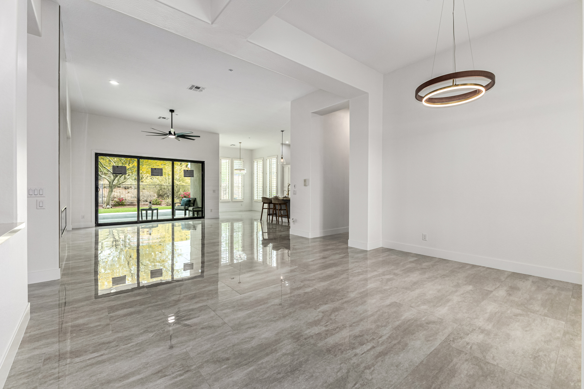 Completely renovated with exceptional, high-end upgrades, this stunning home offers a sleek contemporary design with an open, split floor-plan ideal for modern living. Porcelain tile flooring flows throughout, complemented by a striking stone porcelain accent wall and two elegant electric fireplaces. The chef's kitchen features granite countertops, while the spa-inspired bathrooms showcase marble vanities with a clean, modern aesthetic. A well-appointed laundry room includes a sink and stacked washer and dryer. The garage is upgraded with an epoxy floor and powerful LED lighting. Step outside to a refreshing natural view and natural stone tile backyard refreshing pool—perfect for enjoying hot summer days in style.