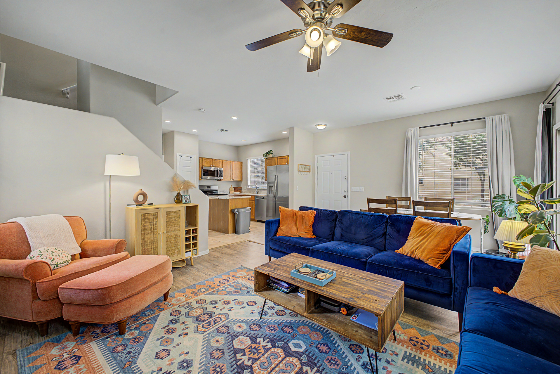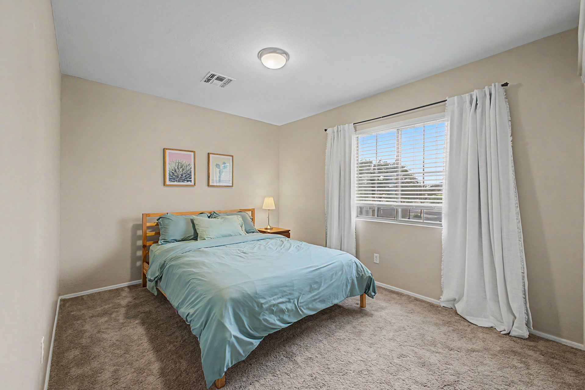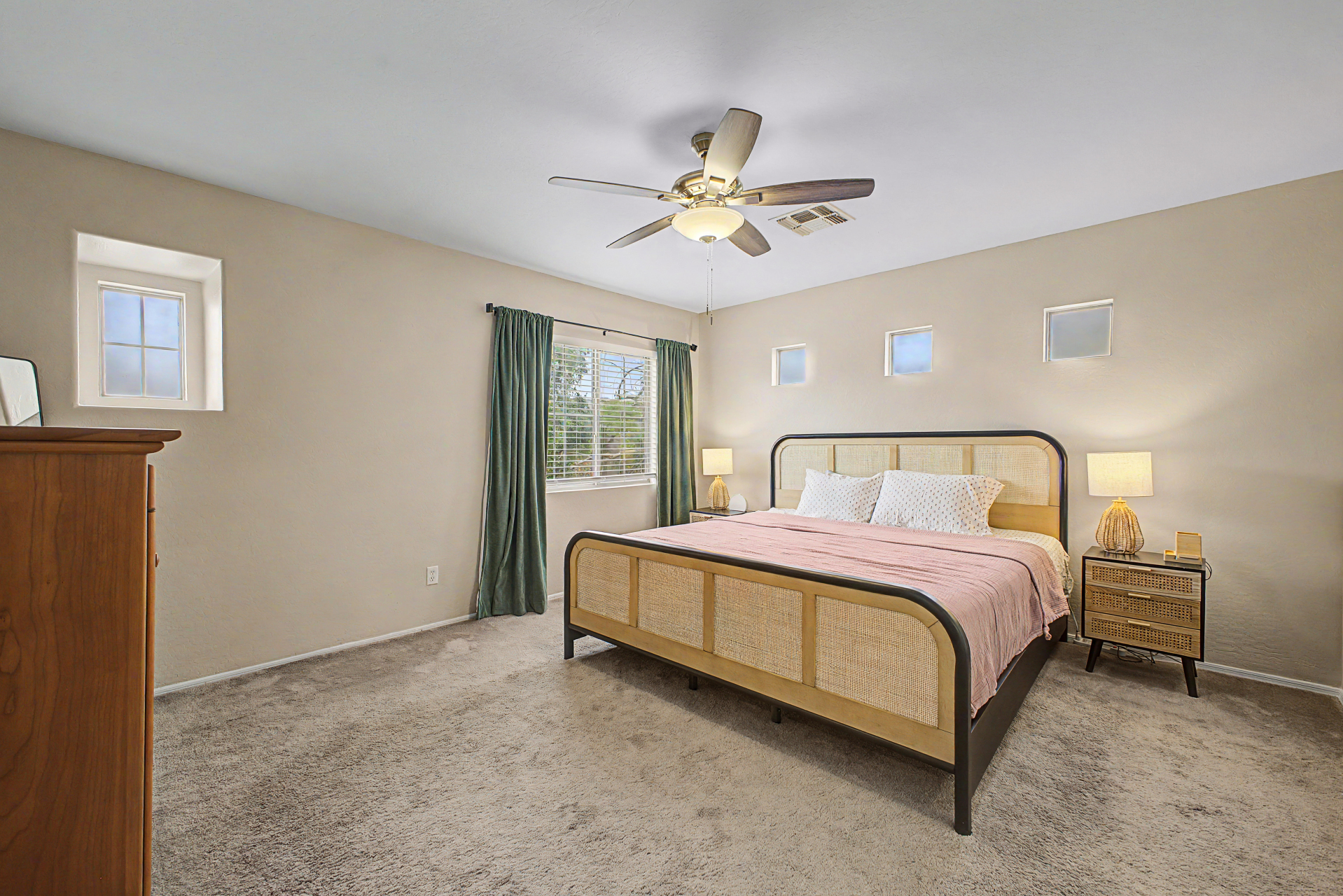 Fantastic opportunity to own this lovely residence in Casa Del Rockridge! Inside, you're welcomed by an appealing open layout with high ceilings, a contemporary palette, blinds, and stylish wood-look flooring. The gourmet kitchen comes with granite counters, ample wood cabinetry, recessed lighting, stainless steel appliances, a pantry, and an island with a breakfast bar for quick meals. Upstairs, the cozy loft provides a versatile living space ideal for a lounge or reading nook. The tranquil primary bedroom features soft carpeting, a private bathroom, and a convenient walk-in closet for an organized wardrobe. Unwind in the backyard, which offers an open patio, travertine pavers, and pristine artificial turf for outdoor activities. Don't miss out on this charming property!