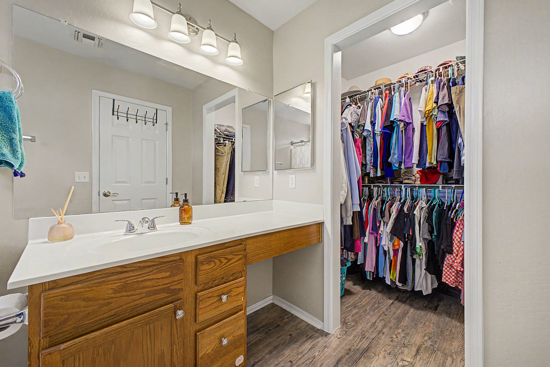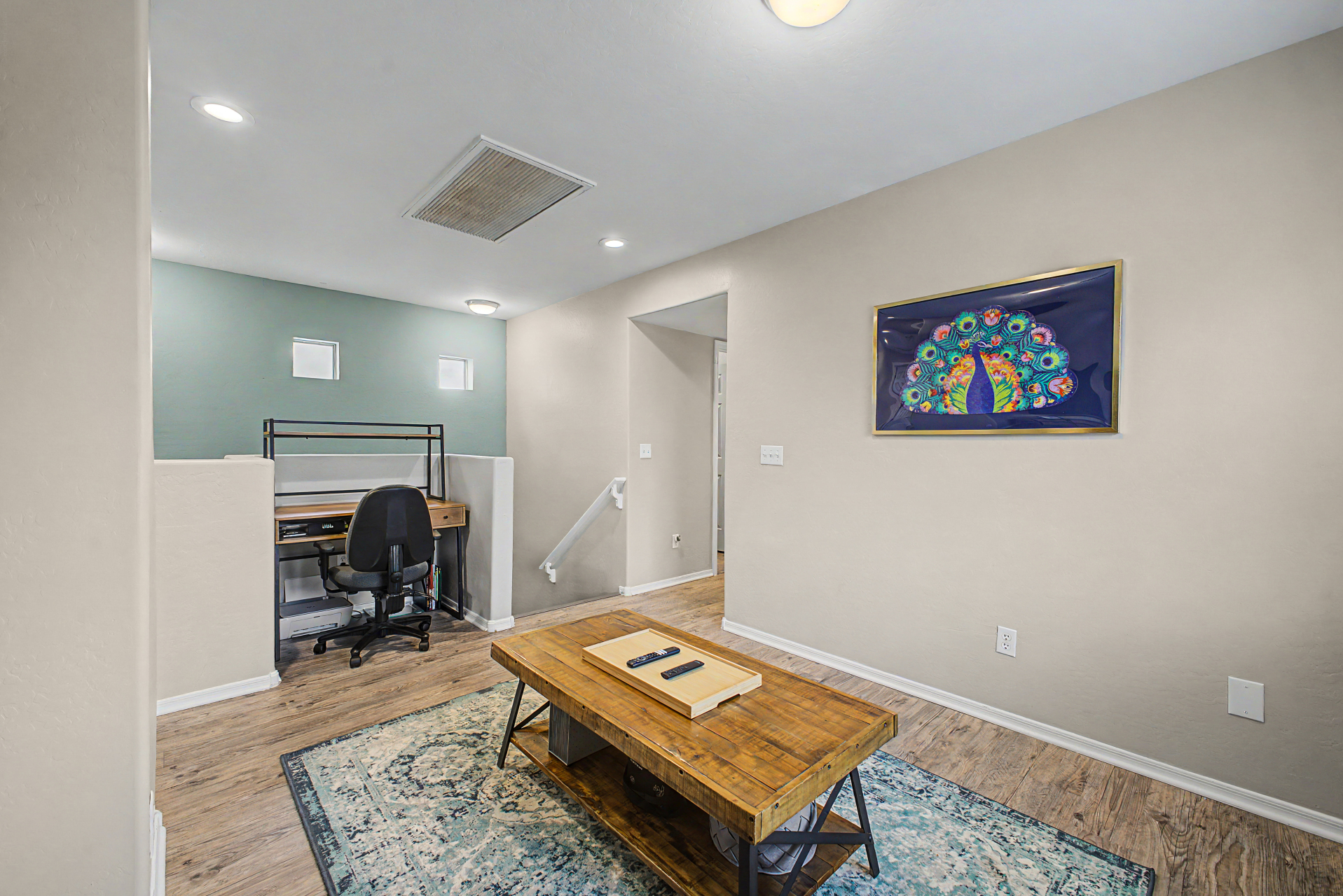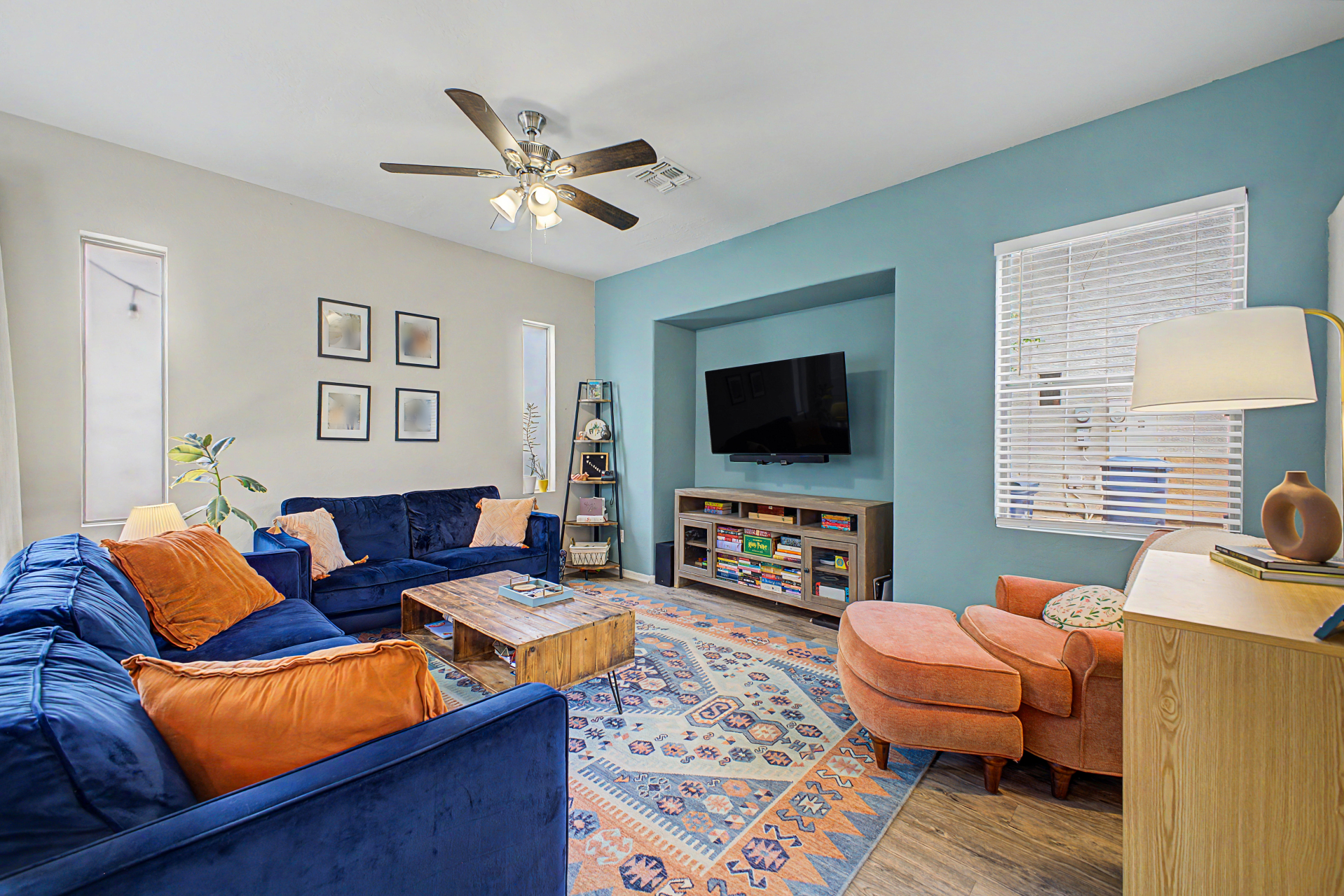 Fantastic opportunity to own this lovely residence in Casa Del Rockridge! Inside, you're welcomed by an appealing open layout with high ceilings, a contemporary palette, blinds, and stylish wood-look flooring. The gourmet kitchen comes with granite counters, ample wood cabinetry, recessed lighting, stainless steel appliances, a pantry, and an island with a breakfast bar for quick meals. Upstairs, the cozy loft provides a versatile living space ideal for a lounge or reading nook. The tranquil primary bedroom features soft carpeting, a private bathroom, and a convenient walk-in closet for an organized wardrobe. Unwind in the backyard, which offers an open patio, travertine pavers, and pristine artificial turf for outdoor activities. Don't miss out on this charming property!