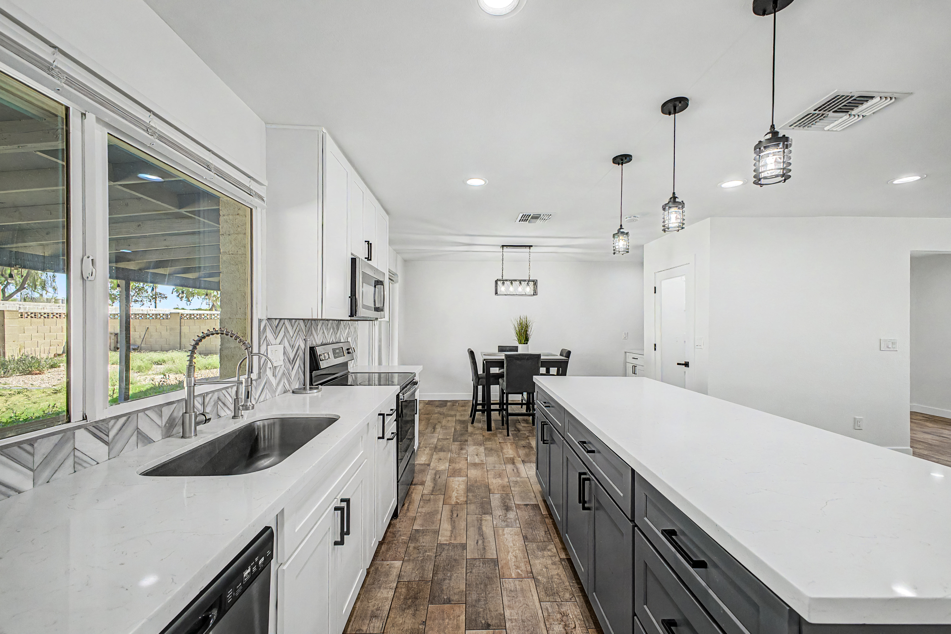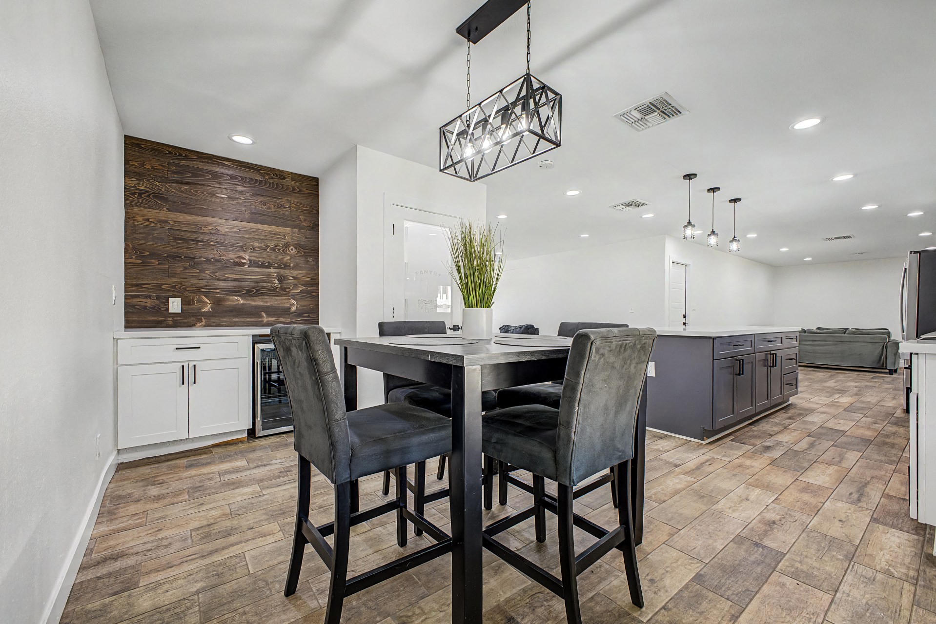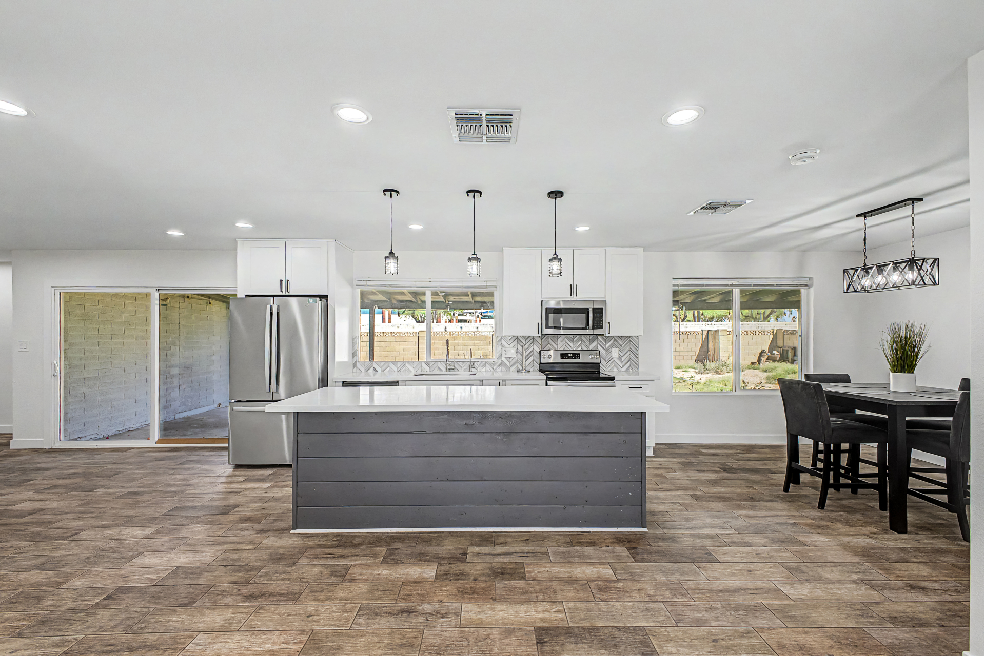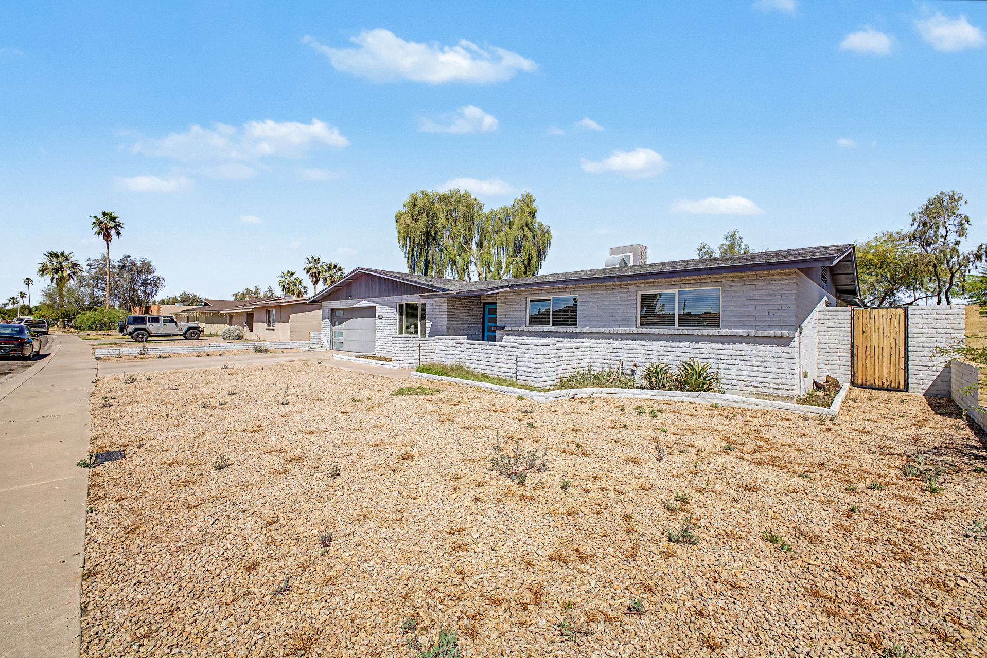 BEAUTIFULLY UPDATED home in Tempe, ready to move in! Offering 4 beds, 2 baths, and a 2-car garage w/extended driveway. The interior boasts clean lines that promote a modern feel! Enhanced by a neutral palette, recessed lighting, chic light fixtures, tons of natural light, and wood-look tile flooring throughout. Spacious living & family rooms, perfect for entertaining! The impressive eat-in kitchen boasts SS appliances, quartz counters, designer tile backsplash, two-tone shaker cabinetry, a walk-in pantry, an island w/breakfast bar, and a dry bar w/wine cooler. The primary bedroom has outdoor access, two closets, and a private bathroom w/tiled shower. Secondary bedrooms with soft carpet. Check out the large backyard with a grassy area and a covered patio to relax or enjoy BBQ! Welcome home!