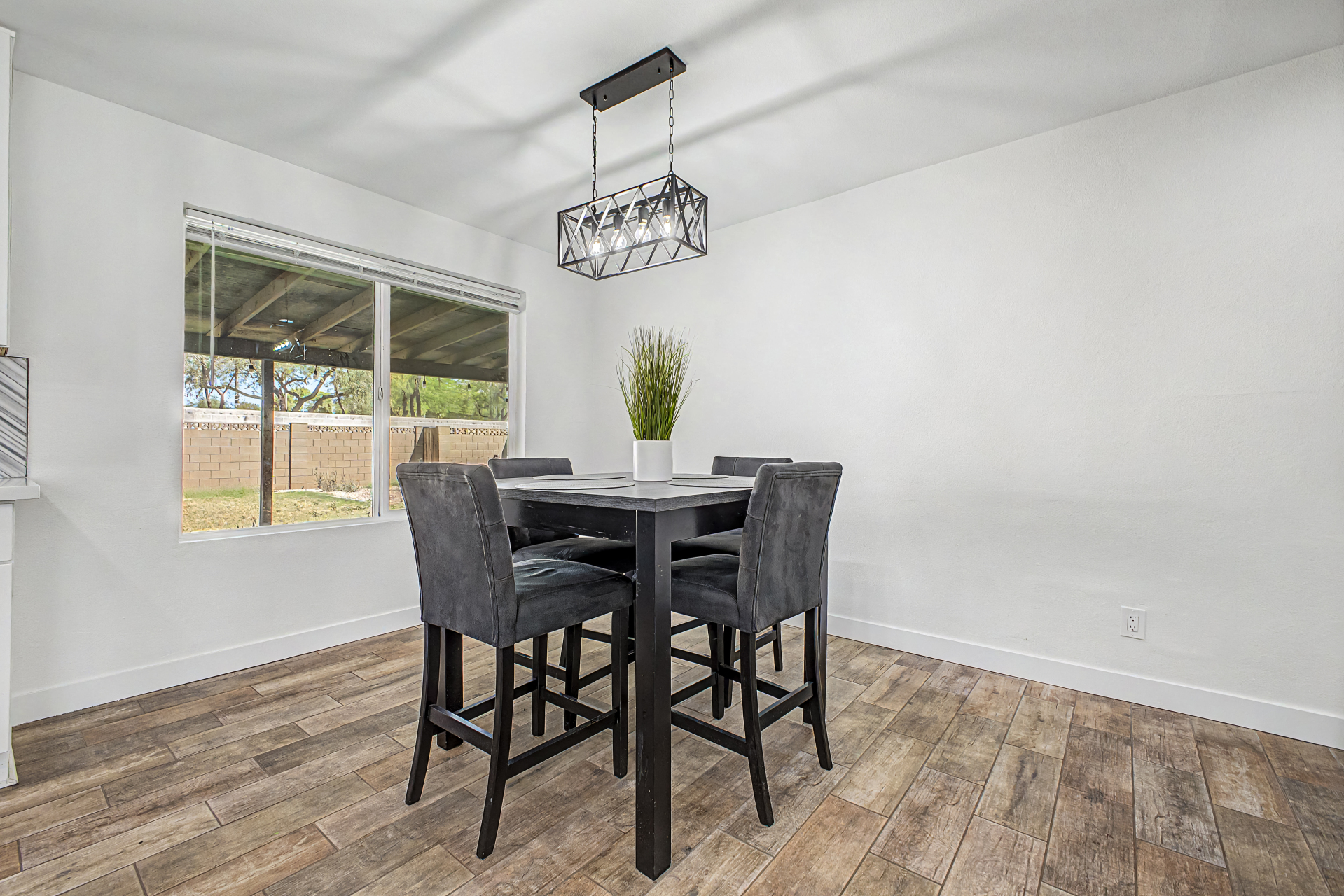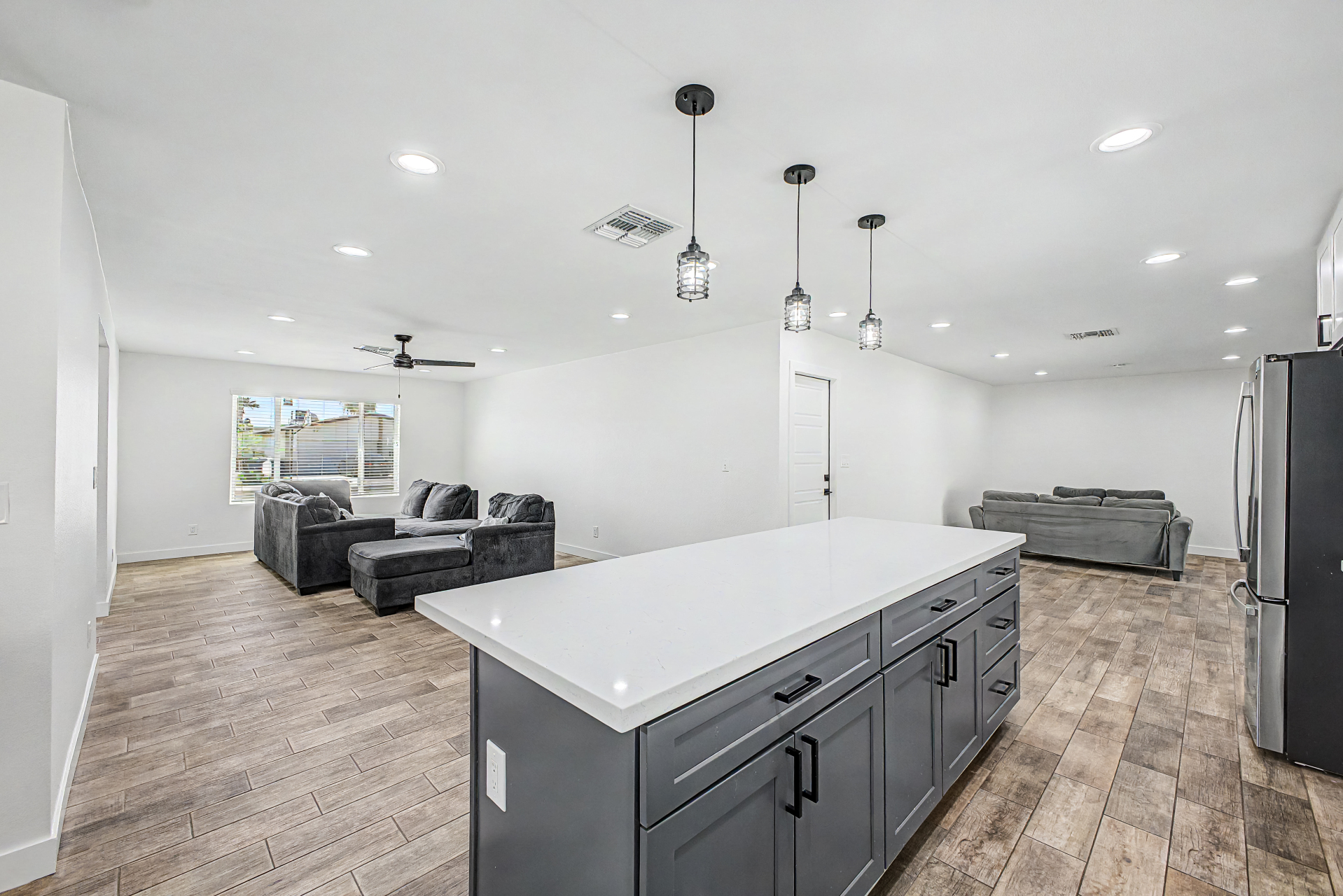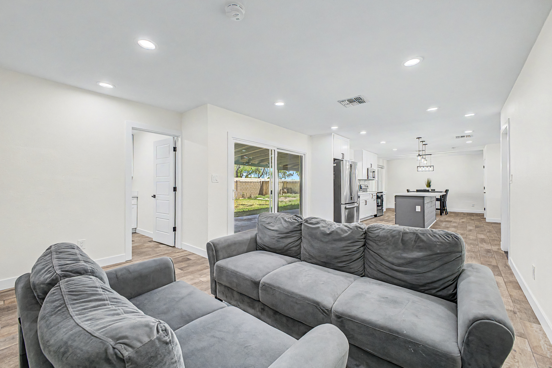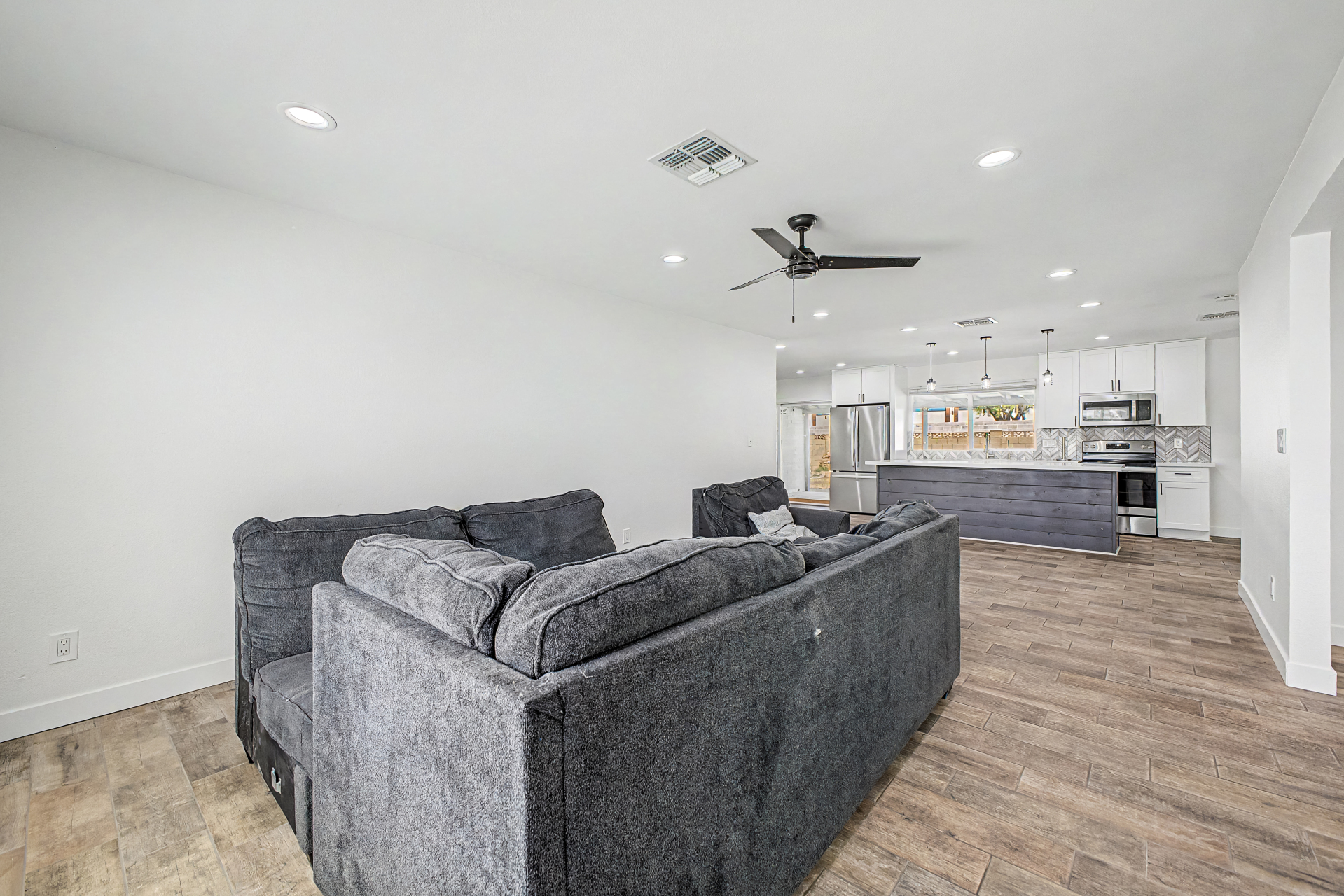 BEAUTIFULLY UPDATED home in Tempe, ready to move in! Offering 4 beds, 2 baths, and a 2-car garage w/extended driveway. The interior boasts clean lines that promote a modern feel! Enhanced by a neutral palette, recessed lighting, chic light fixtures, tons of natural light, and wood-look tile flooring throughout. Spacious living & family rooms, perfect for entertaining! The impressive eat-in kitchen boasts SS appliances, quartz counters, designer tile backsplash, two-tone shaker cabinetry, a walk-in pantry, an island w/breakfast bar, and a dry bar w/wine cooler. The primary bedroom has outdoor access, two closets, and a private bathroom w/tiled shower. Secondary bedrooms with soft carpet. Check out the large backyard with a grassy area and a covered patio to relax or enjoy BBQ! Welcome home!