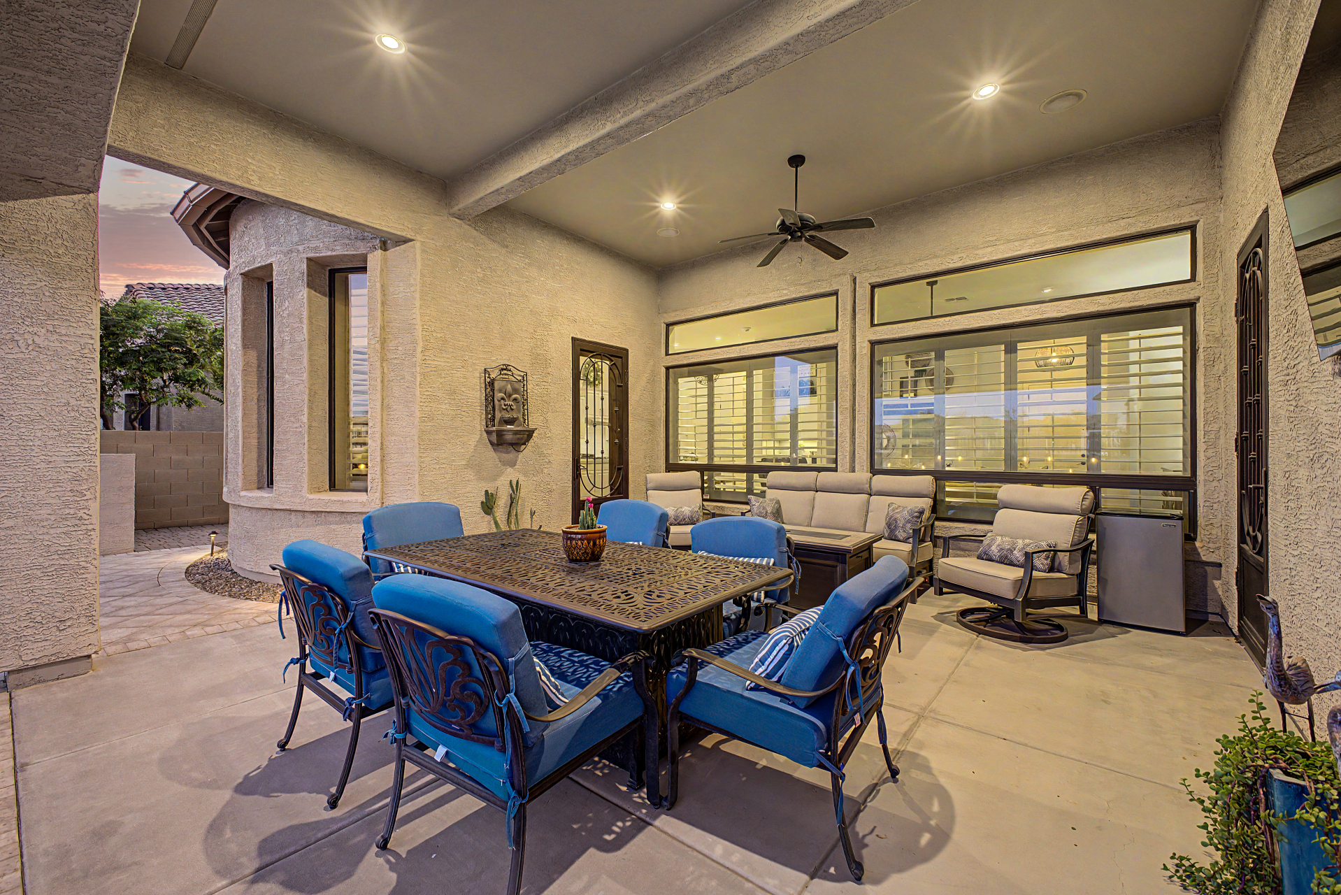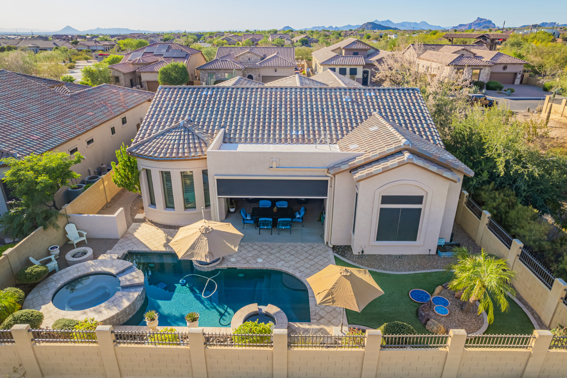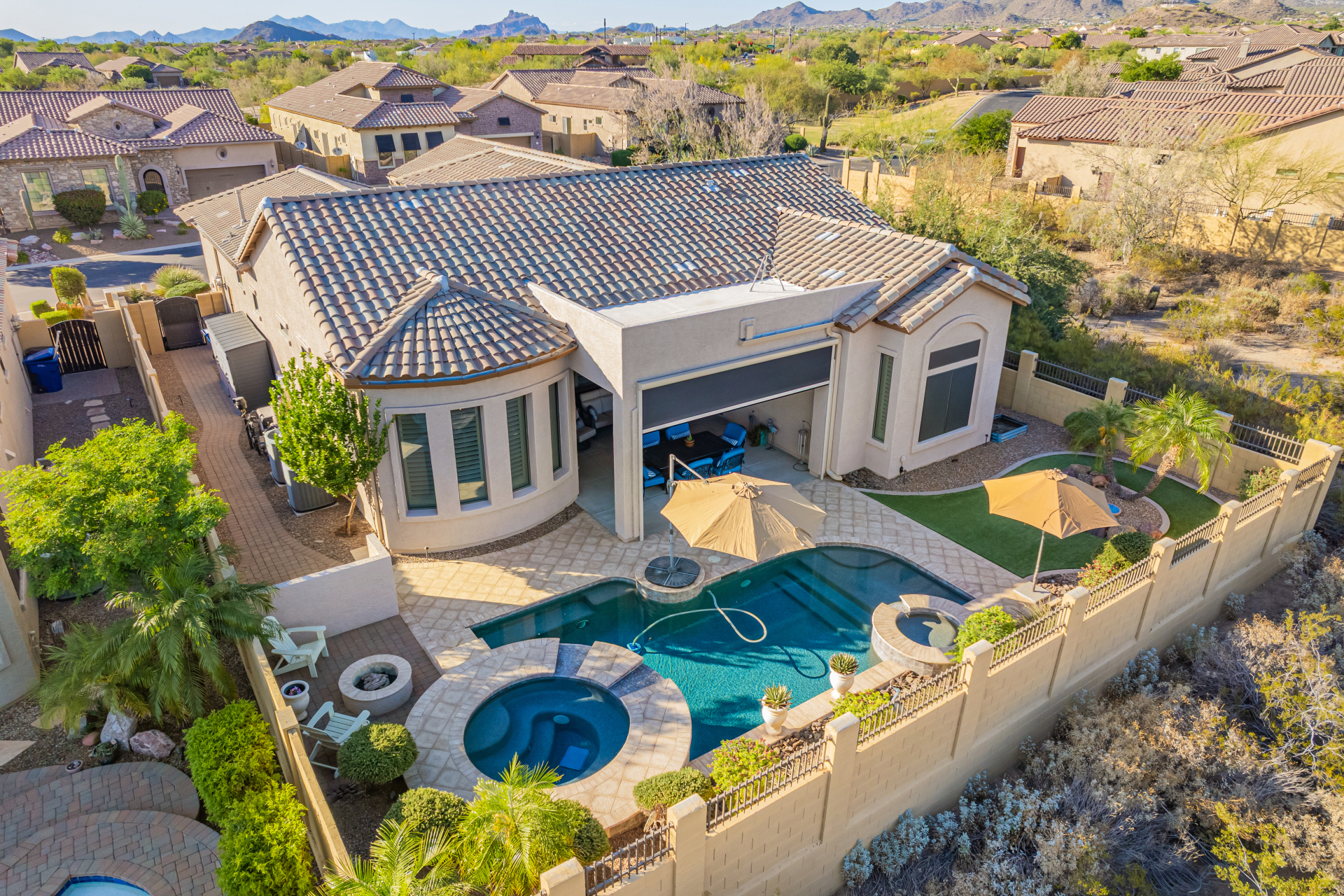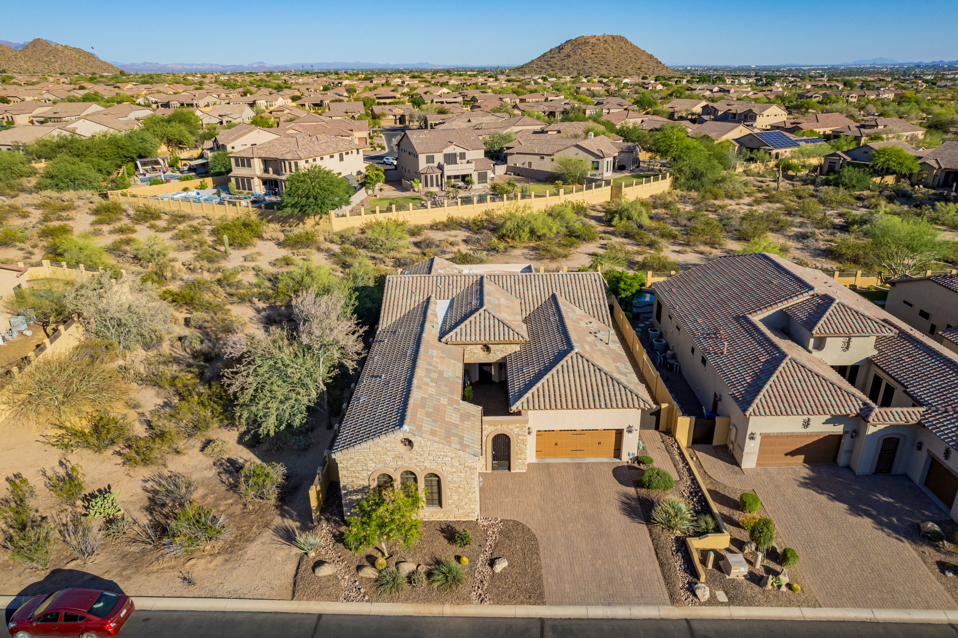 Resort-style living in highly sought-after Mountain Bridge community! This beautifully updated single-level offers 4 beds, 3.5 baths, & private office w/built-ins, all situated on premium lot backing to an expansive desert wash for added privacy & serene views. The open, light-filled floor plan features soaring 12' ceilings, plantation shutters, & stylish updates including flooring, countertops, & backsplash (2020). The primary bath was beautifully remodeled in 2021 with a spacious walk-in shower and spa-like feel. Step outside to your own backyard retreat complete w/ pool & spa & retractable sun screen-perfect for relaxing or entertaining under the AZ sky. Residents enjoy pickle ball, tennis, basketball, frisbee golf, tot lots, scenic walking paths, & the Owner's Club with fitness center.