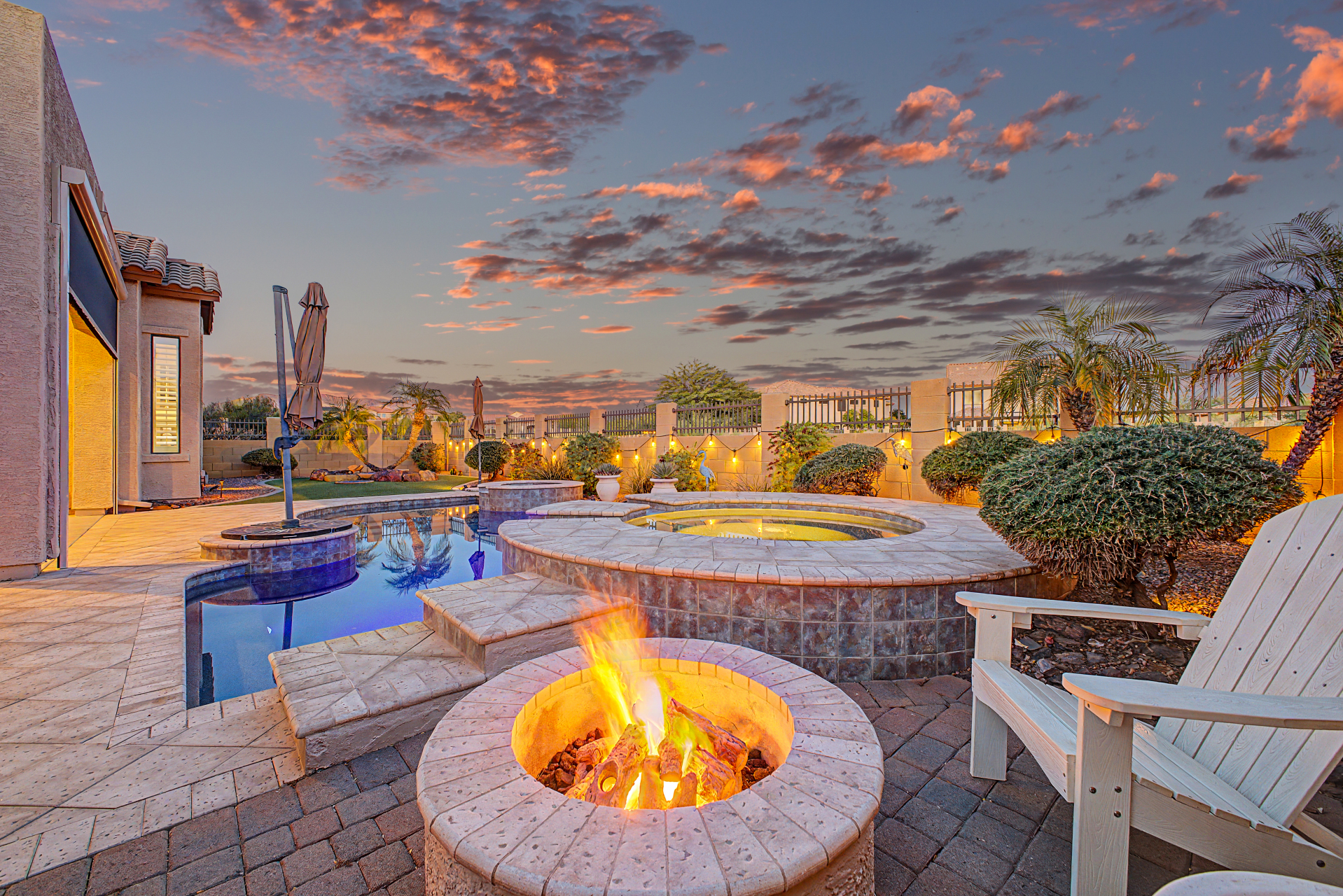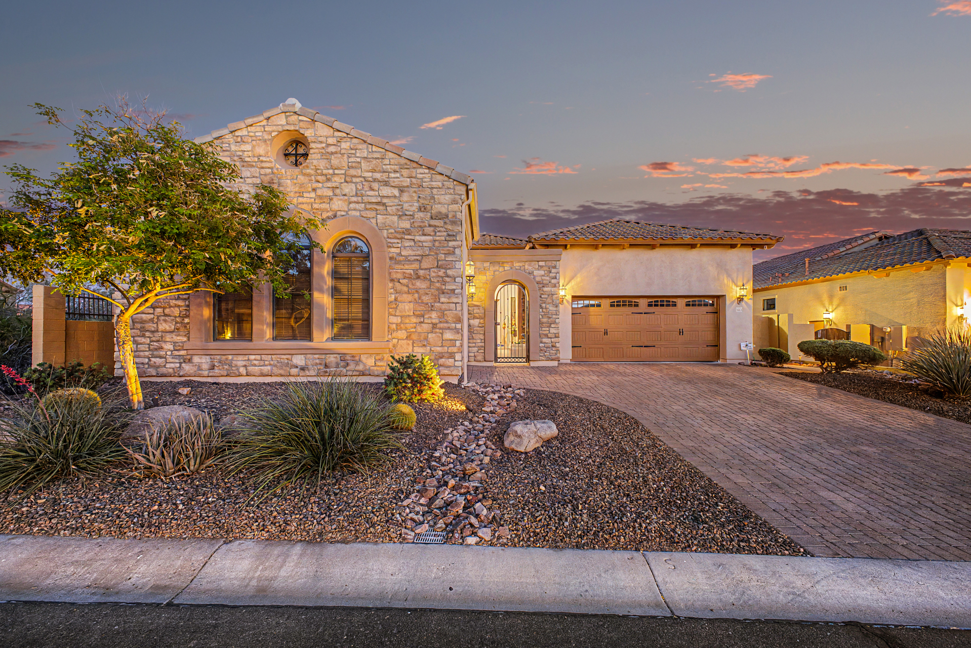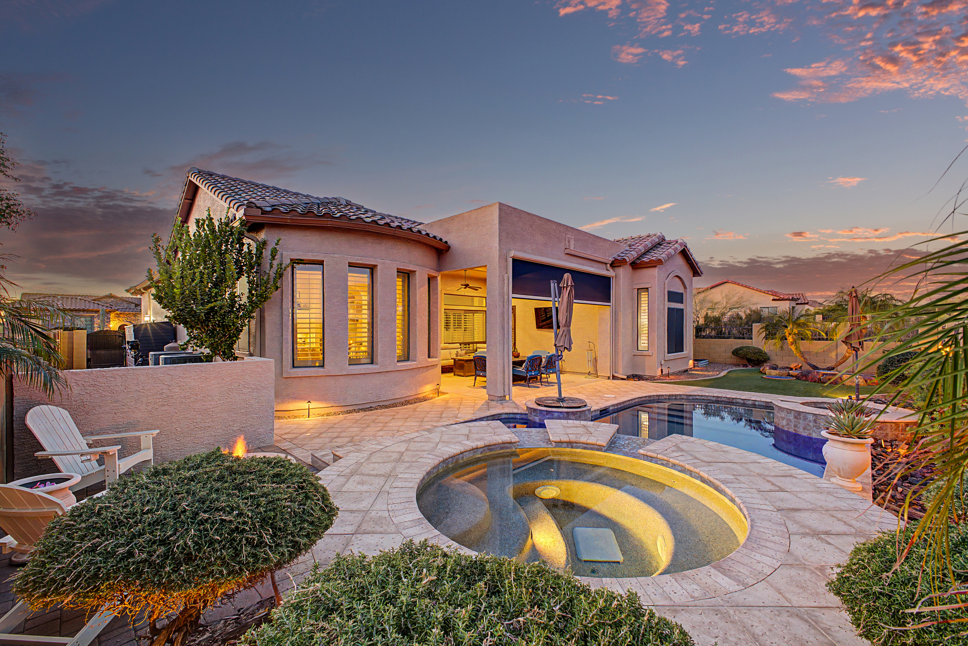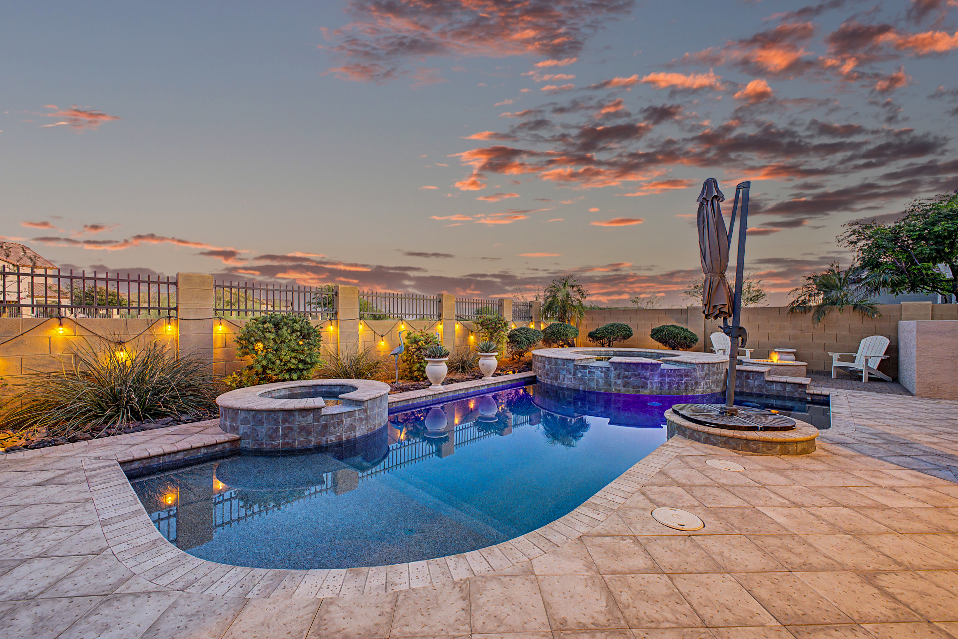 Resort-style living in highly sought-after Mountain Bridge community! This beautifully updated single-level offers 4 beds, 3.5 baths, & private office w/built-ins, all situated on premium lot backing to an expansive desert wash for added privacy & serene views. The open, light-filled floor plan features soaring 12' ceilings, plantation shutters, & stylish updates including flooring, countertops, & backsplash (2020). The primary bath was beautifully remodeled in 2021 with a spacious walk-in shower and spa-like feel. Step outside to your own backyard retreat complete w/ pool & spa & retractable sun screen-perfect for relaxing or entertaining under the AZ sky. Residents enjoy pickle ball, tennis, basketball, frisbee golf, tot lots, scenic walking paths, & the Owner's Club with fitness center.