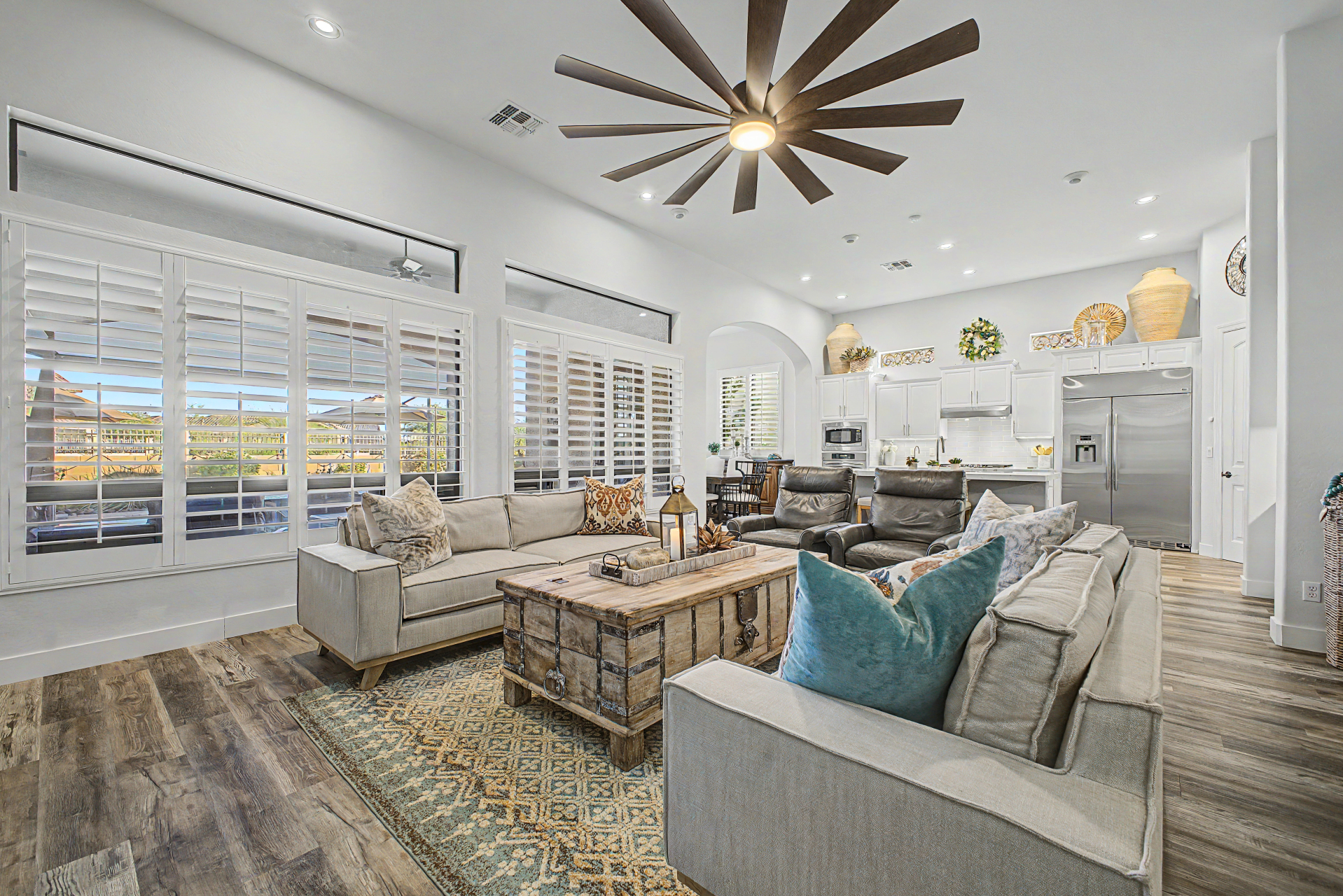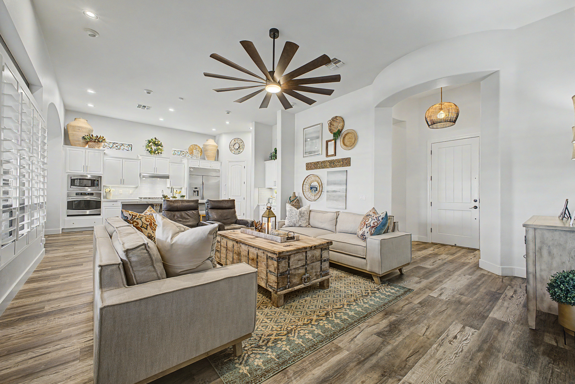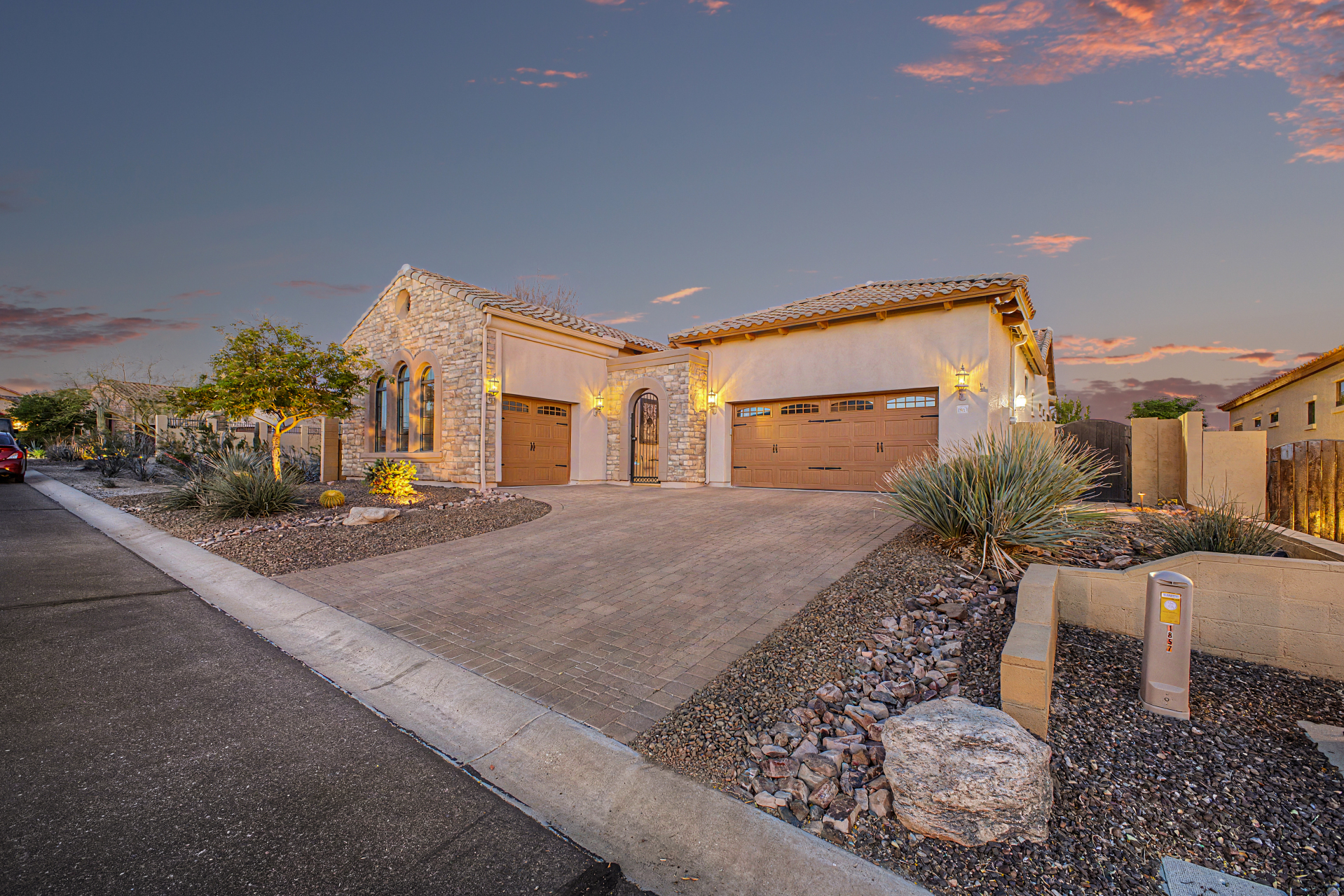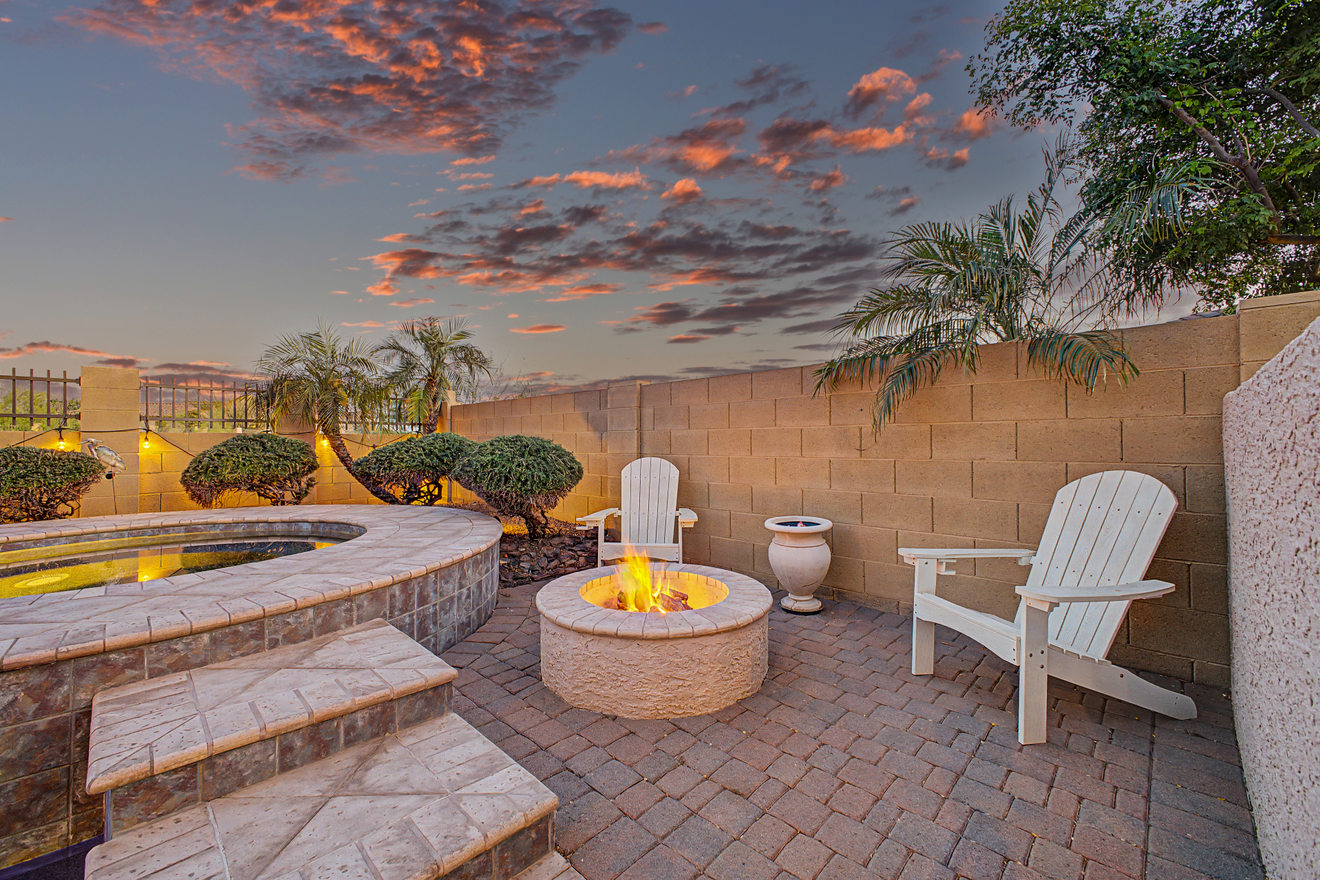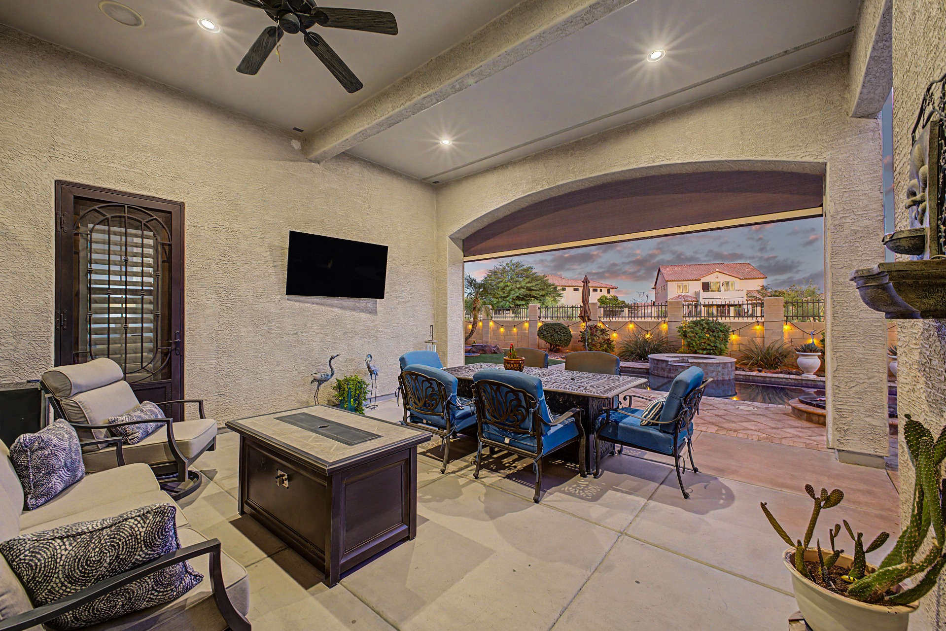 Resort-style living in highly sought-after Mountain Bridge community! This beautifully updated single-level offers 4 beds, 3.5 baths, & private office w/built-ins, all situated on premium lot backing to an expansive desert wash for added privacy & serene views. The open, light-filled floor plan features soaring 12' ceilings, plantation shutters, & stylish updates including flooring, countertops, & backsplash (2020). The primary bath was beautifully remodeled in 2021 with a spacious walk-in shower and spa-like feel. Step outside to your own backyard retreat complete w/ pool & spa & retractable sun screen-perfect for relaxing or entertaining under the AZ sky. Residents enjoy pickle ball, tennis, basketball, frisbee golf, tot lots, scenic walking paths, & the Owner's Club with fitness center.