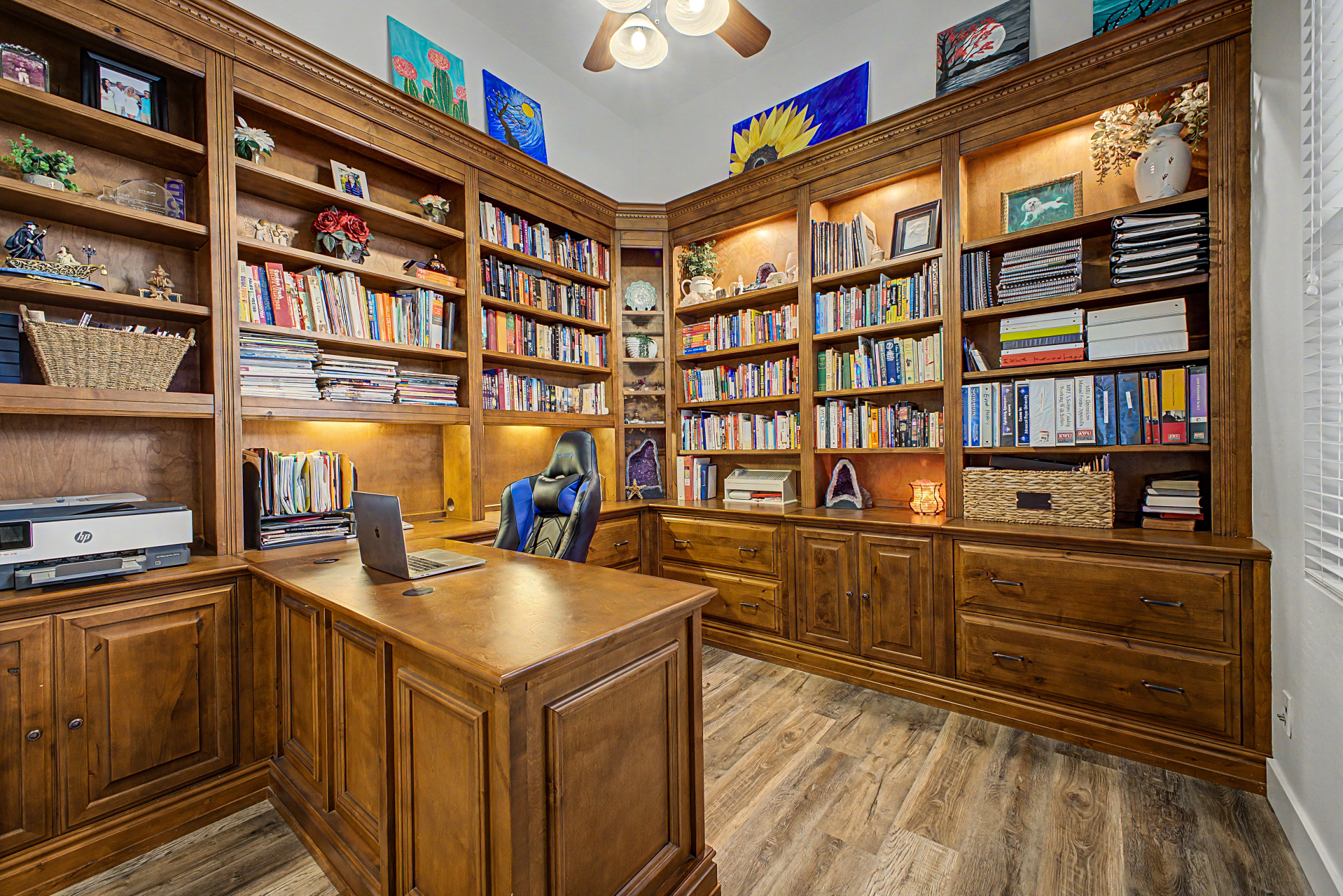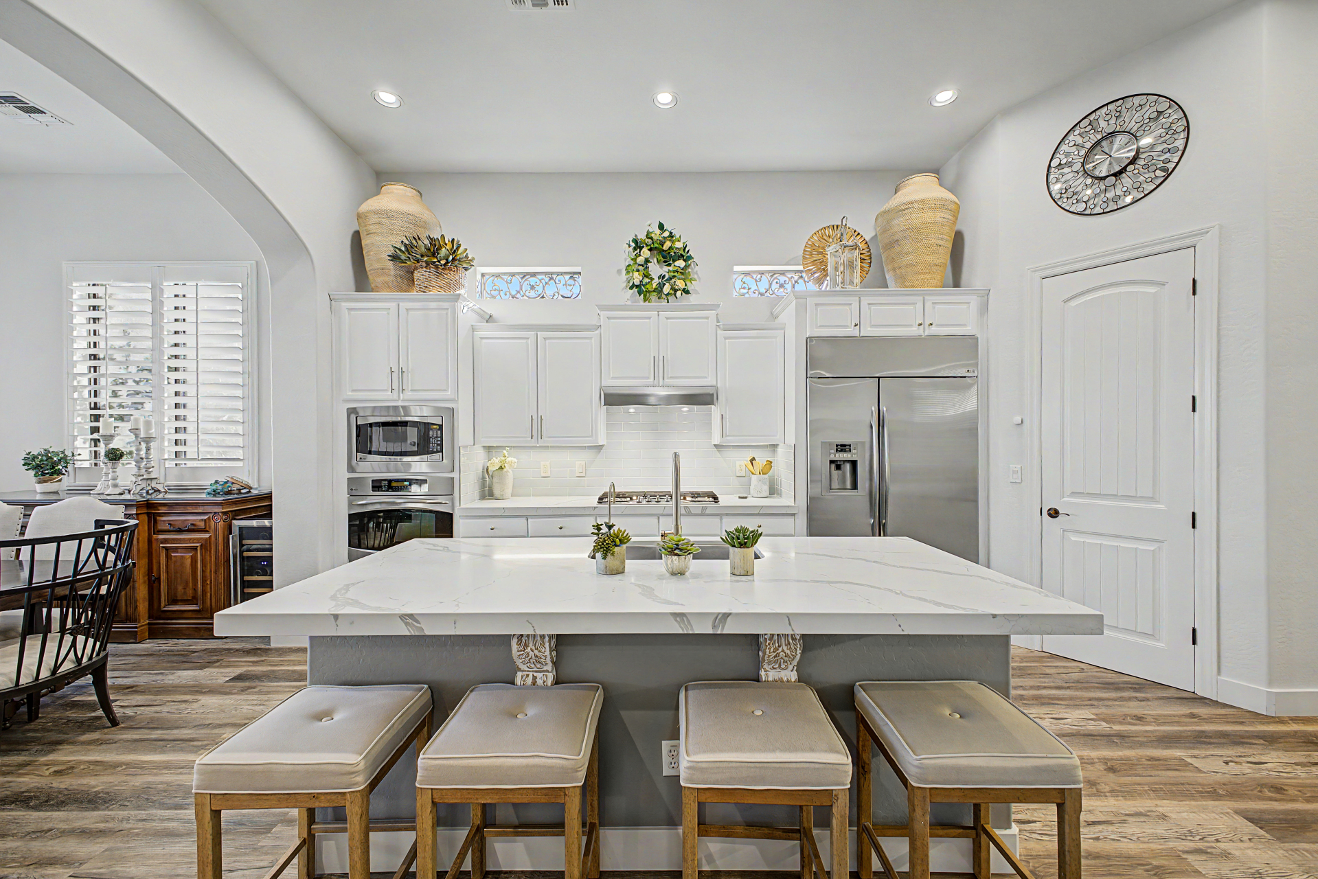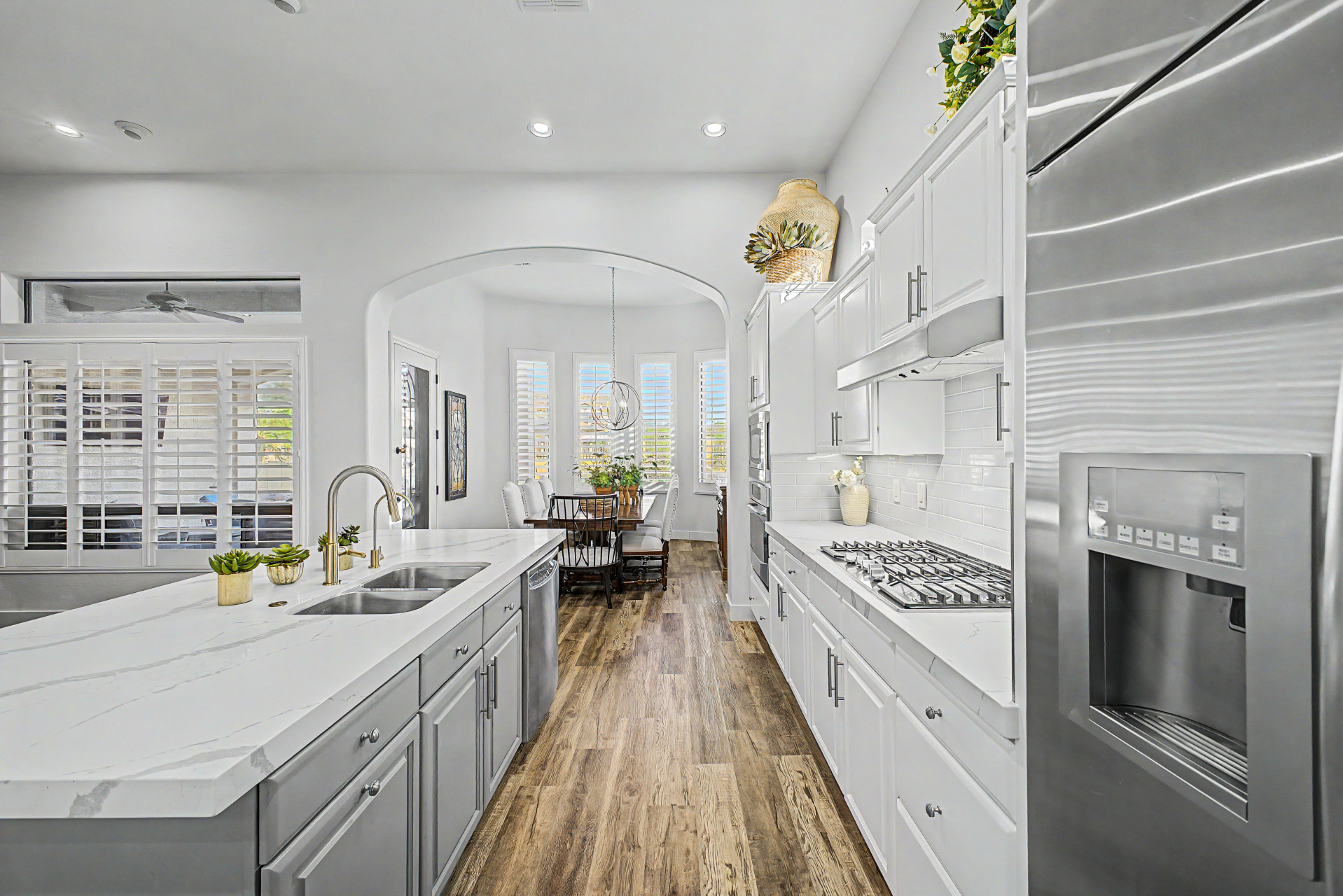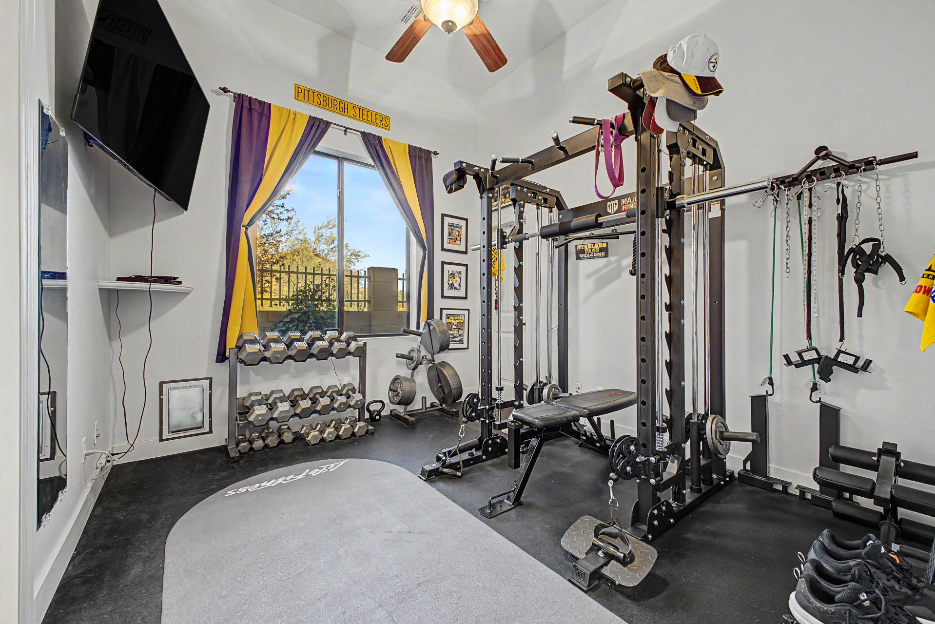 Resort-style living in highly sought-after Mountain Bridge community! This beautifully updated single-level offers 4 beds, 3.5 baths, & private office w/built-ins, all situated on premium lot backing to an expansive desert wash for added privacy & serene views. The open, light-filled floor plan features soaring 12' ceilings, plantation shutters, & stylish updates including flooring, countertops, & backsplash (2020). The primary bath was beautifully remodeled in 2021 with a spacious walk-in shower and spa-like feel. Step outside to your own backyard retreat complete w/ pool & spa & retractable sun screen-perfect for relaxing or entertaining under the AZ sky. Residents enjoy pickle ball, tennis, basketball, frisbee golf, tot lots, scenic walking paths, & the Owner's Club with fitness center.