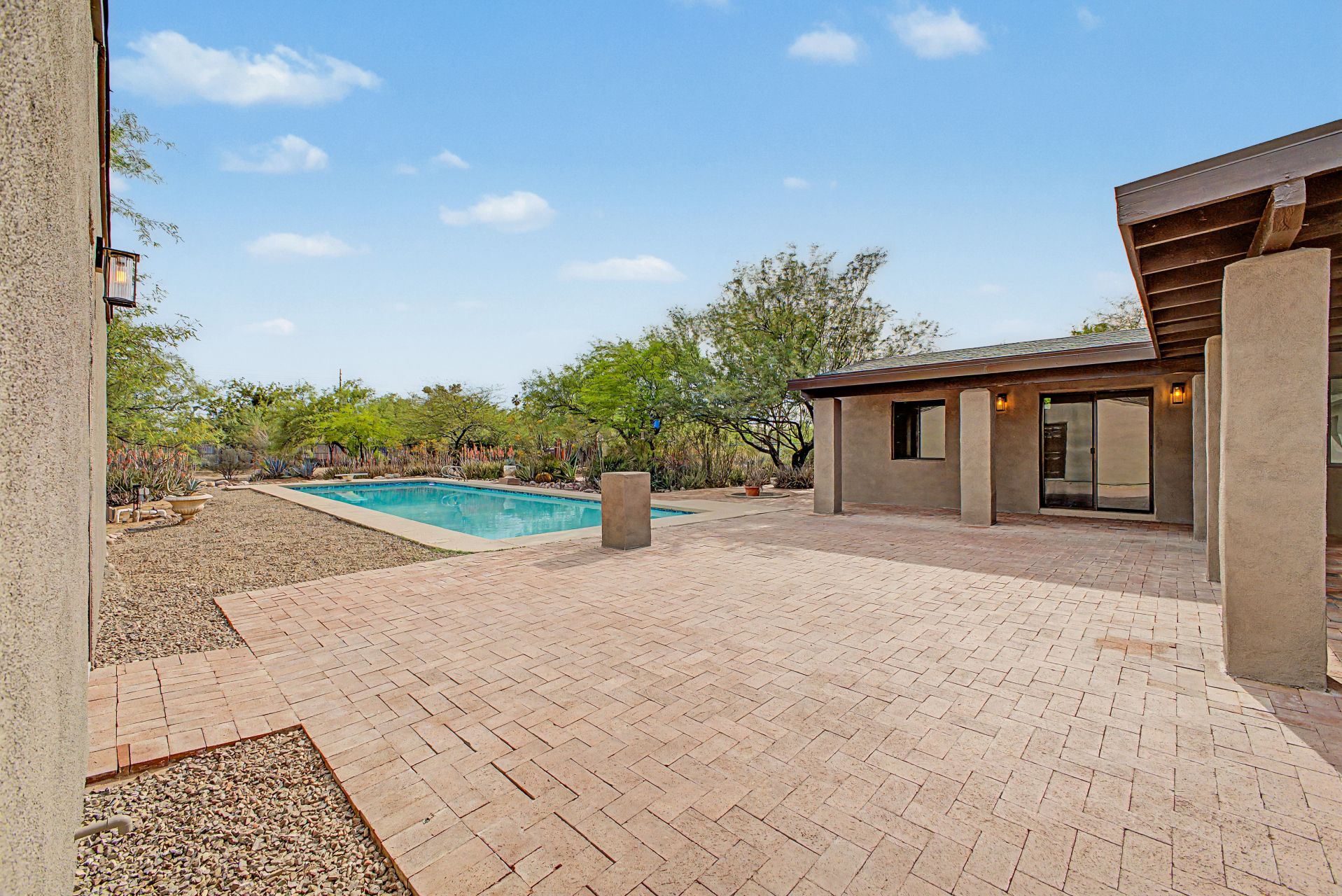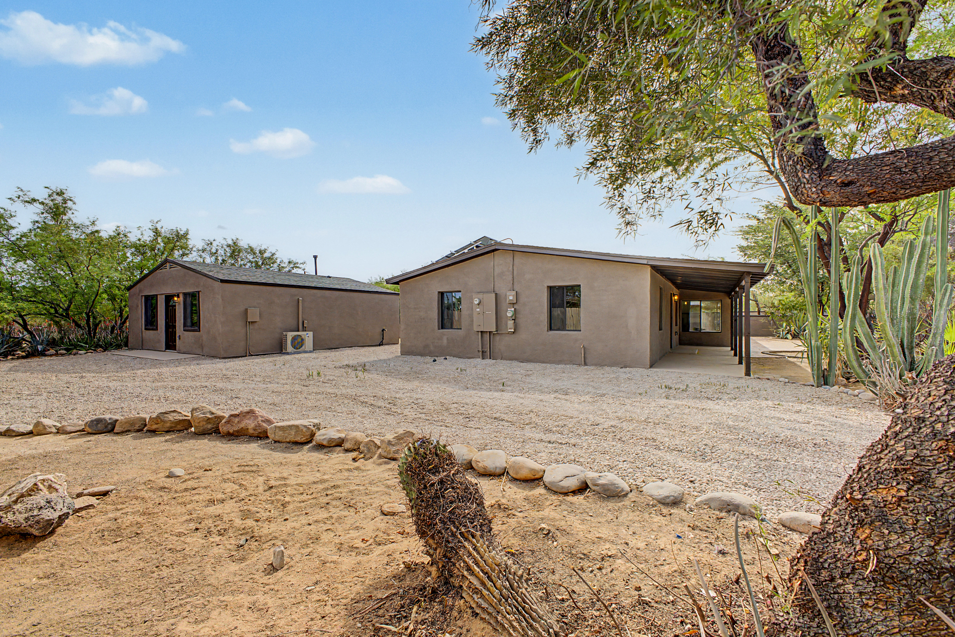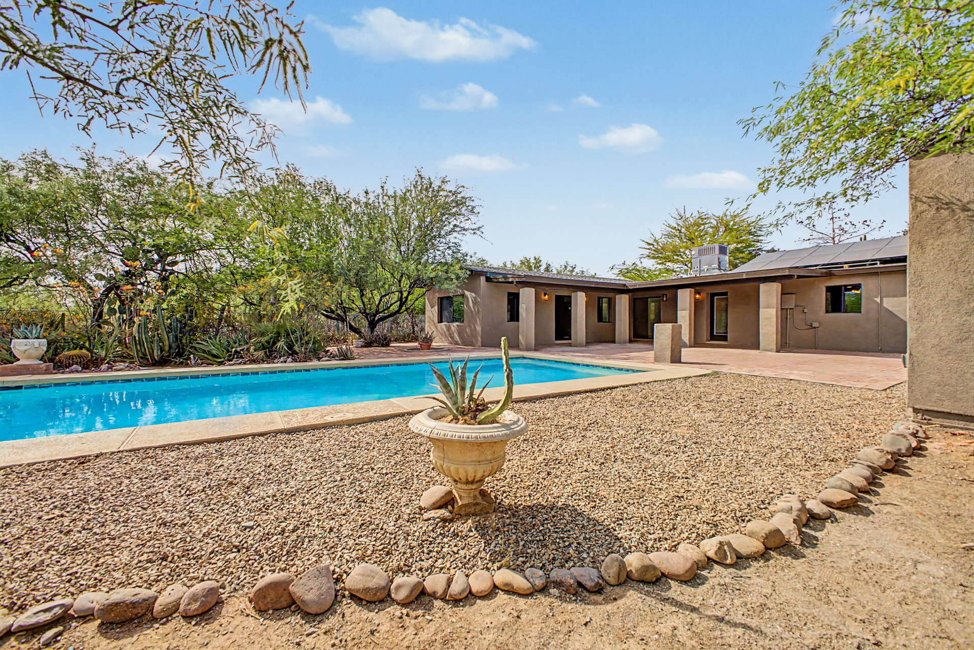 Prepare to be amazed by this beautifully upgraded home, complete w/ solar panels for energy savings! Discover a large living room that sets the stage for gatherings, highlighted by a fireplace. Fresh paint, ceiling fans, wood-look flooring, & recessed lighting create a stylish & inviting atmosphere t/out. Upscale eat-in kitchen boasts abundant cabinetry adorned w/ crown moulding, tile backsplash, stainless steel appliances, quartz counters, & a center island. Spacious main retreat continues to impress w/ exposed beams on the vaulted ceilings, direct outdoor access, an ensuite w/ a designer tile shower, & a walk-in closet. A standout feature of this gem is the fully equipped casita, ideal for guests. Expansive backyard includes a covered patio & a diving pool! A MUST see! Agent/Owner