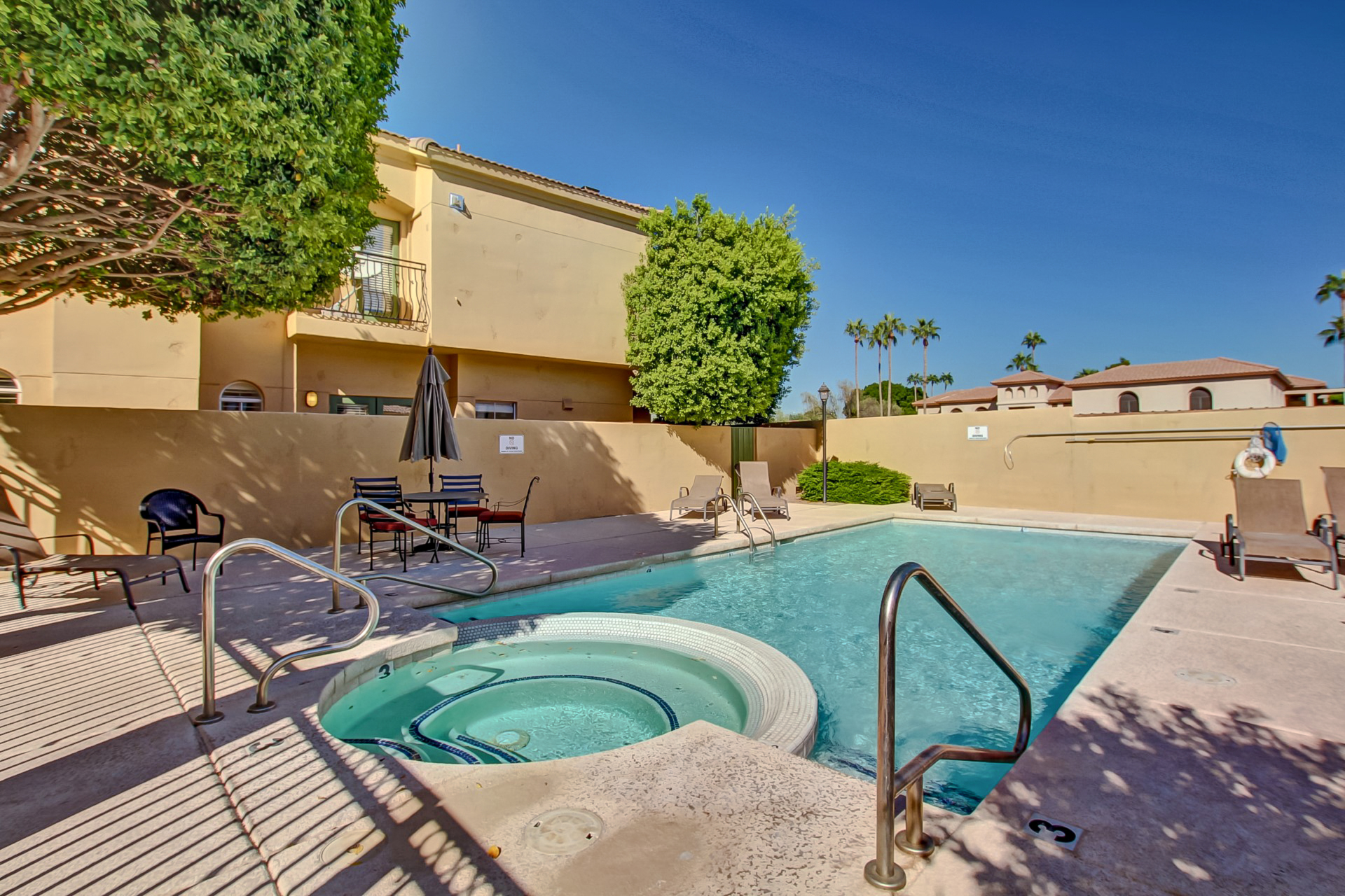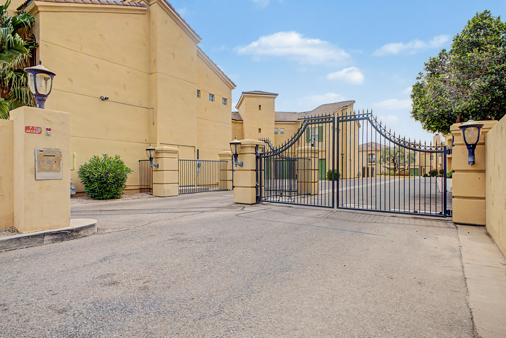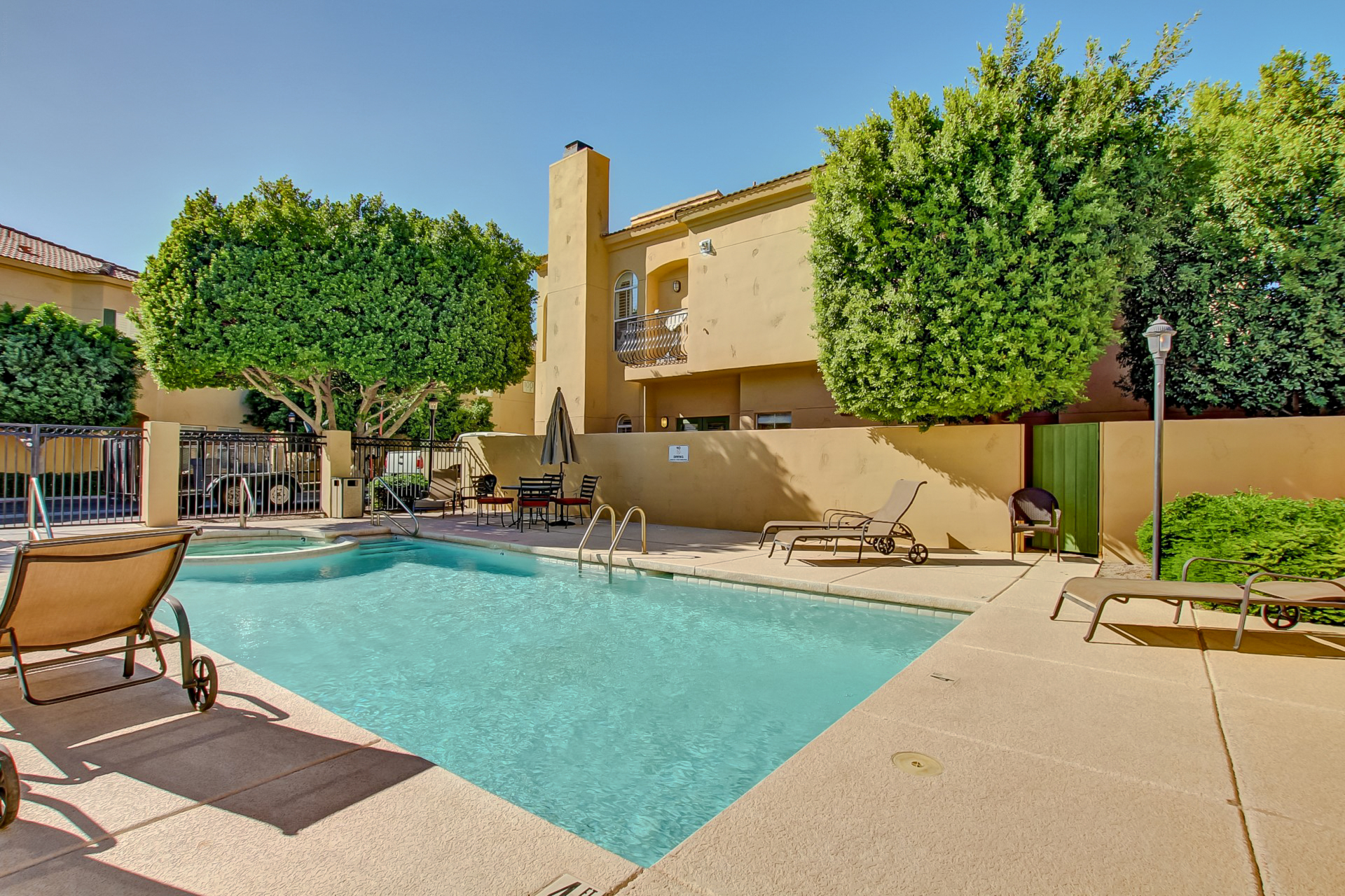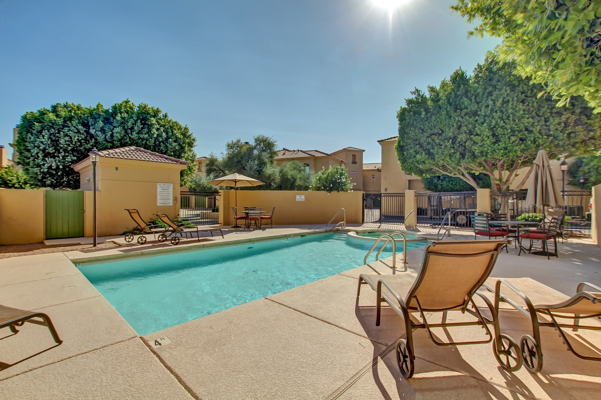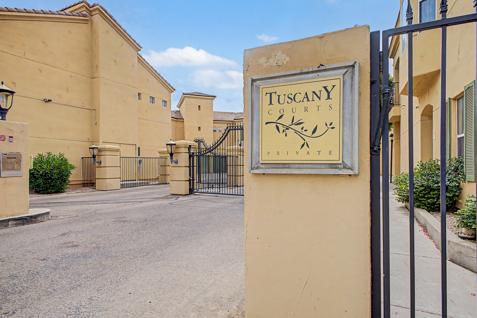 Rare gas cooking & 2-car split garage in gated Tuscany Courts! This bright open floor plan features a 2026 kitchen update with new cabinets & quartz counters. Enjoy plantation shutters, 10ft ceilings, a stone fireplace, and new carpet (2026). The primary suite offers a large walk-in closet, private balcony and expansive bath with double sinks. Move-in ready with a new water heater (2026).The main level's seamless flow leads to a private shady courtyard perfect for relaxing. Upstairs, you will find roomy bedrooms and the laundry area for added convenience. Residents of this gated community enjoy access to the sparkling community pool and spa. Located in the heart of Ahwatukee near South Mountain hiking, shopping, dining, and IKEA. Easy I-10 access. Rentals 30+ days OK!