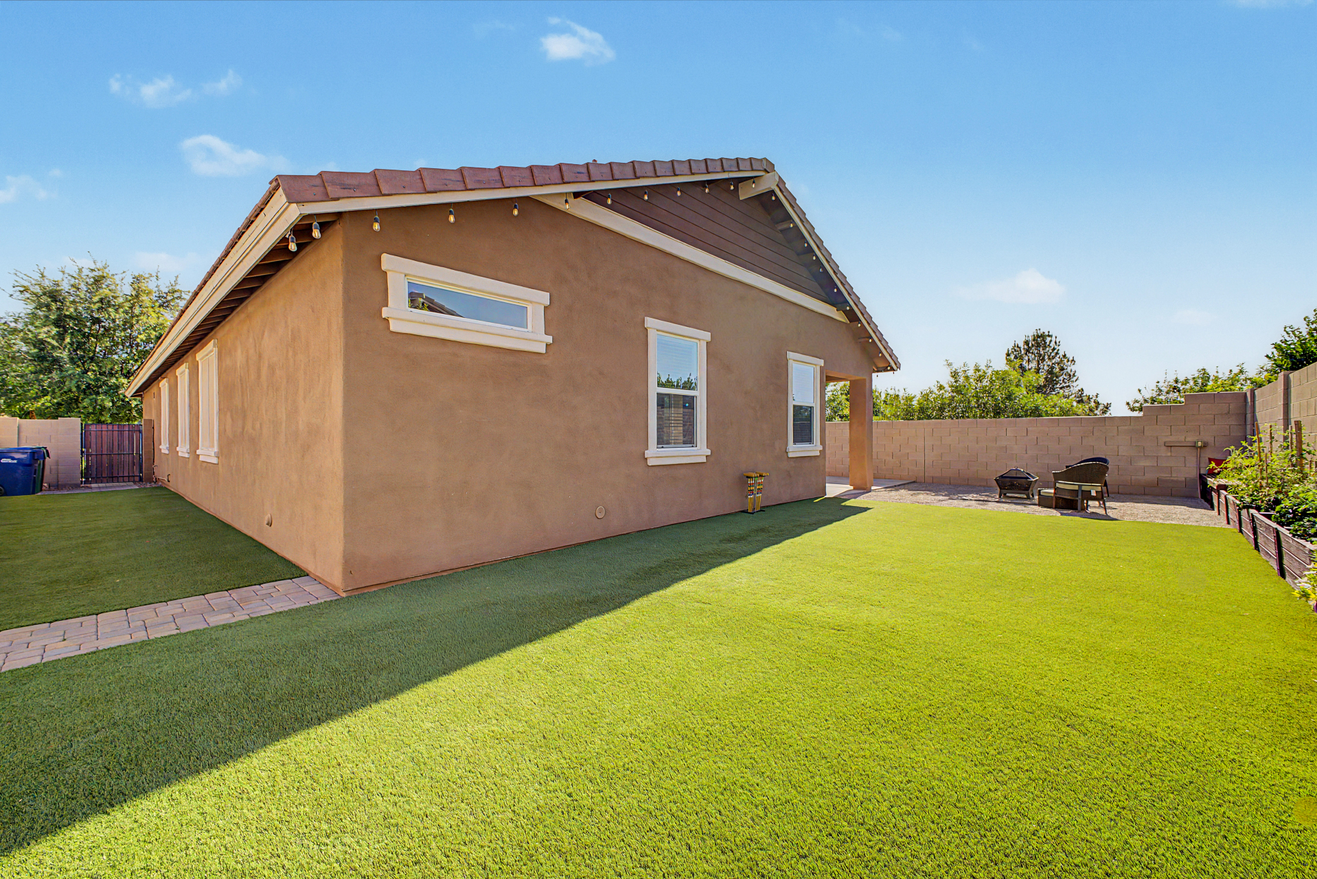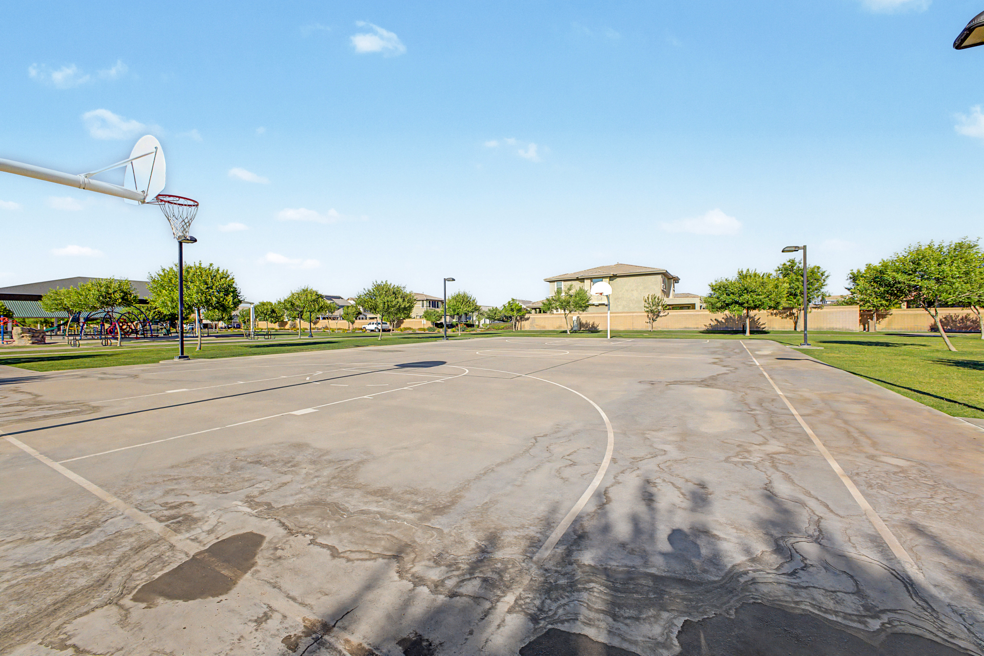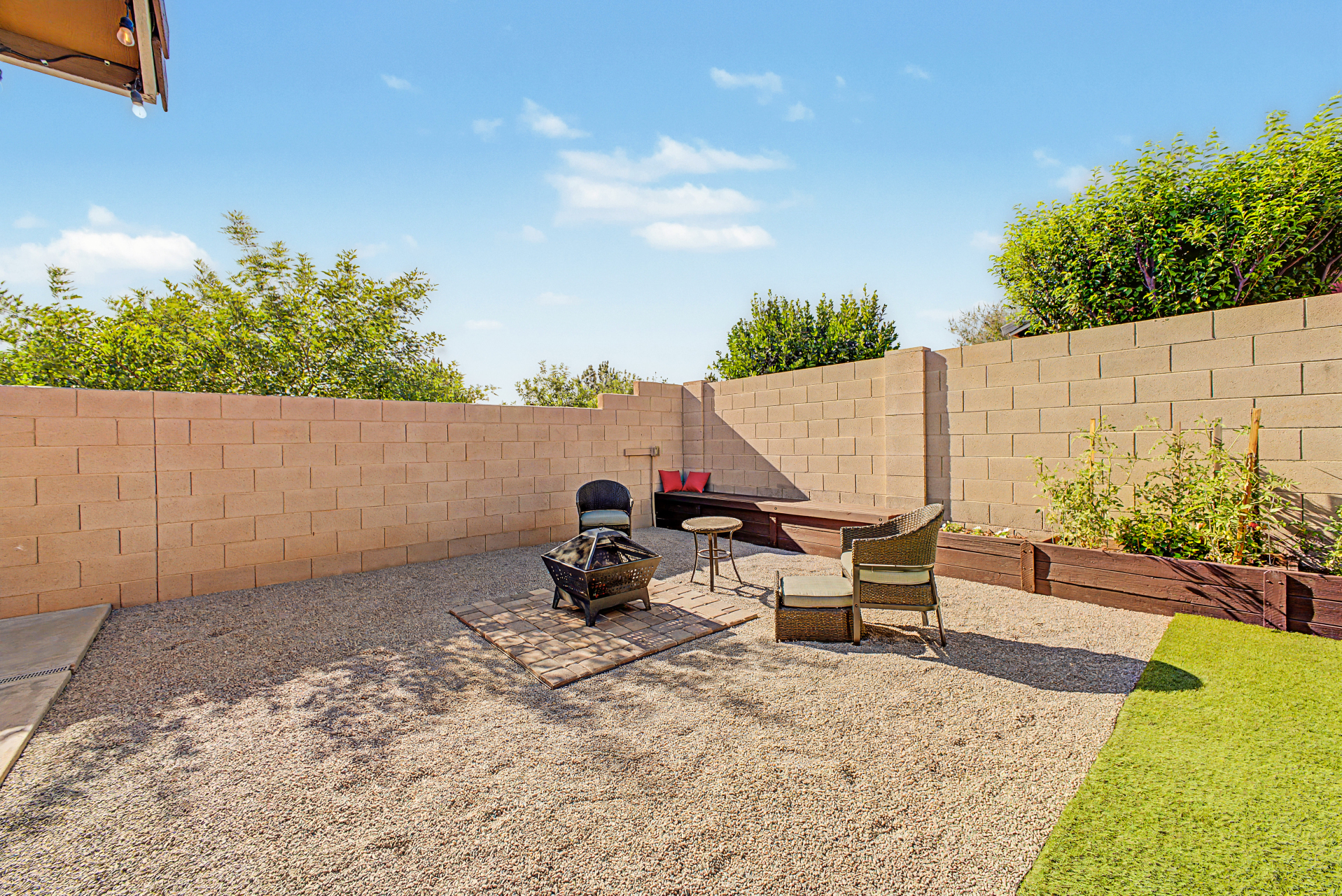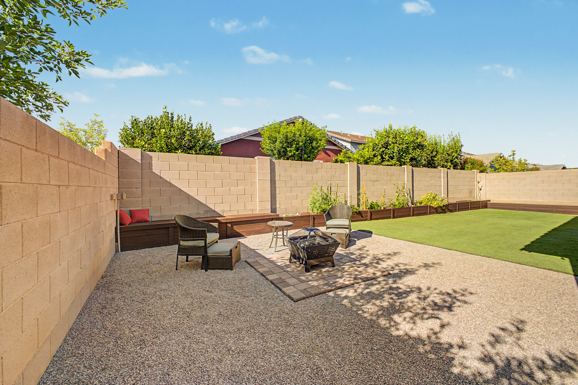 Home, Sweet Home! This beautiful 4 bed, 3 full bath property in Desert Place at Morrison Ranch is Move In Ready! Nestled on a premium corner lot & directly across from Desert Place Park! You'll love the new SS gas range w/5th burner griddle & warming oven, new microwave, new smoke & CO2 detectors, Fresh interior paint, LVP floors installed in 2024, backyard bistro lights, raised planter beds, perfect fire pit w/pavers & rock, EZ care artificial turf & citrus trees! The spacious kitchen has lots of wood cabinets, new hardware, new pull down faucet, filtered water dispenser, plenty of counter space, breakfast bar, large pantry & overlooks the great room! Enjoy your primary retreat with walk-in closet & private exit to the patio! Multiple windows offer natural light to enjoy throughout your